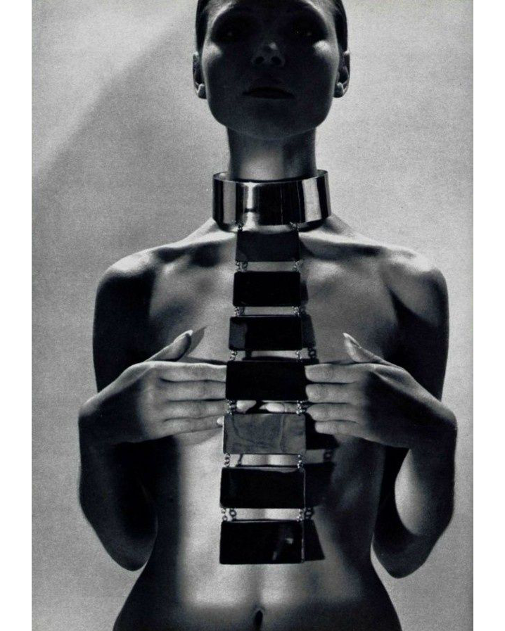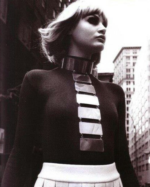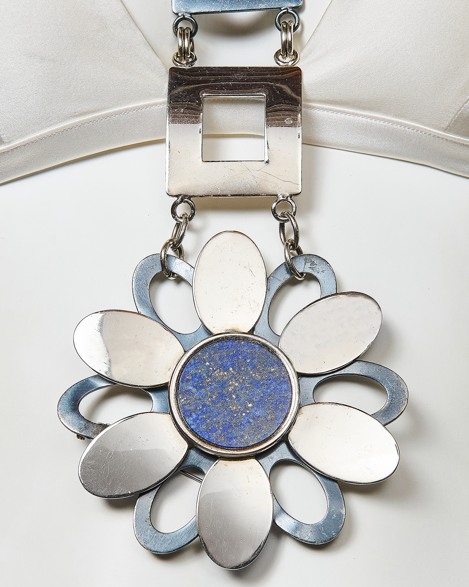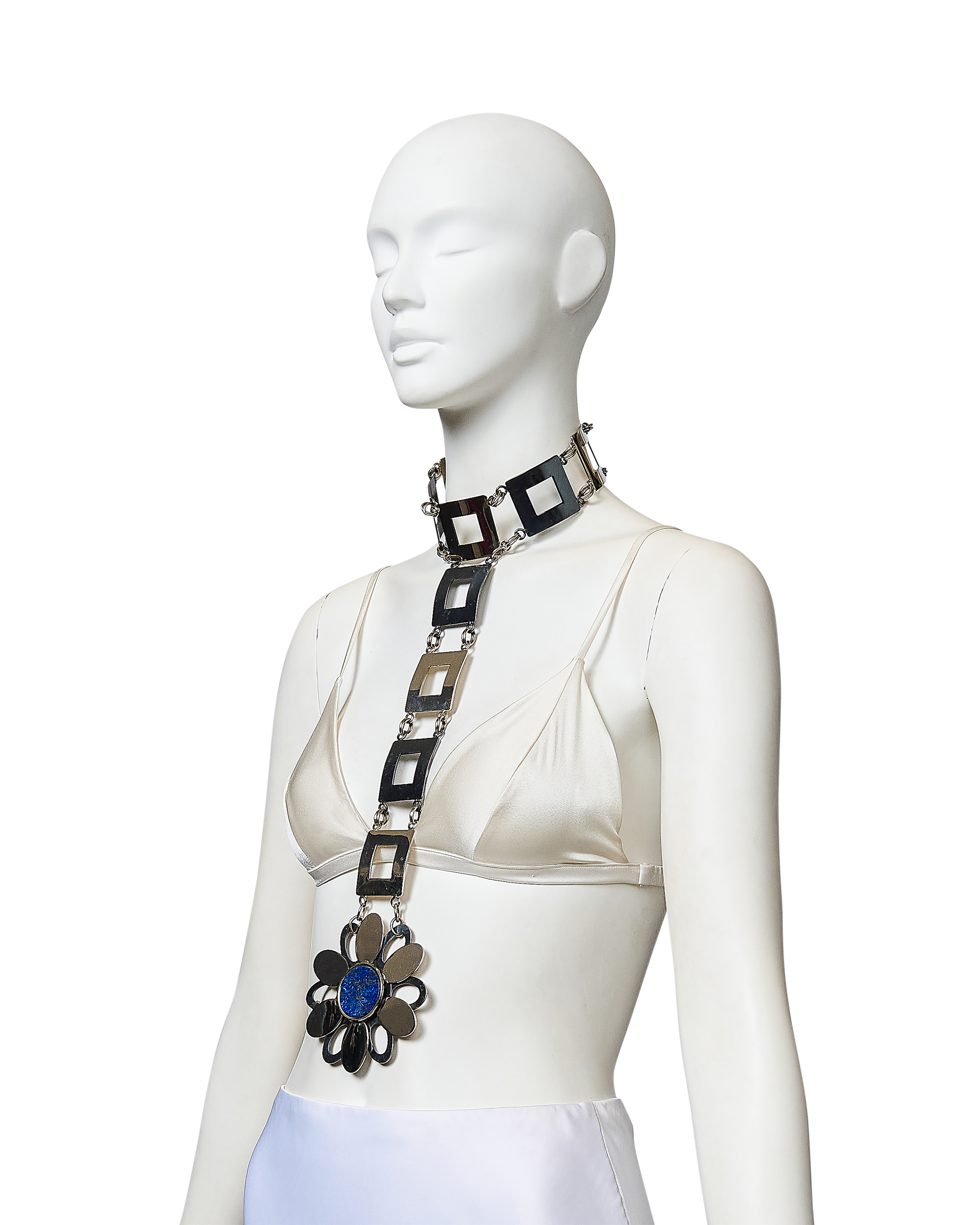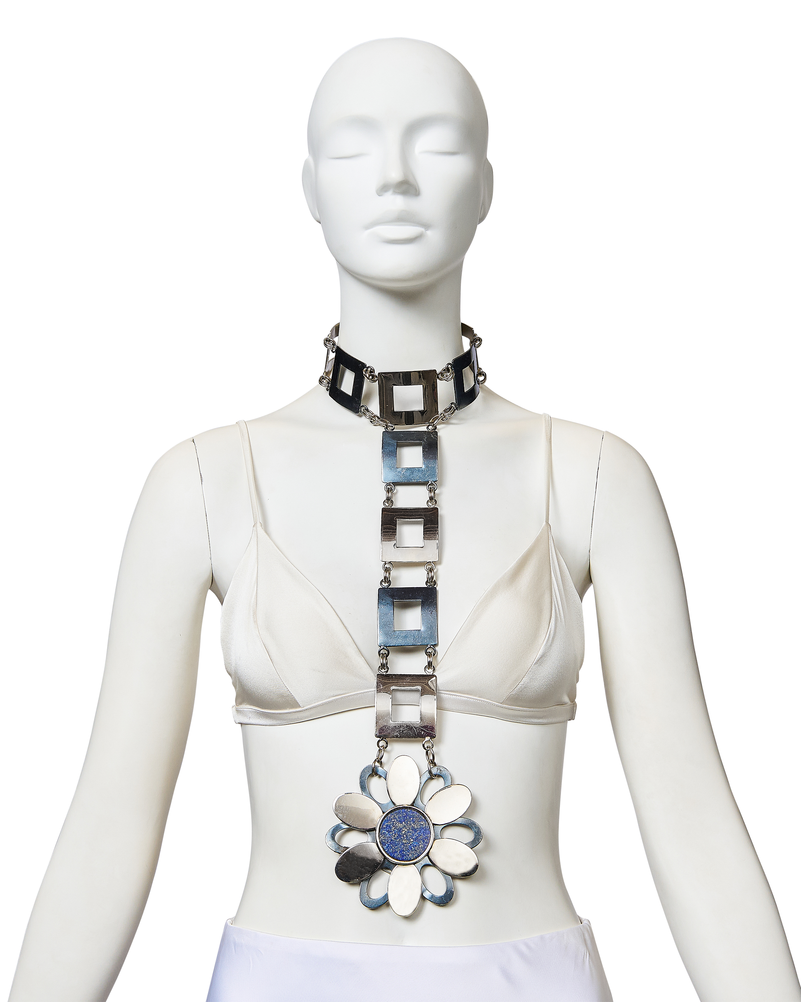 1969 Pierre Cardin (Attributed) silver geometric choker necklace with sunflower motif pendant with center circular blue and gold fleck real lapis stone. Mod silver sculptural necklace with alternating silver and gunmetal square paneling and petals at pendant. Interior of pendant has pin at base to attach to clothing to adhere when worn. Rare piece as seen on the runway. In very good vintage condition with moderate scratches throughout metal. The original, heavily damaged stone was replaced with a genuine Lapis stone. Provenance: This piece is part of a small collection of samples acquired directly from the Pierre Cardin Archive in Paris. This is a sample which was received directly from the maison. Styled with white bra top and skirt for e-commerce purposes only; not included with final purchase.