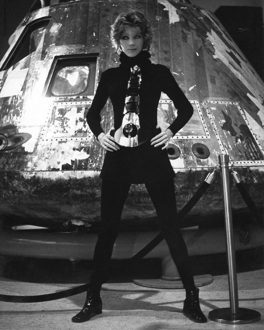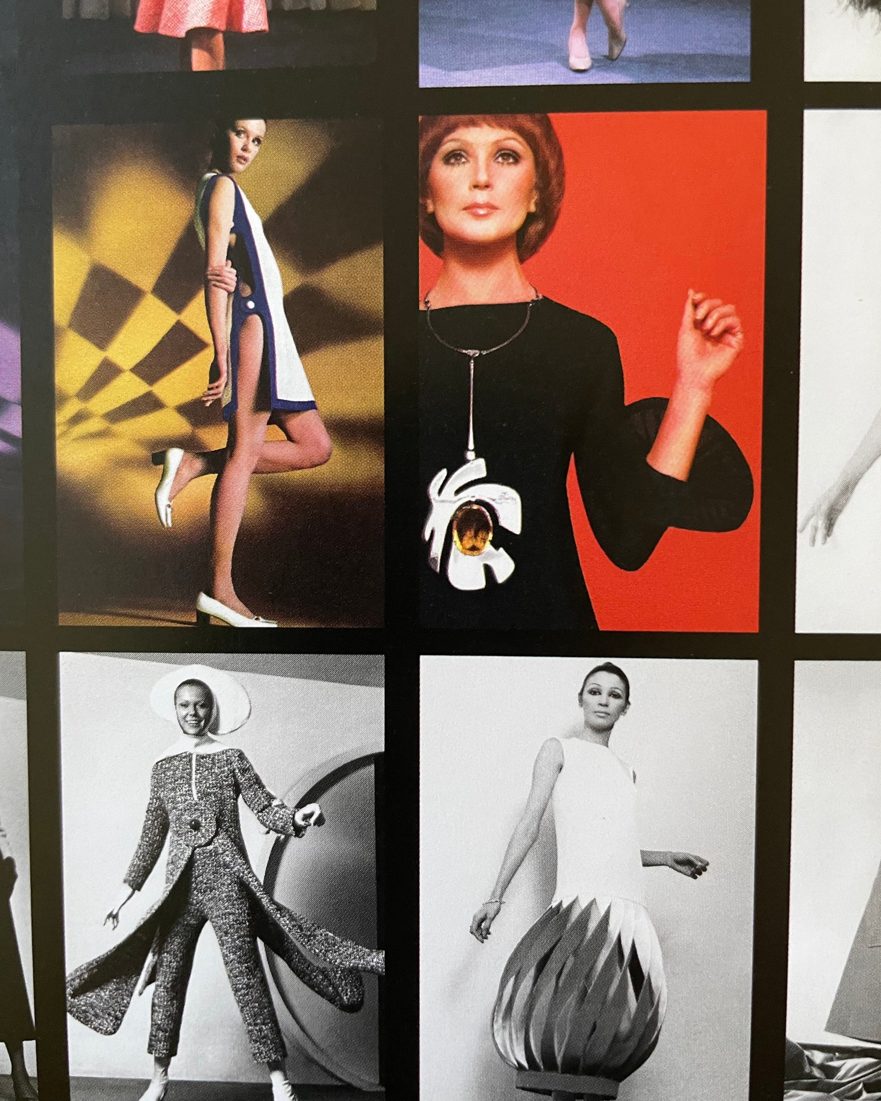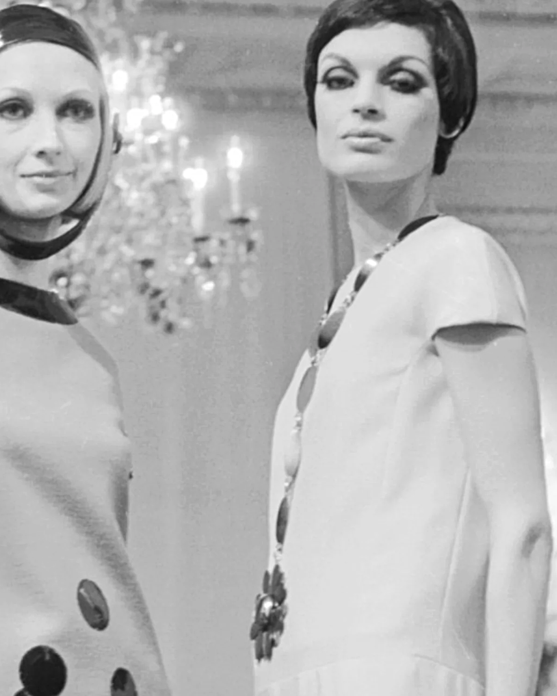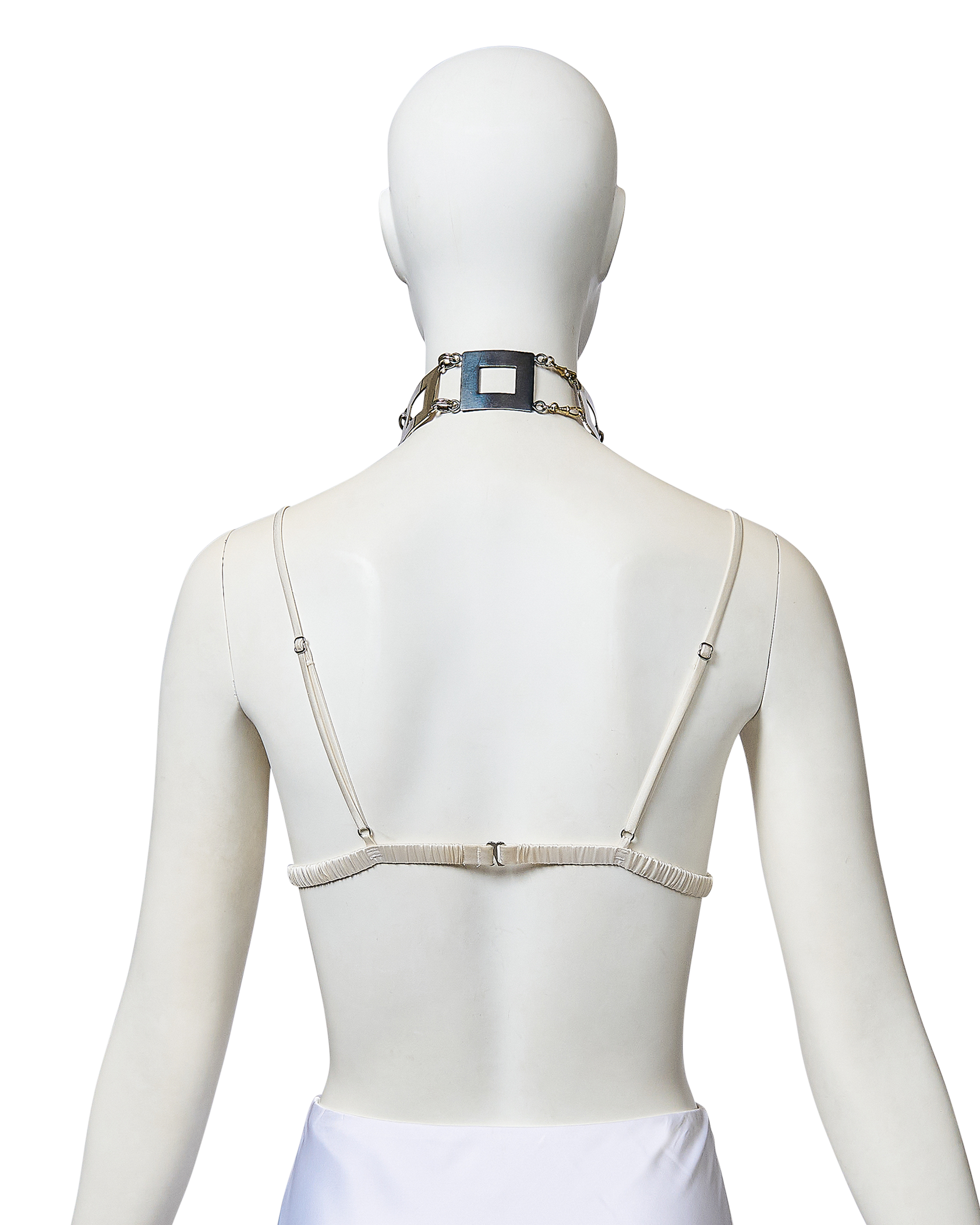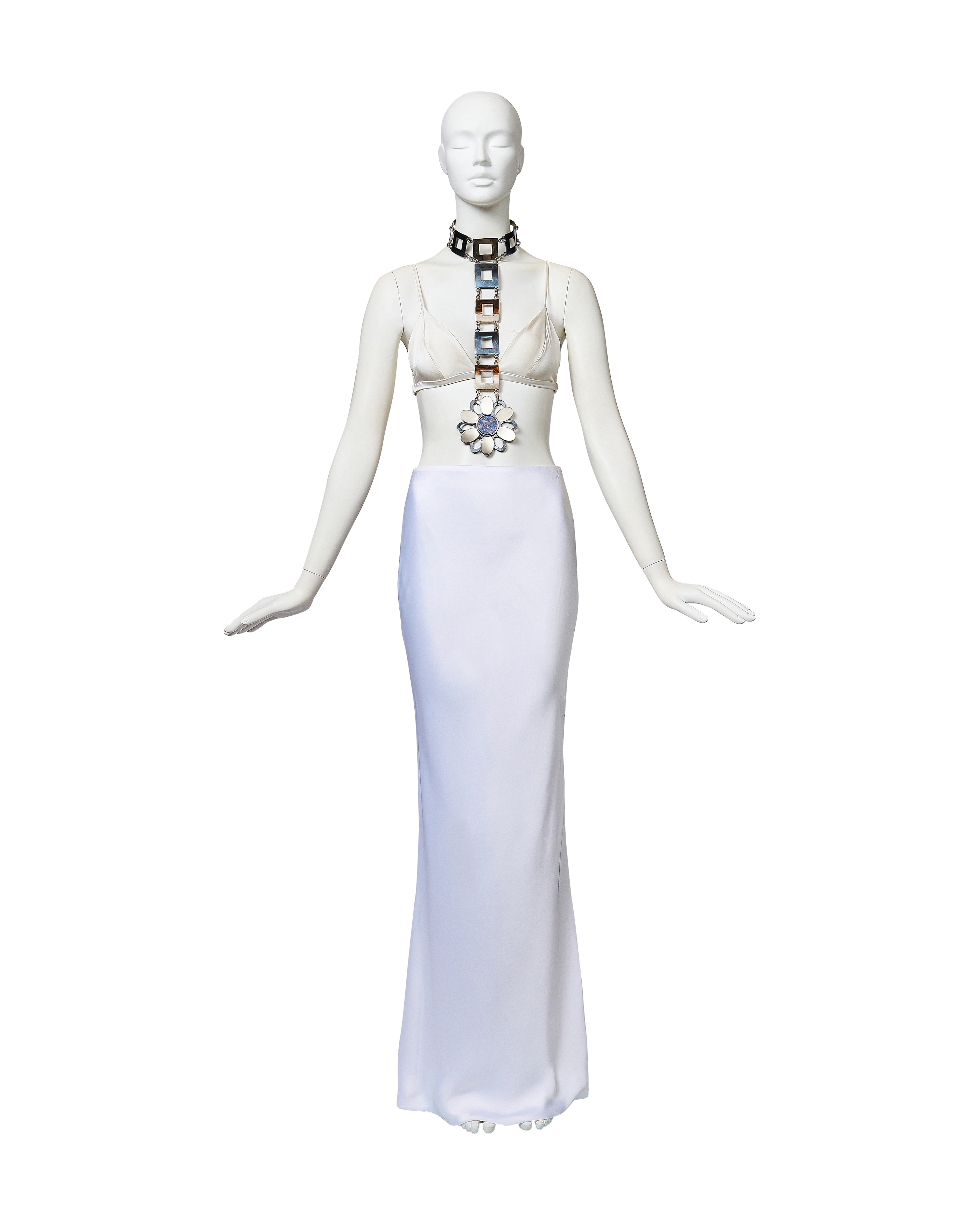 1969 Pierre Cardin (Attributed) silver geometric choker necklace with sunflower motif pendant with center circular blue and gold fleck real lapis stone. Mod silver sculptural necklace with alternating silver and gunmetal square paneling and petals at pendant. Interior of pendant has pin at base to attach to clothing to adhere when worn. Rare piece as seen on the runway. In very good vintage condition with moderate scratches throughout metal. The original, heavily damaged stone was replaced with a genuine Lapis stone. Provenance: This piece is part of a small collection of samples acquired directly from the Pierre Cardin Archive in Paris. This is a sample which was received directly from the maison. Styled with white bra top and skirt for e-commerce purposes only; not included with final purchase.