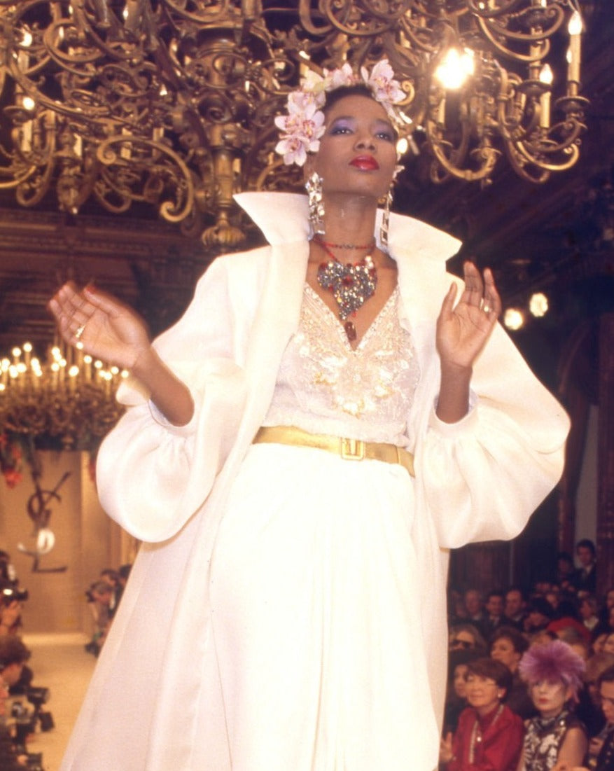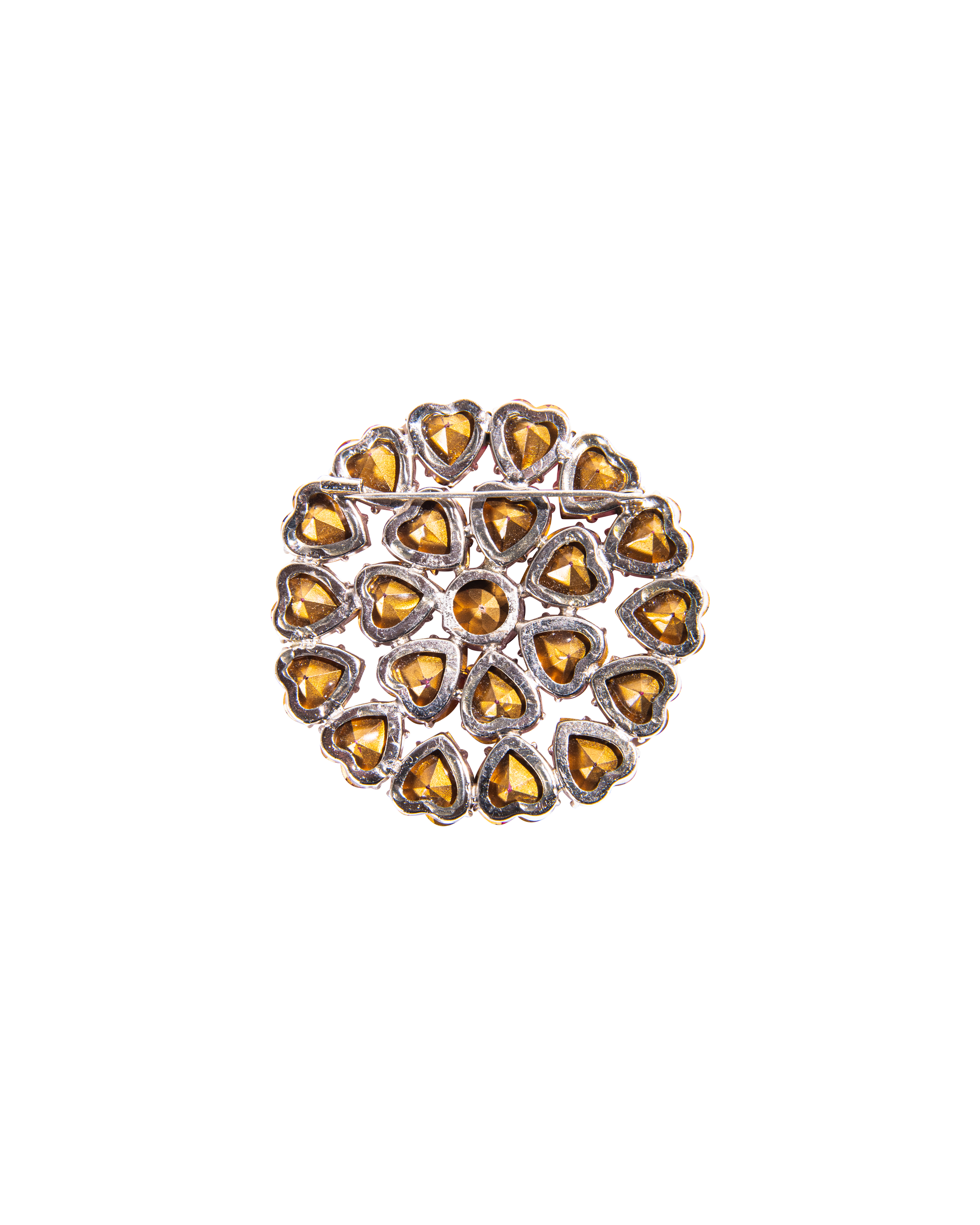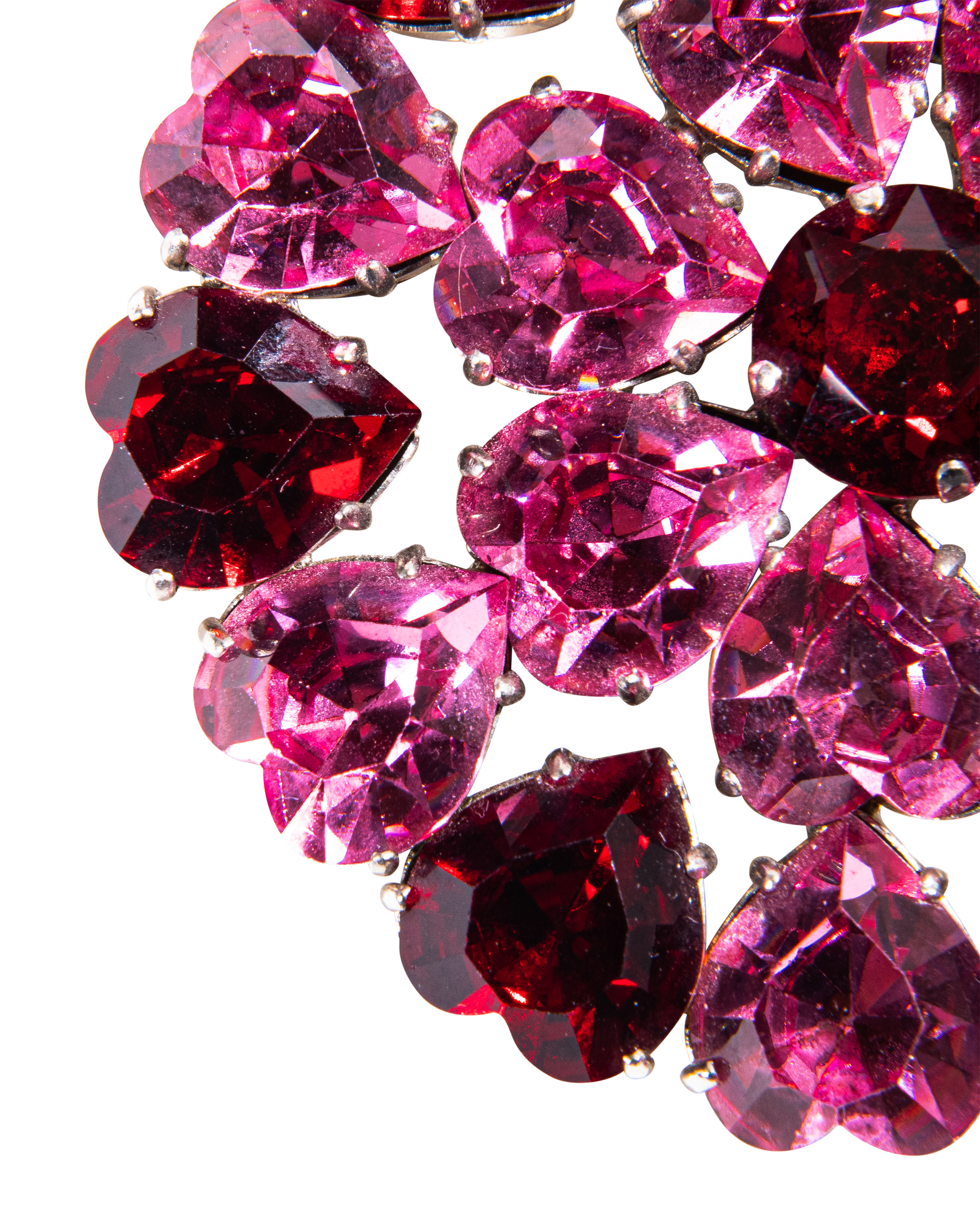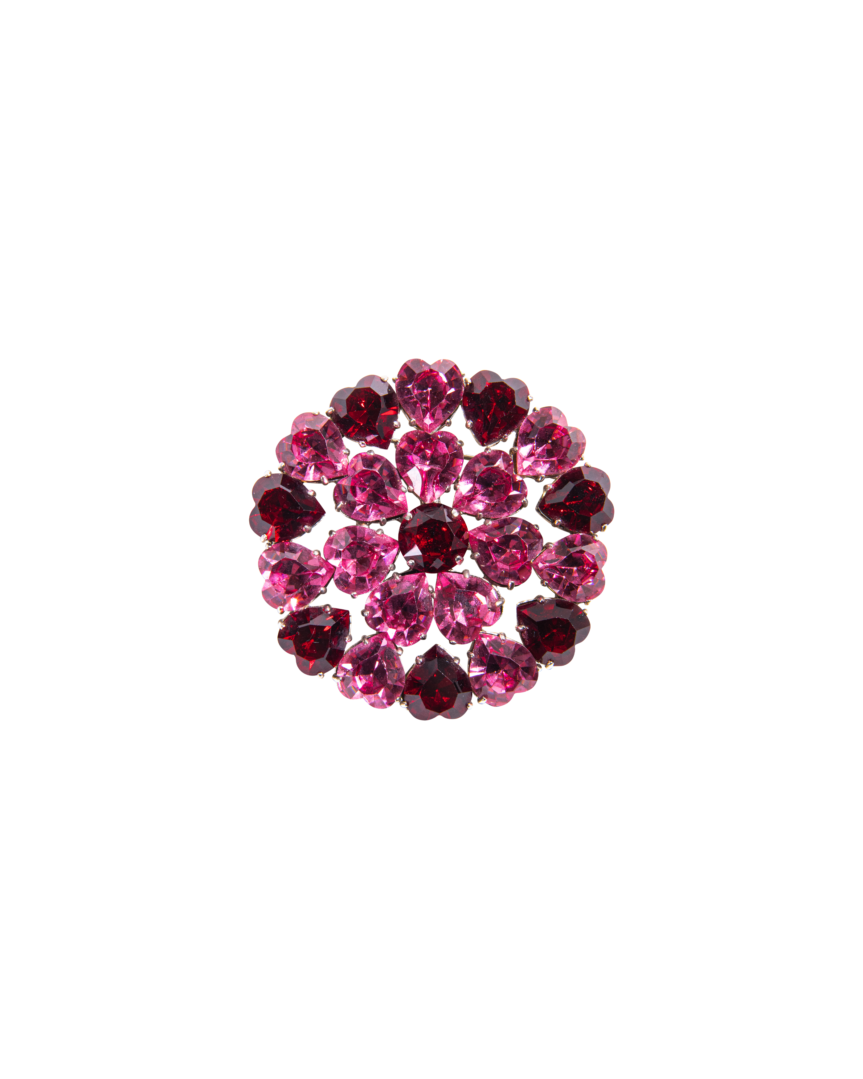 c. 1985 Yves Saint Laurent (Attributed) pink and red large silver-tone rhinestone circular brooch. Gunmetal silver-tone base encrusted with pink and red rhinestones. Unsigned due to damage to the clasp that is unnoticeable when worn; visually in excellent vintage condition with no flaws to note.