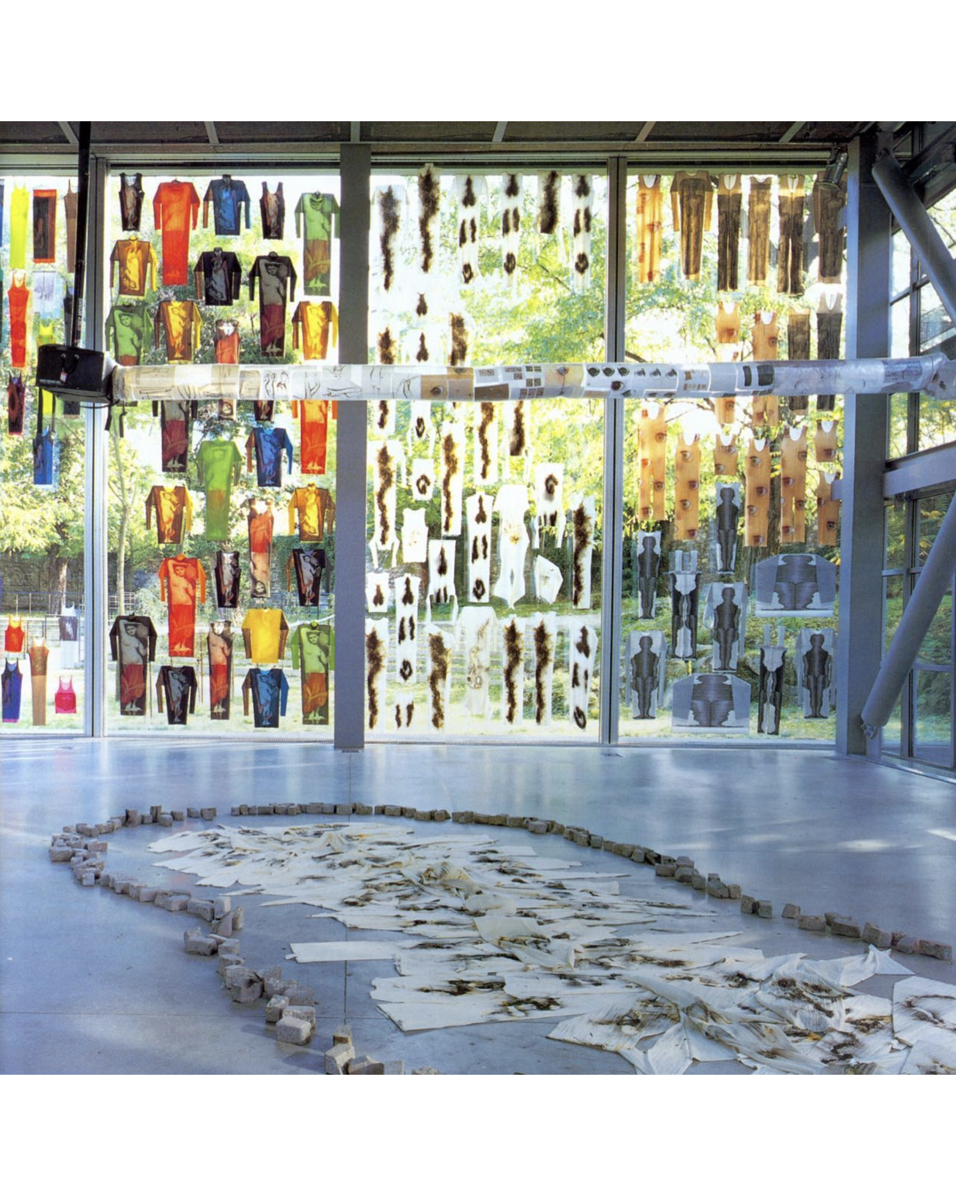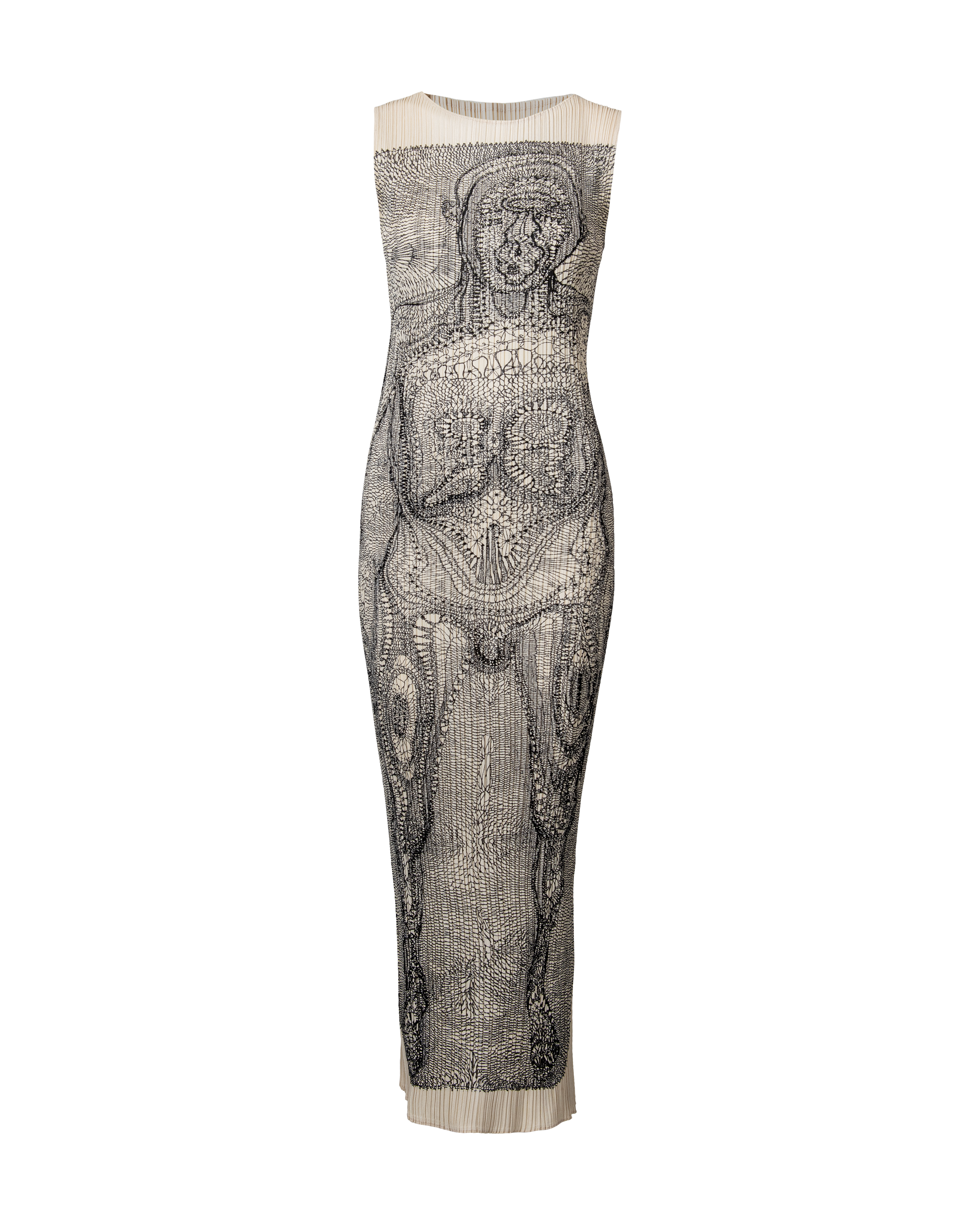 1998 Issey Miyake x Tim Hawkinson 'Guest Artist Series' No. 3 nude man print pleated sleeveless dress. Cream maxi dress with screenprinted gray nude man print, designed in the silhouette of Tim Hawkinson's perception of his own body, in collaboration with Issey Miyake's signature pleated silhouette. A museum-quality piece, as seen in various prominent museums globally and held in LACMA. Plain off-white/cream back. Fabric Contents: 100% Polyester; signature pleated construction that offers high stretch throughout.
