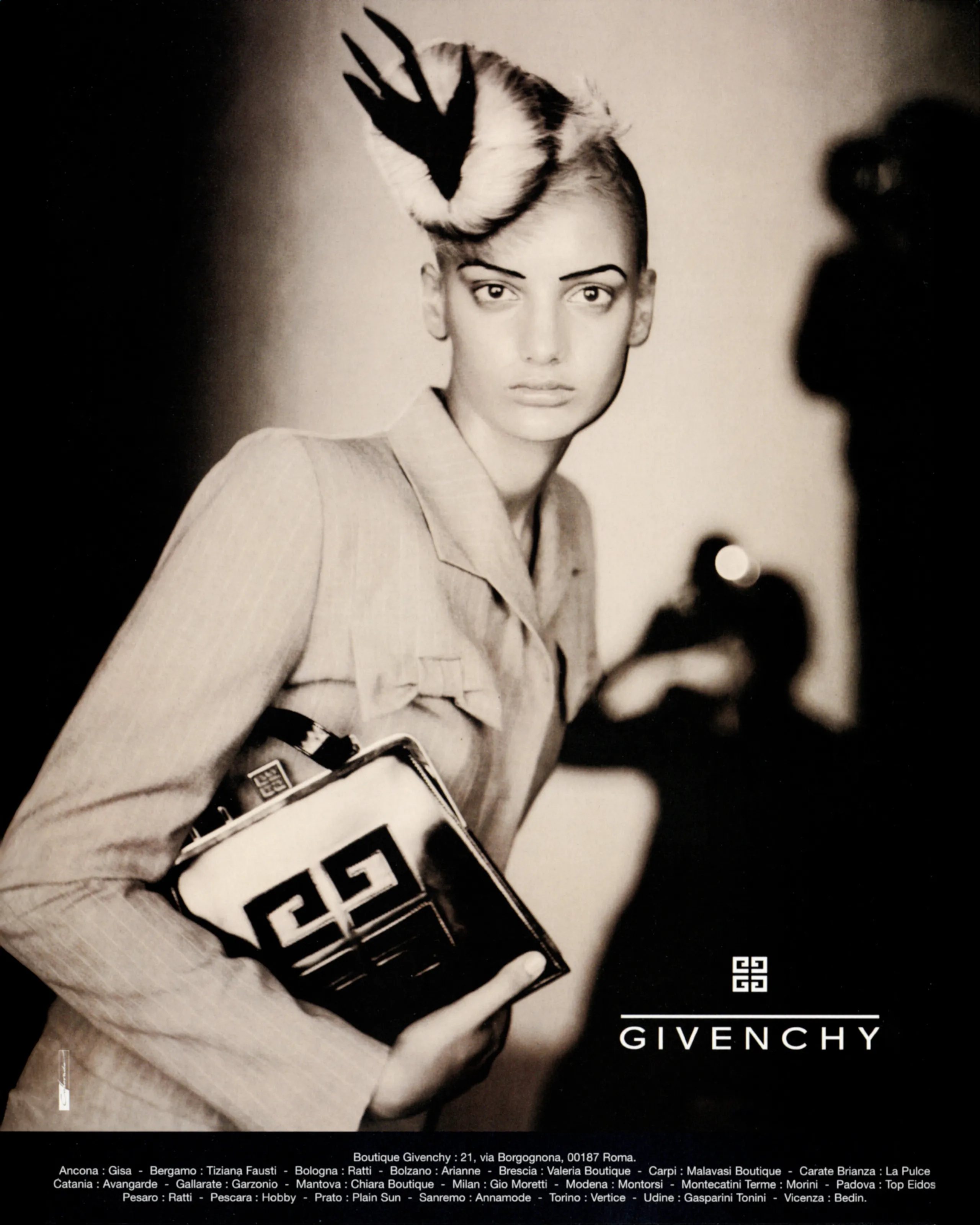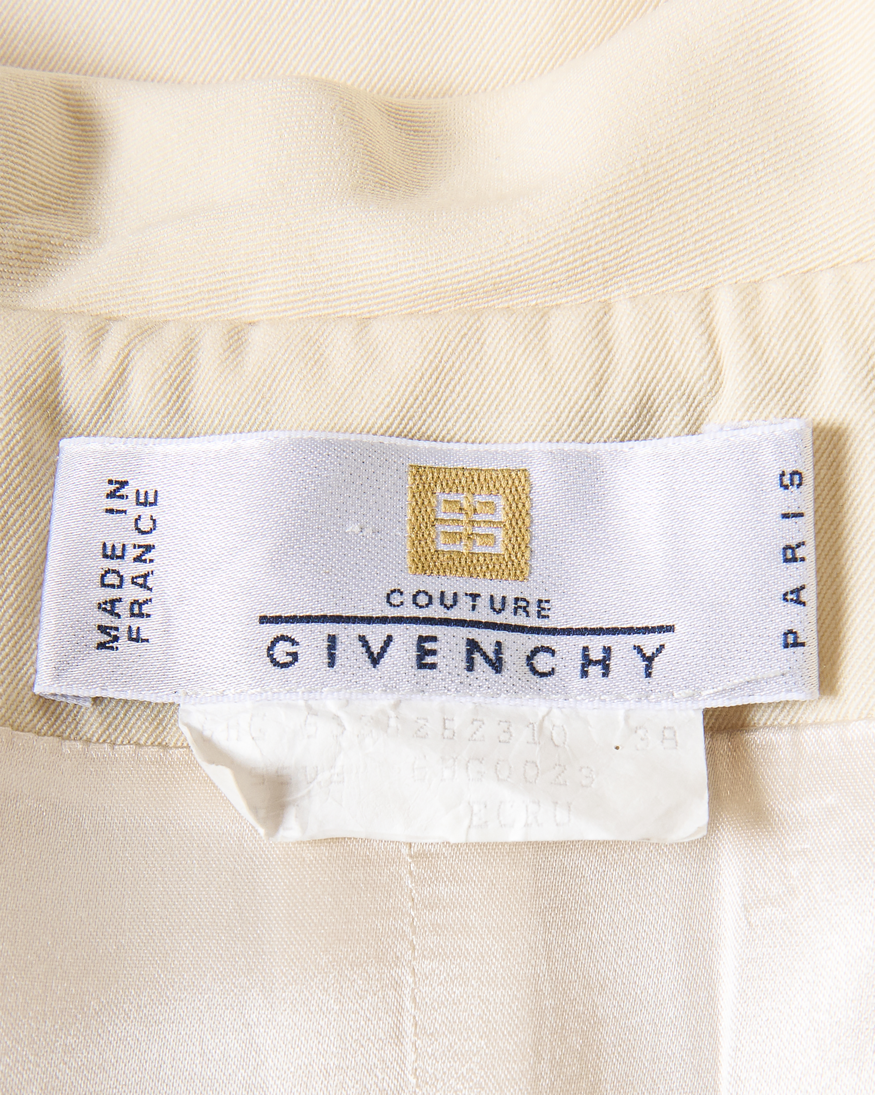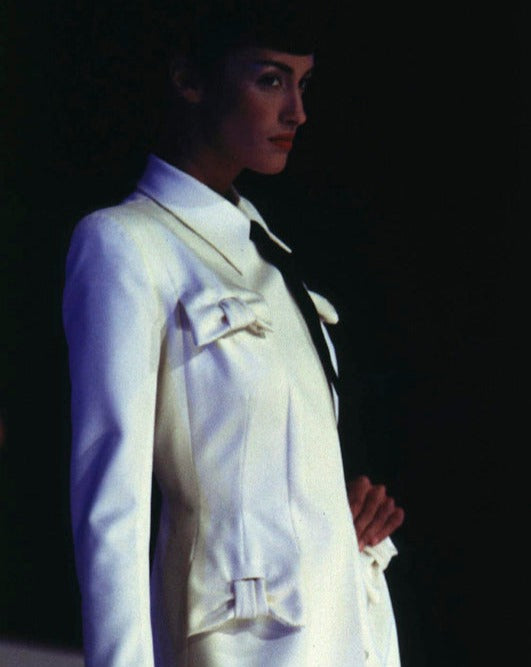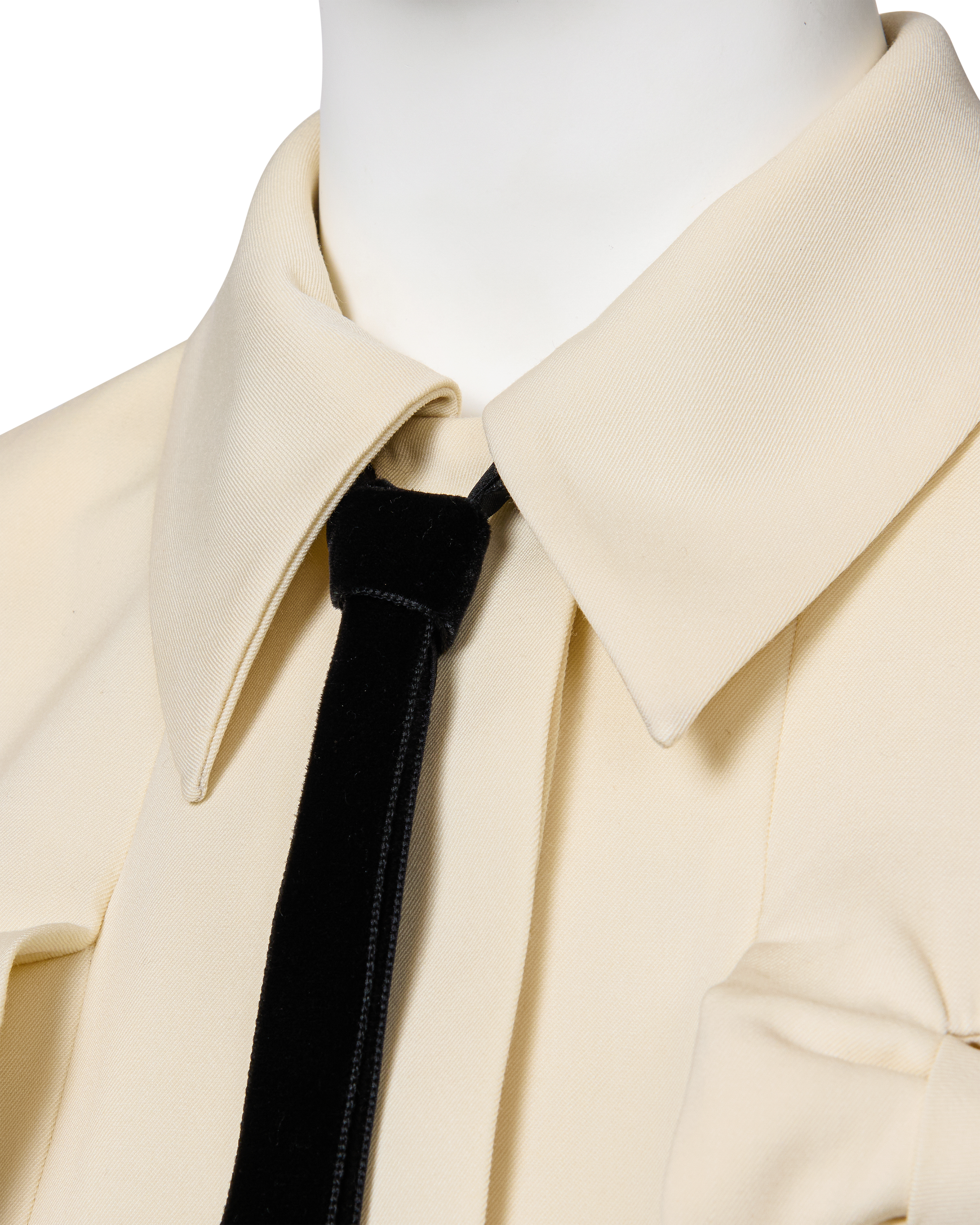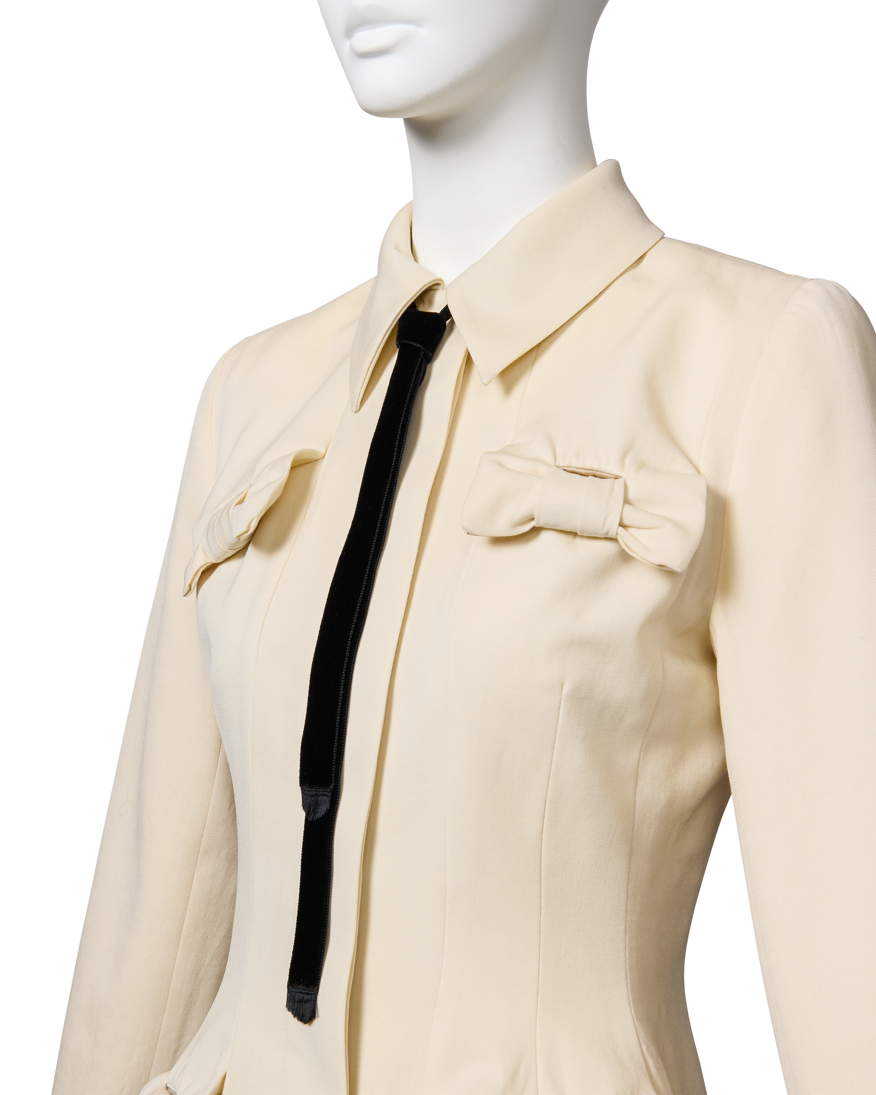 A/W 1996 Givenchy by John Galliano ivory collared mini coat dress with bow details. Long sleeve collared dress, featuring raised bow details at bust and hip and built-in black velvet 'necktie' with intentionally raw edge. Center front button closures. Fabric Contents: 100% Wool with 100% Acetate lining (white lining that contrasts with ivory / off-white exterior). Rare look as seen on the runway on Yasmeen Gauri, with similar featured in the ad campaign (pinstriped variation). In very good vintage condition with very slight bubbling at left side sleeve; has been taken to couture cleaner and arrives ready to wear.