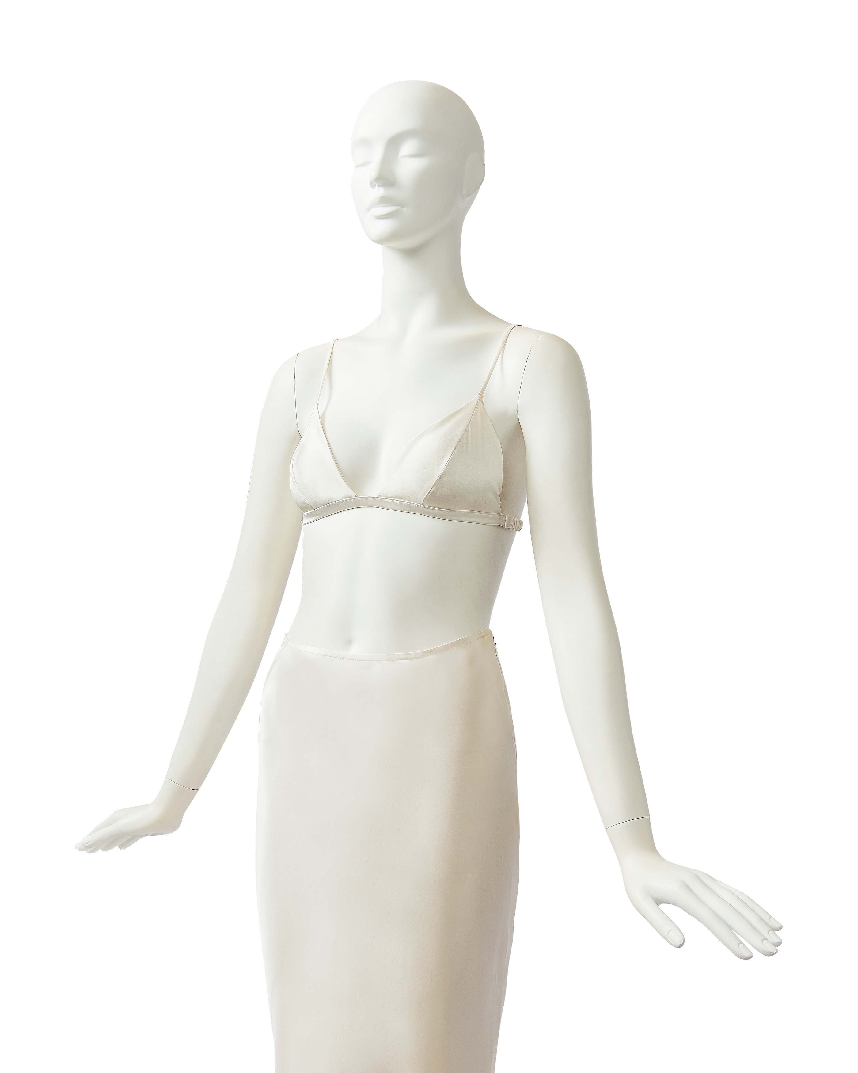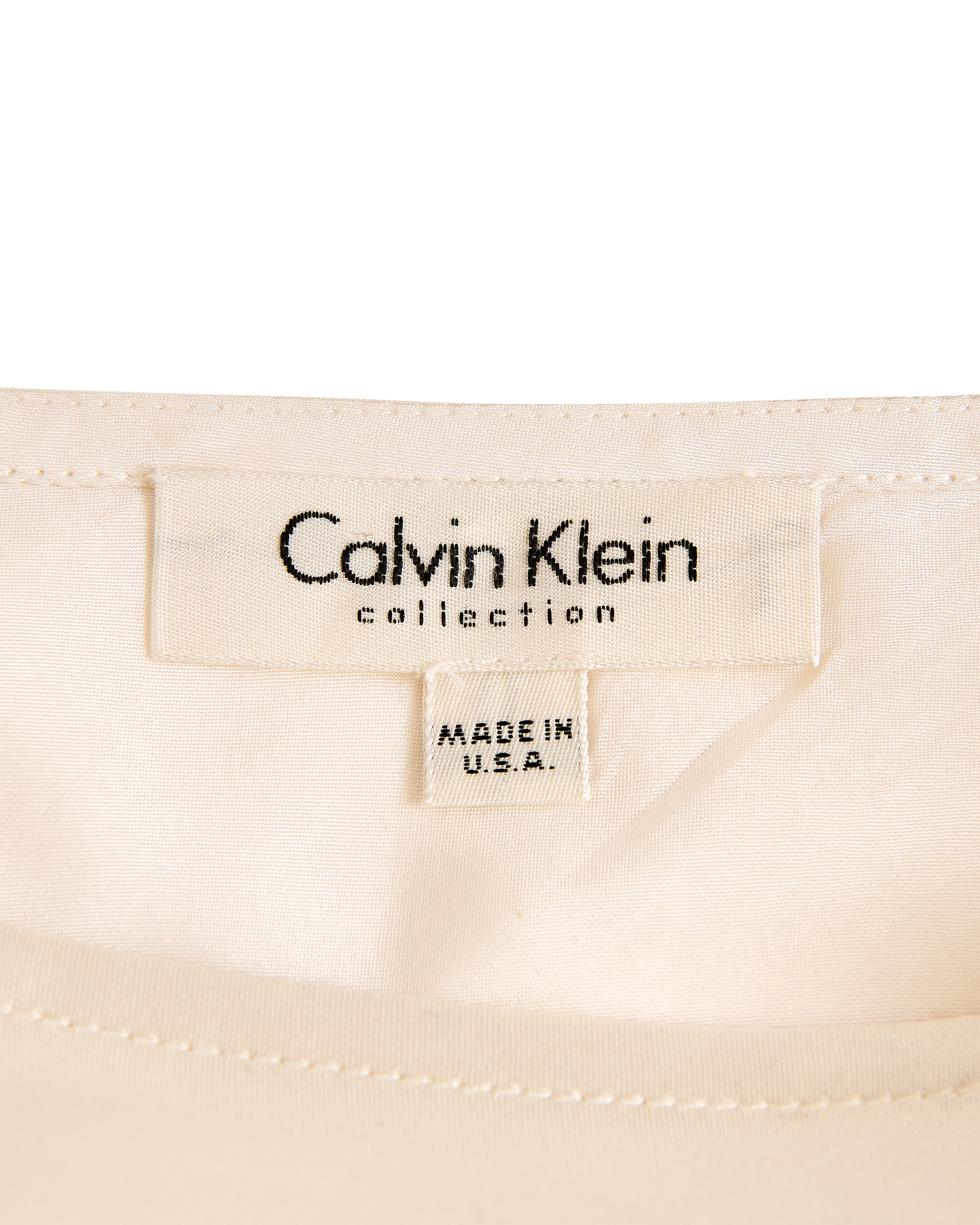 c. 1994 Calvin Klein Collection ivory bias cut maxi skirt. Long ivory skirt with slight A-line silhouette. Concealed side zip closure. Tea or maxi length depending on height. Similar seen on the runway (Look #38). In very good vintage condition with faint spotting at left side hip and back (slightly visible when worn depending on lighting conditions). Fabric contents removed; feels like silk or silk blend. Styled with white bra for e-commerce purposes only; not included with purchase.