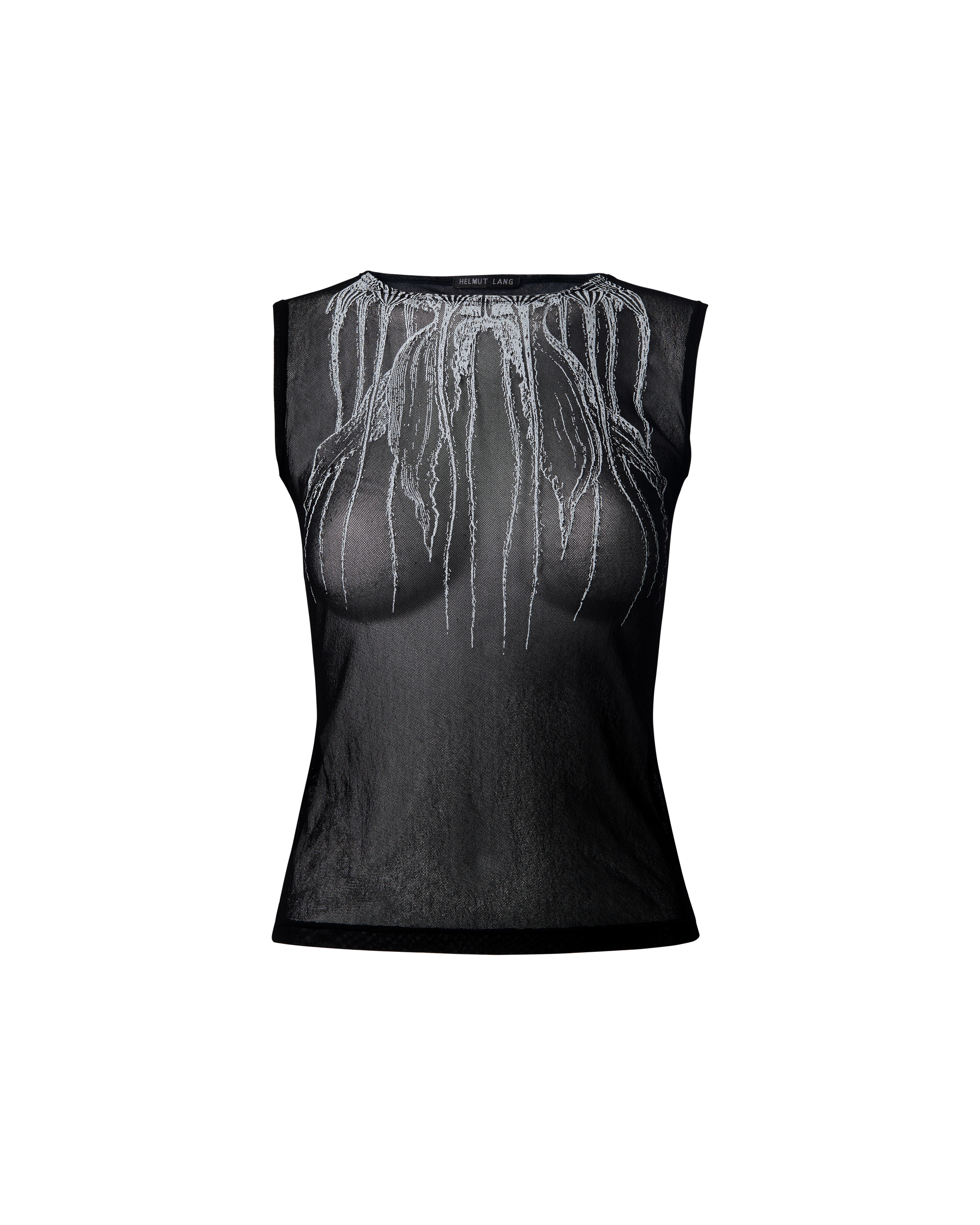 S/S 1996 Helmut Lang black and white mesh printed top. Semi-sheer sleeveless crew neck black mesh top with white contrasting geometric organic print detailing at front. As seen on the runway on Naomi Campbell and Shalom Harlow, with print as central motif of the show; part of MAK Vienna Collection. Similar photographed by Mark Brothwick for i-D magazine's January 1996 issue. In excellent vintage condition with no flaws to note.