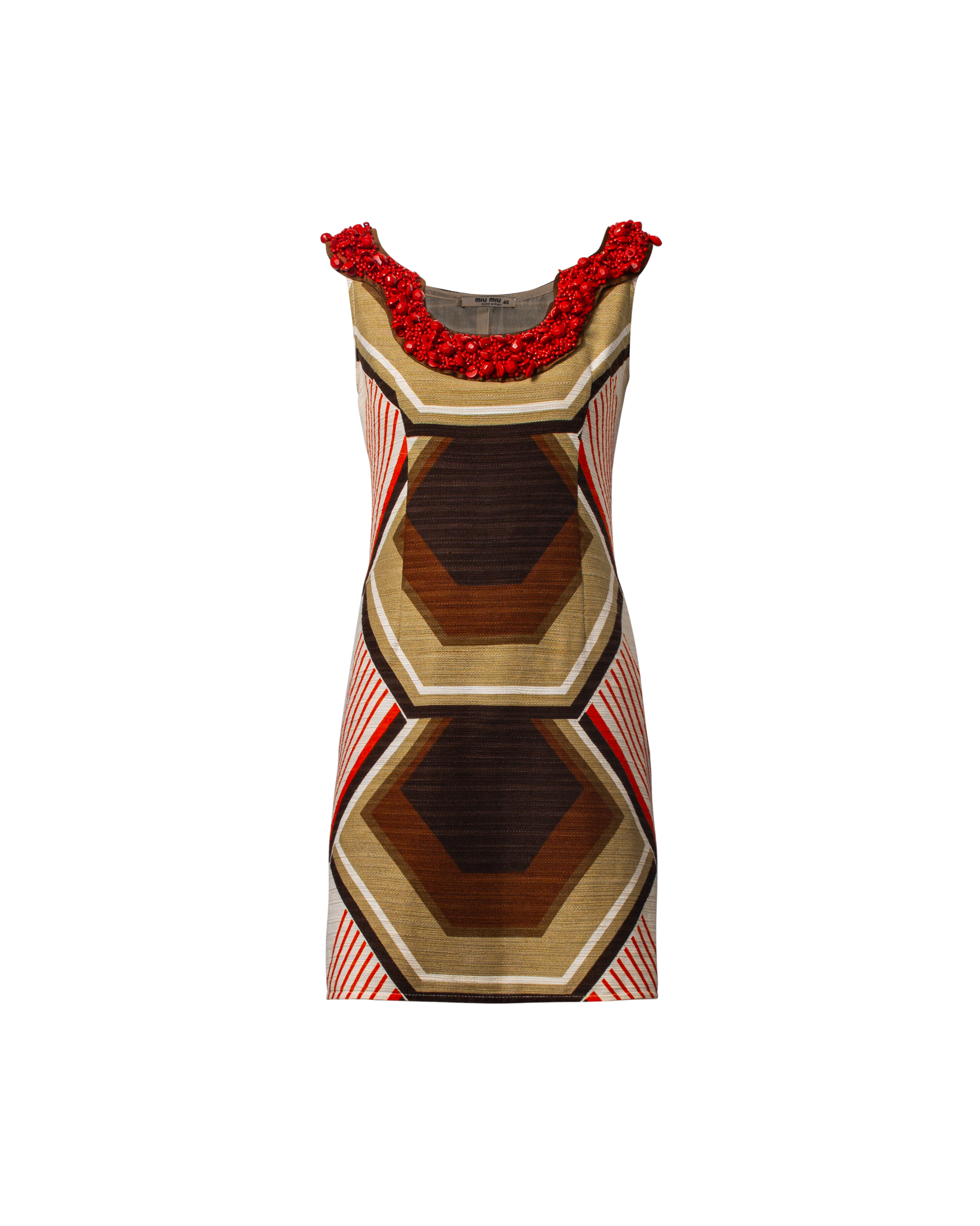S/S 2005 Miu Miu by Miuccia Prada geometric patterned dress with embellished bust. Sleeveless above-knee mini shift dress with geometric curved bustline, featuring red-orange embellishments at bust. Contrasting brown, olive green, white and red-orange stripe / geometric patterning throughout. Fabric Contents: 79% Cotton and 21% Linen blend. Concealed side zip closure. As seen on the runway (Look #25). In very good vintage condition with moderate spotting at interior lining.