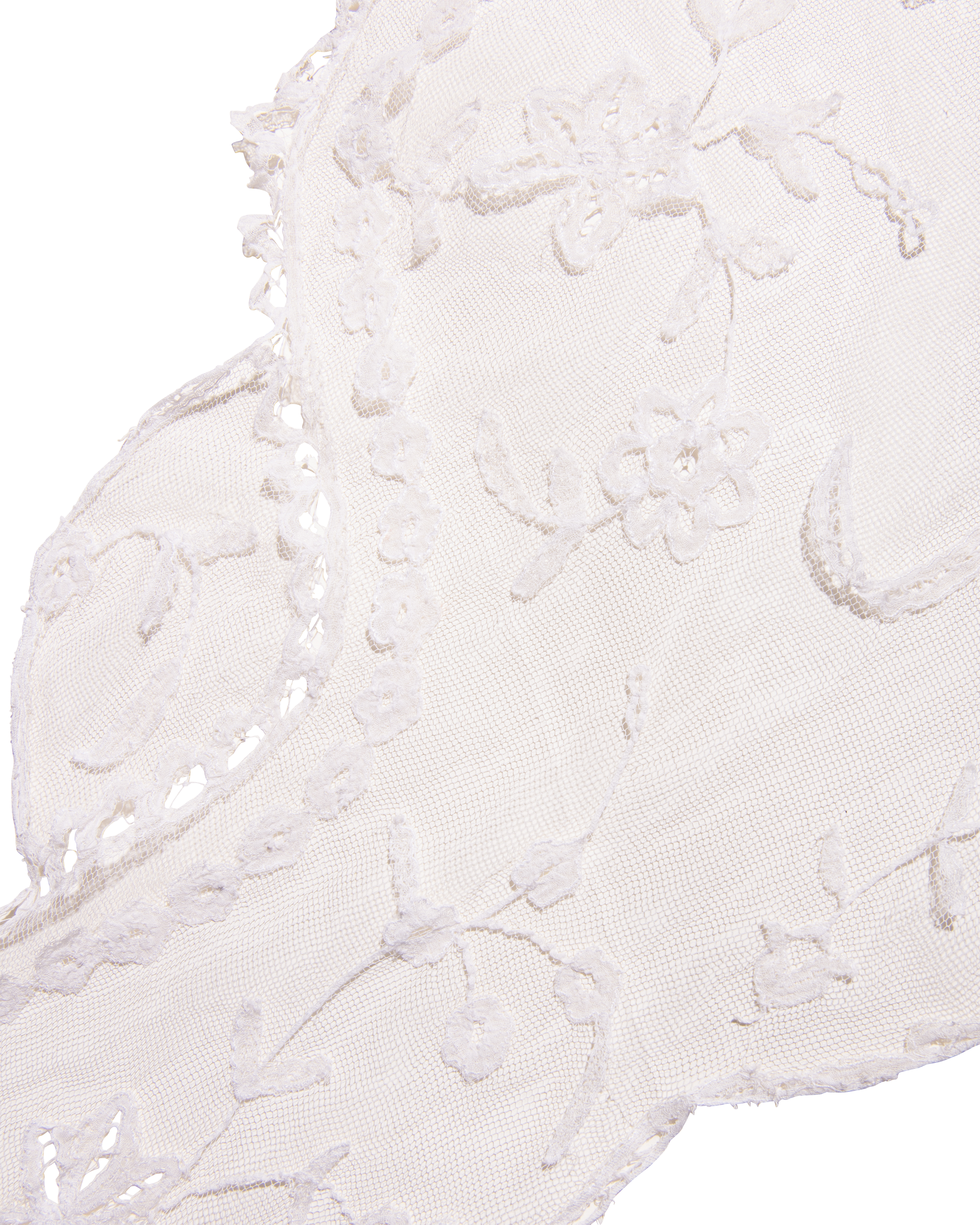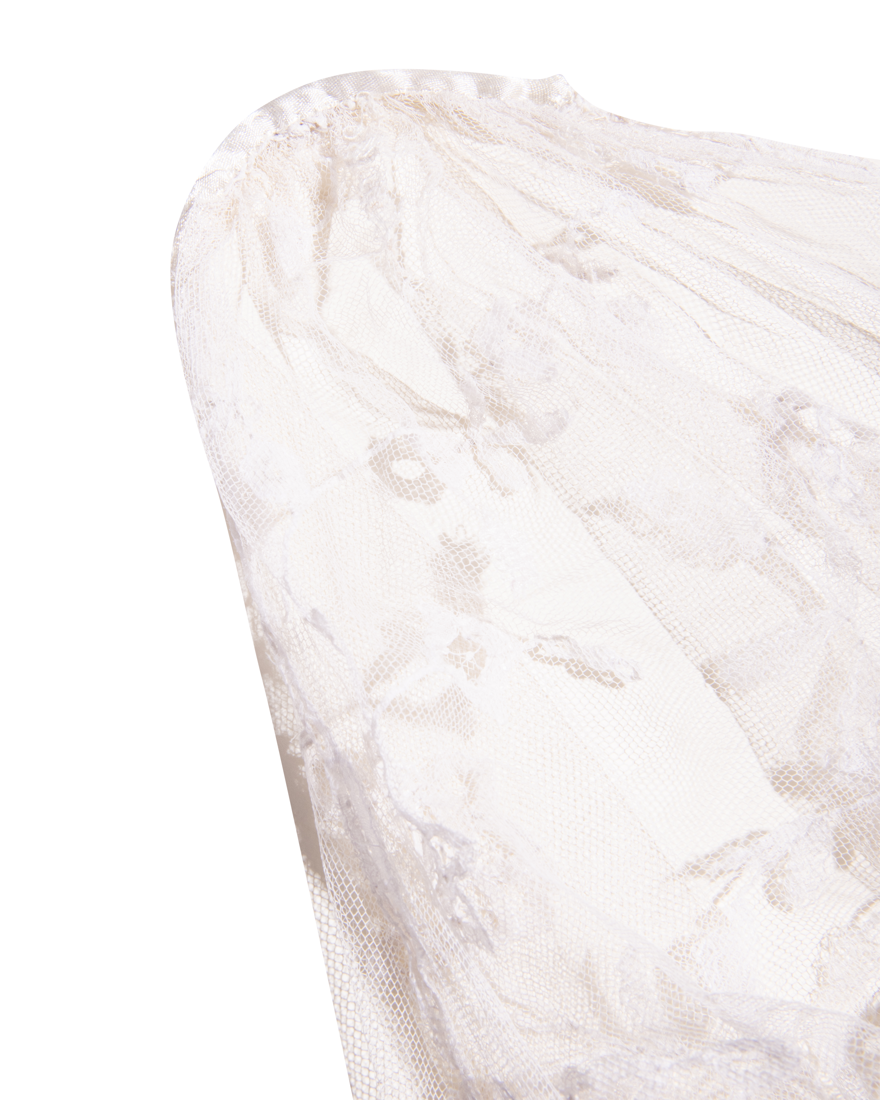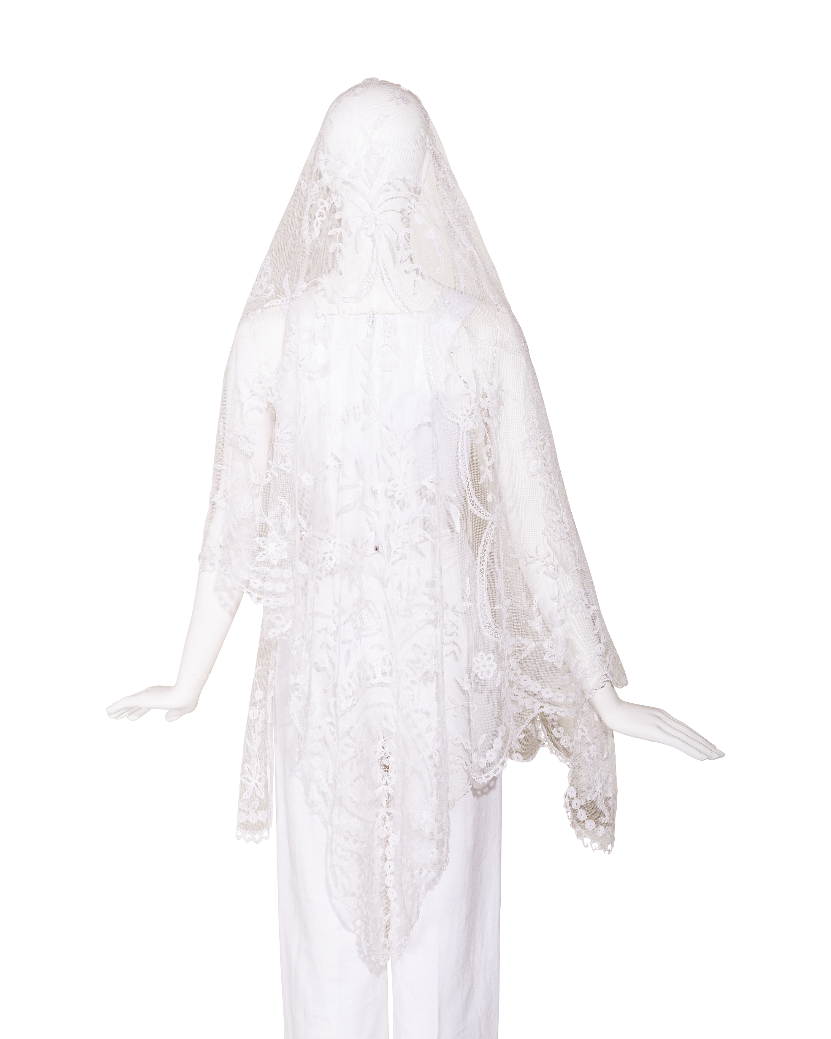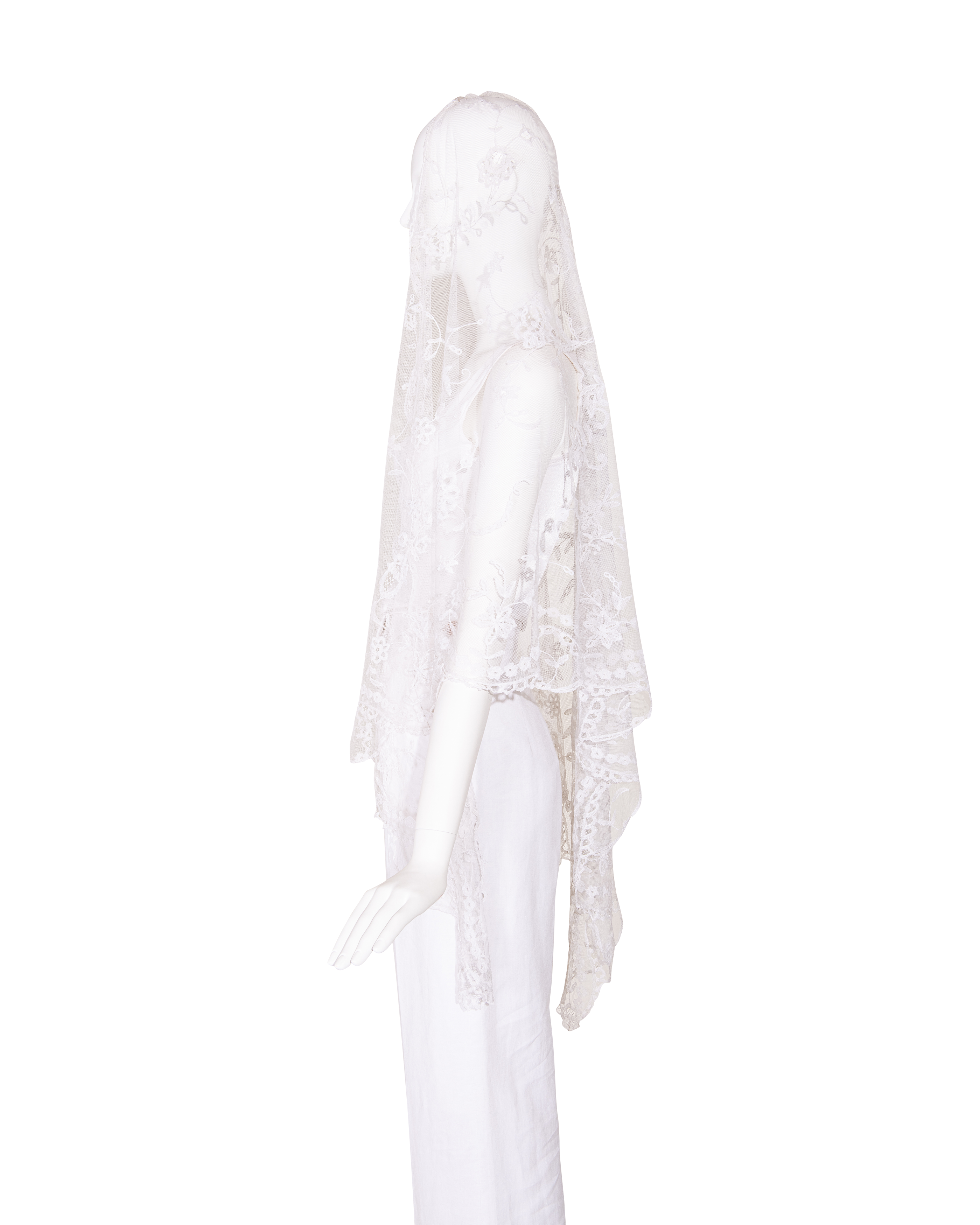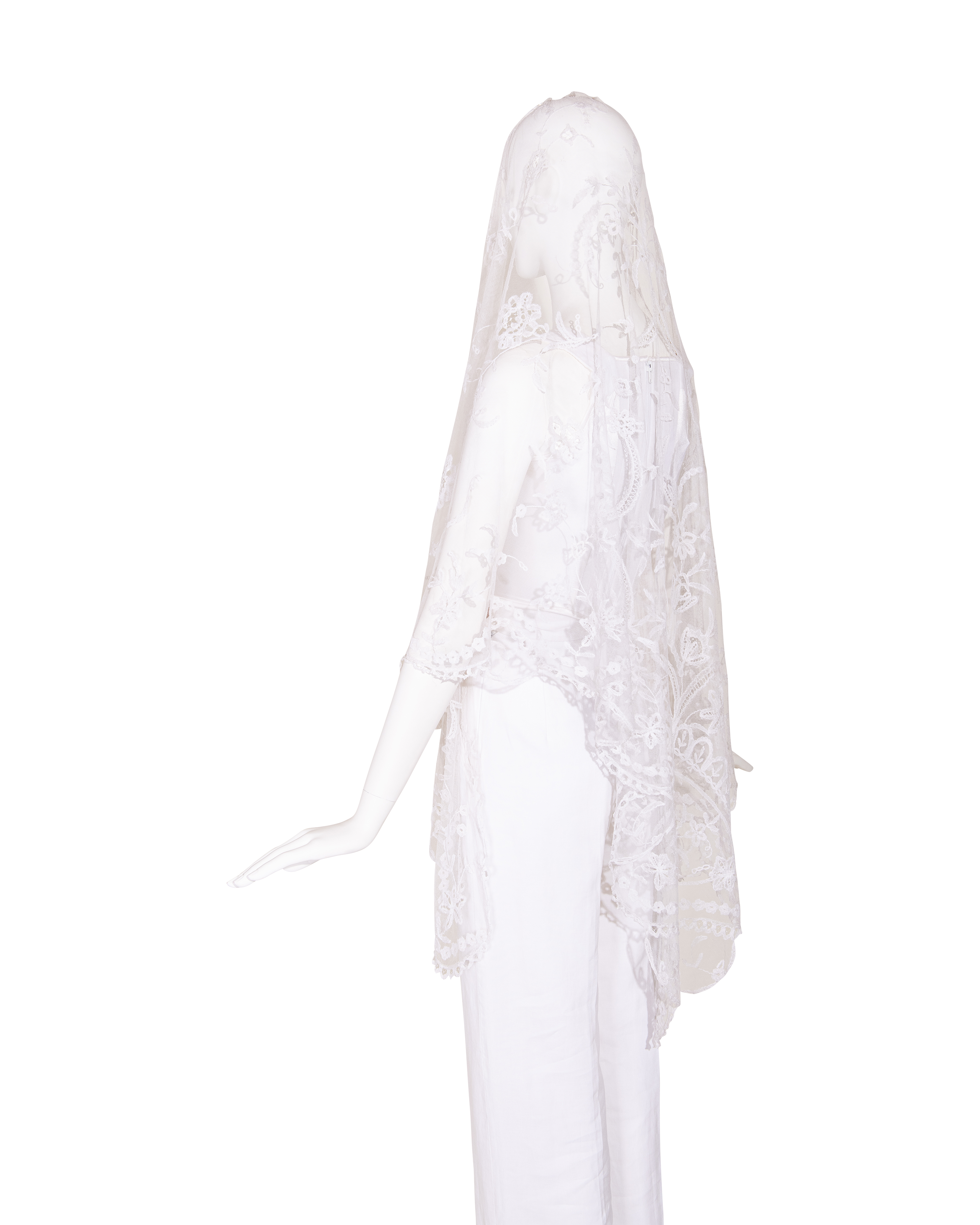 1910's Special Vintage ivory handmade lace veil. Very rare early 1900's lace with intricate floral detailing and scallop lace hem. Can be styled as veil, wrap or stole as desired. In very good vintage condition with light wear throughout consistent with age, including very faint holes throughout; has been taken to couture cleaner and arrives ready to wear, restored to original off-white color. Short silk segment in front (repair where originally attached to headpiece). Styled with white Vivienne Westwood set for e-commerce purposes only; set not included with purchase.