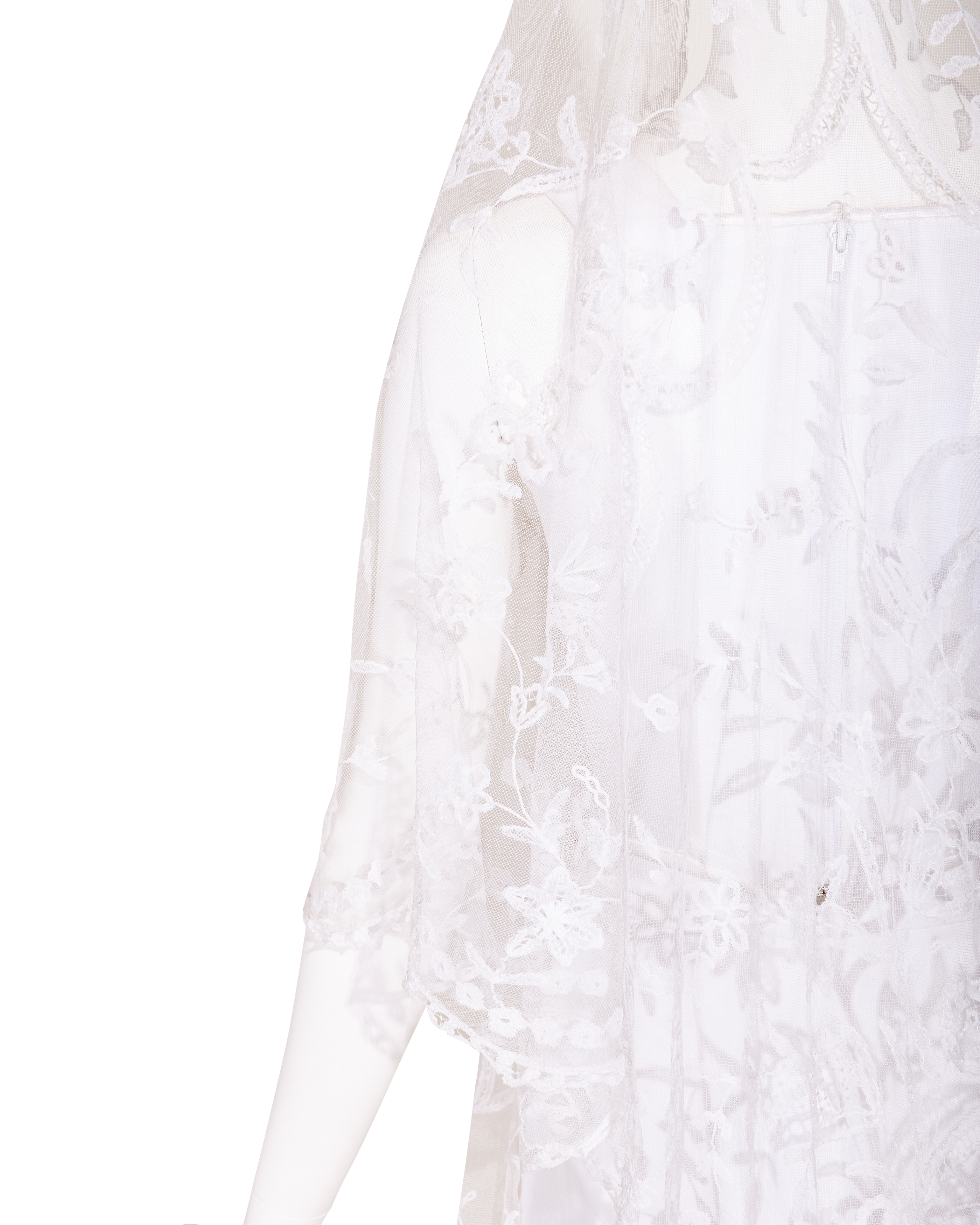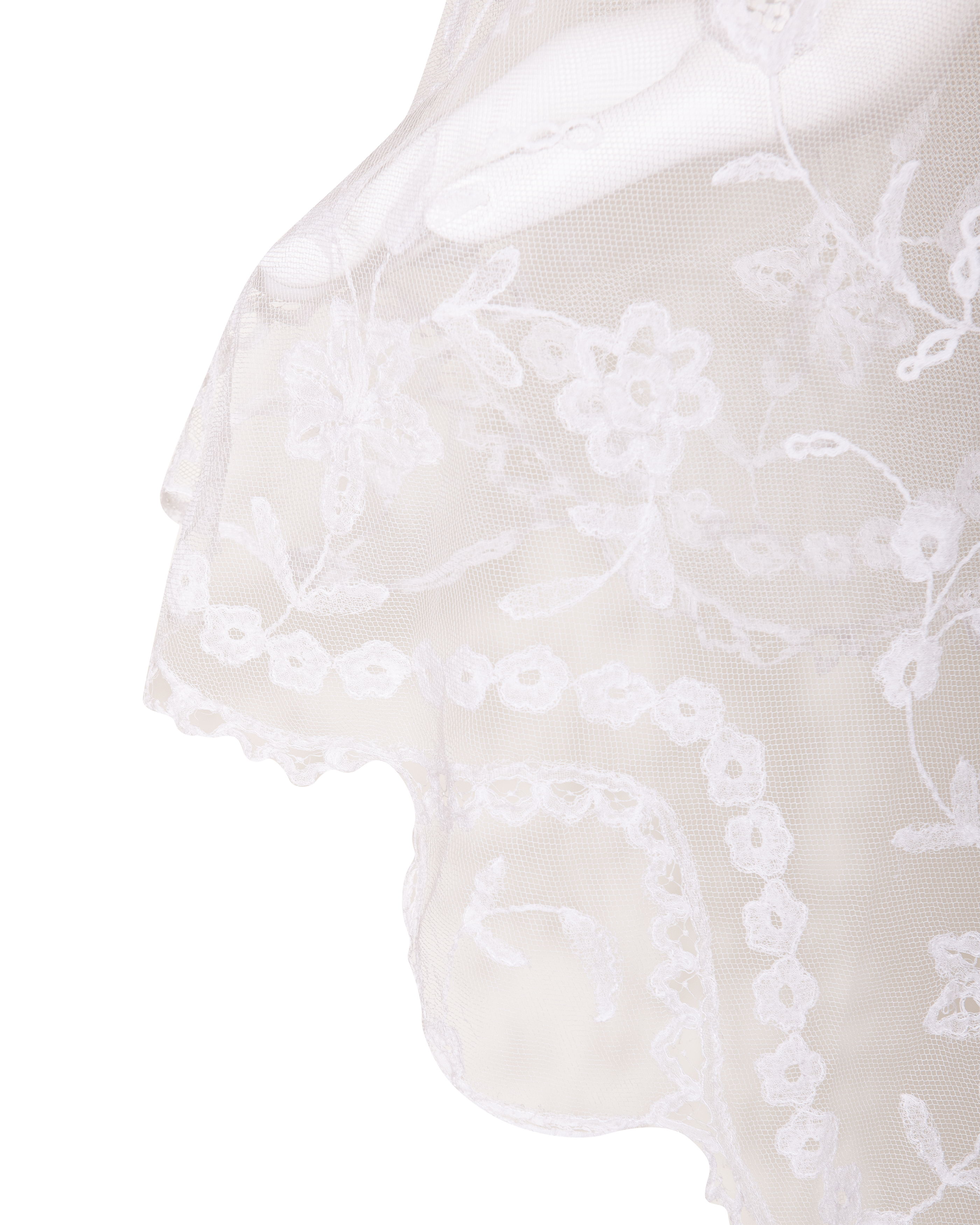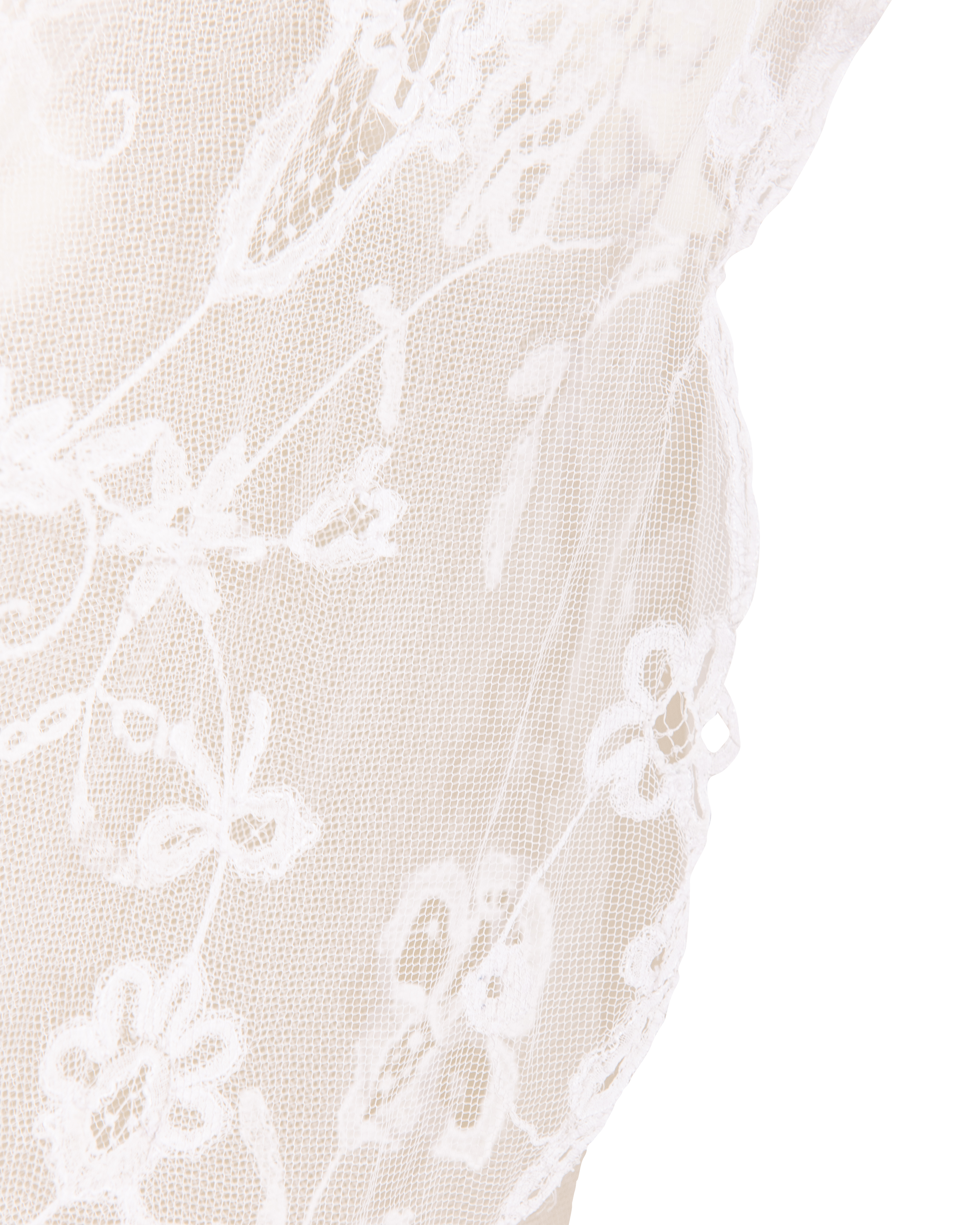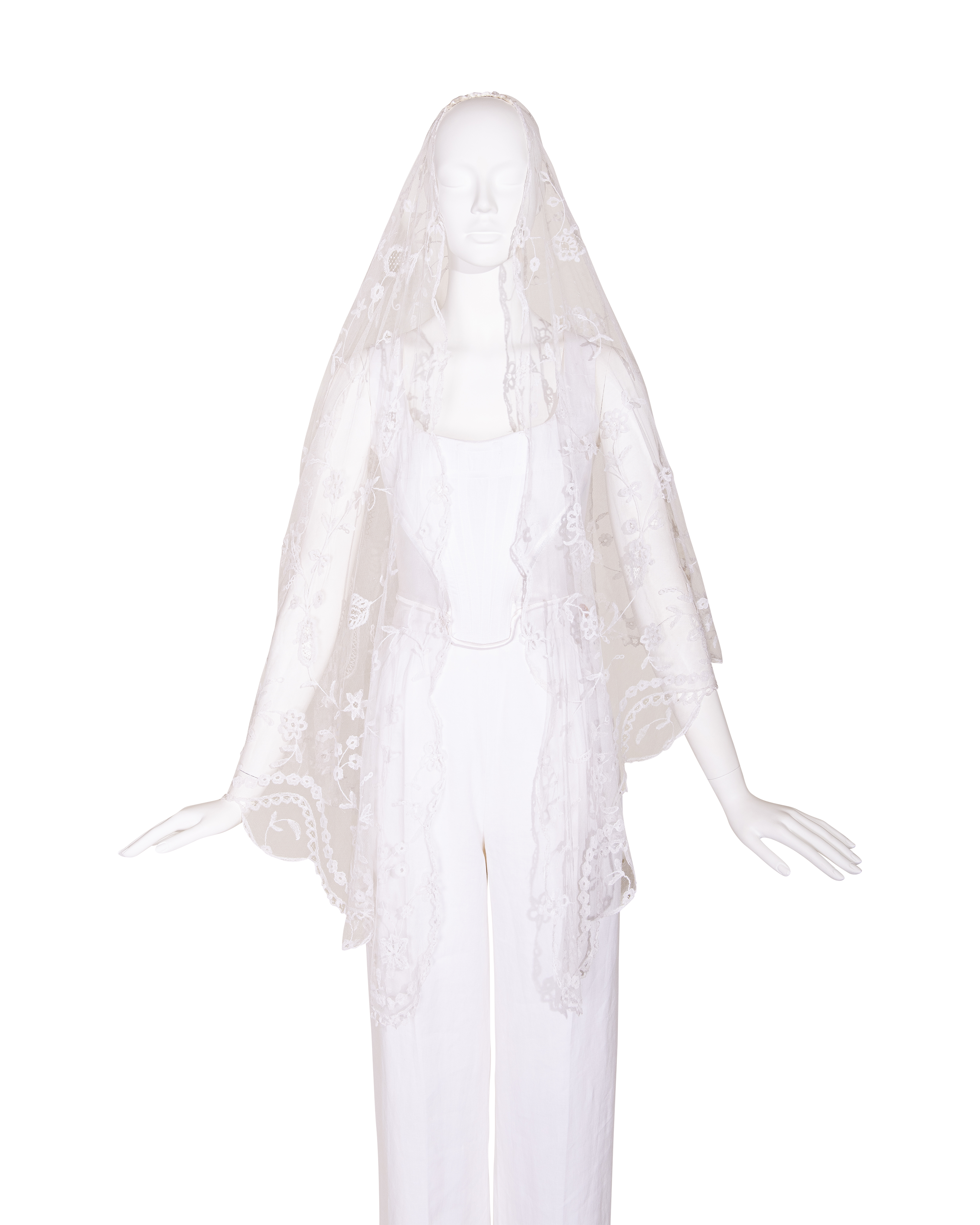 1910's Special Vintage ivory handmade lace veil. Very rare early 1900's lace with intricate floral detailing and scallop lace hem. Can be styled as veil, wrap or stole as desired. In very good vintage condition with light wear throughout consistent with age, including very faint holes throughout; has been taken to couture cleaner and arrives ready to wear, restored to original off-white color. Short silk segment in front (repair where originally attached to headpiece). Styled with white Vivienne Westwood set for e-commerce purposes only; set not included with purchase.