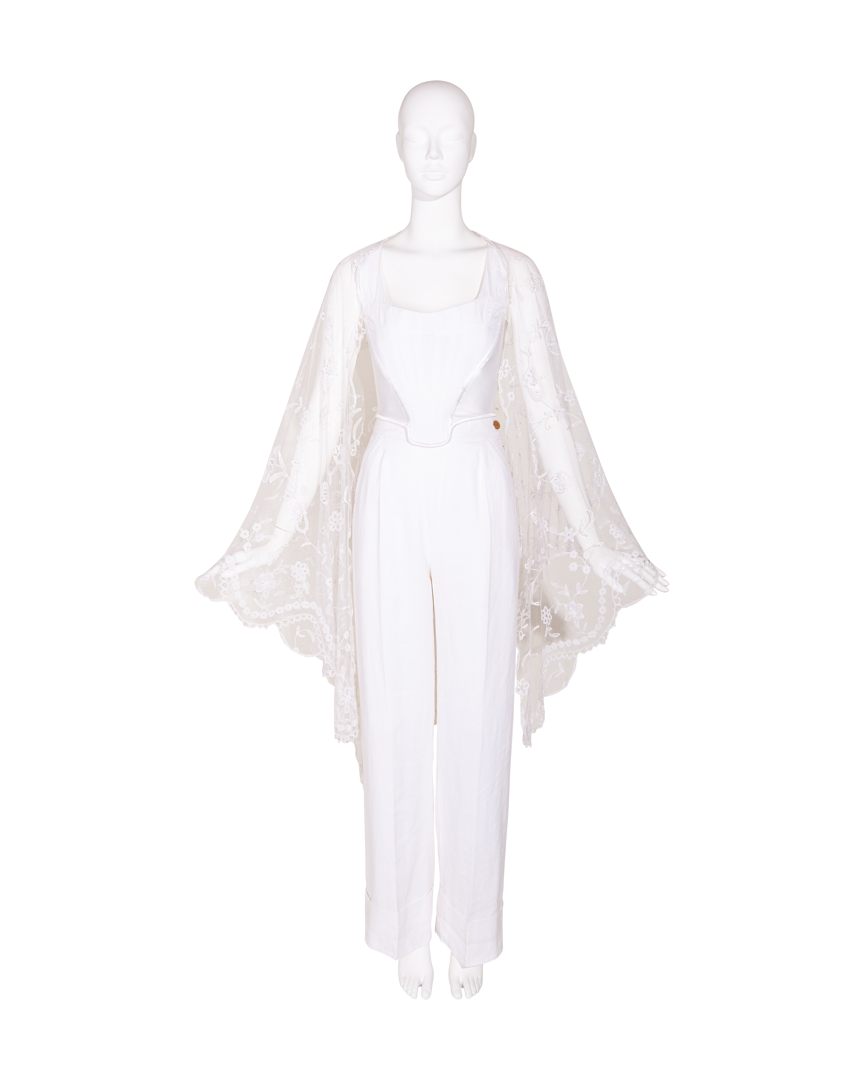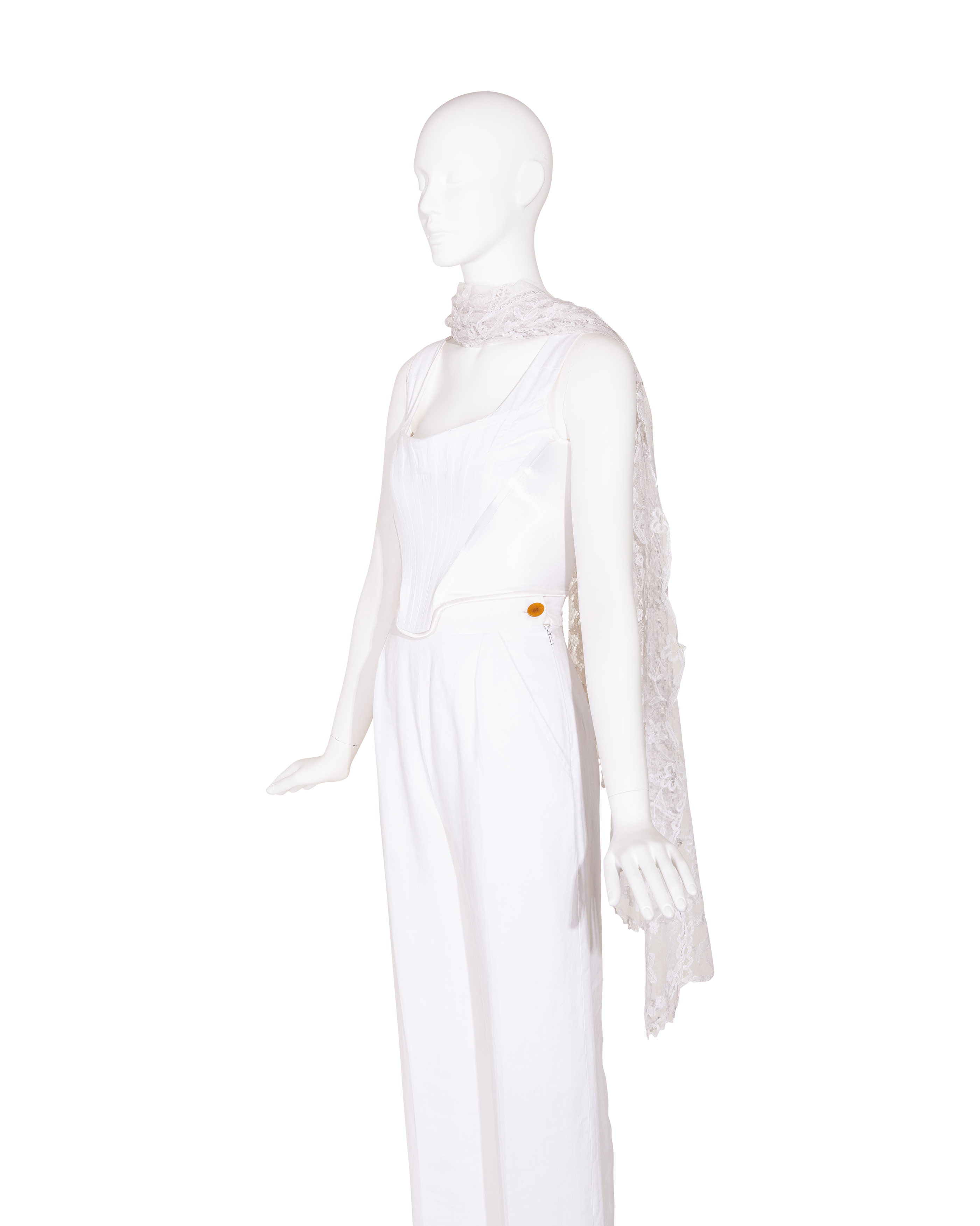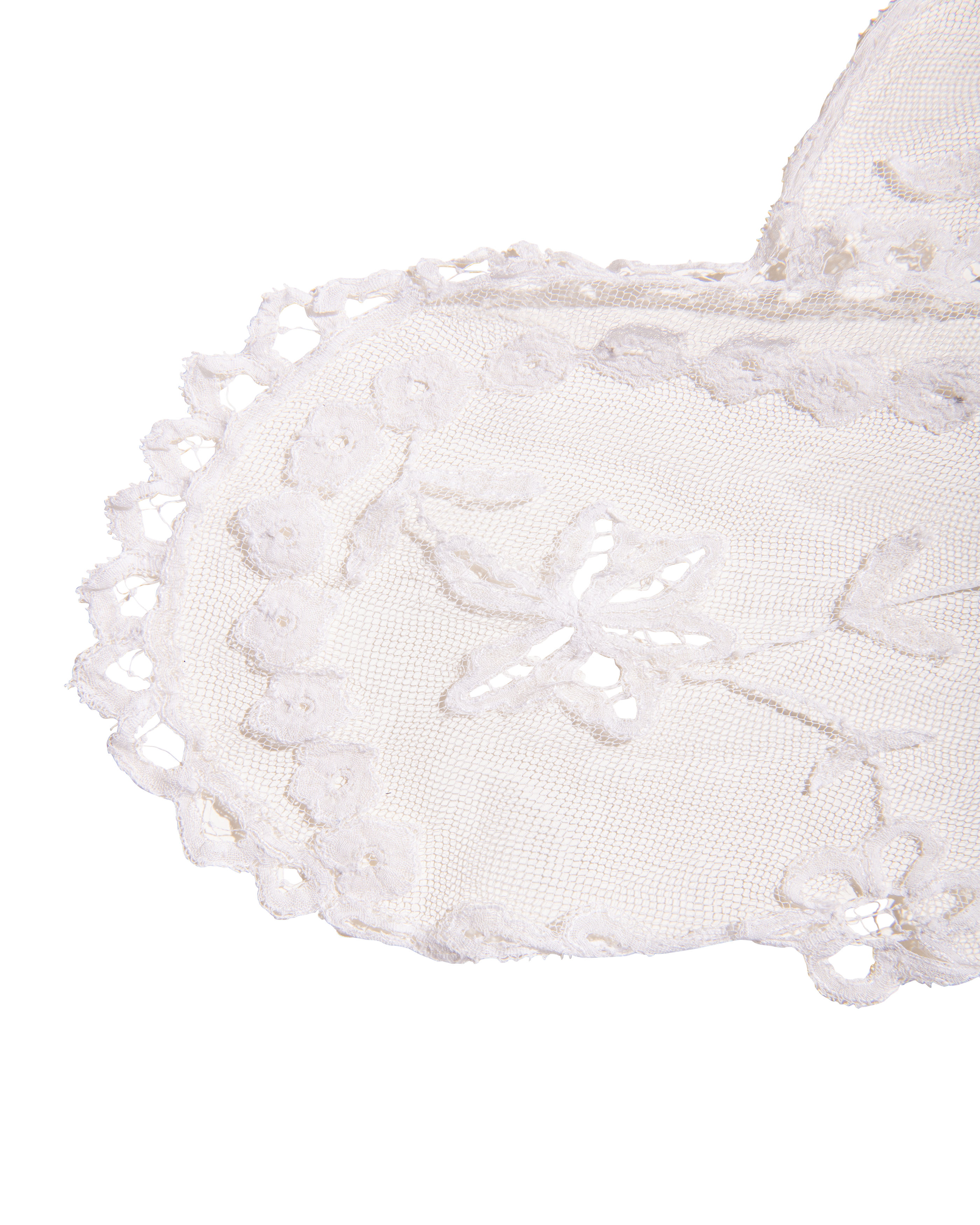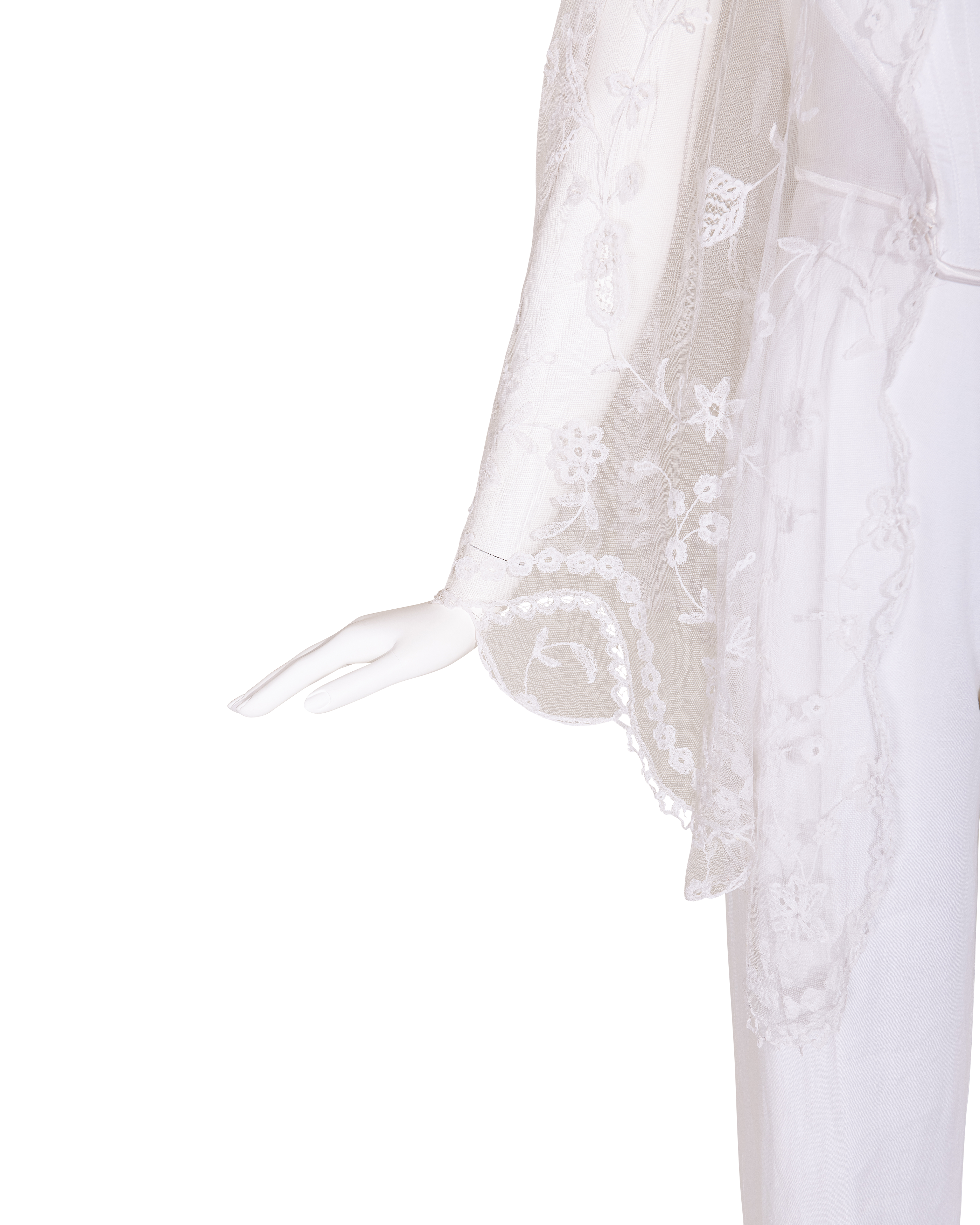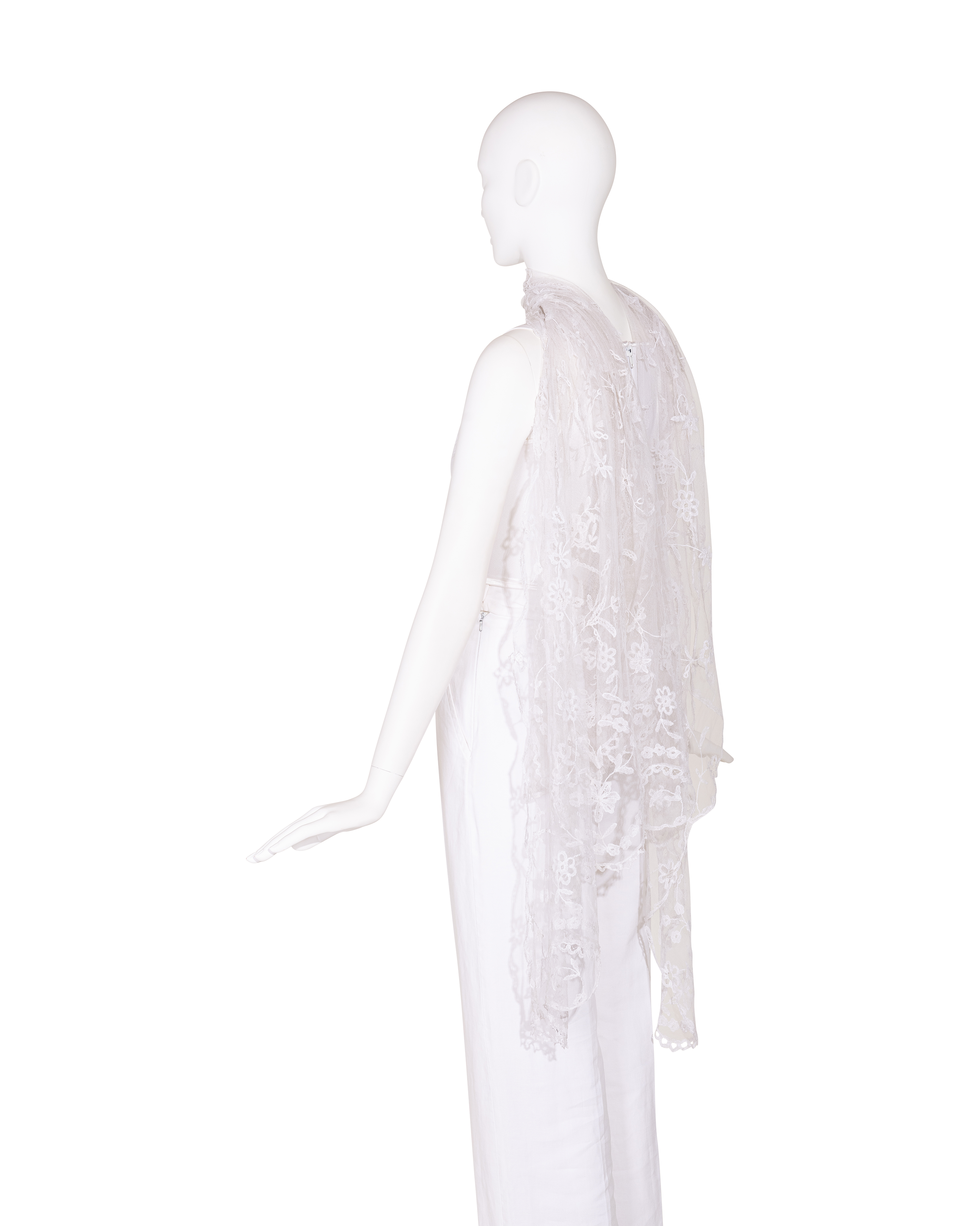 1910's Special Vintage ivory handmade lace veil. Very rare early 1900's lace with intricate floral detailing and scallop lace hem. Can be styled as veil, wrap or stole as desired. In very good vintage condition with light wear throughout consistent with age, including very faint holes throughout; has been taken to couture cleaner and arrives ready to wear, restored to original off-white color. Short silk segment in front (repair where originally attached to headpiece). Styled with white Vivienne Westwood set for e-commerce purposes only; set not included with purchase.