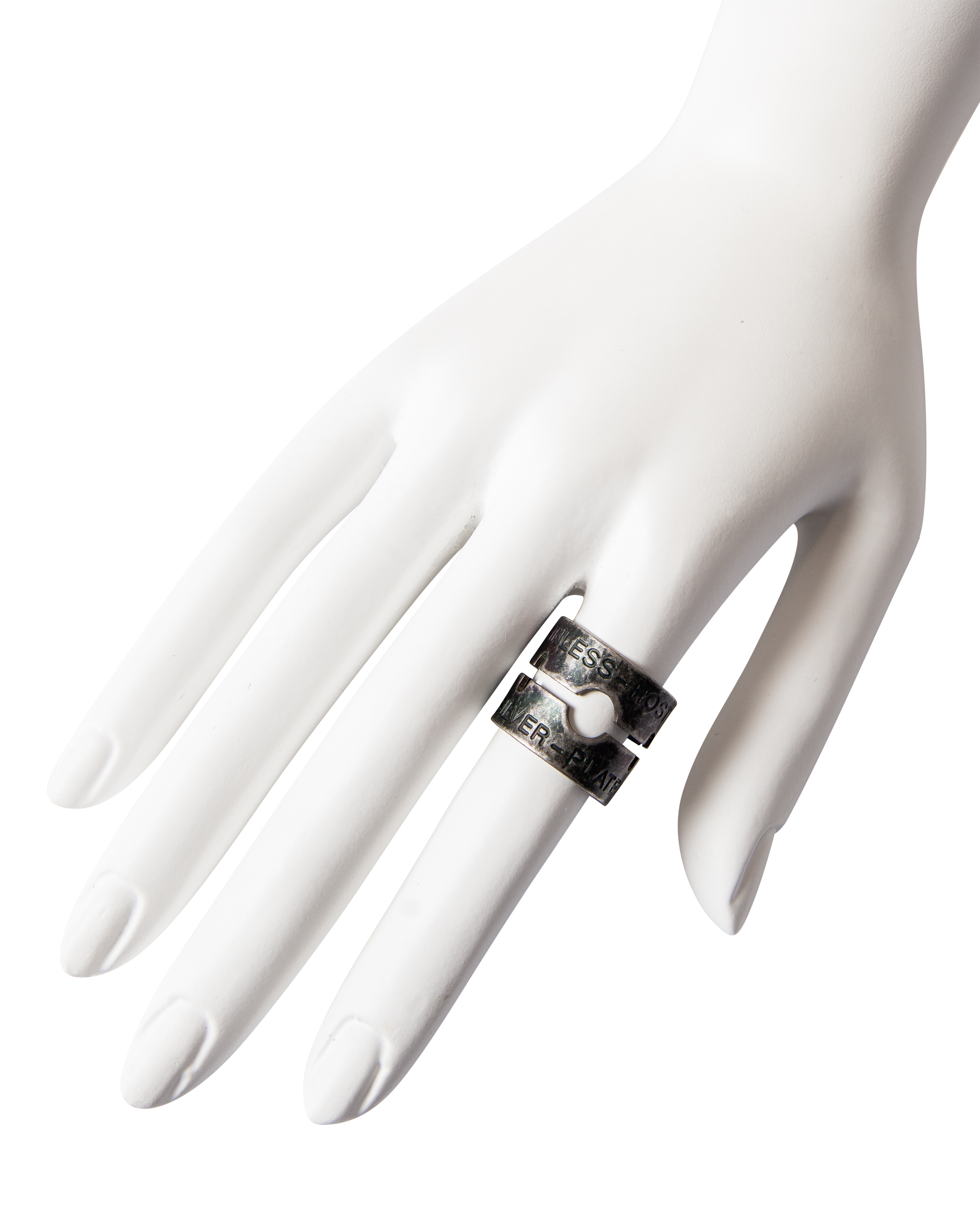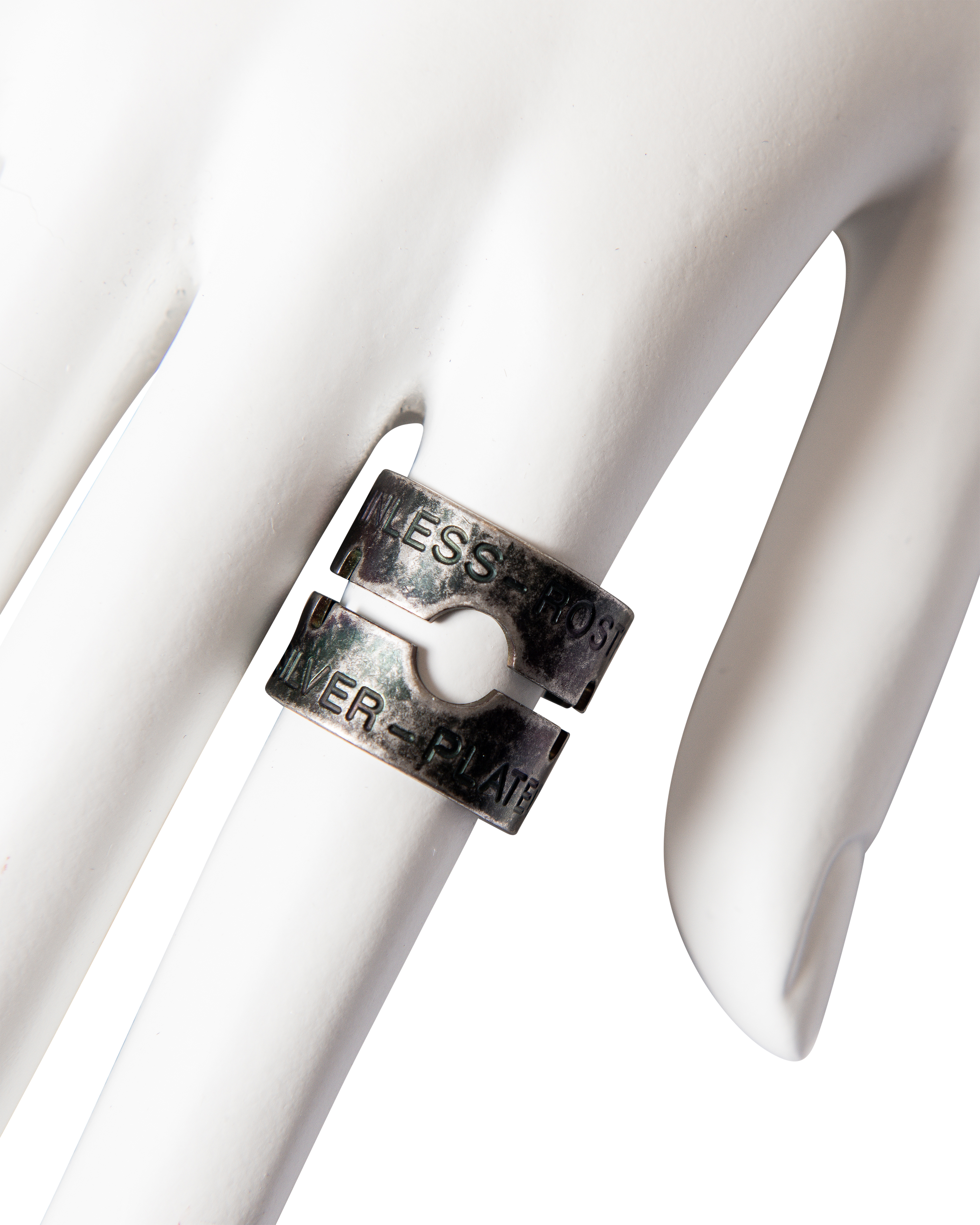 c. 2007 Maison Martin Margiela 'stainless steel' razor blade ring. Designed to look like curved steel-plated razor blade. In excellent vintage condition with no flaws to note; wear and patina are intentional features of design.