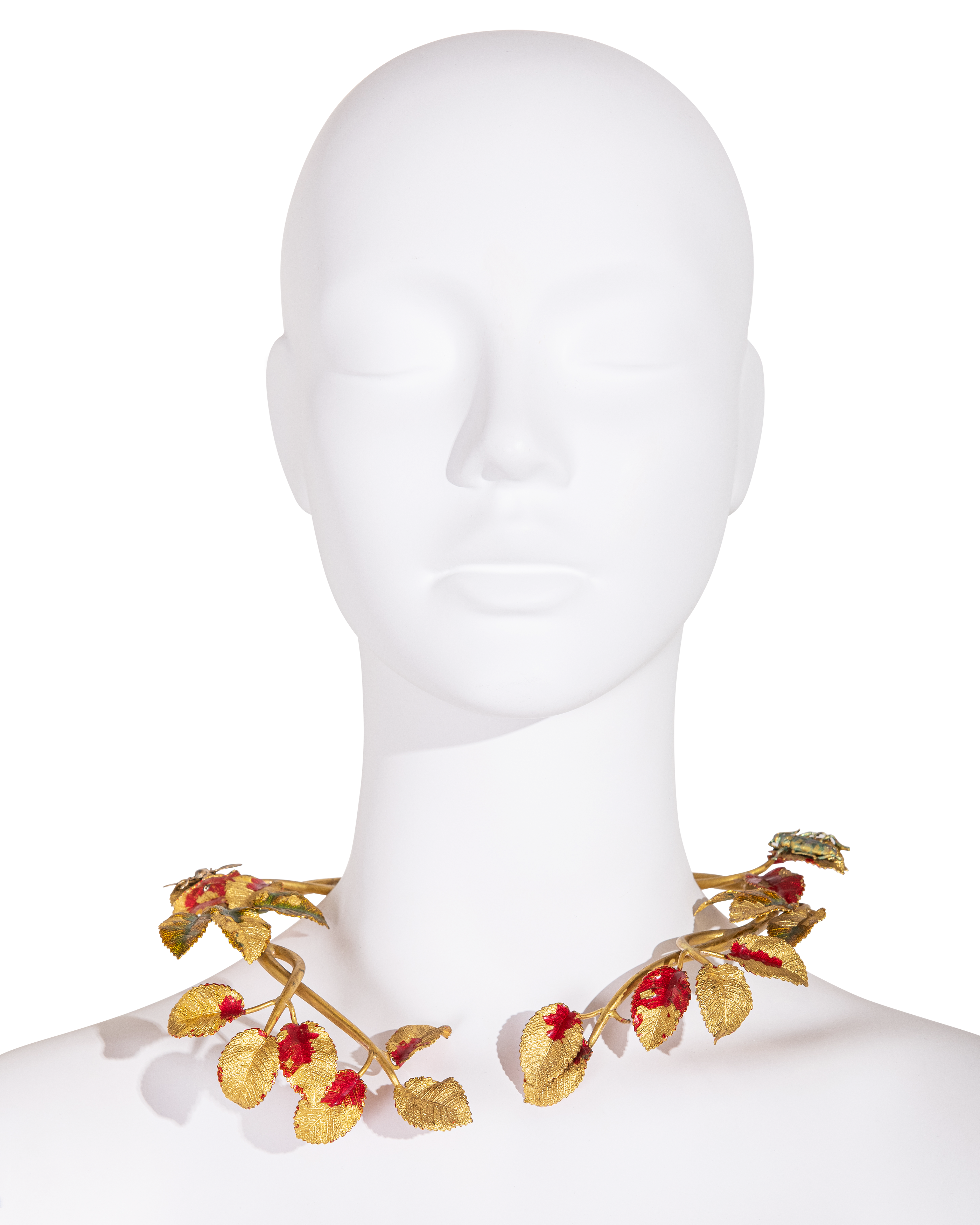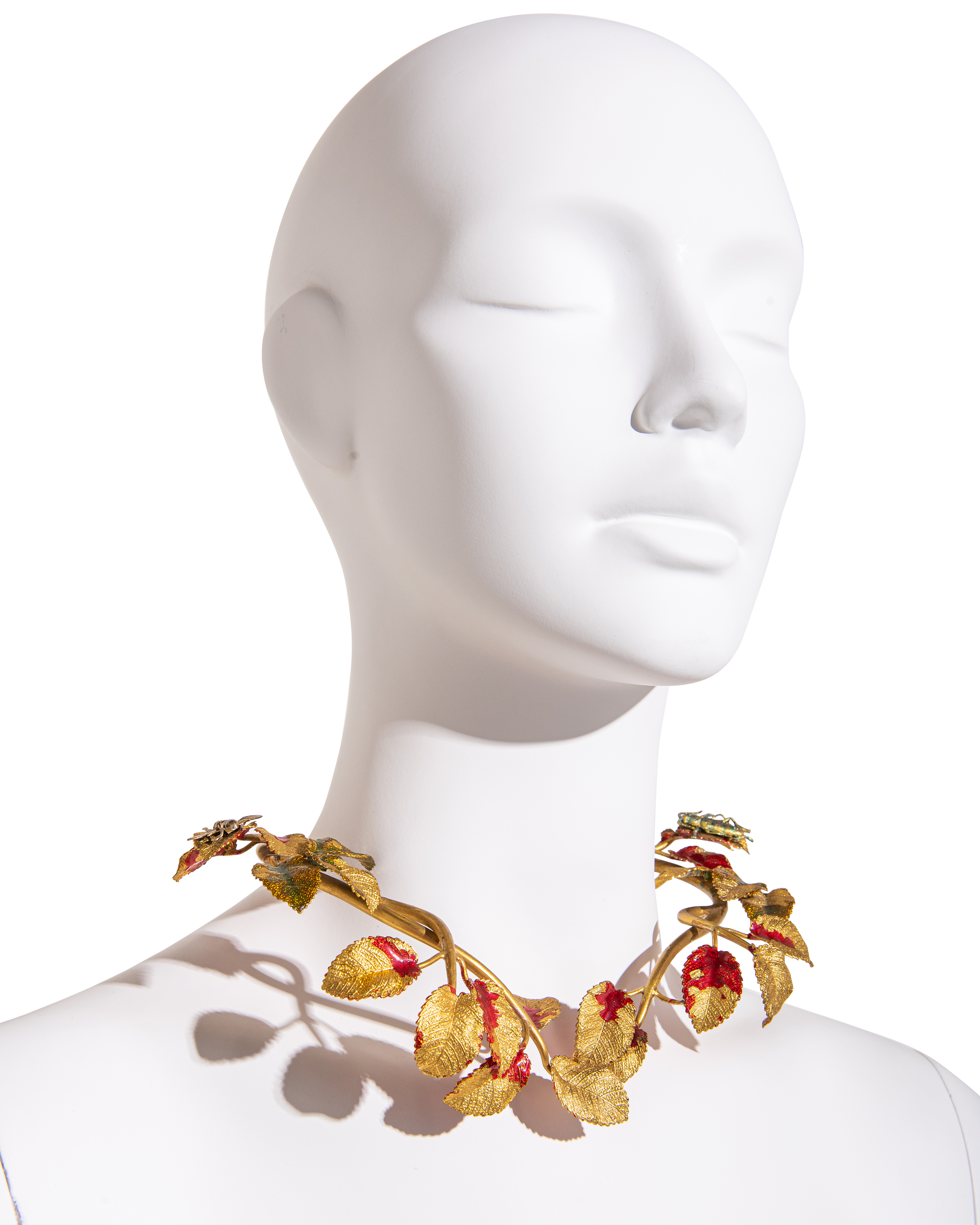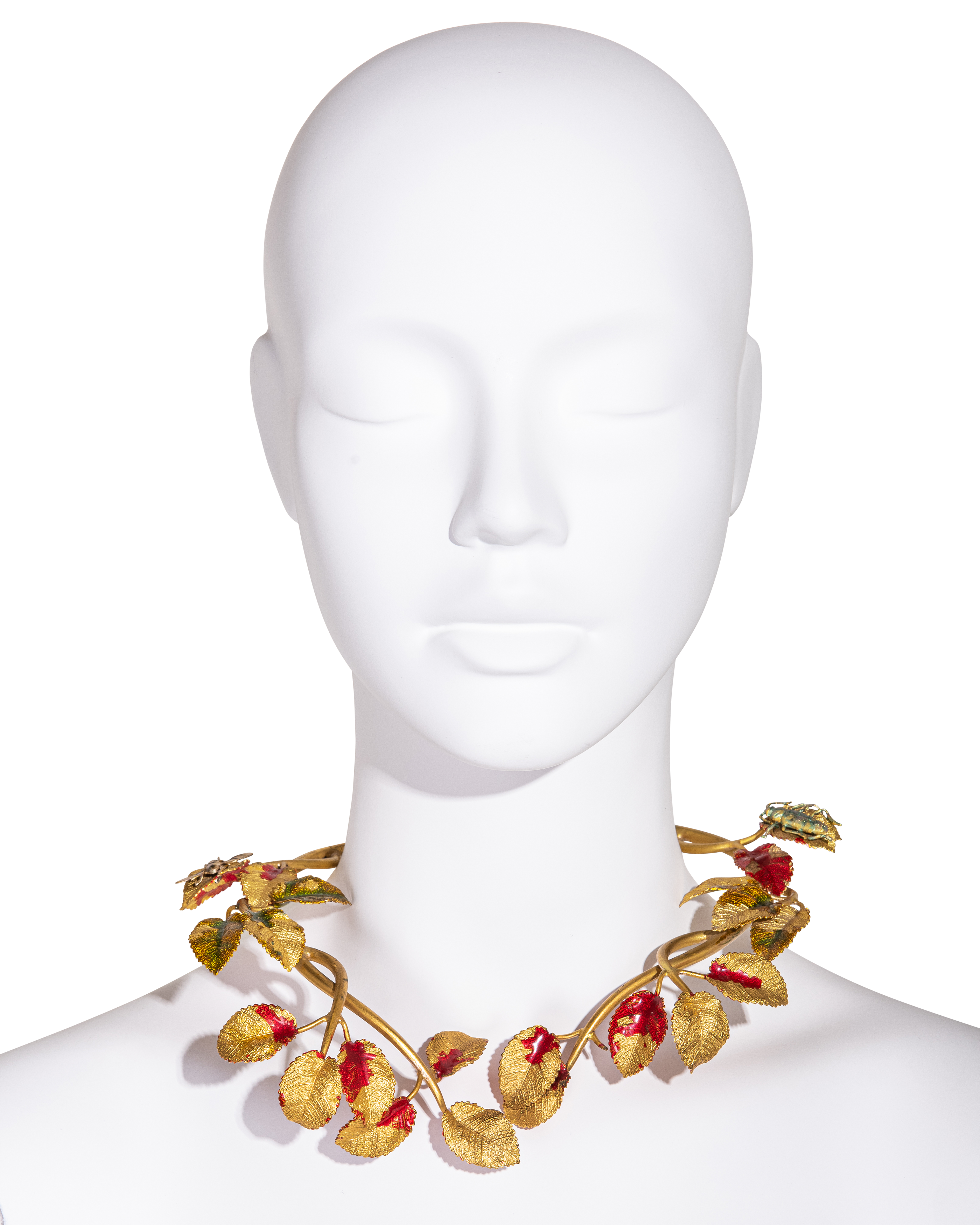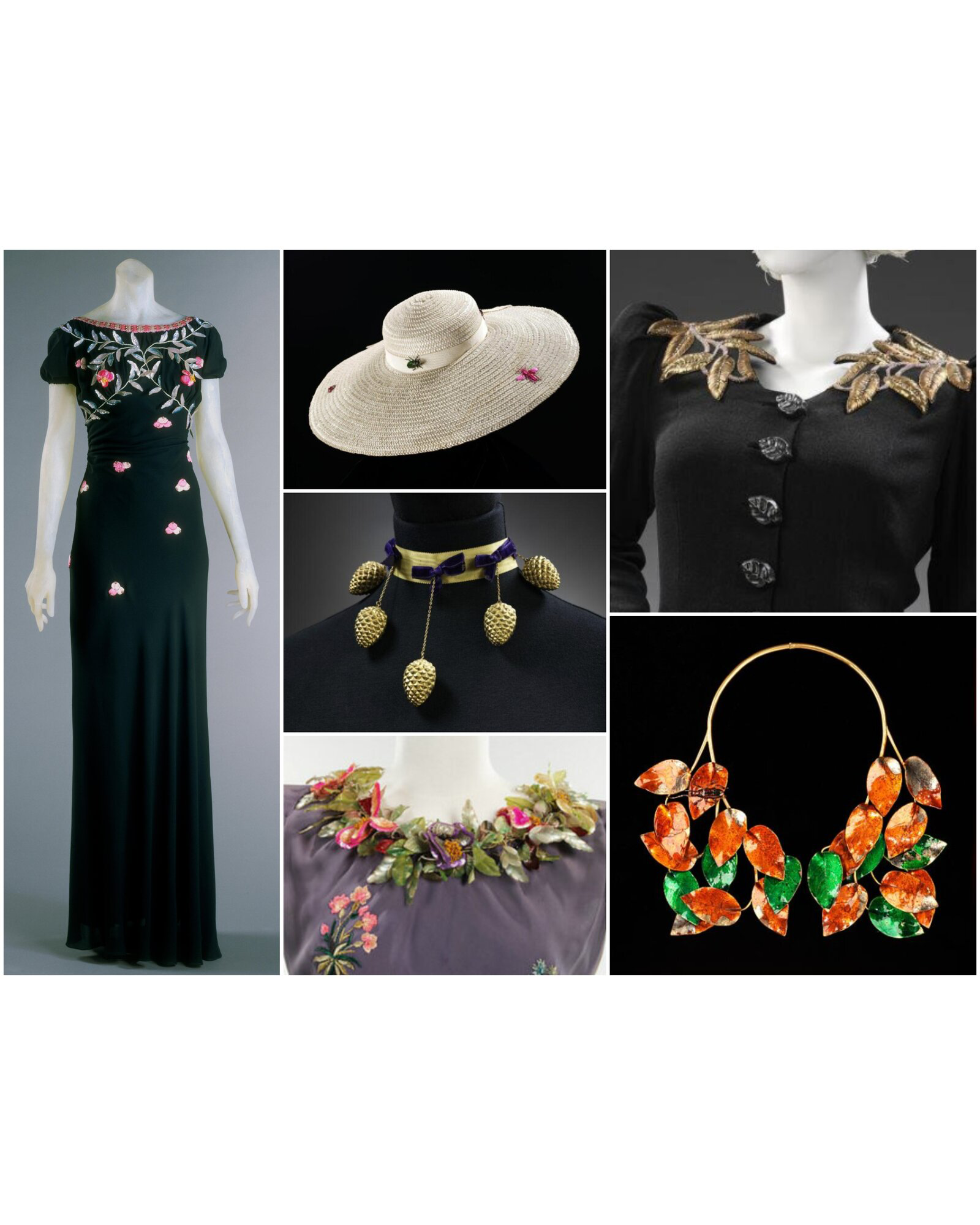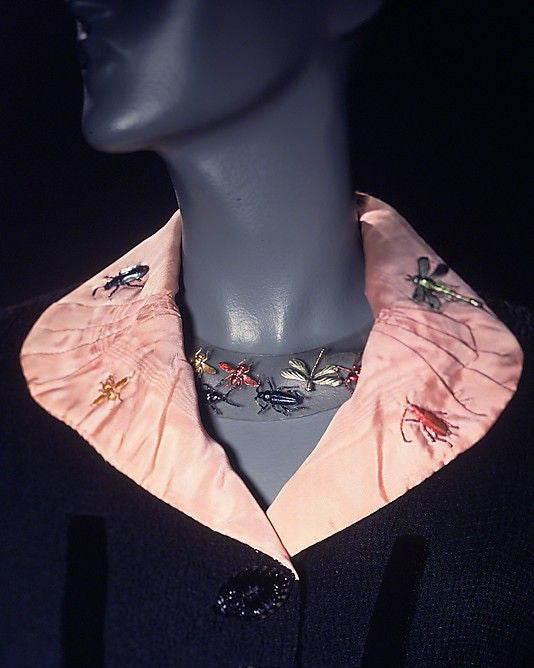 Of their own necklace from the same collection, the Met Museum describes: "Schiaparelli's fall 1938 collection was rife with references to flora and fauna, inspired by the Renaissance painter Sandro Botticelli's lush depictions of spring, specifically in 'The Birth of Venus' and 'Primavera'...Coined the 'pagan' collection, motifs such as insects, leaves and flowers were in abundance as embroidery, buttons and jewelry, such as this beautifully crafted one-of-a-kind necklace. Artistically rendered in enameled gilt metal...the insect is a subtle masterful Schiaparelli touch that would likely only be noticed on second glance, giving a surreal tone to this otherwise glistening and naturalistic ornamental piece."