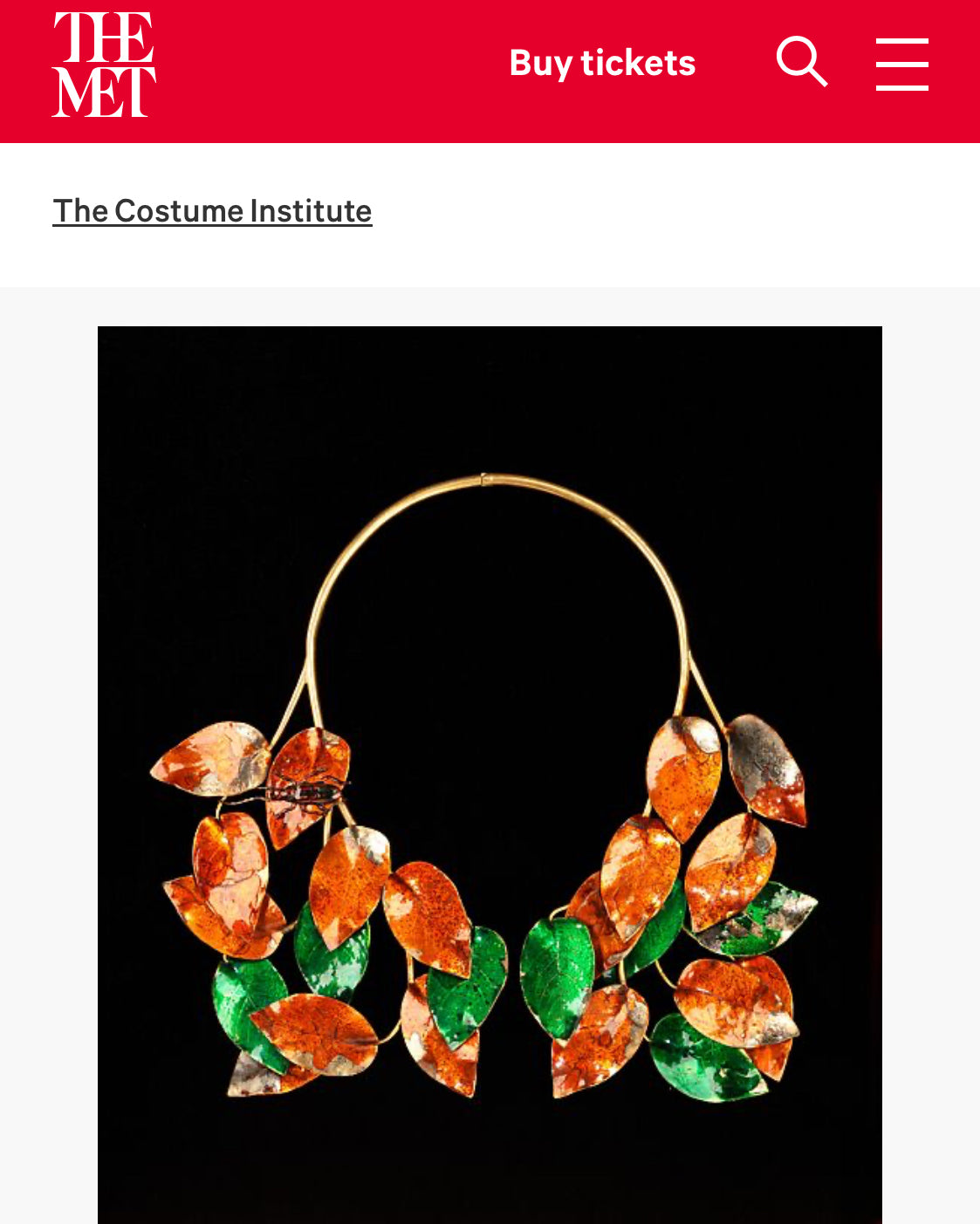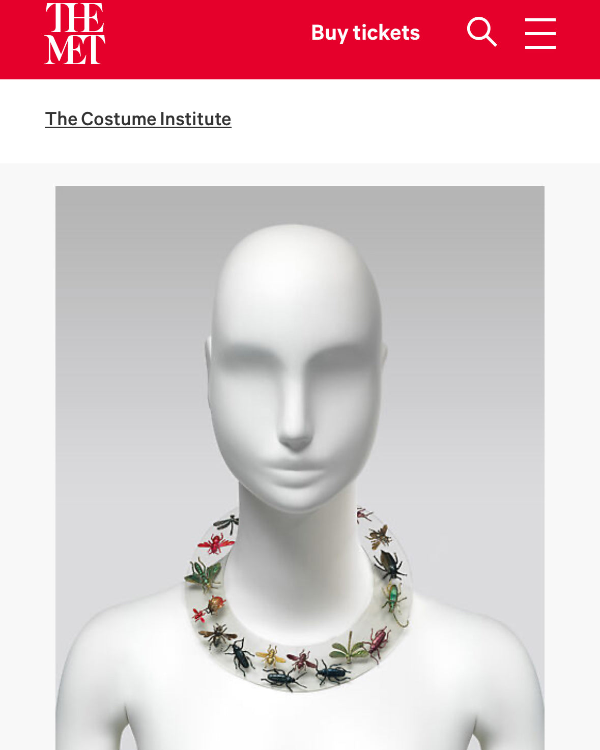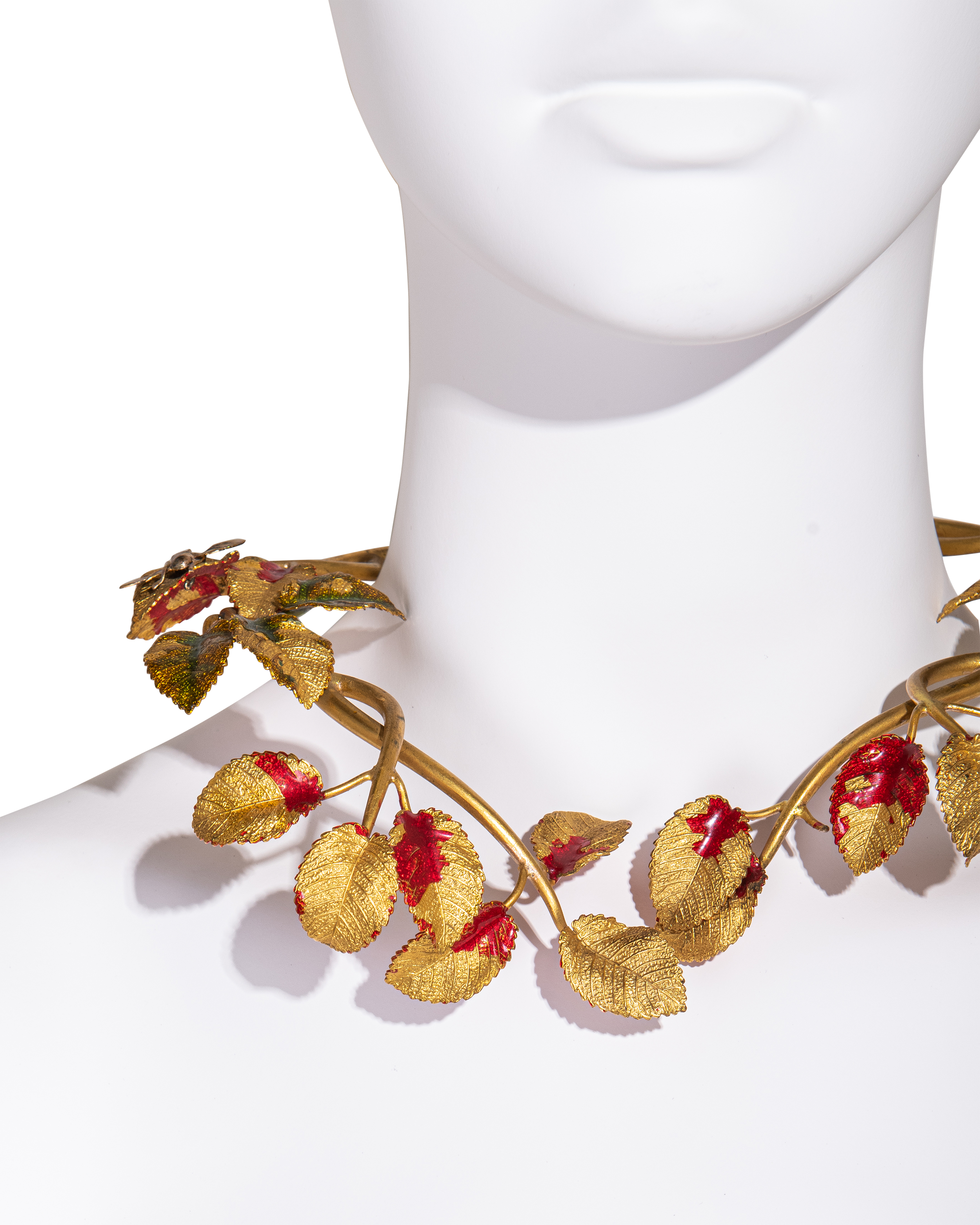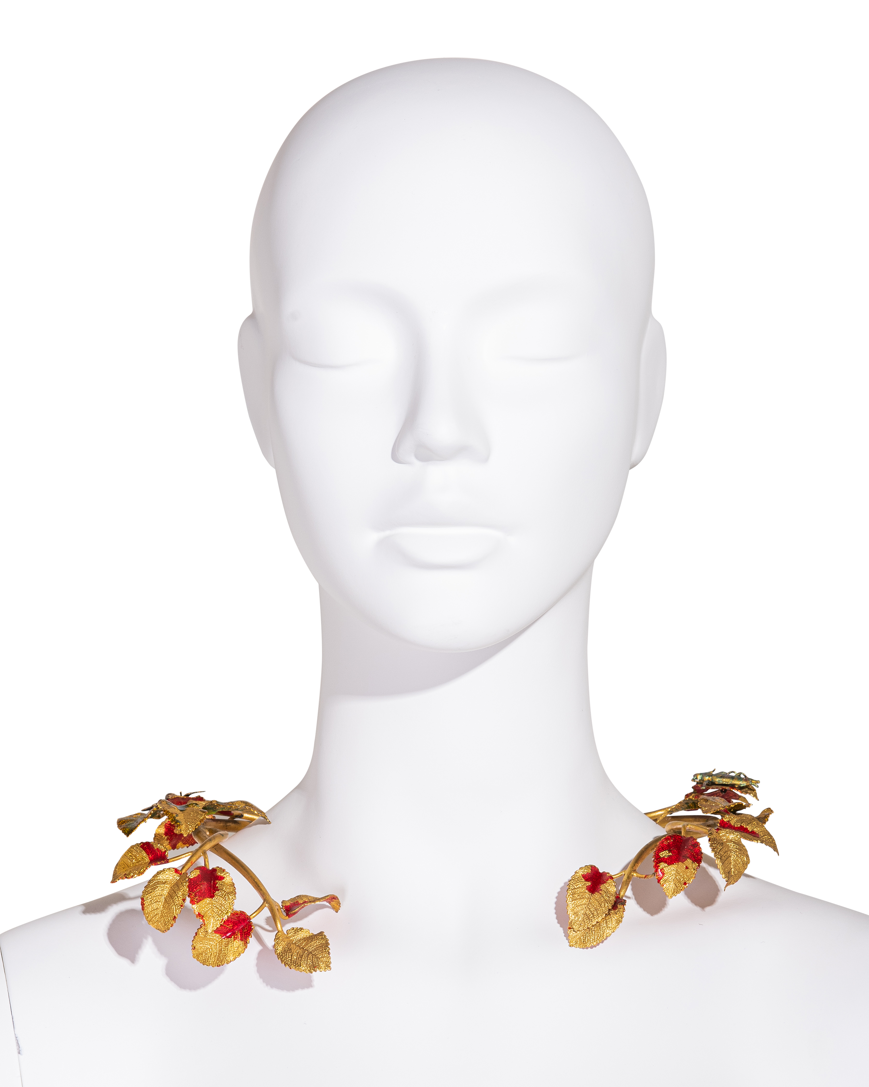 Of their own necklace from the same collection, the Met Museum describes: "Schiaparelli's fall 1938 collection was rife with references to flora and fauna, inspired by the Renaissance painter Sandro Botticelli's lush depictions of spring, specifically in 'The Birth of Venus' and 'Primavera'...Coined the 'pagan' collection, motifs such as insects, leaves and flowers were in abundance as embroidery, buttons and jewelry, such as this beautifully crafted one-of-a-kind necklace. Artistically rendered in enameled gilt metal...the insect is a subtle masterful Schiaparelli touch that would likely only be noticed on second glance, giving a surreal tone to this otherwise glistening and naturalistic ornamental piece."