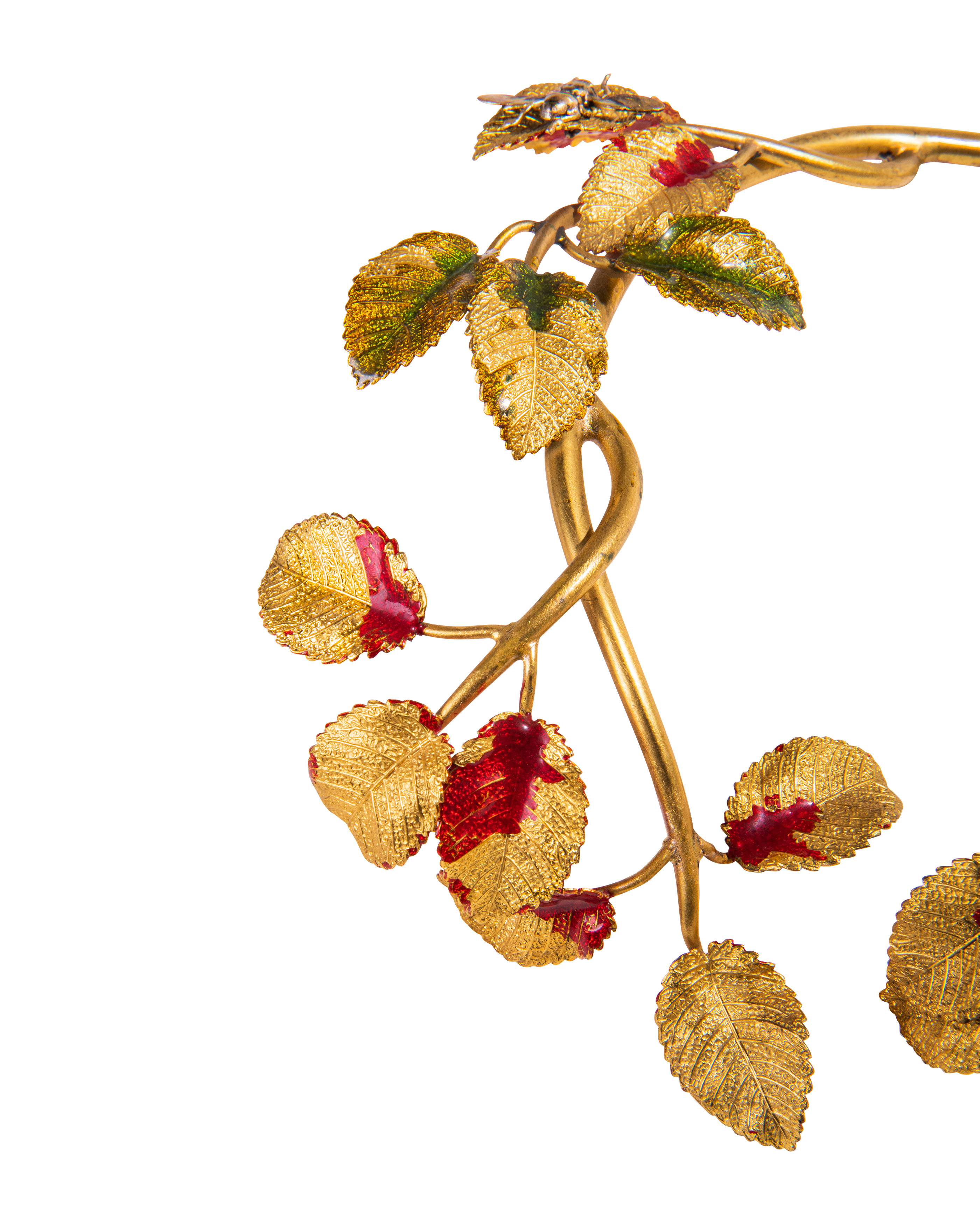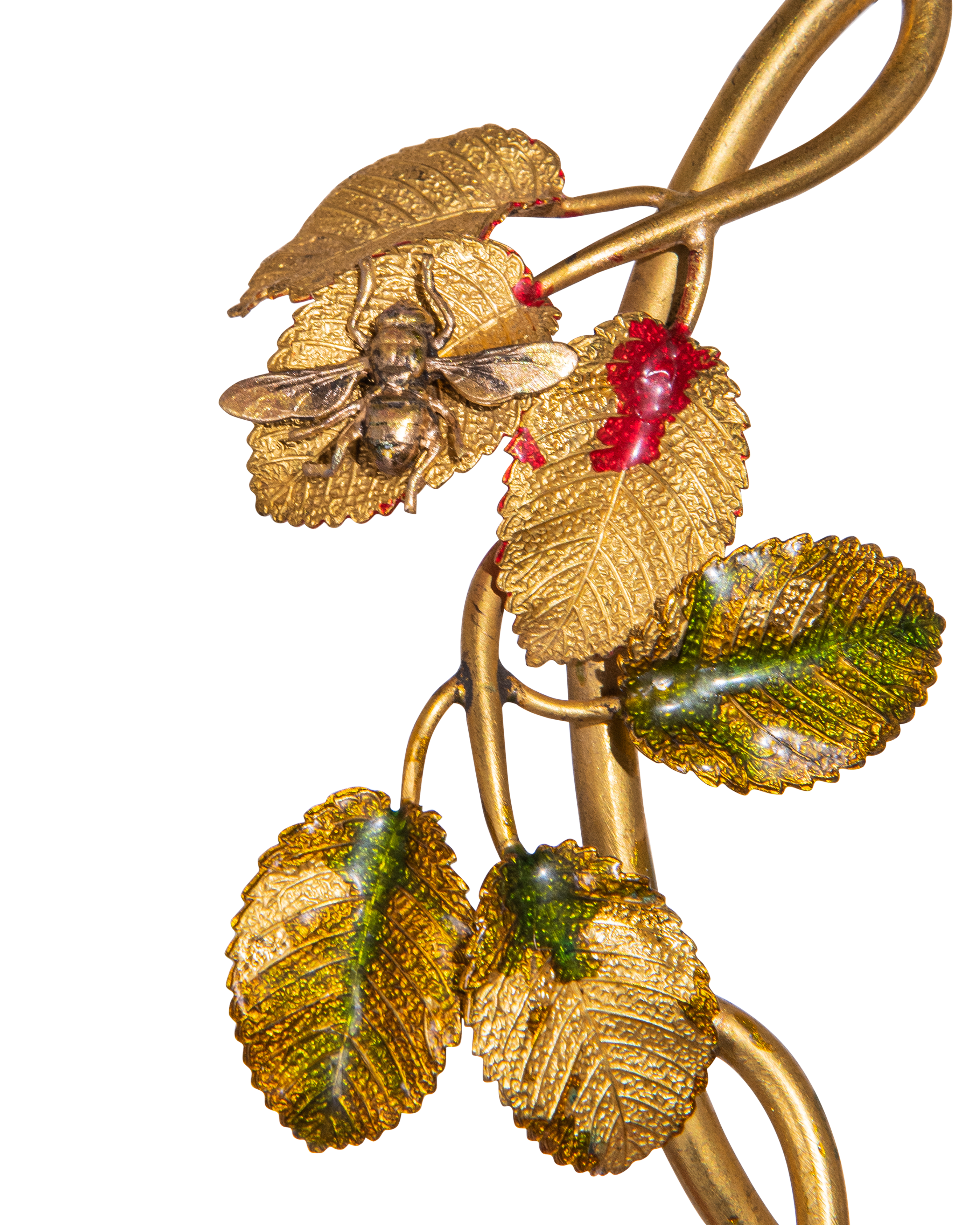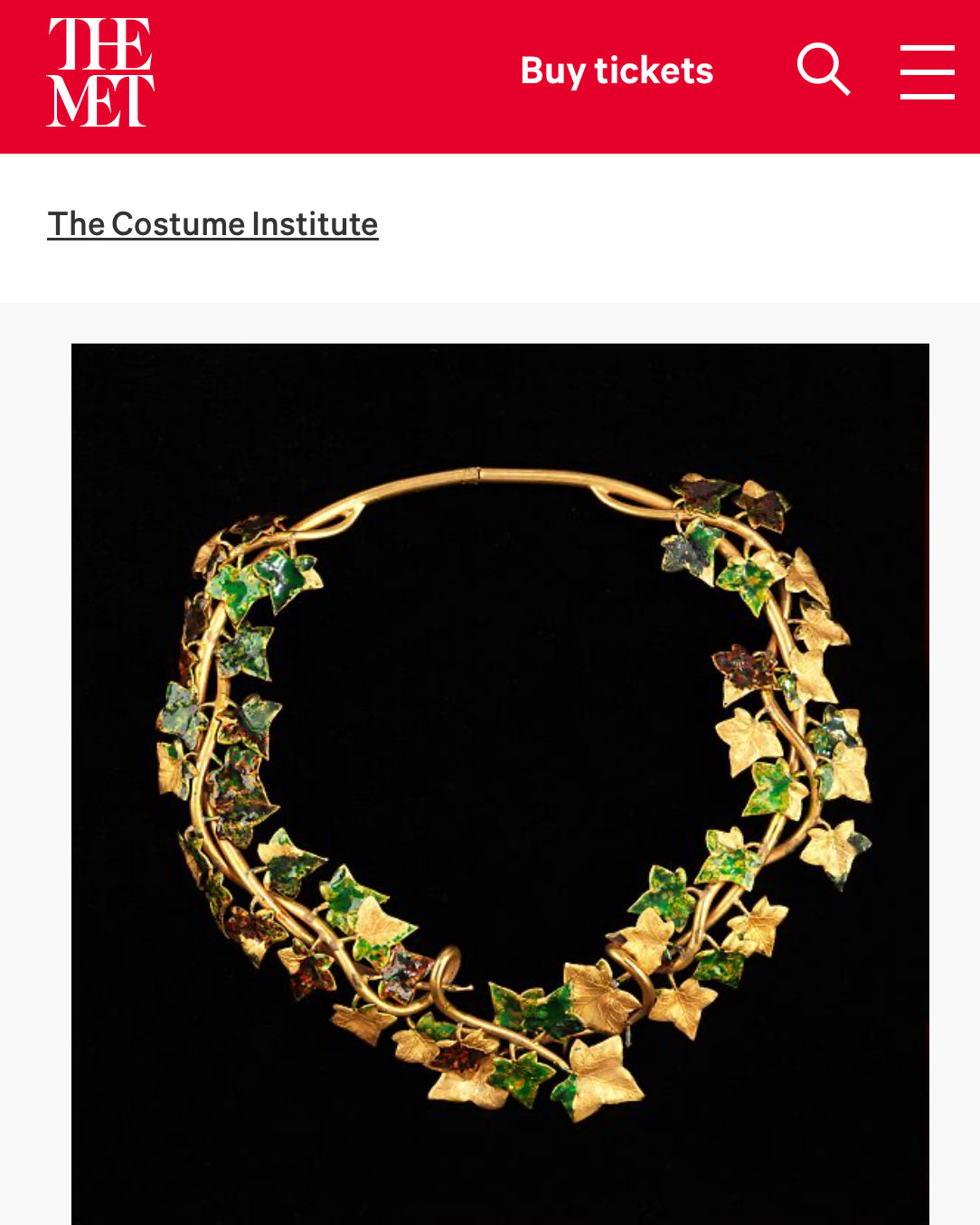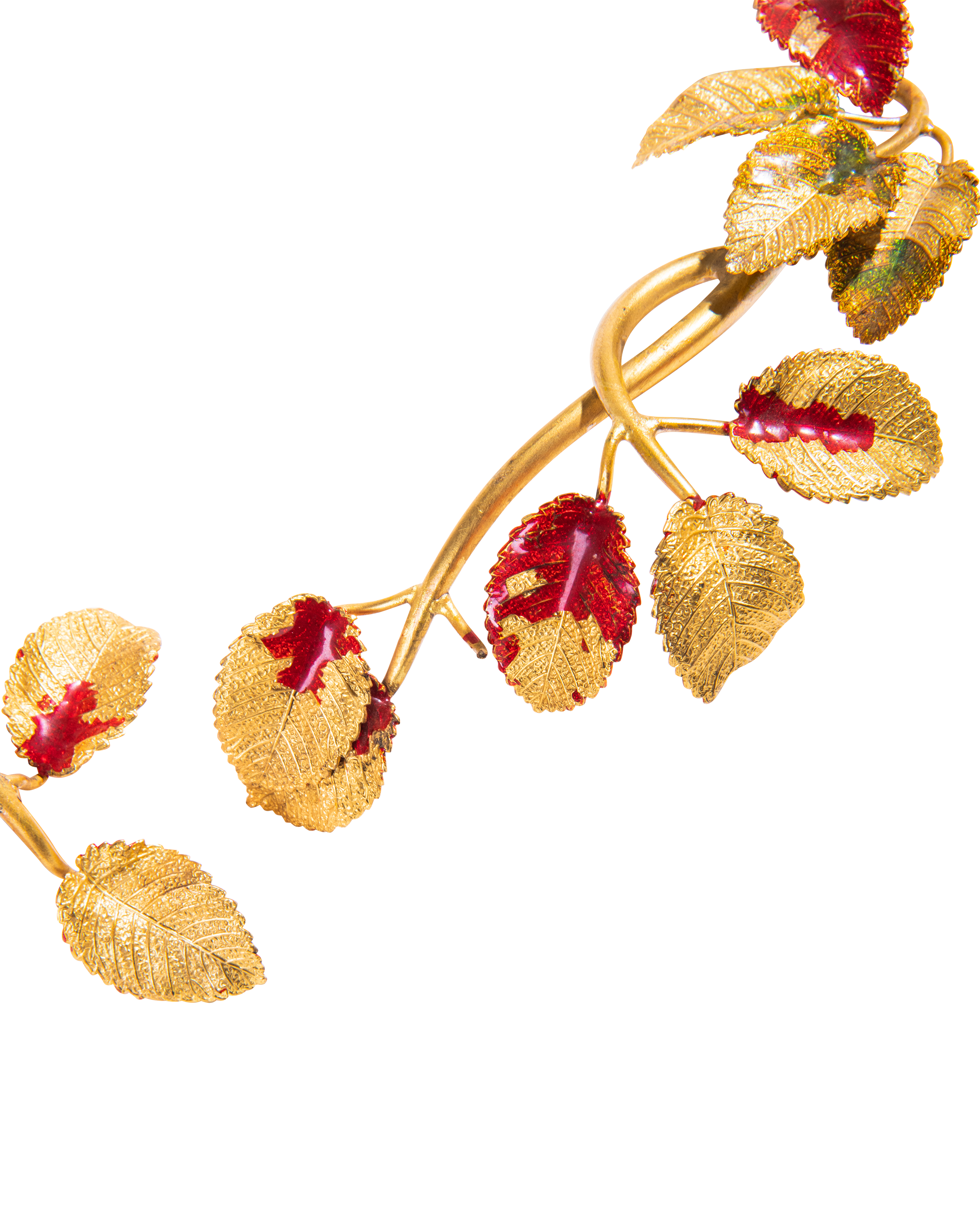 Of their own necklace from the same collection, the Met Museum describes: "Schiaparelli's fall 1938 collection was rife with references to flora and fauna, inspired by the Renaissance painter Sandro Botticelli's lush depictions of spring, specifically in 'The Birth of Venus' and 'Primavera'...Coined the 'pagan' collection, motifs such as insects, leaves and flowers were in abundance as embroidery, buttons and jewelry, such as this beautifully crafted one-of-a-kind necklace. Artistically rendered in enameled gilt metal...the insect is a subtle masterful Schiaparelli touch that would likely only be noticed on second glance, giving a surreal tone to this otherwise glistening and naturalistic ornamental piece."