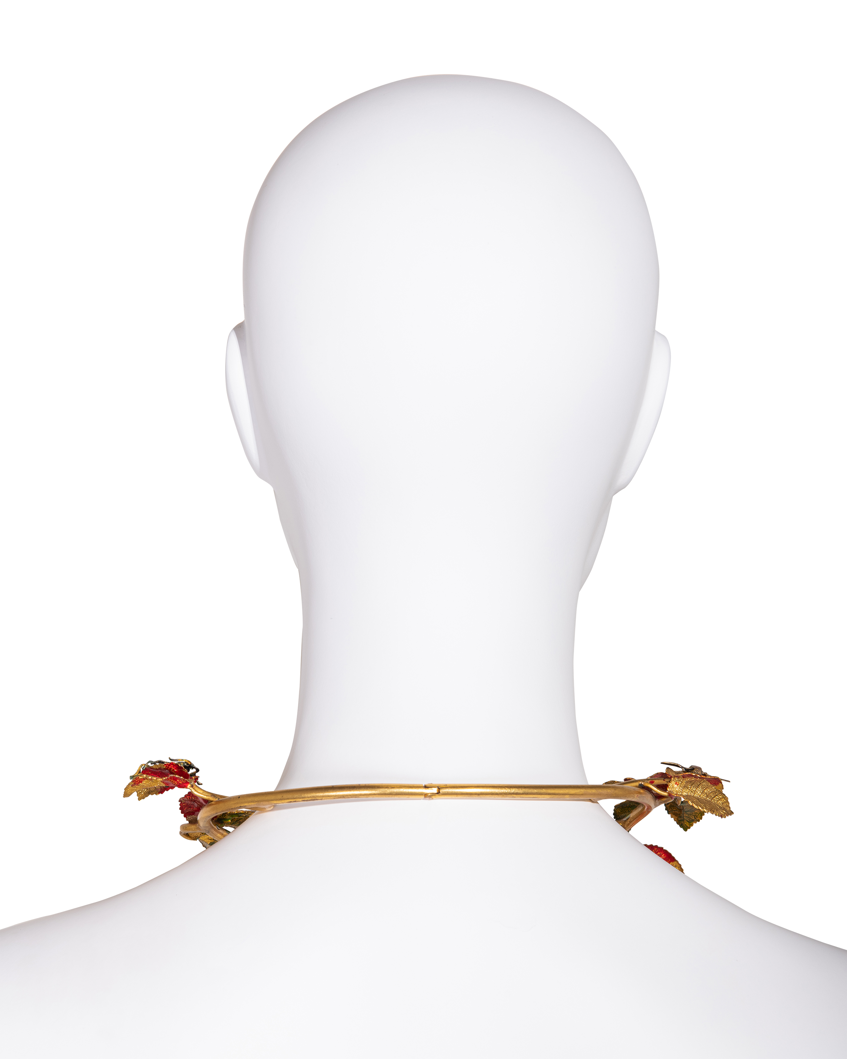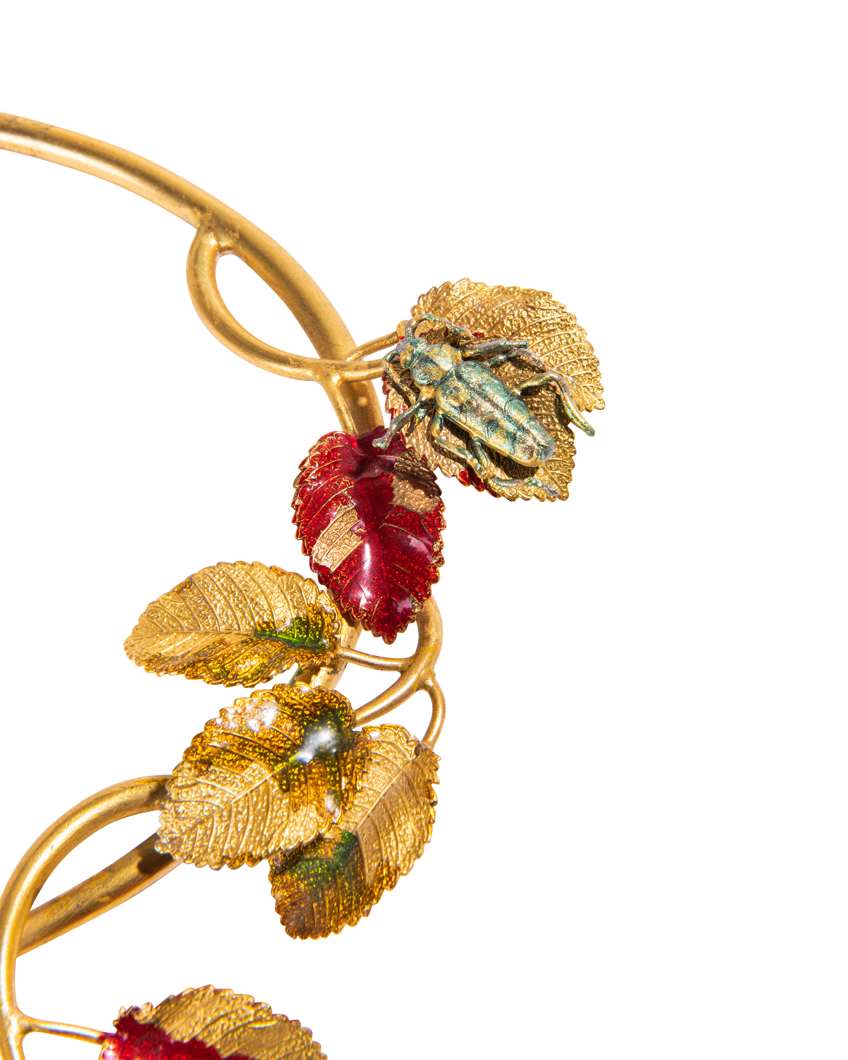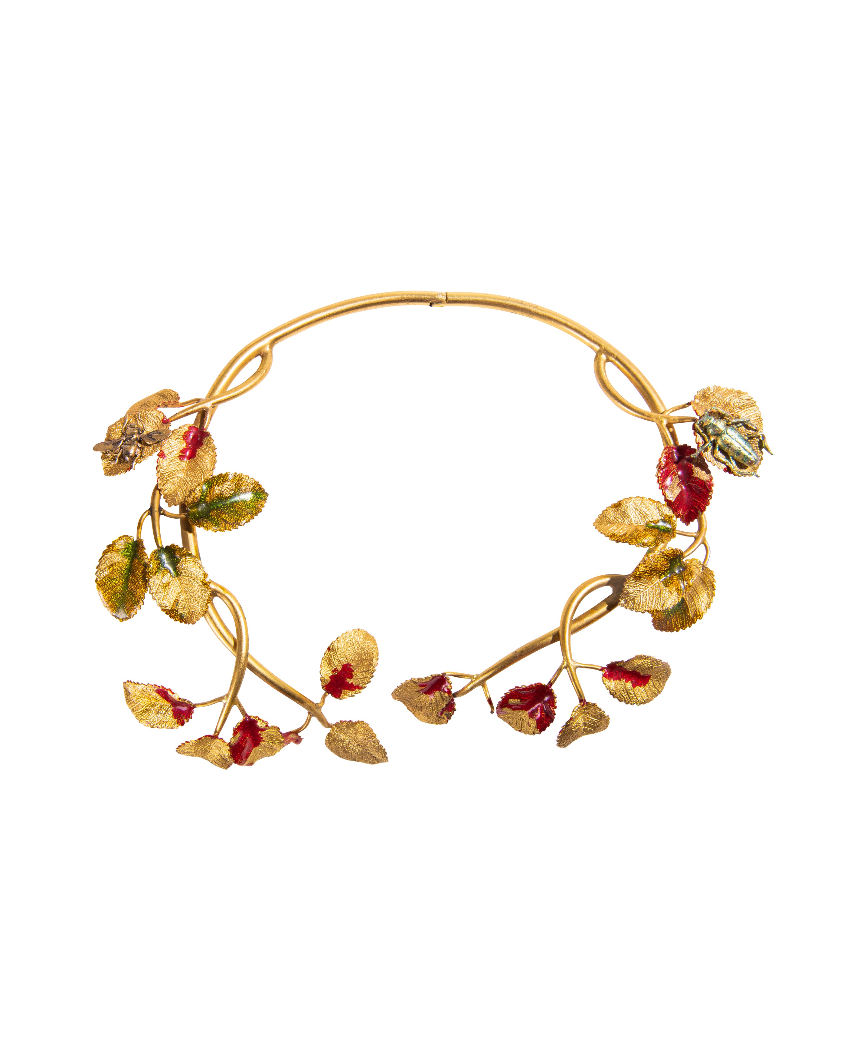 A/W 1938 Elsa Schiaparelli Haute Couture gold insect choker necklace from the 'Pagan Collection.' Very similar featured in the Met Museum. Gilded gold-tone enameled gilt metal with enamel branches and leaves, featuring sleeping insect details. Inspired by Botticelli's masterpieces and a signature interest in the surreal, this necklace is a rare piece of Elsa Schiaparelli's masterful work.