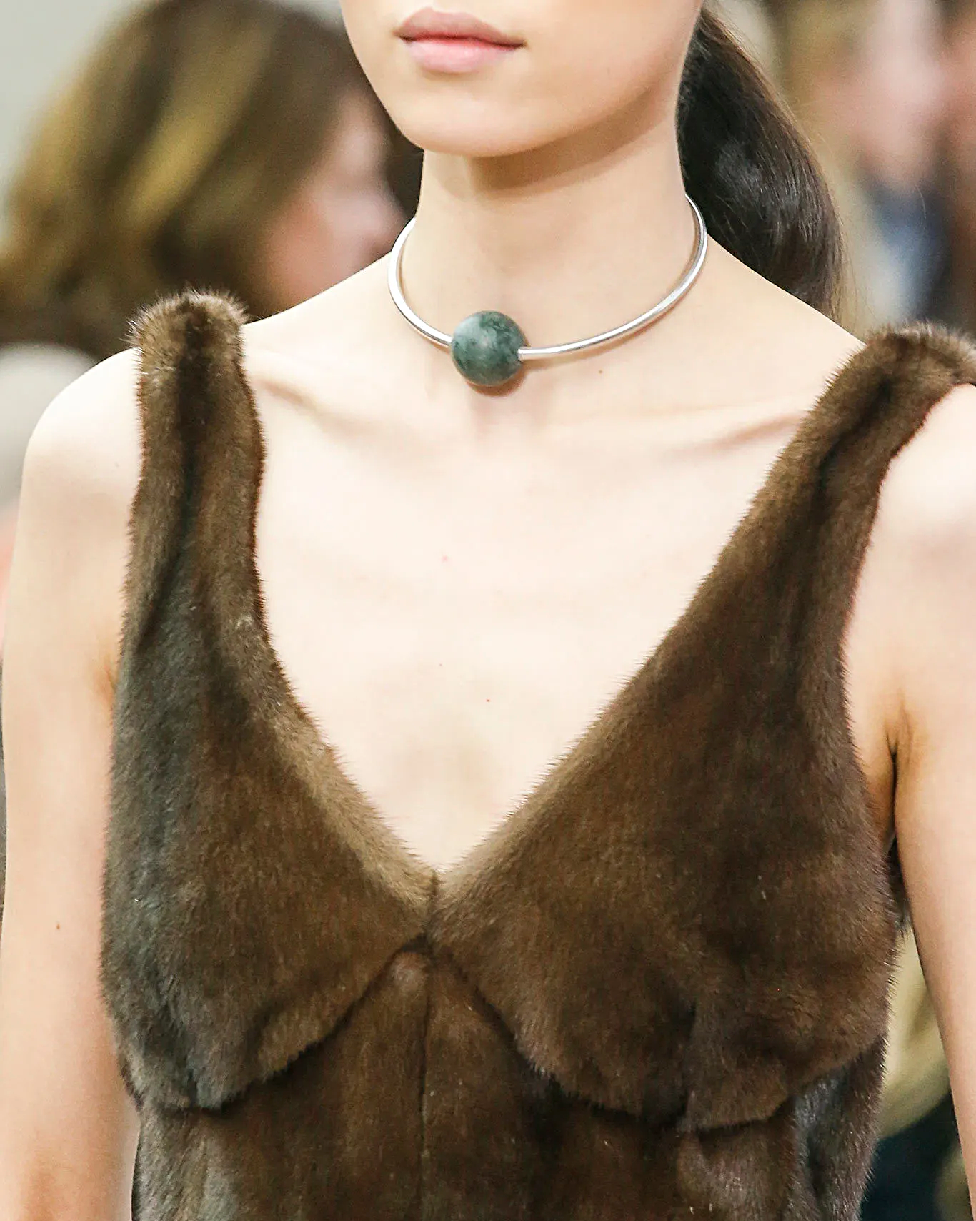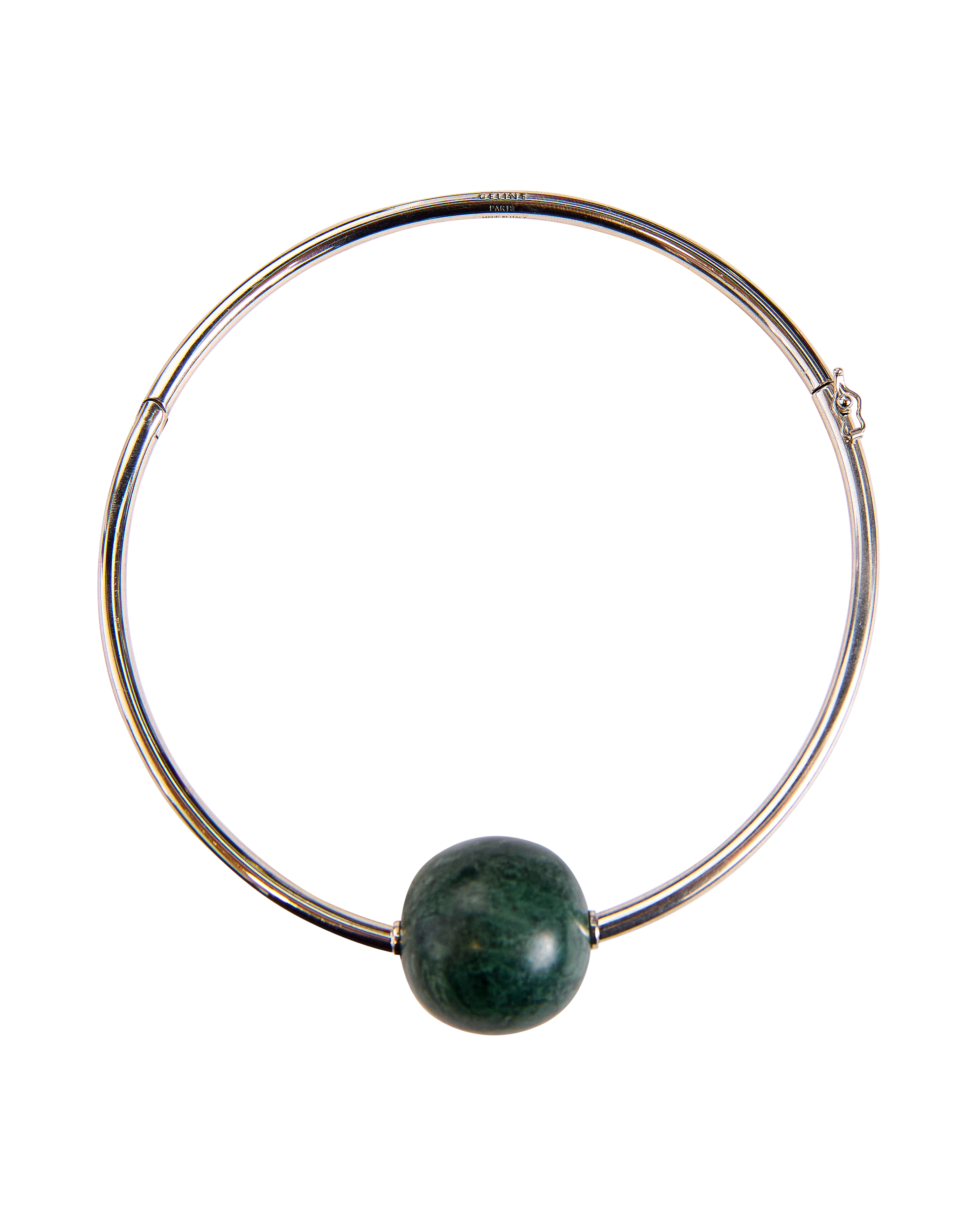 A/W 2013 Céline by Phoebe Philo (Old Céline) silver collar choker with marble bottle green ball. Silver-tone futuristic curved choker necklace with side clasp and hinge, featuring green marble ball at center of neck. As seen prominently on the runway (exact as seen in Look #14, Look #18, and Look #20); featured on Daria Werbowy in the ad campaign in gold colorway and in bracelet variation. In very good vintage condition with light wear throughout.