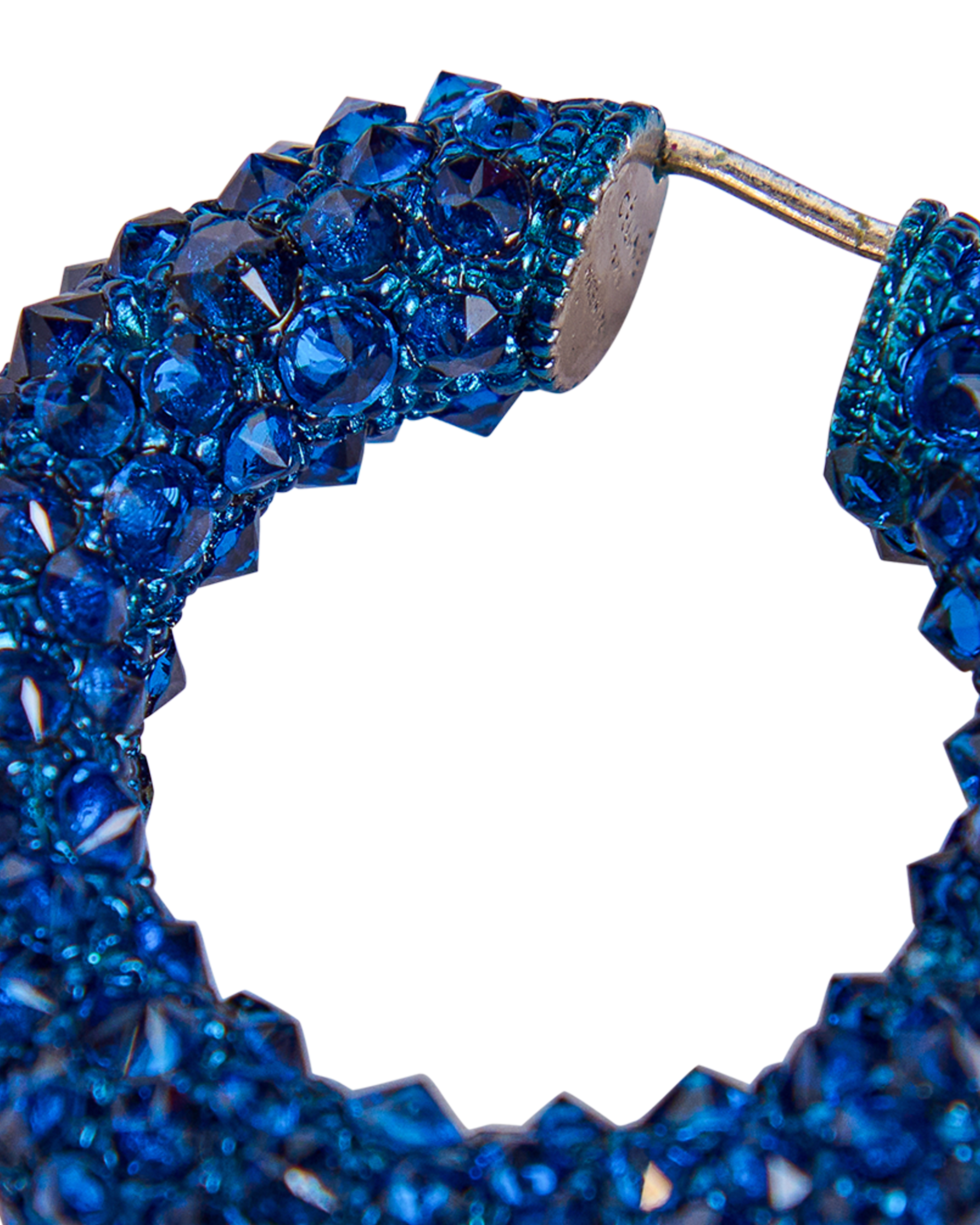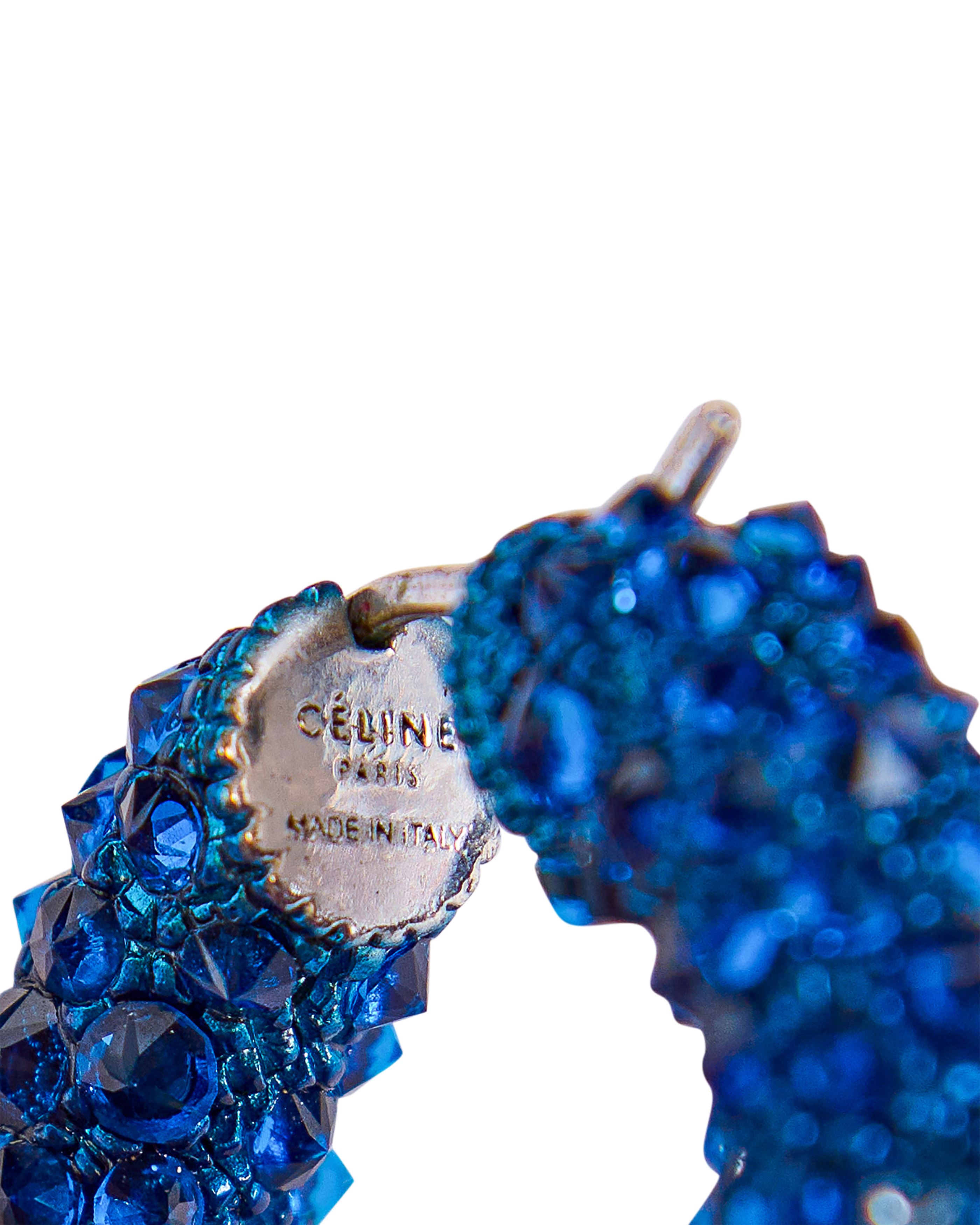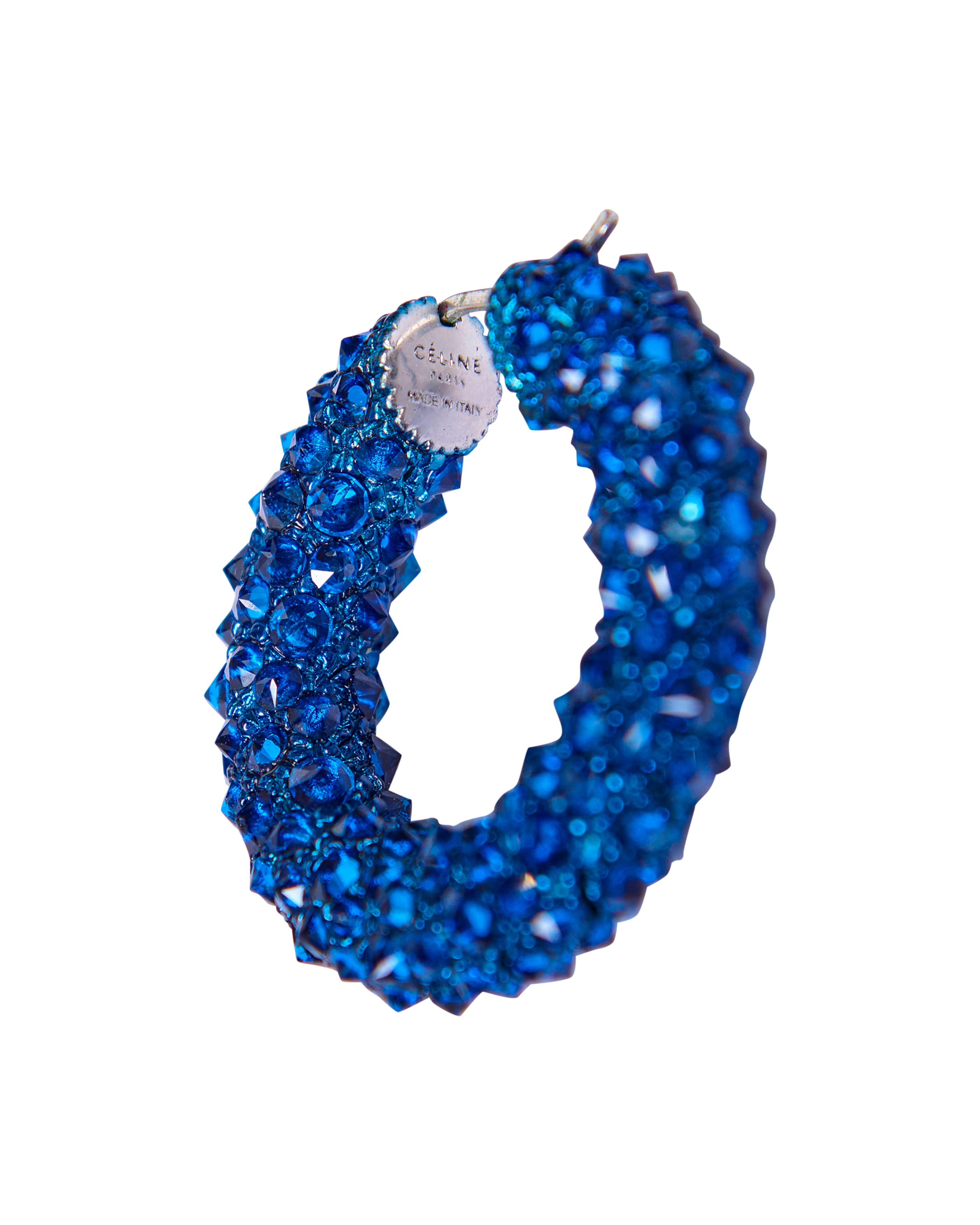 A/W 2018 Céline by Phoebe Philo (Old Céline) blue crystal hoop earrings. Sliver-tone and vibrant blue crystal earrings. Similar featured in the lookbook. In very good vintage condition with very light wear throughout (unnoticeable when worn).