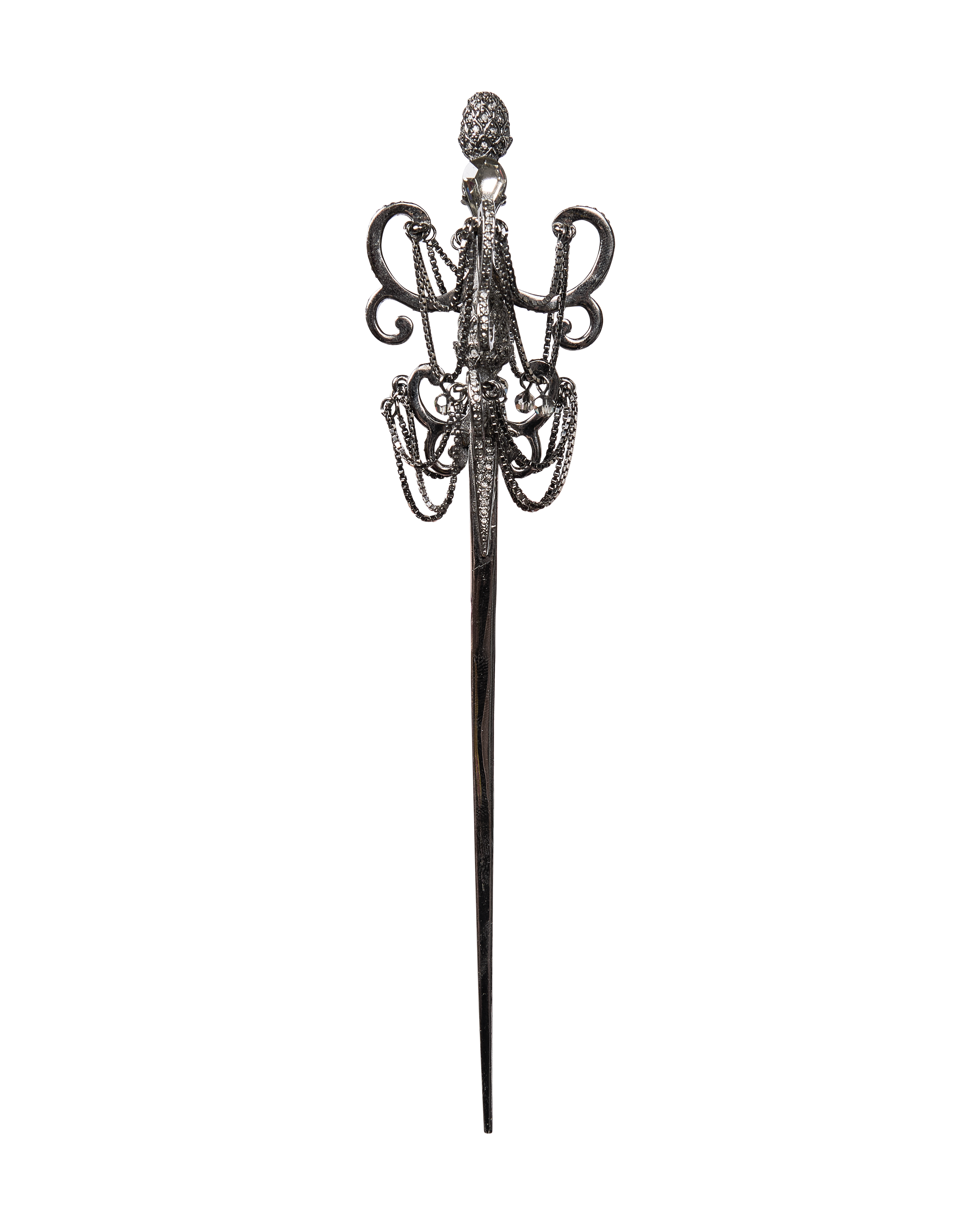 c. 1996 - 1997 Christian Dior by John Galliano gunmetal silver acorn motif hairpin. Long gunmetal silver hairpin with rhinestone acorn motif at top and center, featuring filigree curved detailing and rhinestone embellishments throughout. Silver chain with small beads add uniqueness to the piece. In very good vintage condition with light wear throughout. Note that hairpiece is not stamped, but originally was paired with stamped Dior choker and can be attributed to Dior.