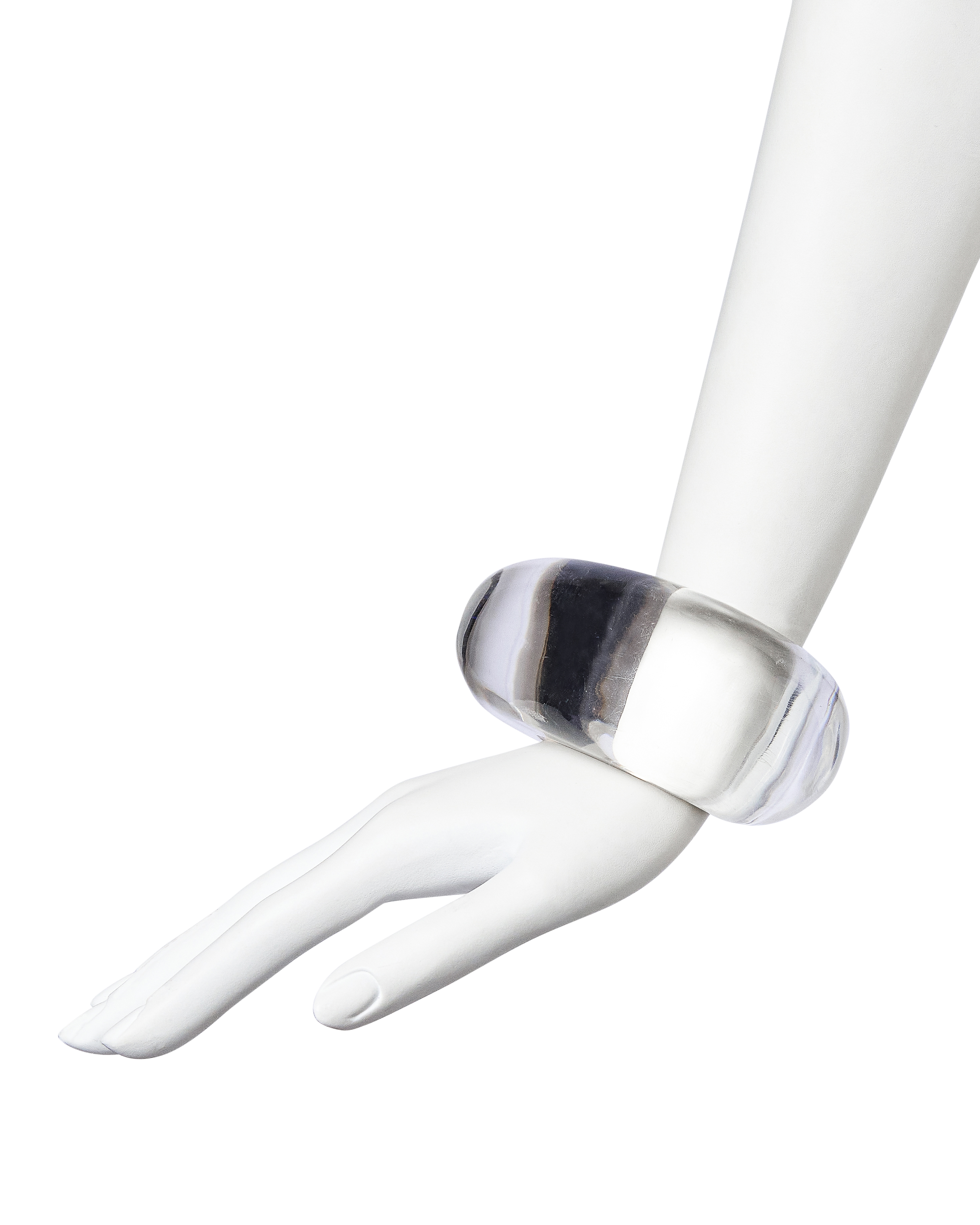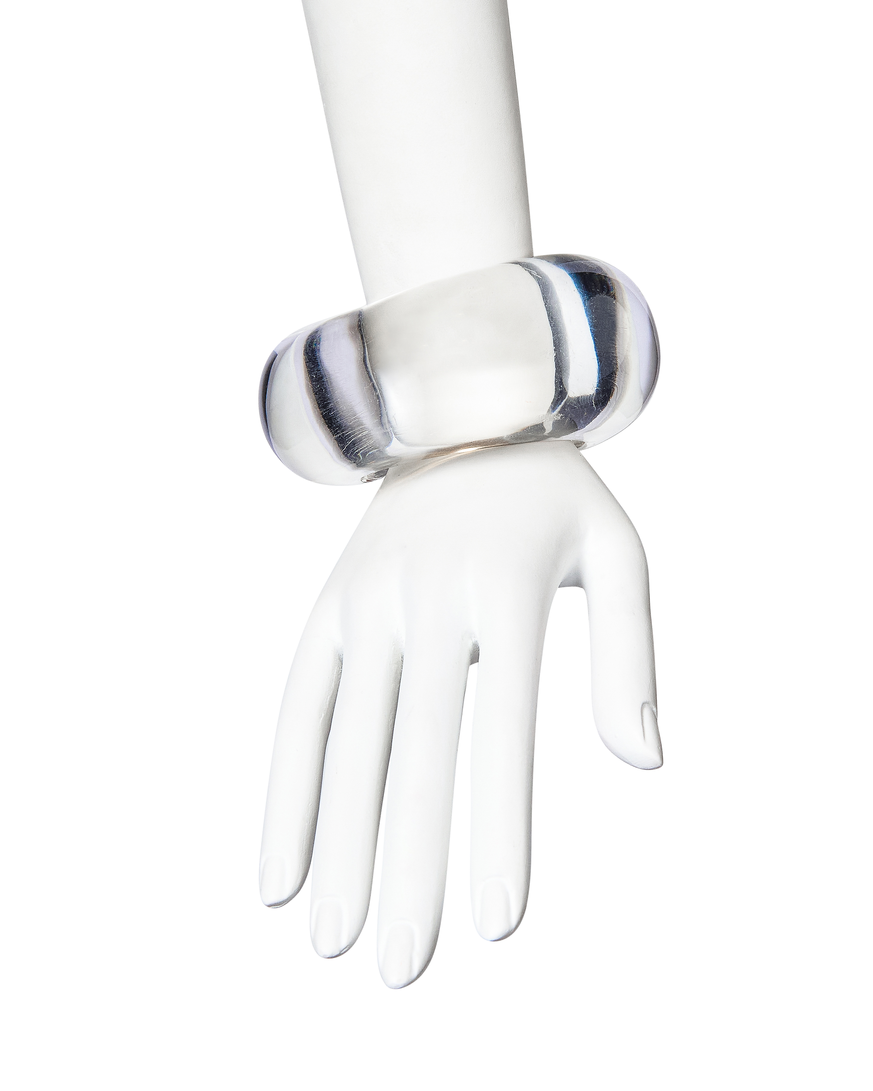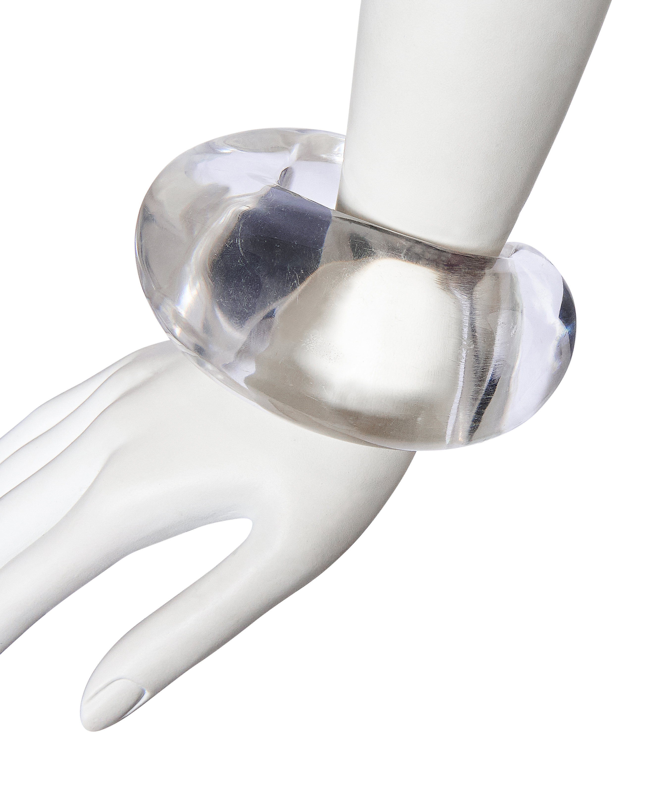 1978 Patricia Von Musulin (Unsigned) Large Curved Lucite Bracelet. Oversized / jumbo clear white lucite bracelet with curved design. As seen in the Met Museum. Similar pieces also seen on the legendary Iman, Linda Evangelista, and many major magazine editorials, including W Magazine, Paper Magazine, and Harper's Bazaar. In very good vintage condition with very light wear throughout (unnoticeable when worn).