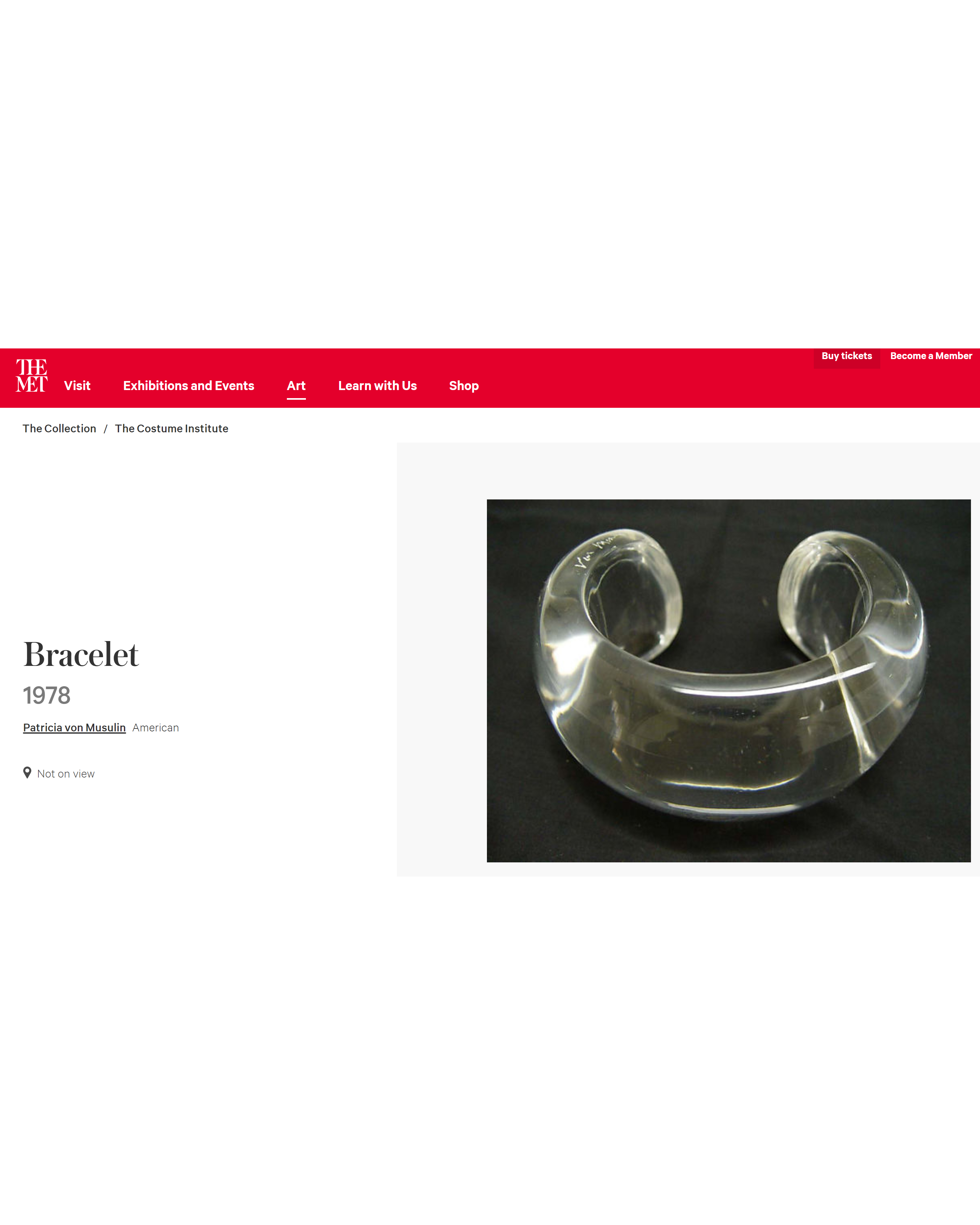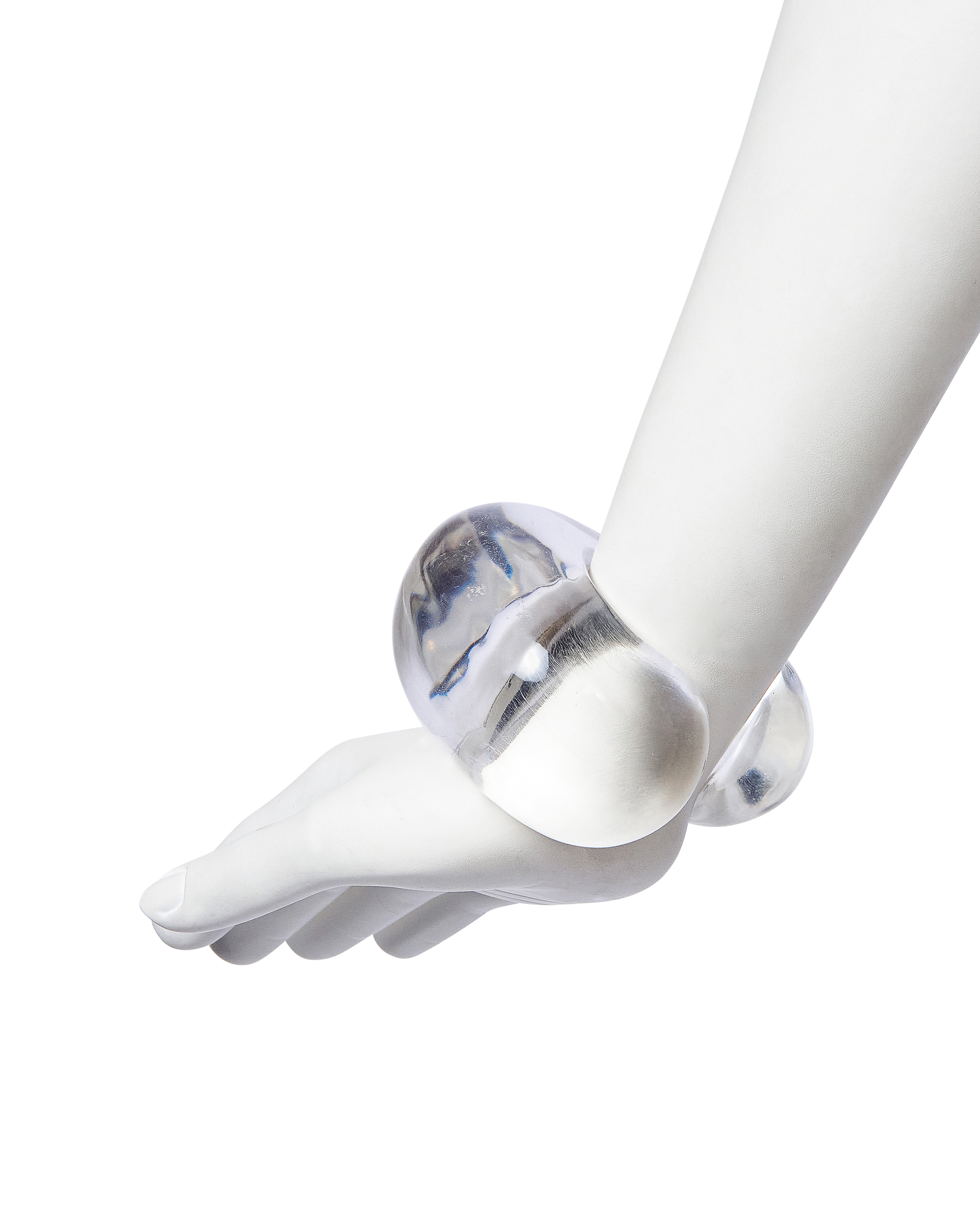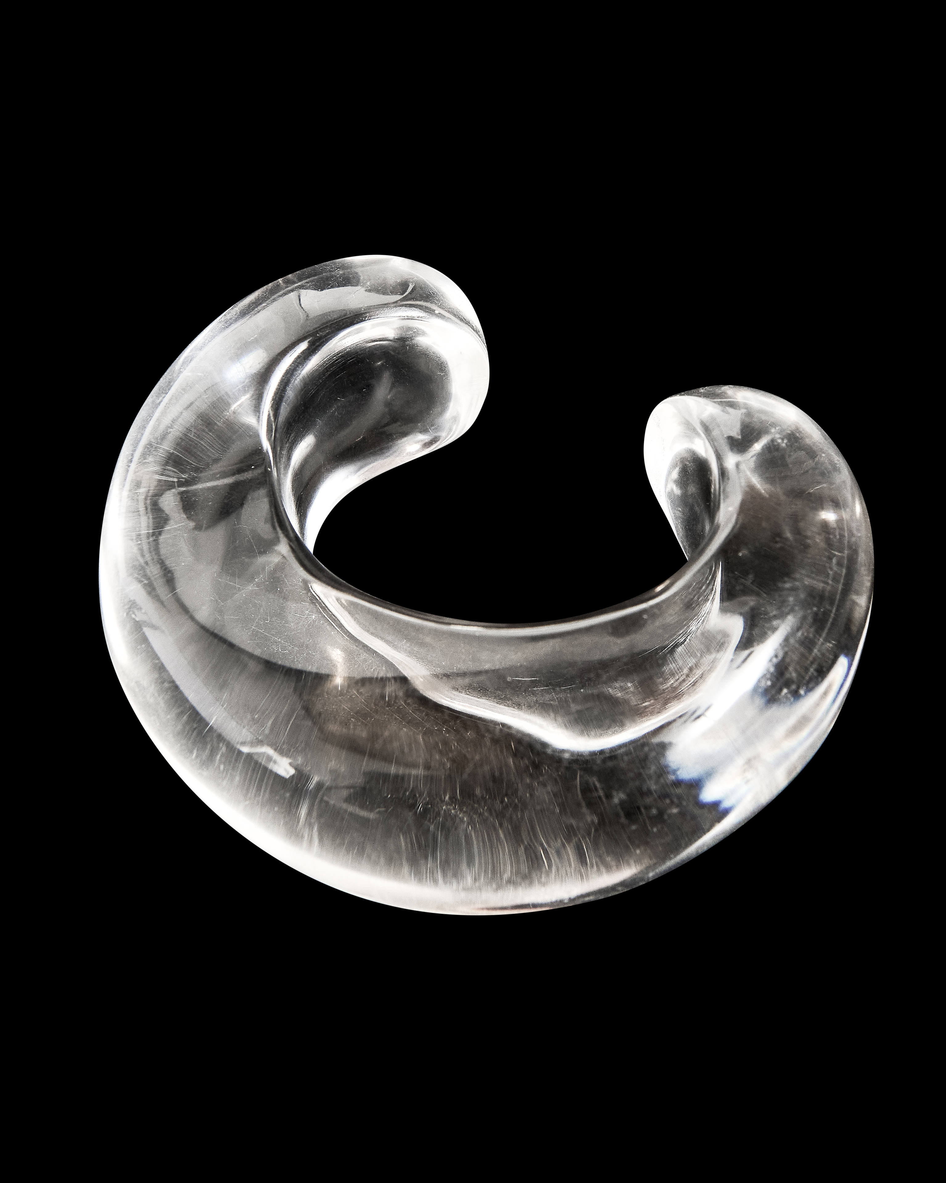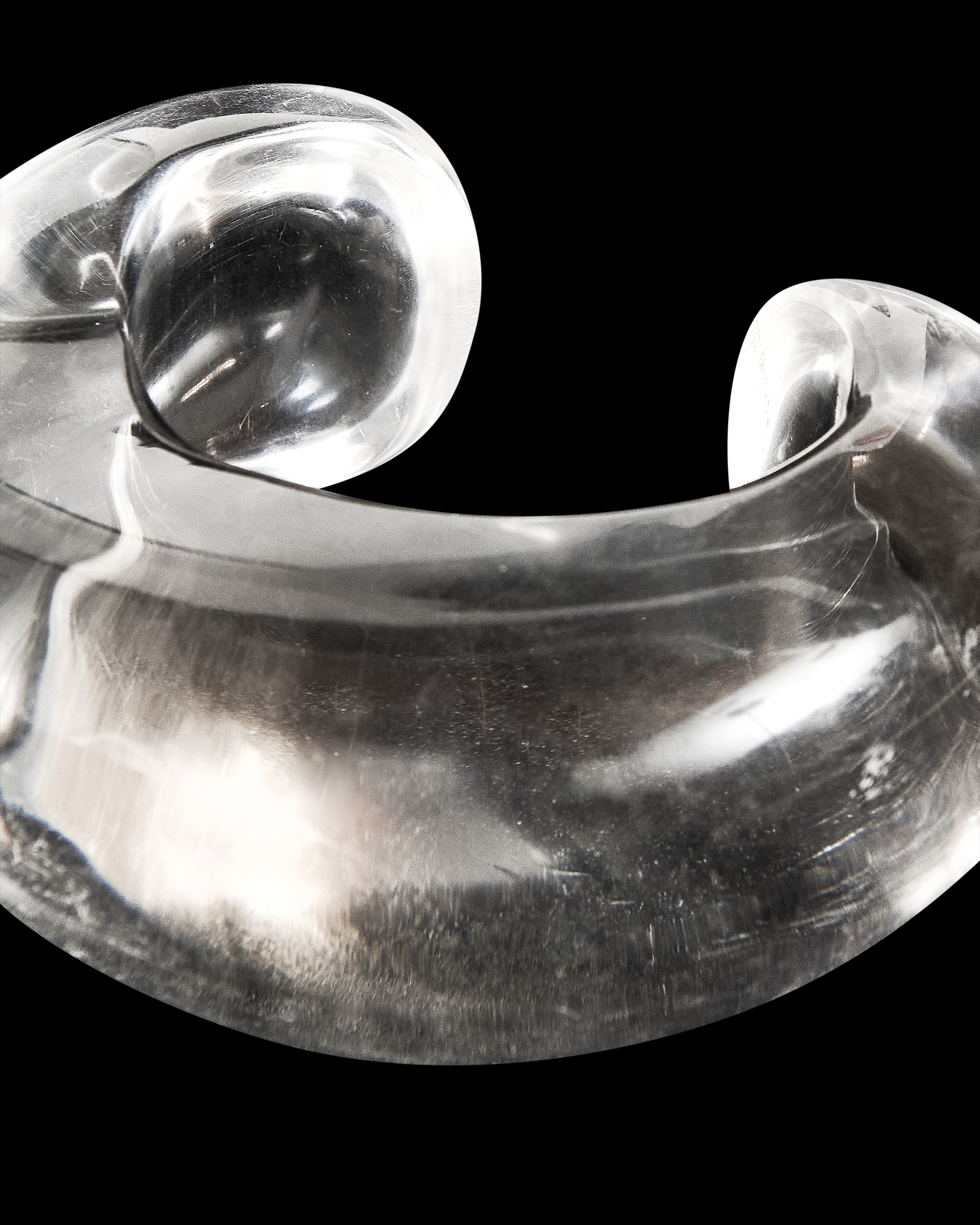 1978 Patricia Von Musulin (Unsigned) Large Curved Lucite Bracelet. Oversized / jumbo clear white lucite bracelet with curved design. As seen in the Met Museum. Similar pieces also seen on the legendary Iman, Linda Evangelista, and many major magazine editorials, including W Magazine, Paper Magazine, and Harper's Bazaar. In very good vintage condition with very light wear throughout (unnoticeable when worn).