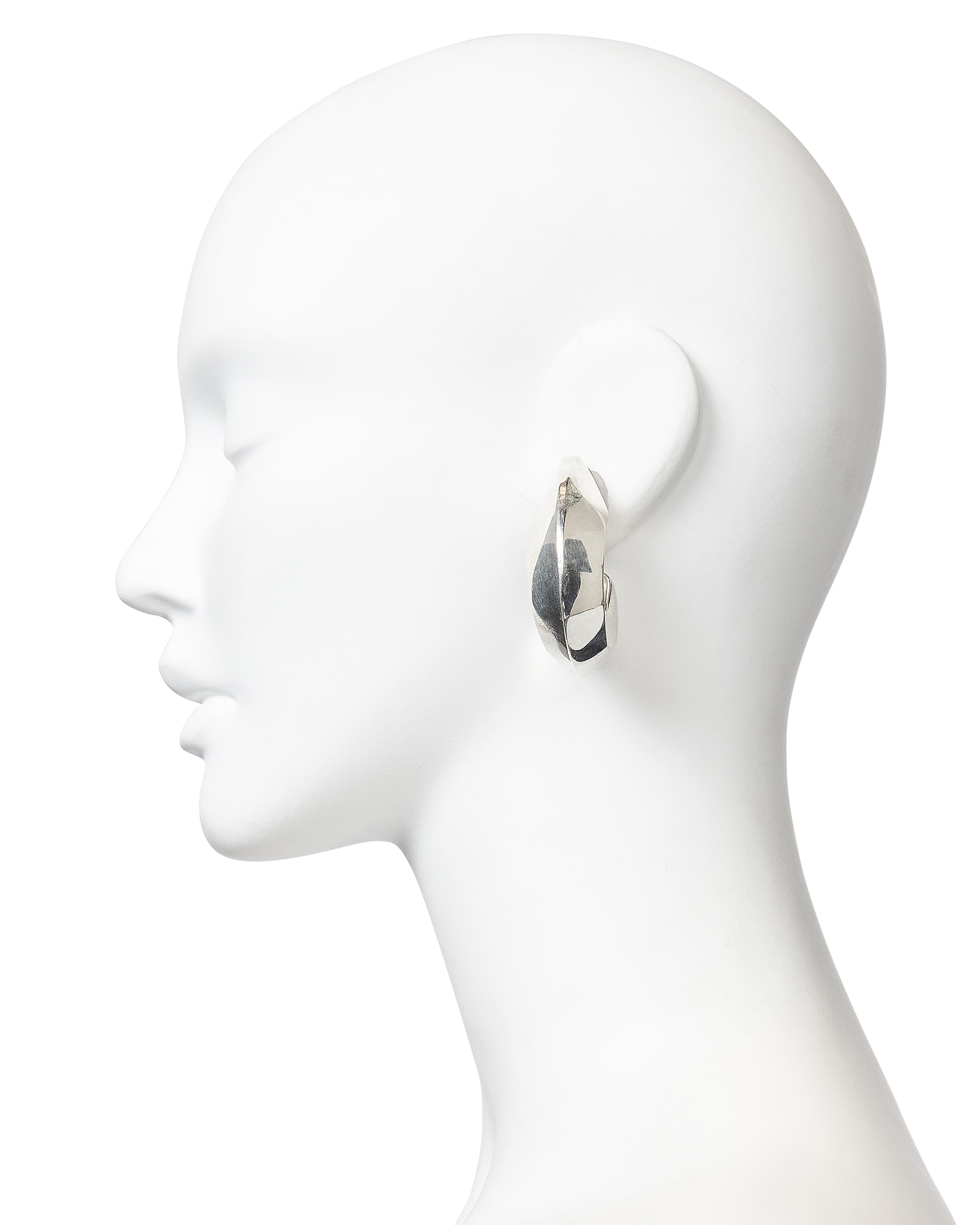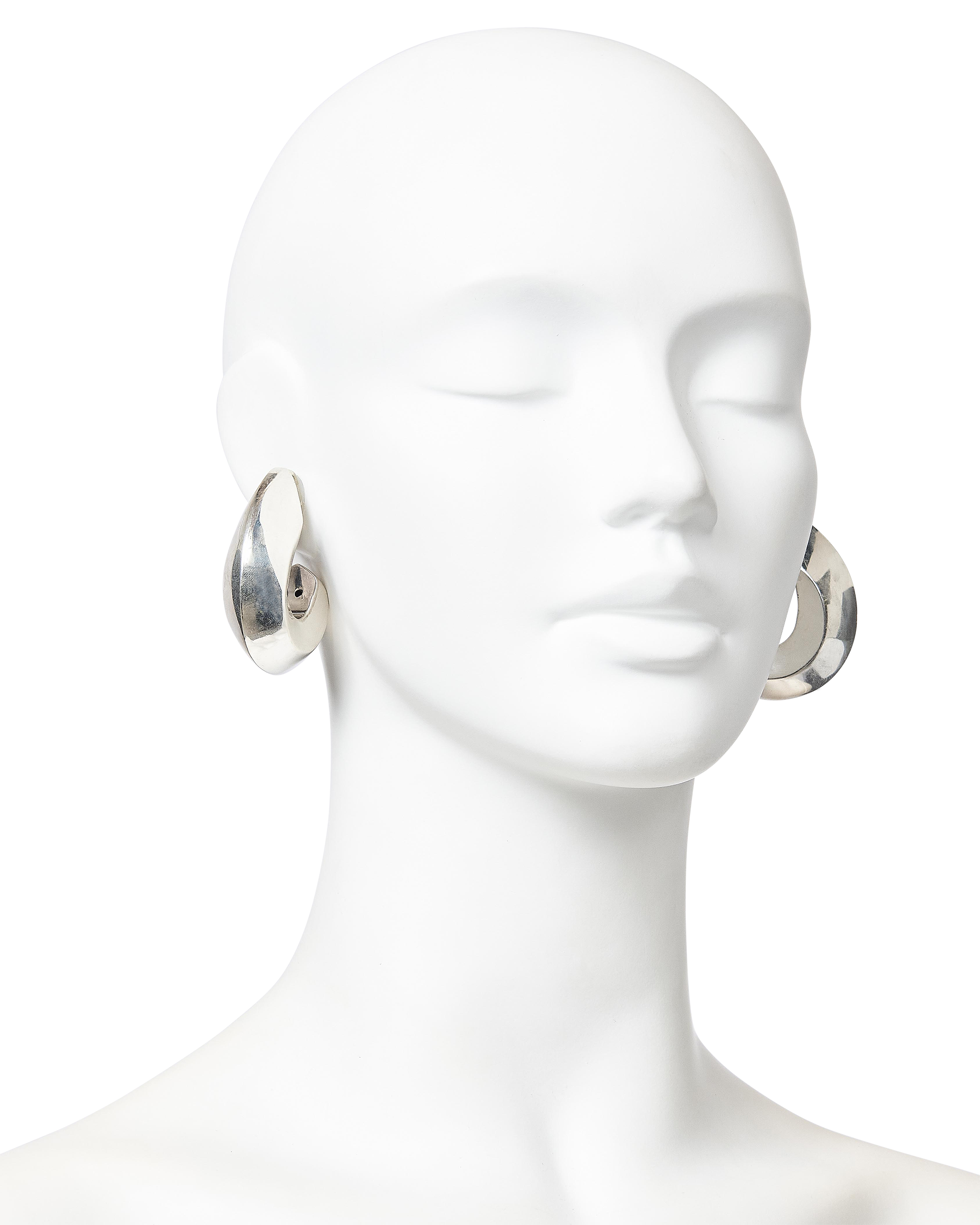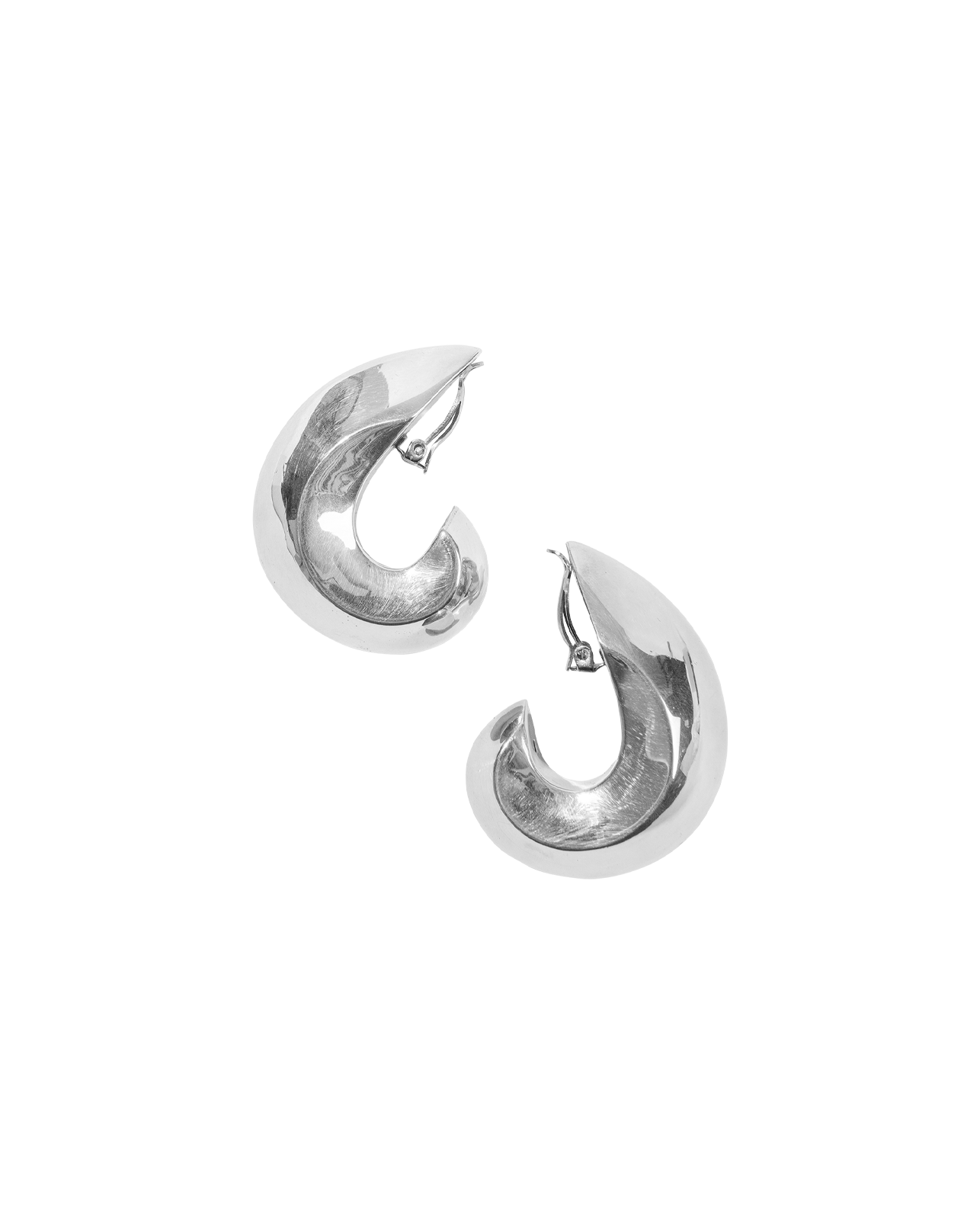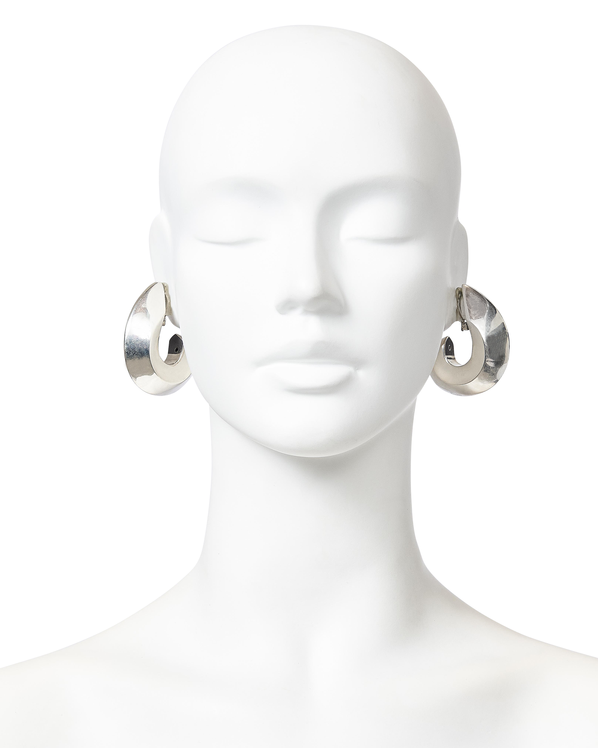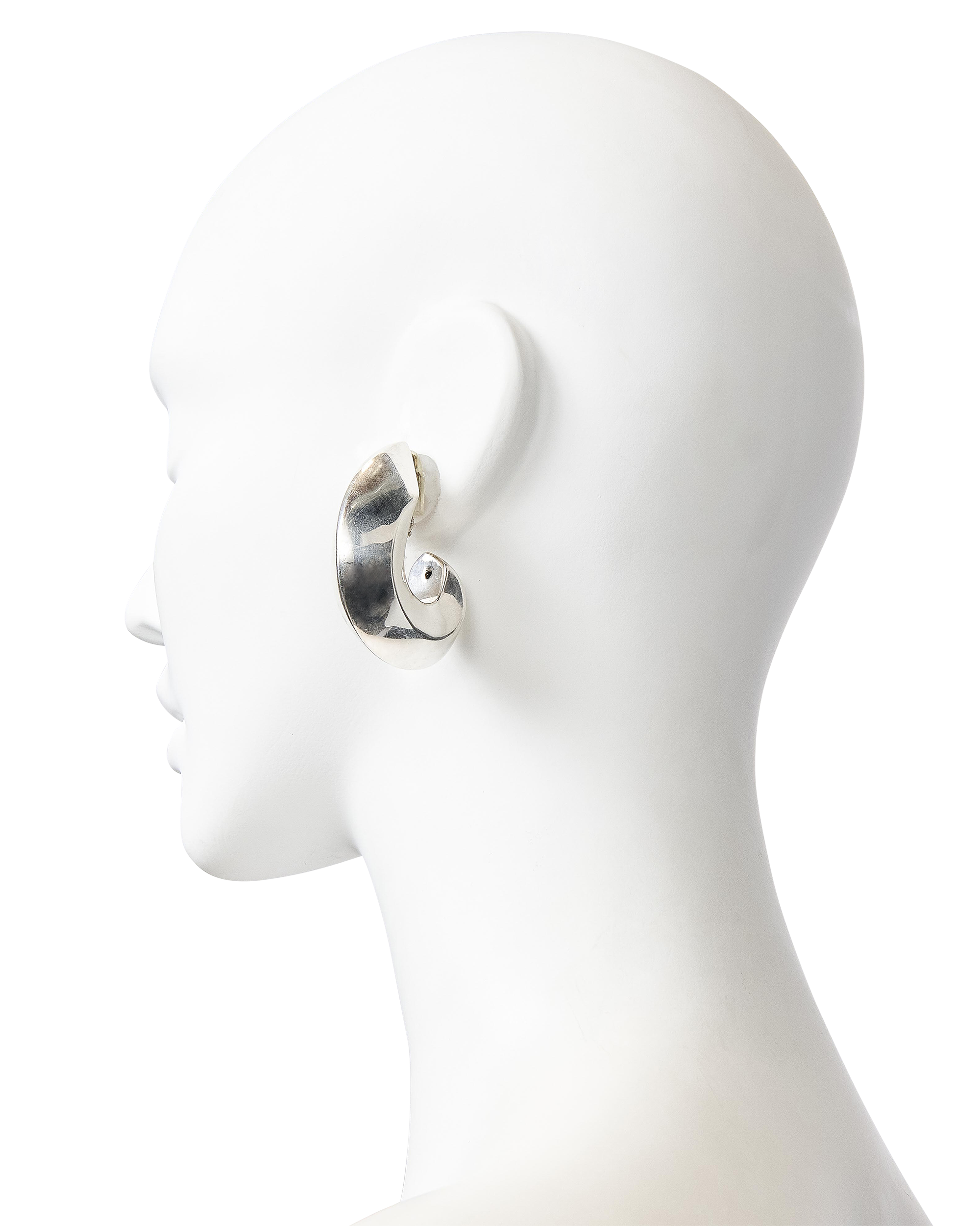 1978 Patricia Von Musulin (Signed) Sterling Silver Oversized Curved Earrings. Large Sterling Silver earrings (925) with clip-on base. Clip-ons have been covered for comfortability when wearing due to moderate weight of earring. Many Patricia Von Musulin pieces are featured in the Met Museum; special pieces of fashion history. Similar pieces also seen on the legendary Iman, Linda Evangelista, and many major magazine editorials, including W Magazine, Paper Magazine, and Harper's Bazaar. In very good vintage condition with light wear throughout (unnoticeable when worn).