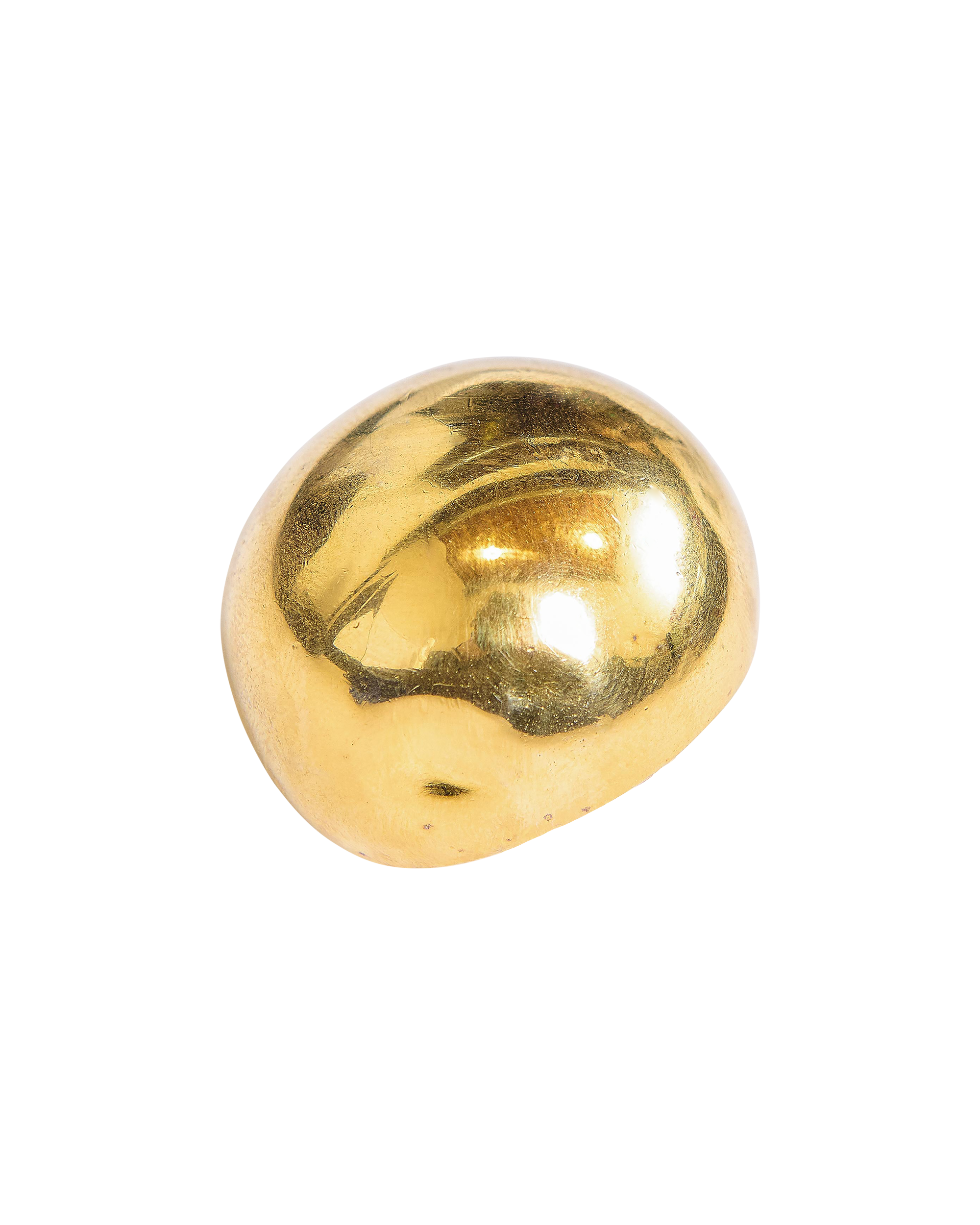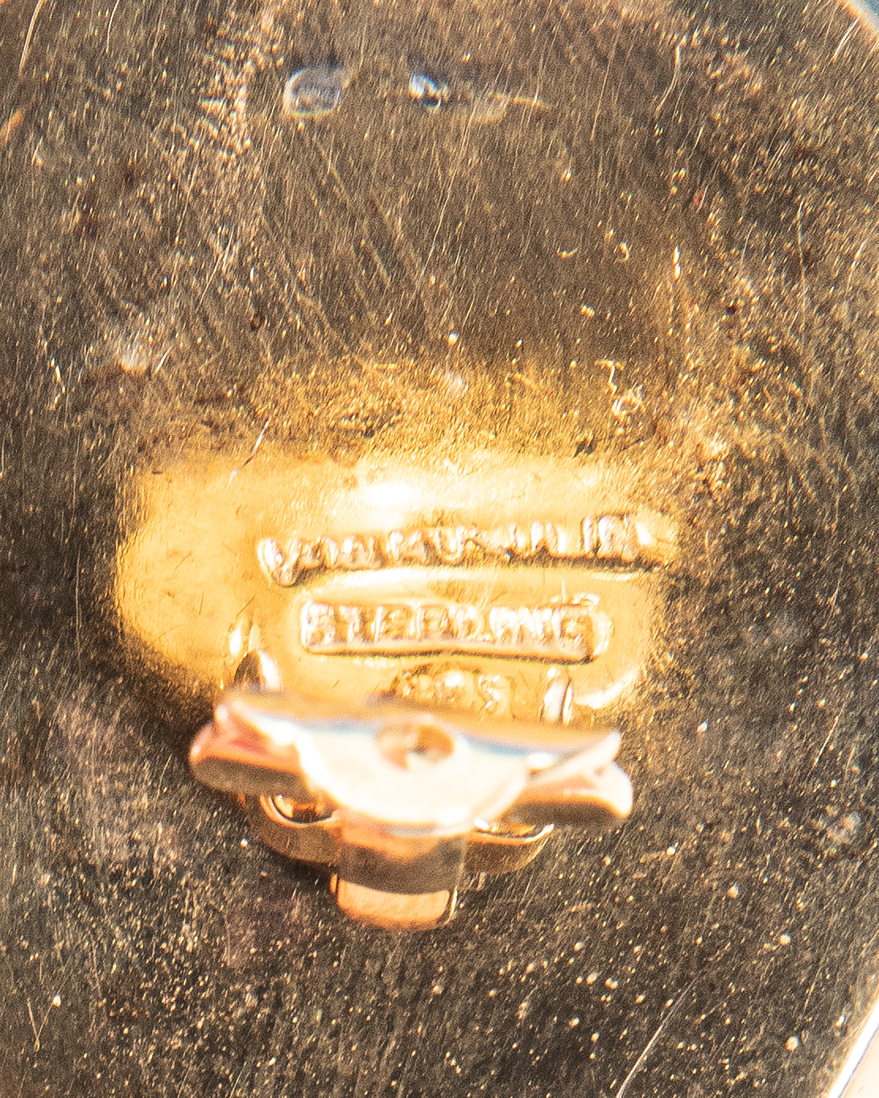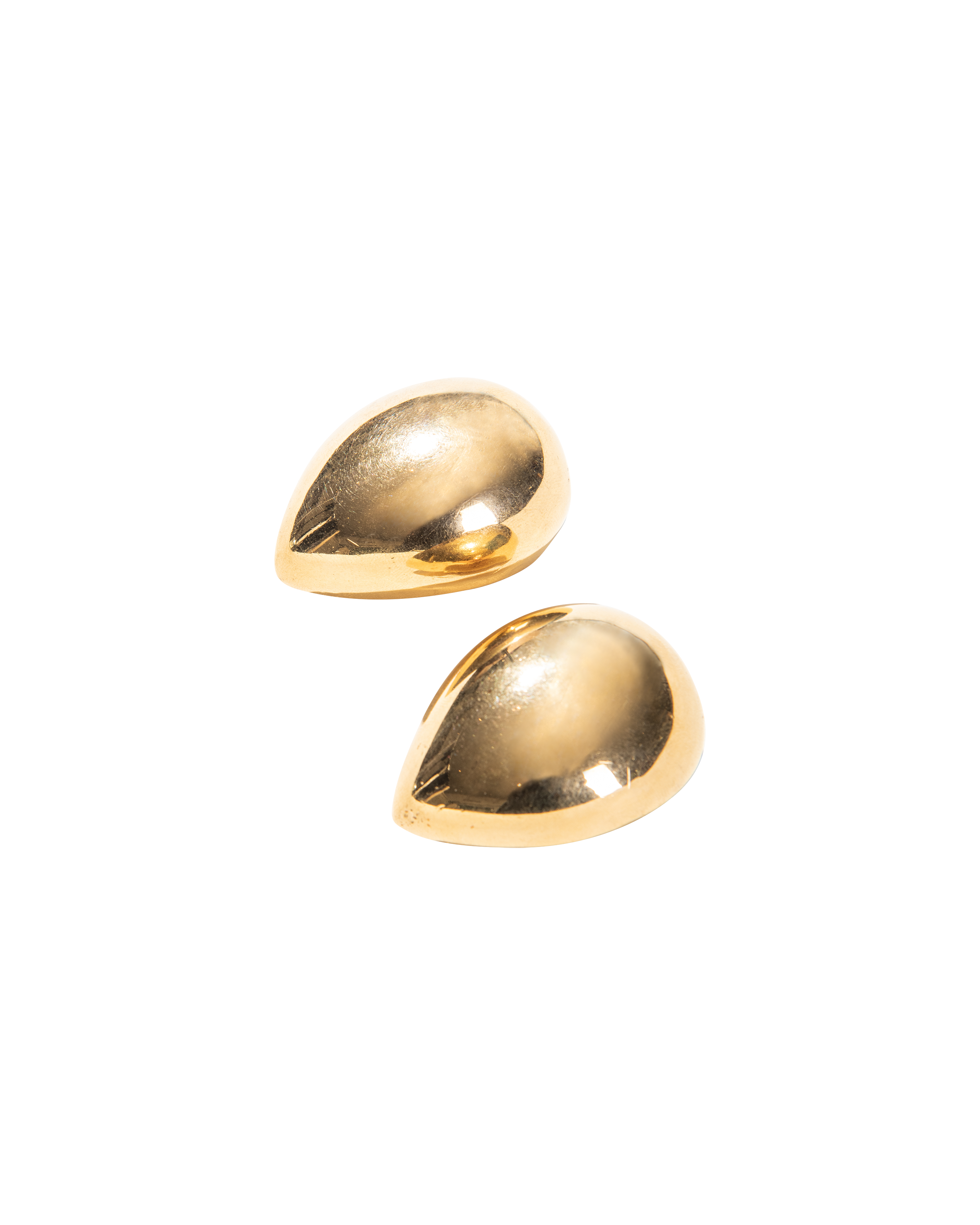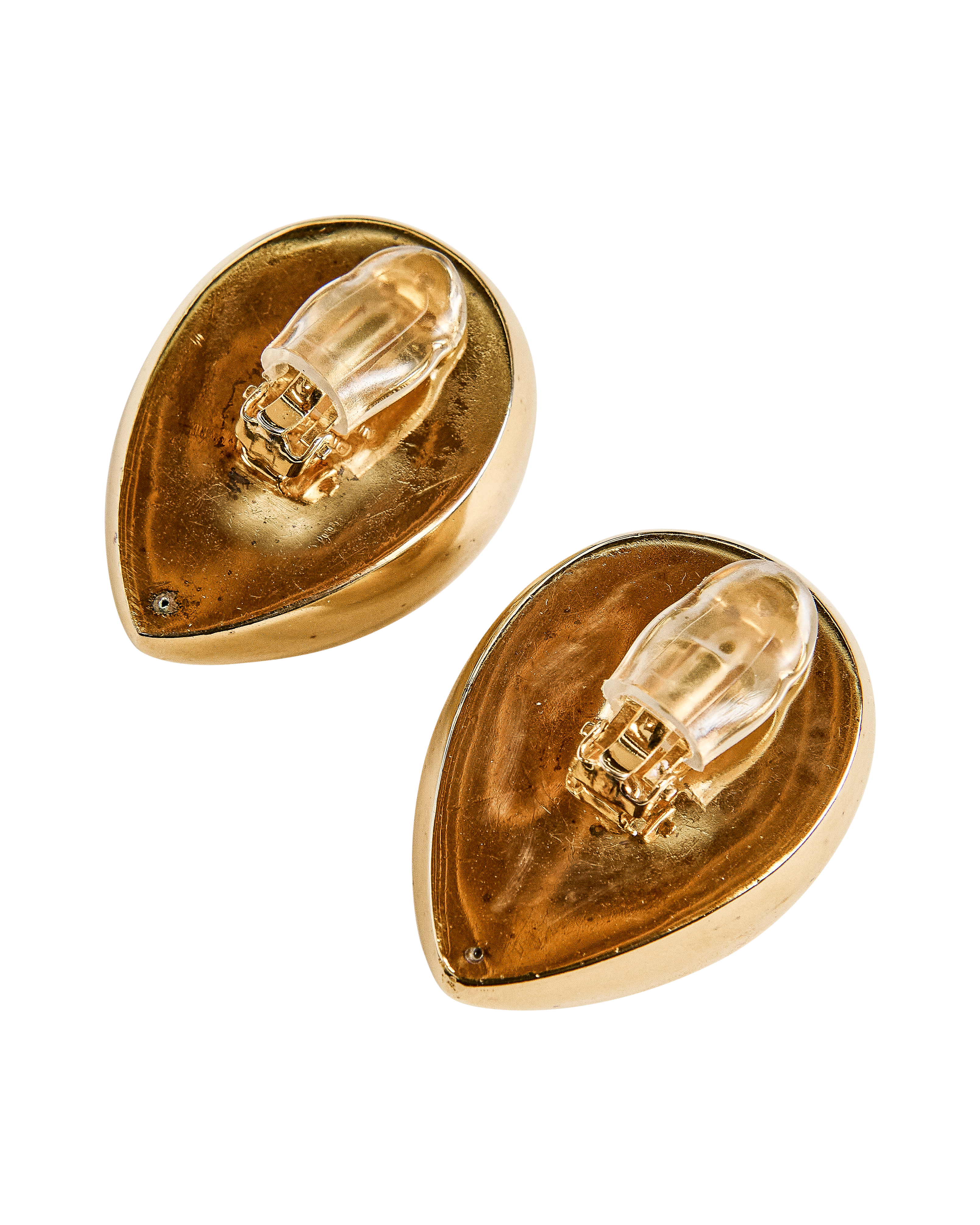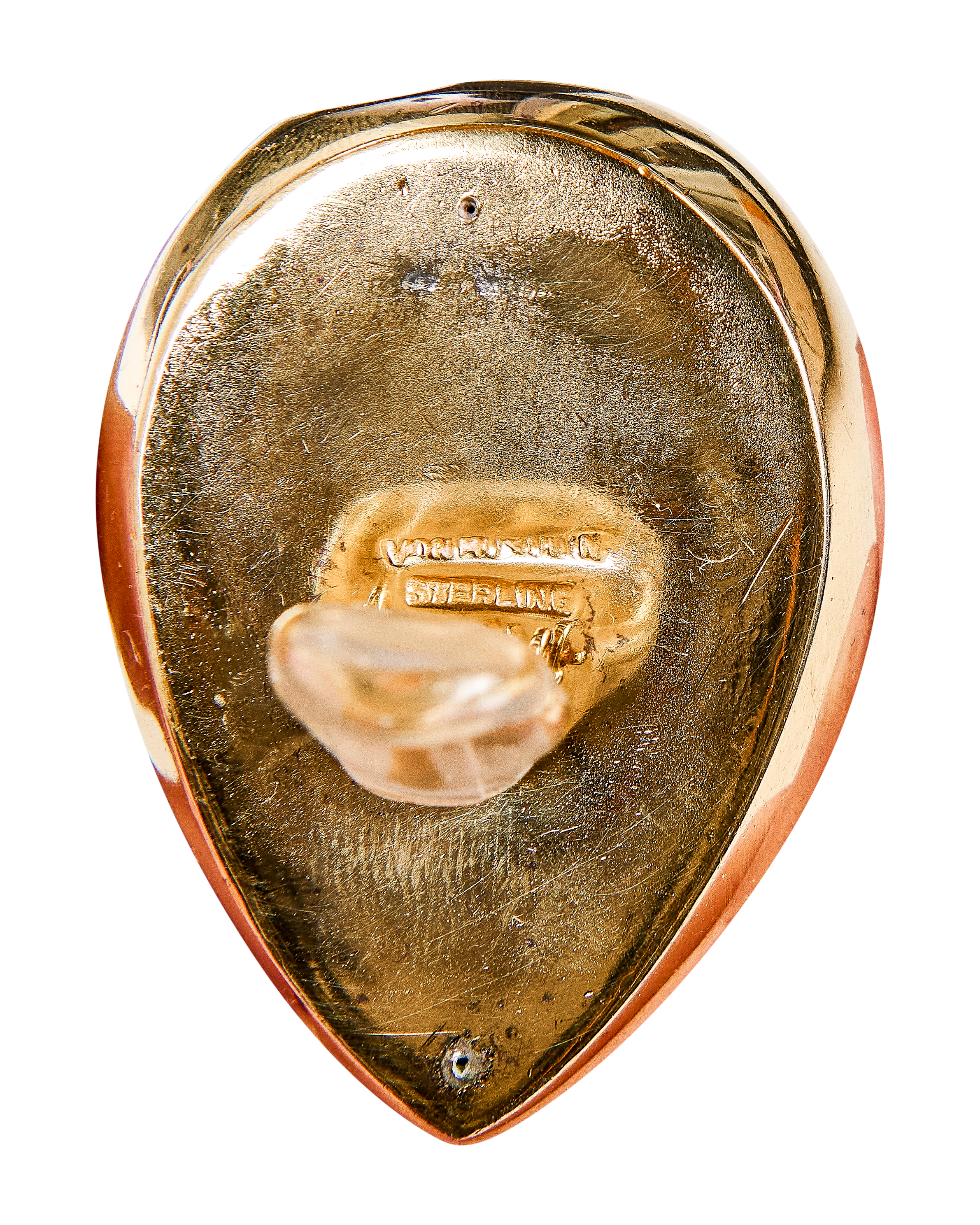 1970's Patricia Von Musulin (Signed) Gold Teardrop Clip-On Earrings. Medium-sized gold-tone teardrop-shaped clip-on earring (larger base, with pointed construction). Plastic cover added to clip-on for ease of wearing, due to moderate weight of earring. Many Patricia Von Musulin pieces are featured in the Met Museum; special pieces of fashion history. Similar pieces also seen on the legendary Iman, Linda Evangelista, and many major magazine editorials, including W Magazine, Paper Magazine, and Harper's Bazaar. In very good vintage condition with slight indentation at top of earring (unnoticeable when worn unless upon close inspection).