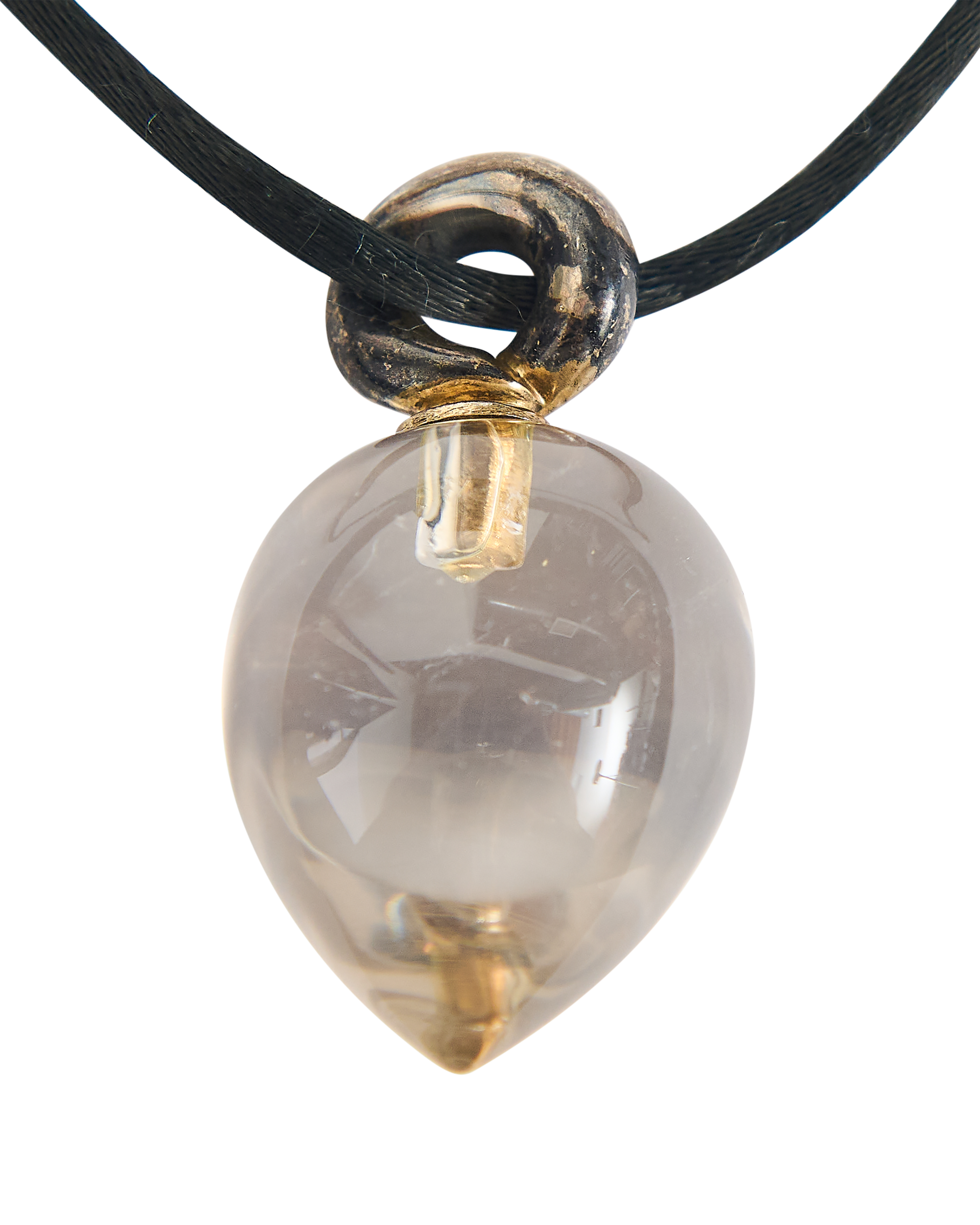 1978 Patricia Von Musulin lucite and sterling silver drop pendant necklace. Large teardrop shaped clear lucite pendant necklace with silver-tone base on black cord (cord can be swapped as desired for different styling effect). As seen in the Met Museum on white cord. In very good vintage condition with wear / oxidization at silver.