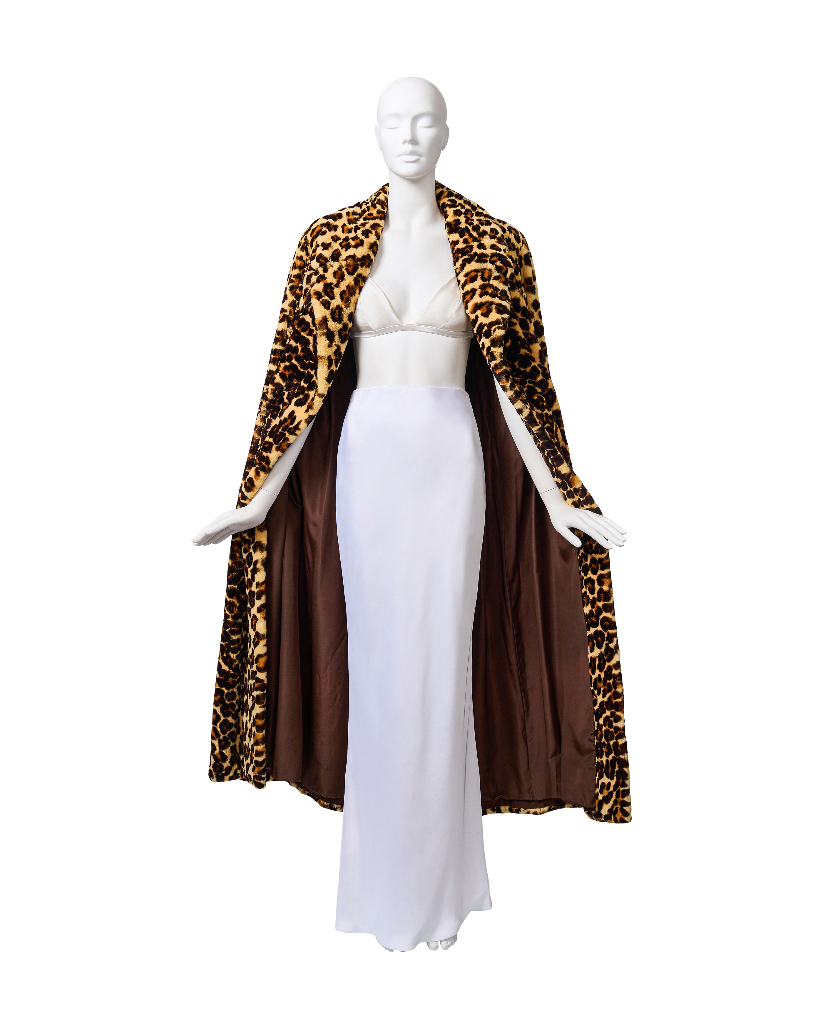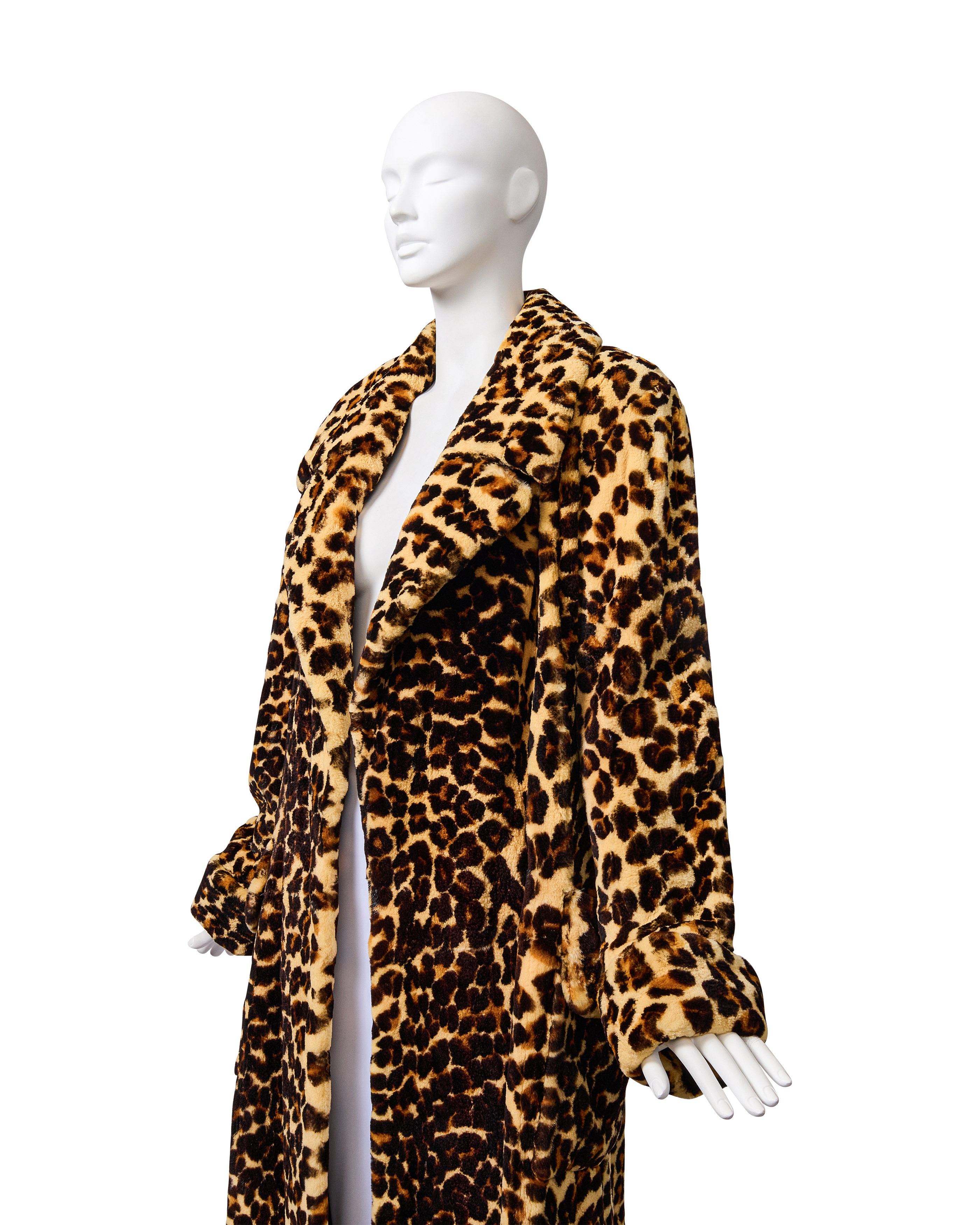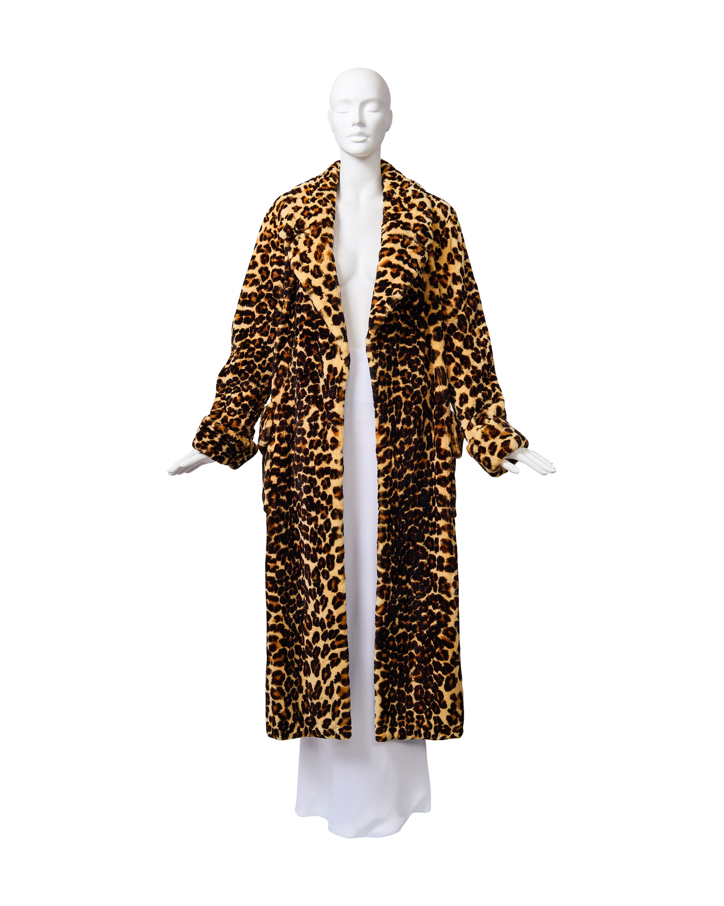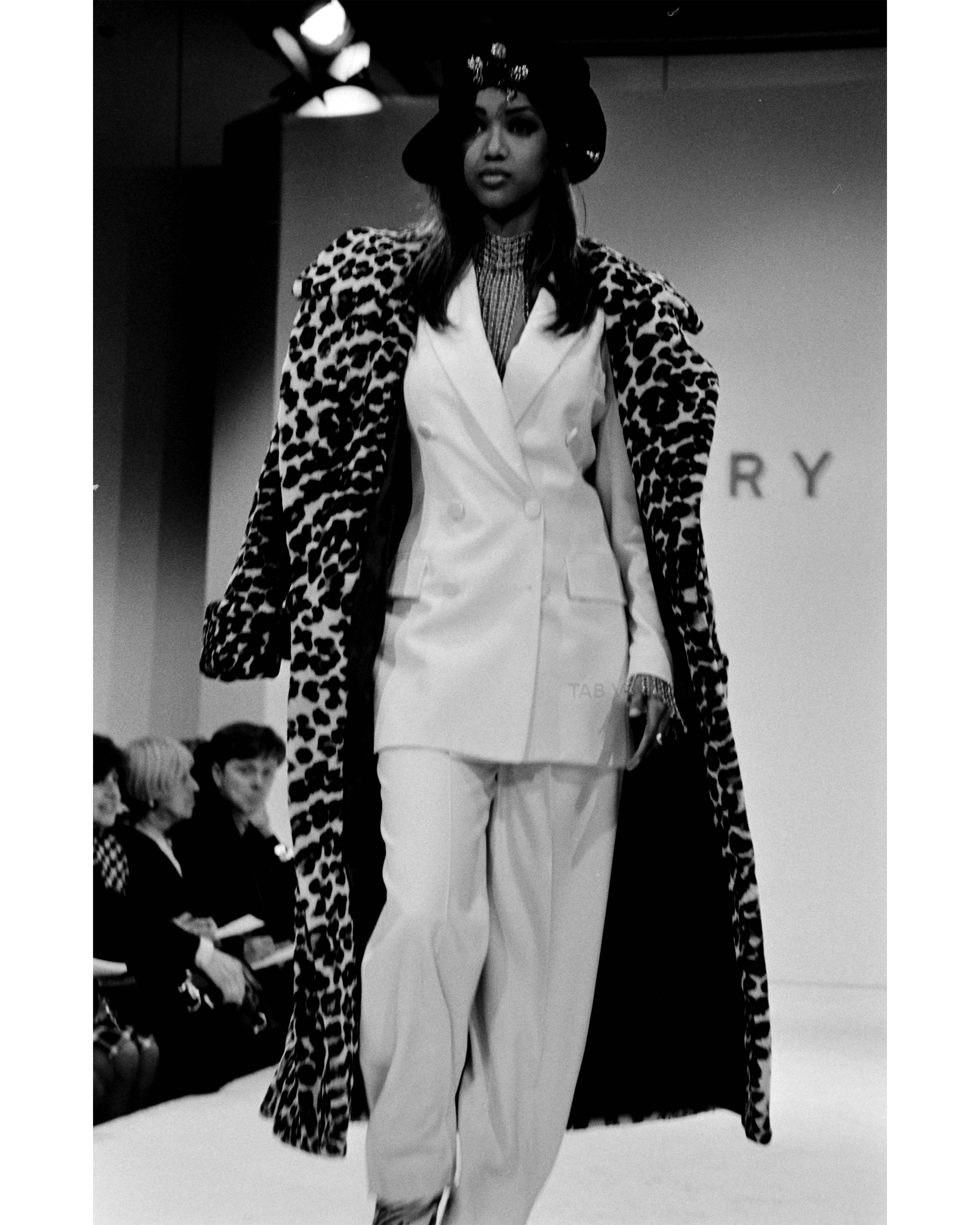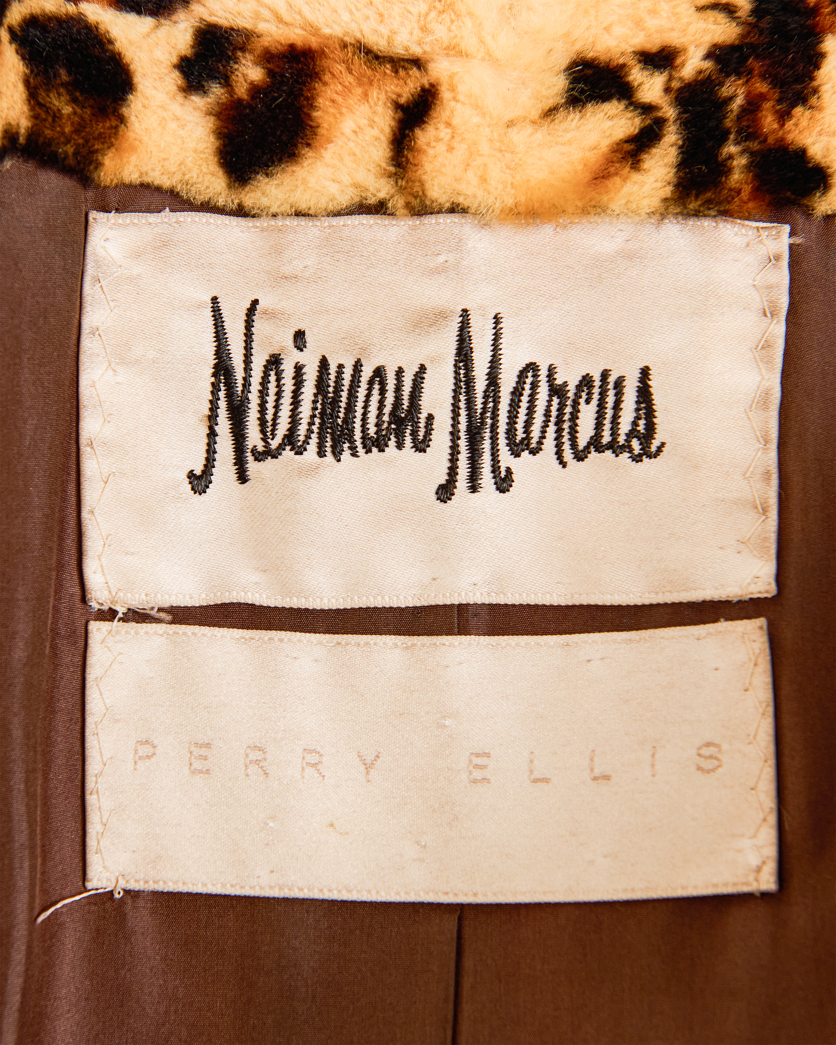 A/W 1992 Perry Ellis by Marc Jacobs leopard print fur coat. Collared long sleeve leopard print fur coat with front belt tie closure. Functional patch pockets. Rare jacket as seen on Tyra Banks on the runway. Embroidered cursive 'Cynthia' monogram on interior lining from prior owner. Likely alpaca fur (unlisted). In very good vintage condition with light wear throughout. Note that white skirt and bra top are utilized for e-commerce purposes only and are not included with purchase.