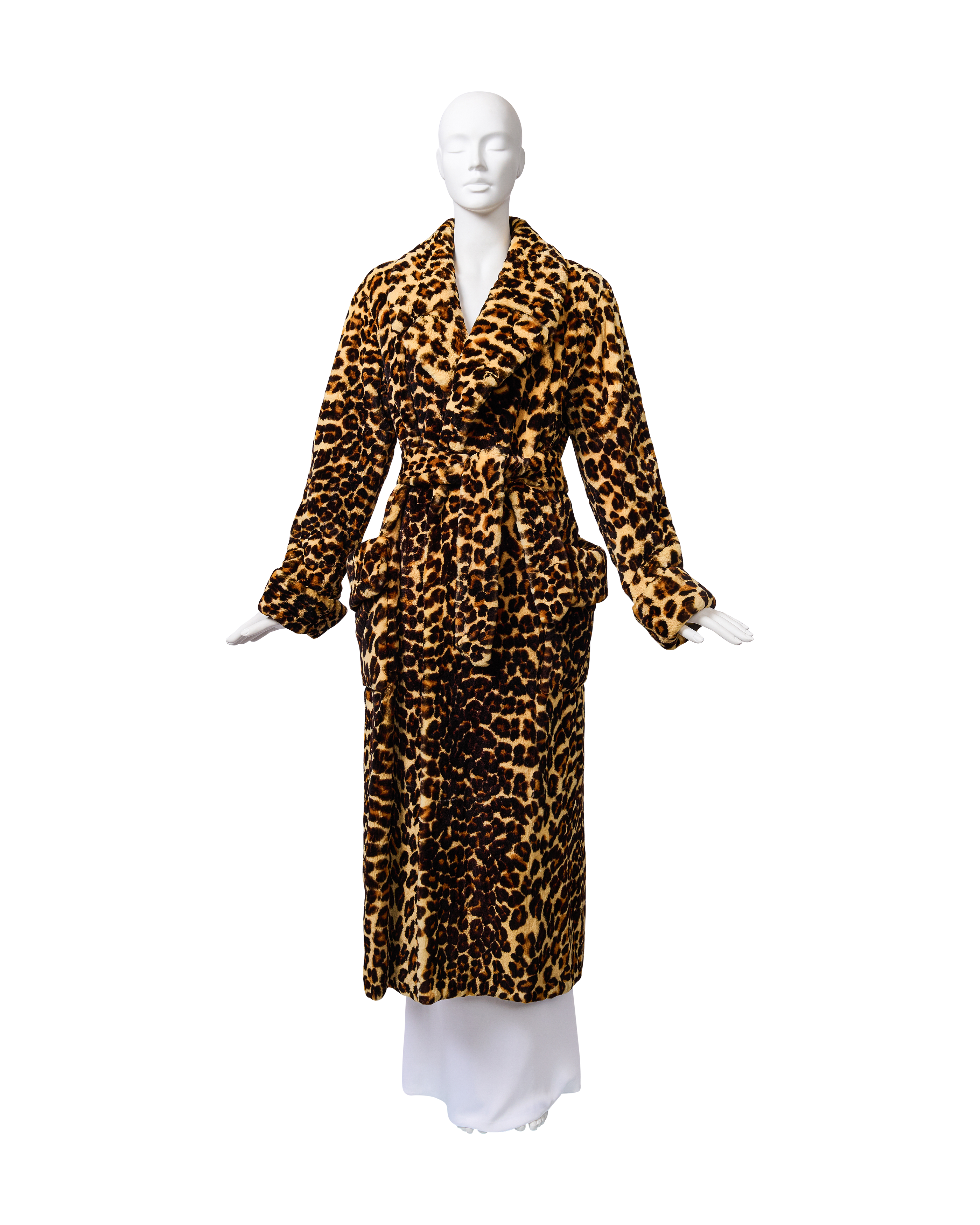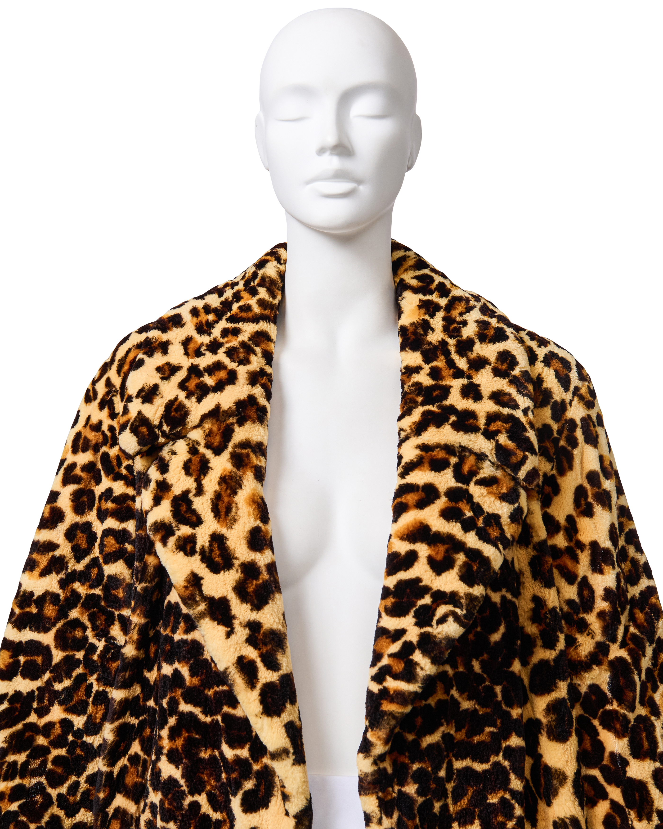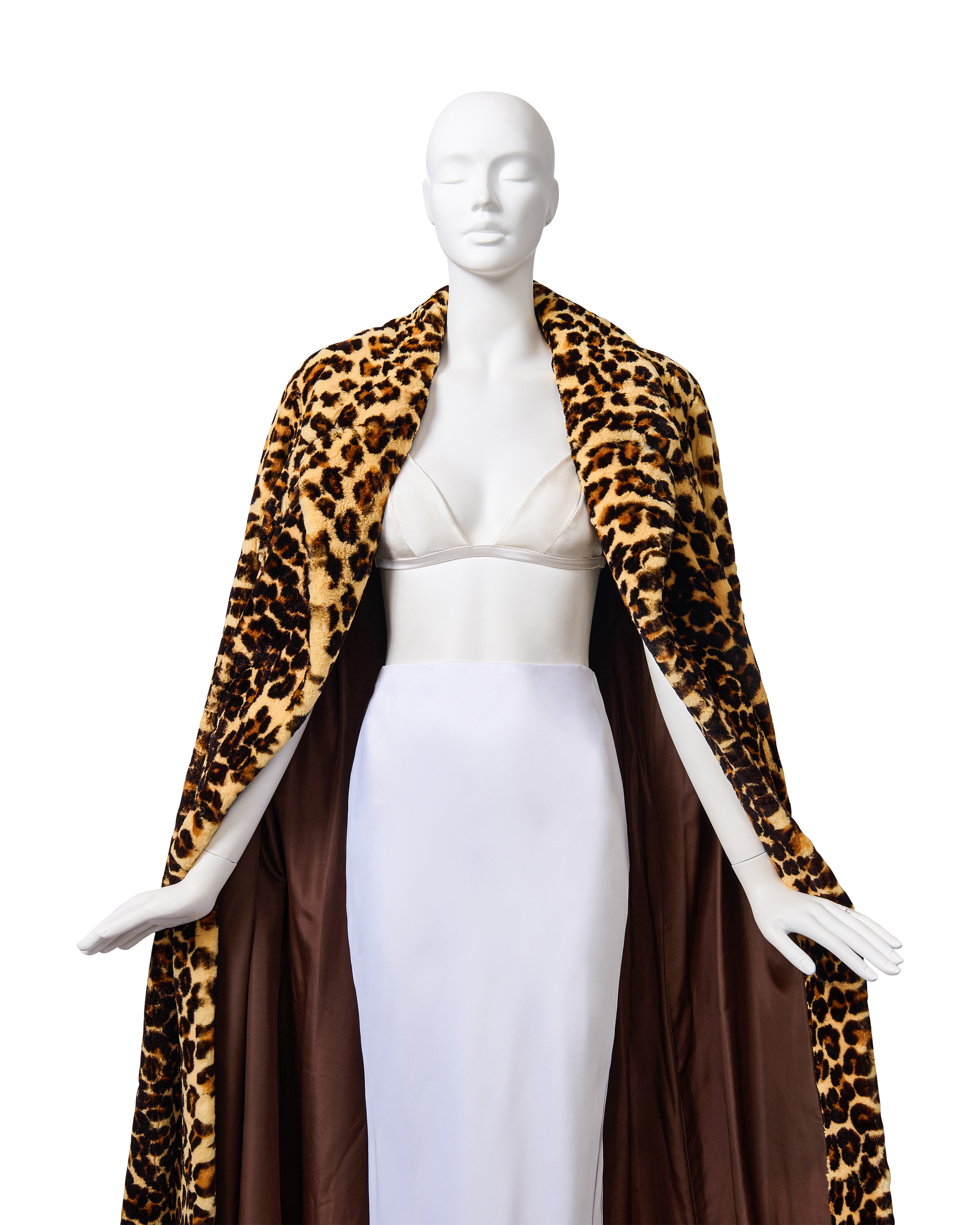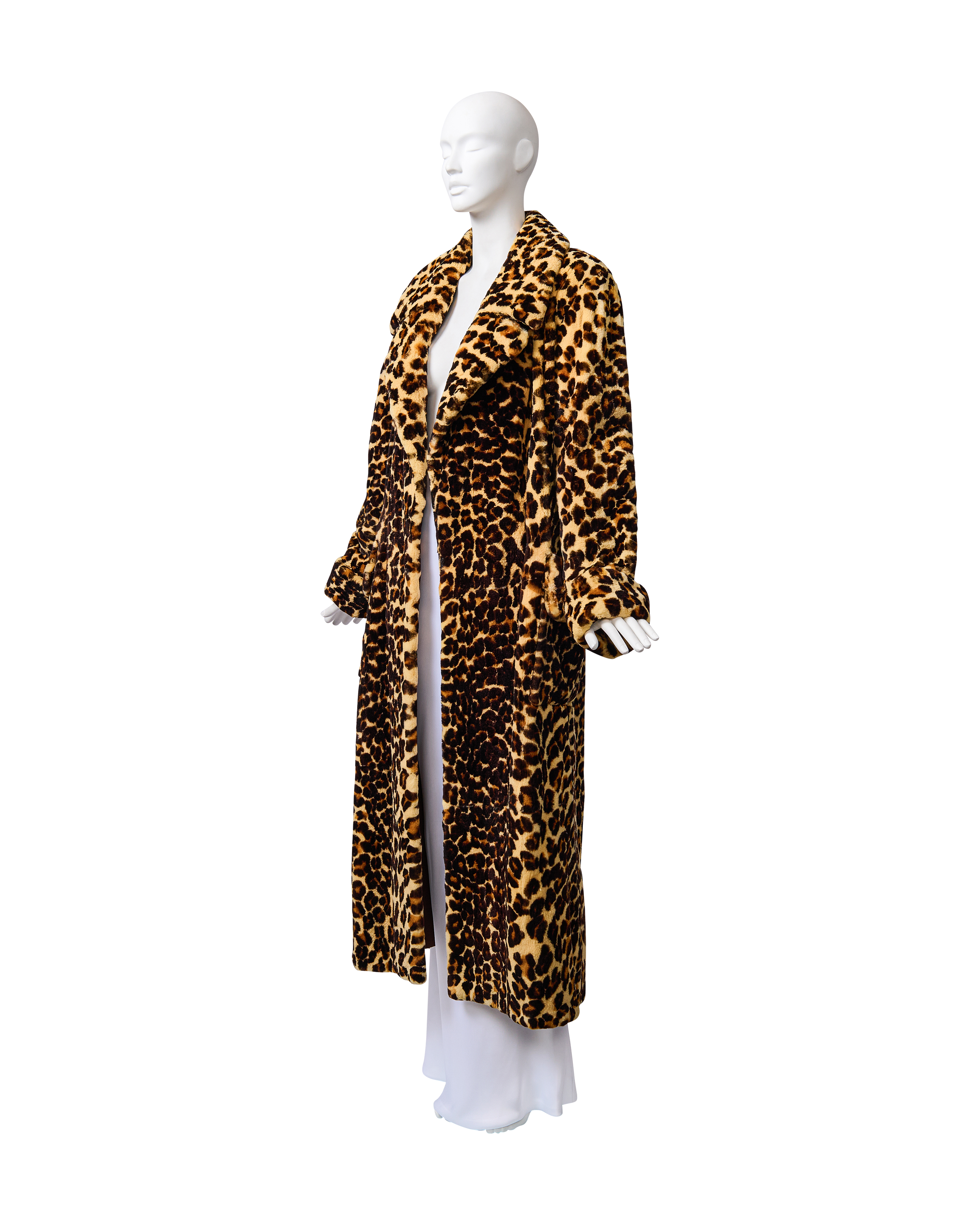 A/W 1992 Perry Ellis by Marc Jacobs leopard print fur coat. Collared long sleeve leopard print fur coat with front belt tie closure. Functional patch pockets. Rare jacket as seen on Tyra Banks on the runway. Embroidered cursive 'Cynthia' monogram on interior lining from prior owner. Likely alpaca fur (unlisted). In very good vintage condition with light wear throughout. Note that white skirt and bra top are utilized for e-commerce purposes only and are not included with purchase.