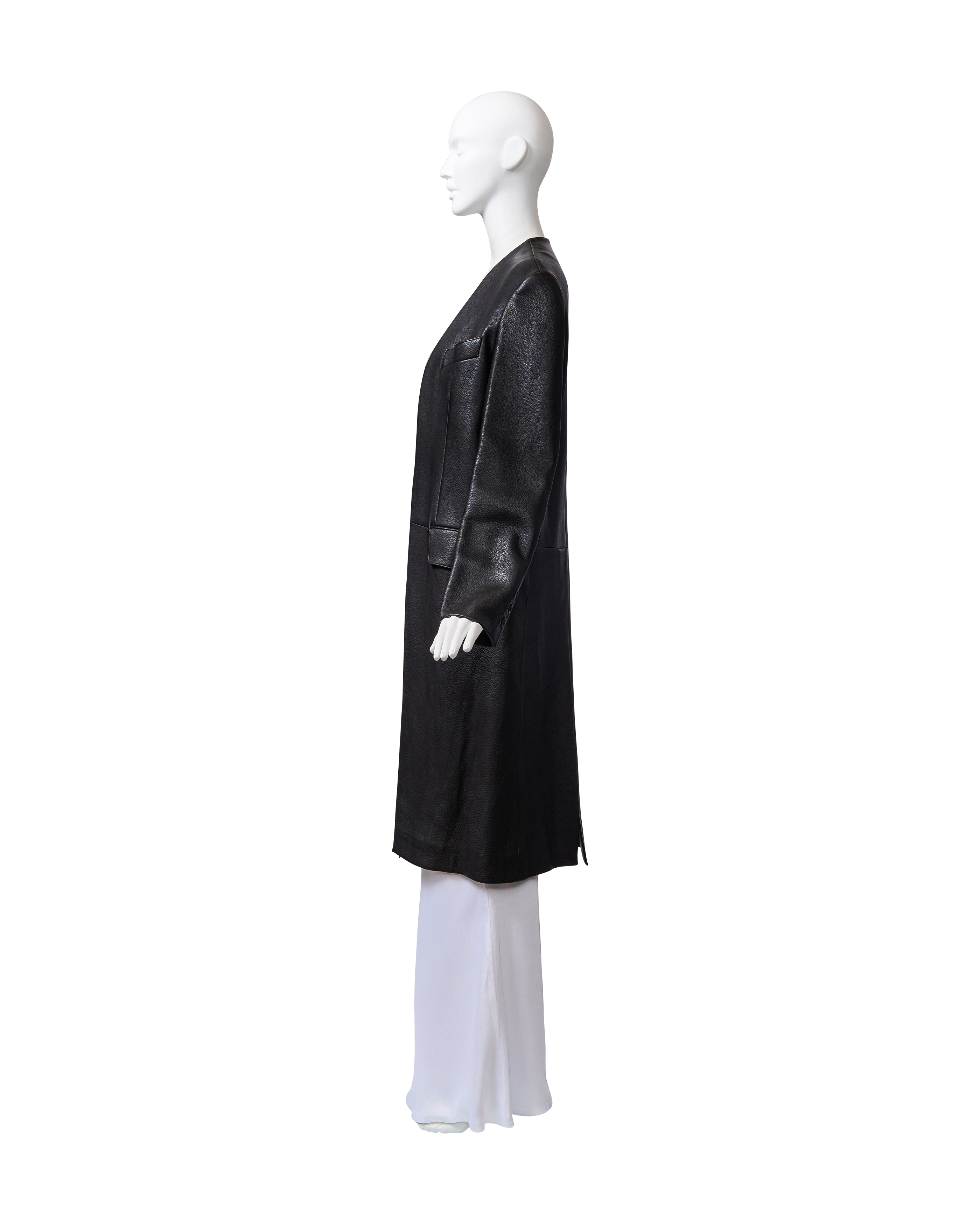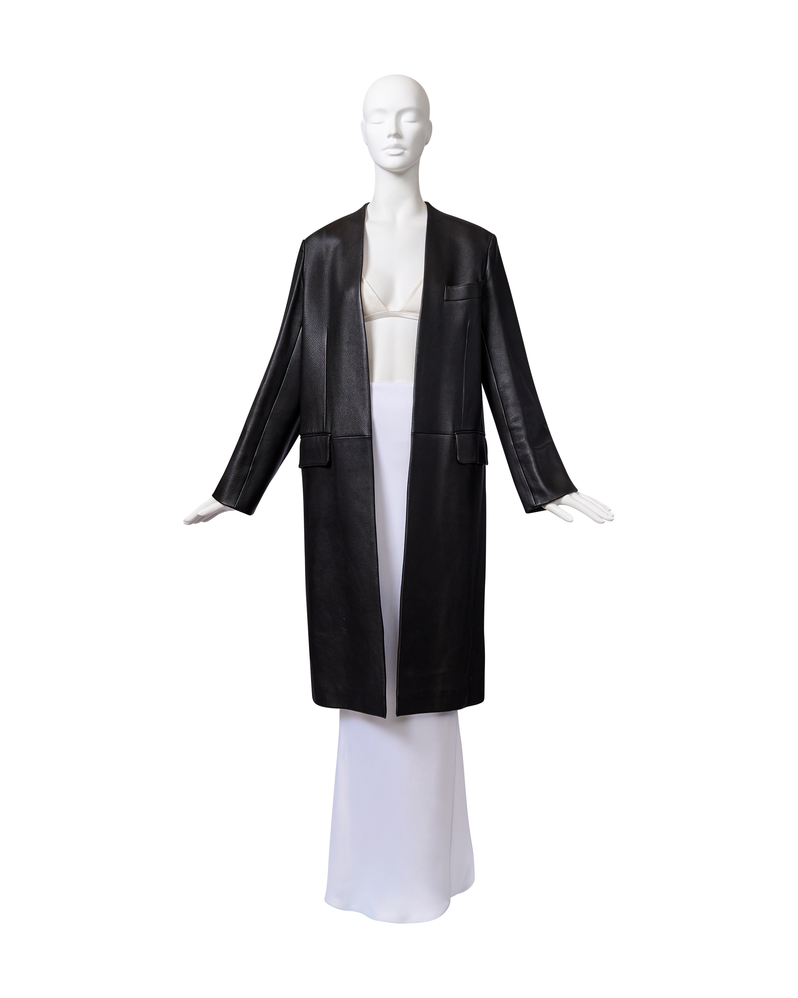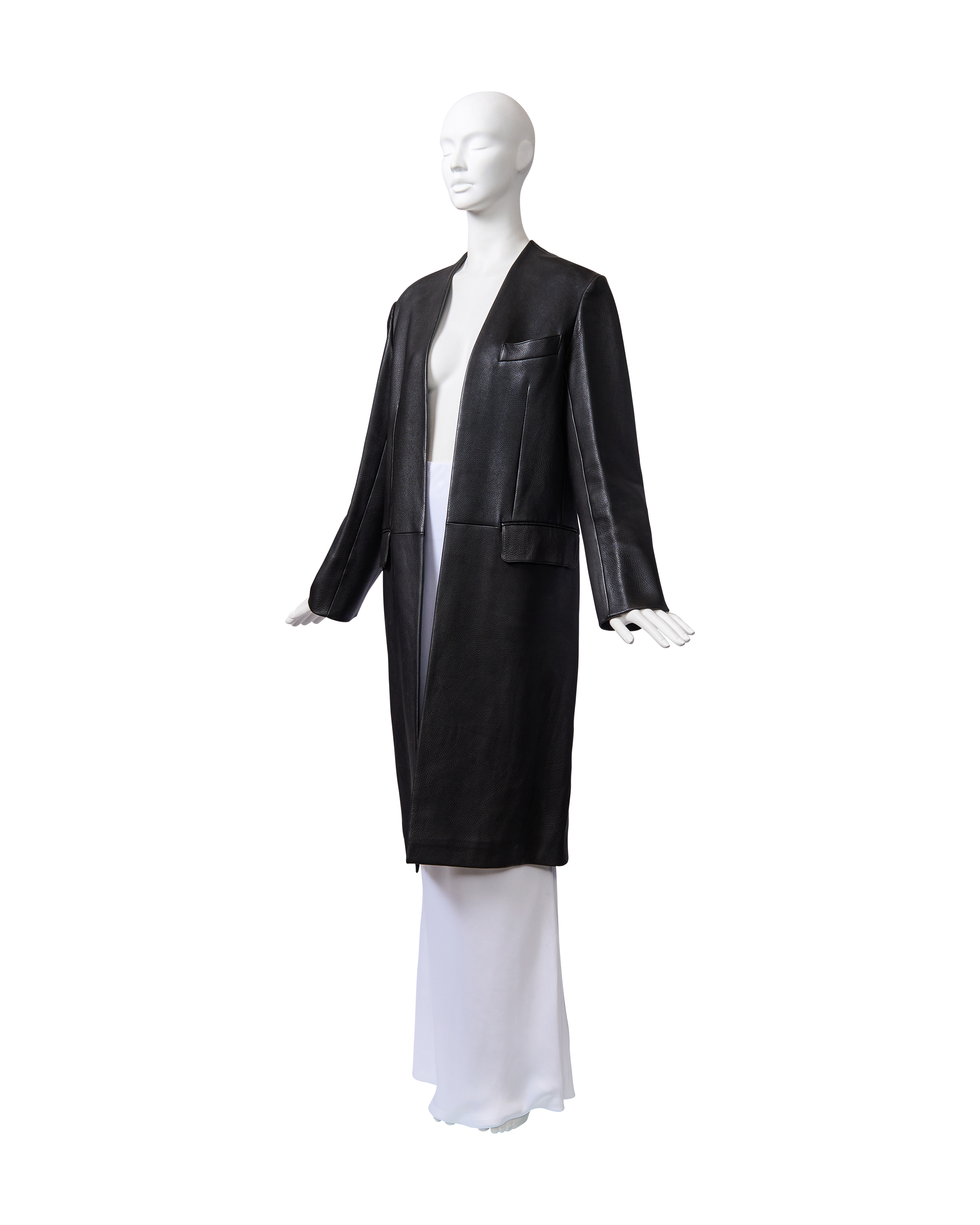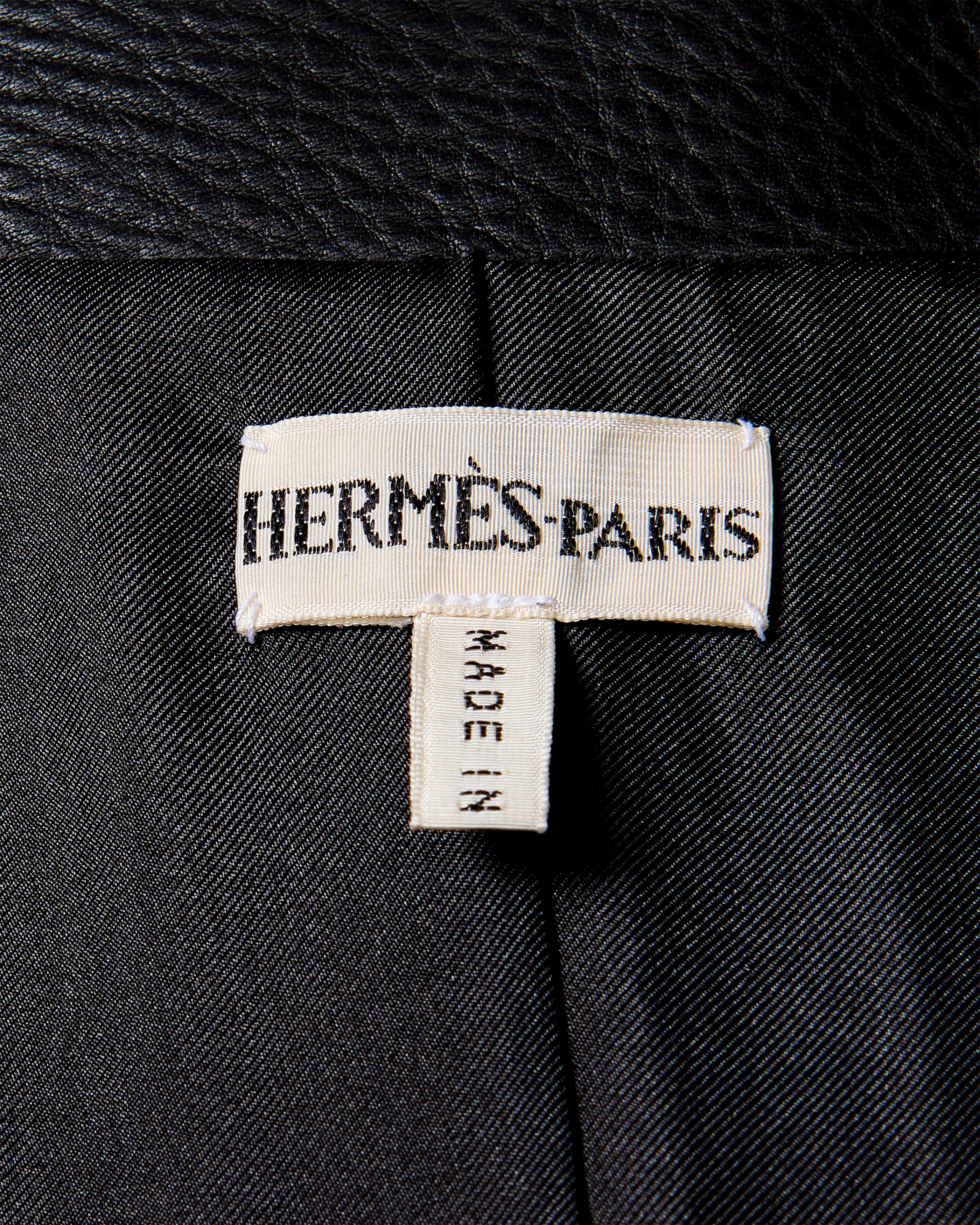 A/W 1998 Hermès by Martin Margiela black leather collarless jacket. Sleek, long sleeve collarless jacket with no closures. Slit pocket detail at left side bust and functional flap pockets at waist. Three button closures at wrist. Fabric Contents: 100% Deer leather with 100% Silk lining (pebbled leather texture). As seen on the runway as the opening look of the collection (Look #1) and in Look #31. In very good vintage condition with light wear at front of jacket (unnoticeable when worn); comes with original garment bag. Note that white skirt and bra top are utilized for e-commerce purposes only and is not included with purchase.