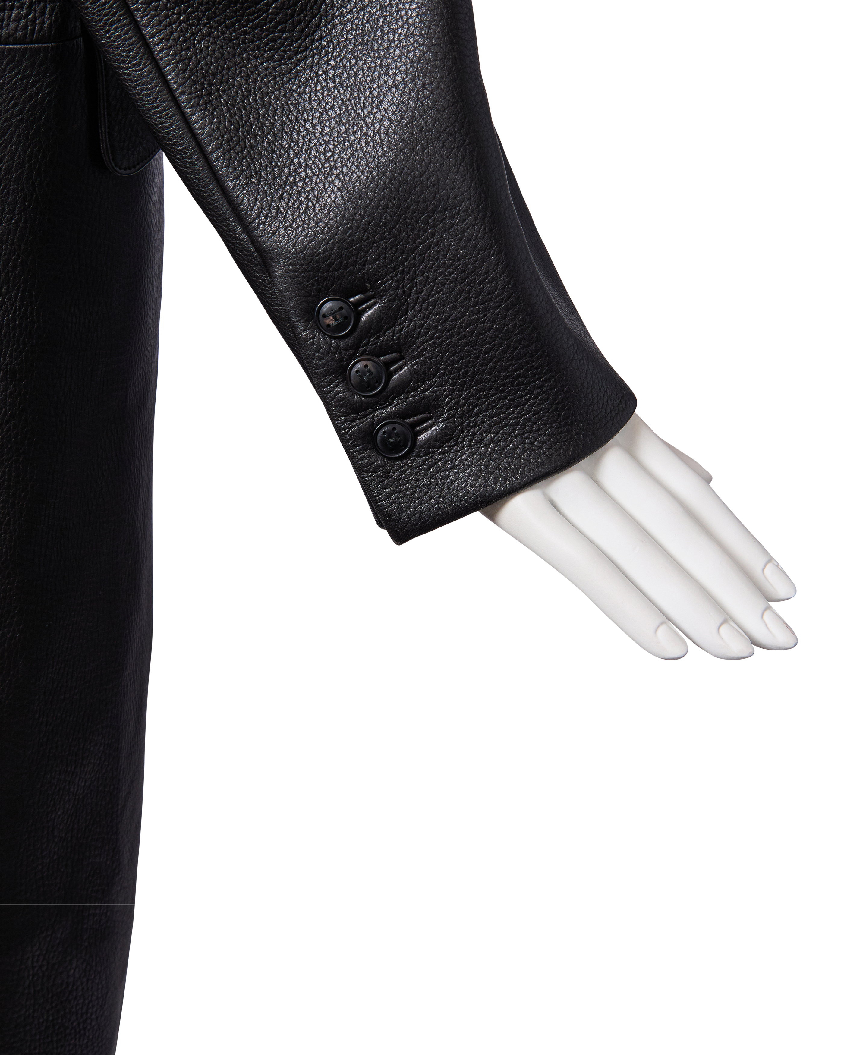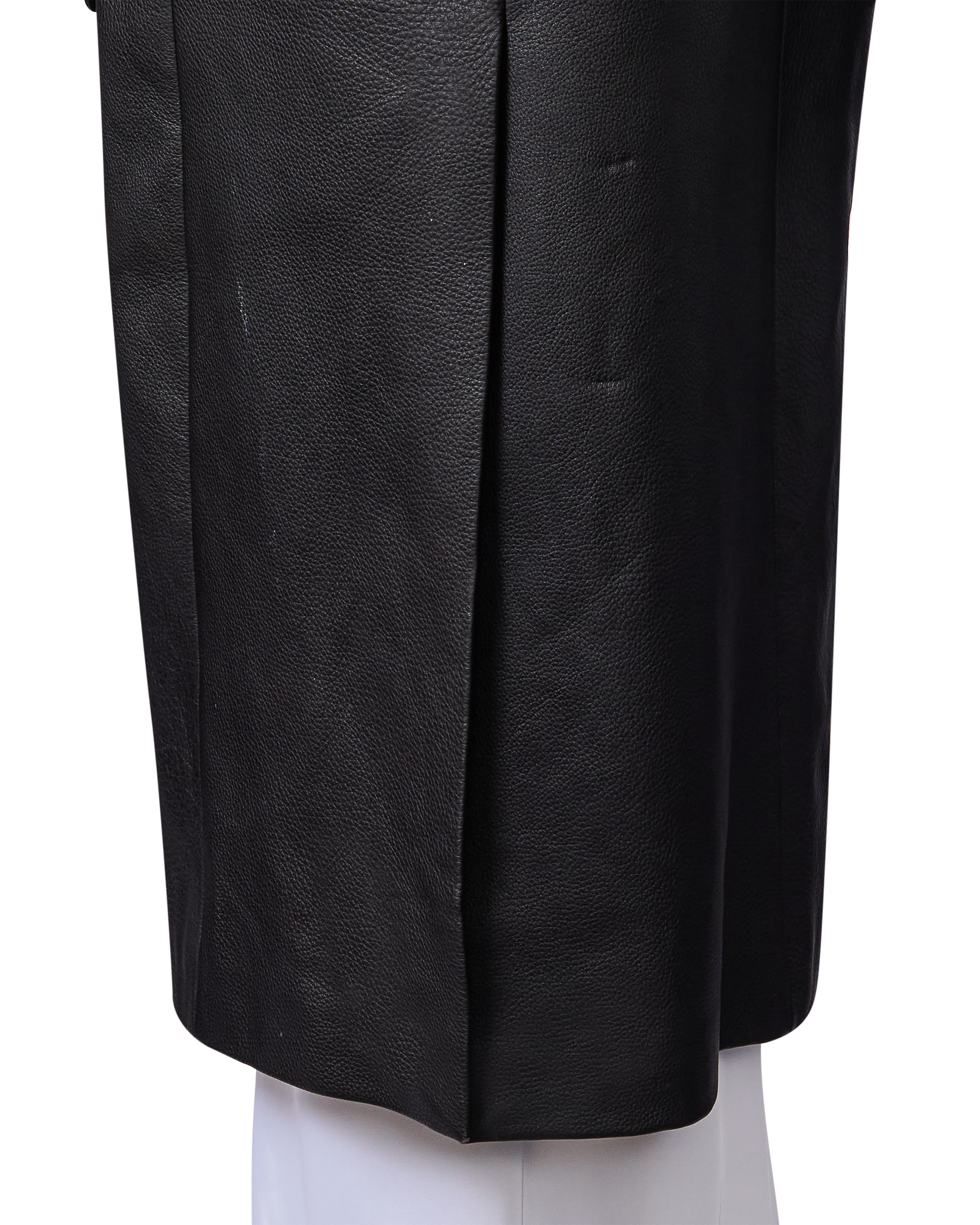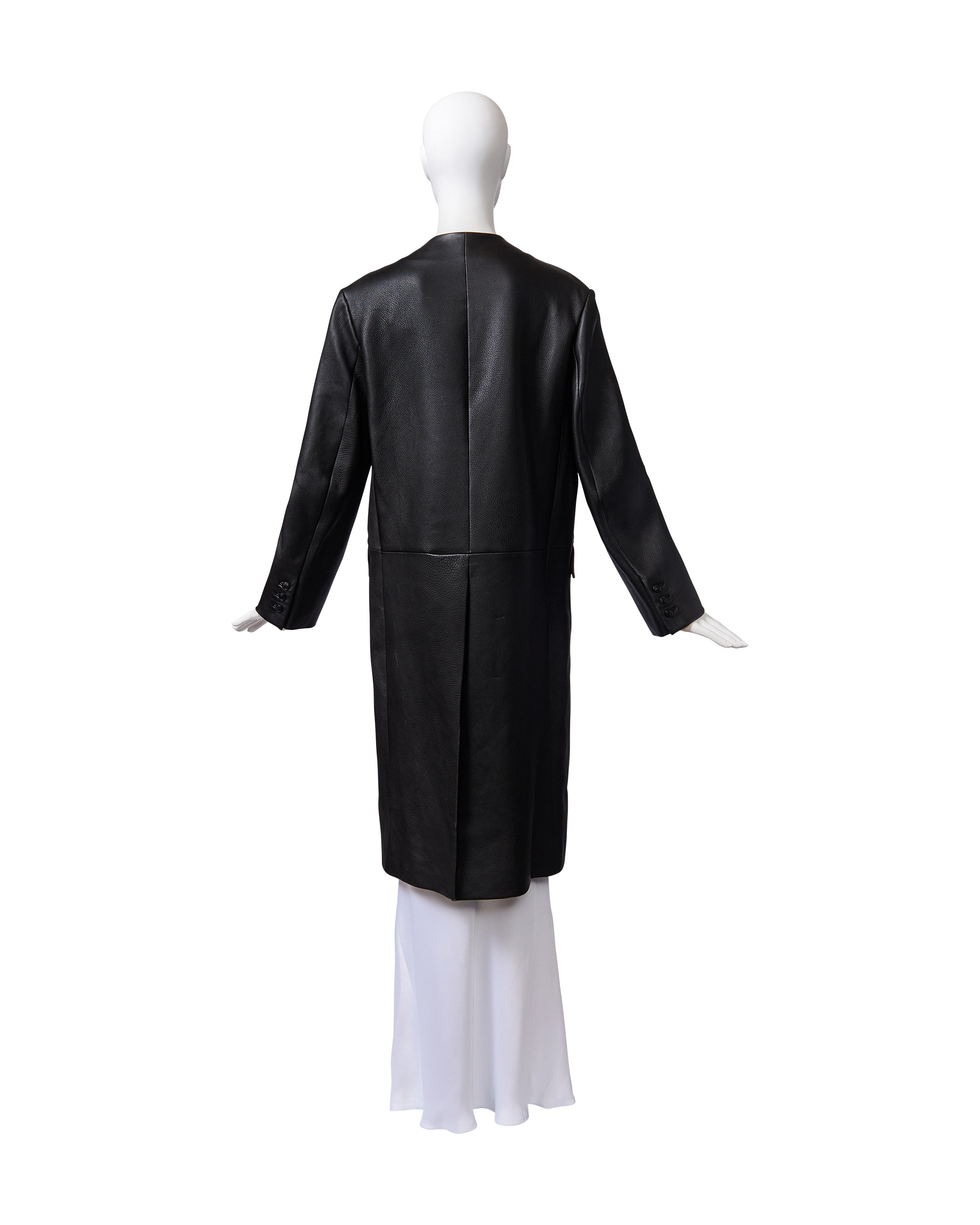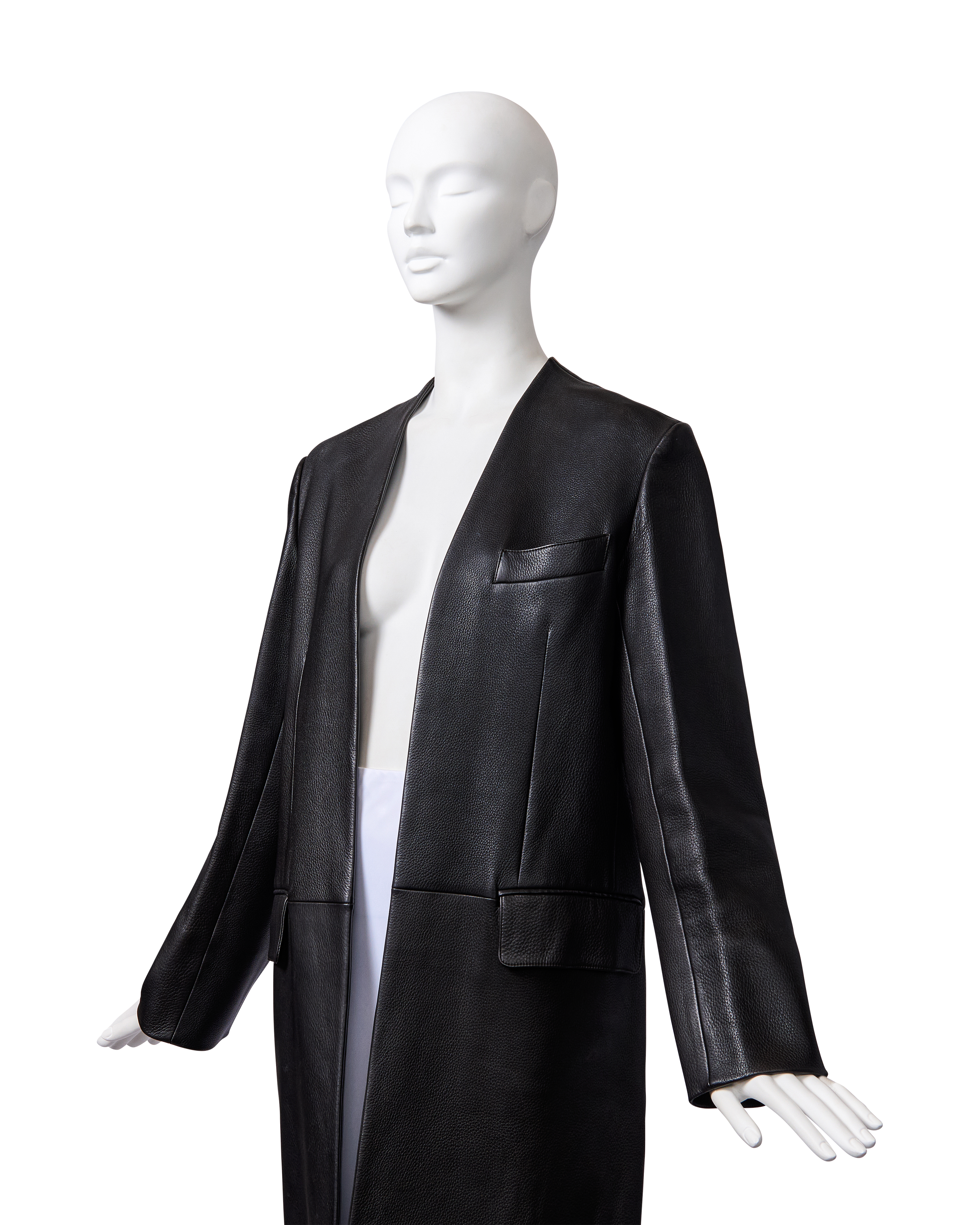A/W 1998 Hermès by Martin Margiela black leather collarless jacket. Sleek, long sleeve collarless jacket with no closures. Slit pocket detail at left side bust and functional flap pockets at waist. Three button closures at wrist. Fabric Contents: 100% Deer leather with 100% Silk lining (pebbled leather texture). As seen on the runway as the opening look of the collection (Look #1) and in Look #31. In very good vintage condition with light wear at front of jacket (unnoticeable when worn); comes with original garment bag. Note that white skirt and bra top are utilized for e-commerce purposes only and is not included with purchase.