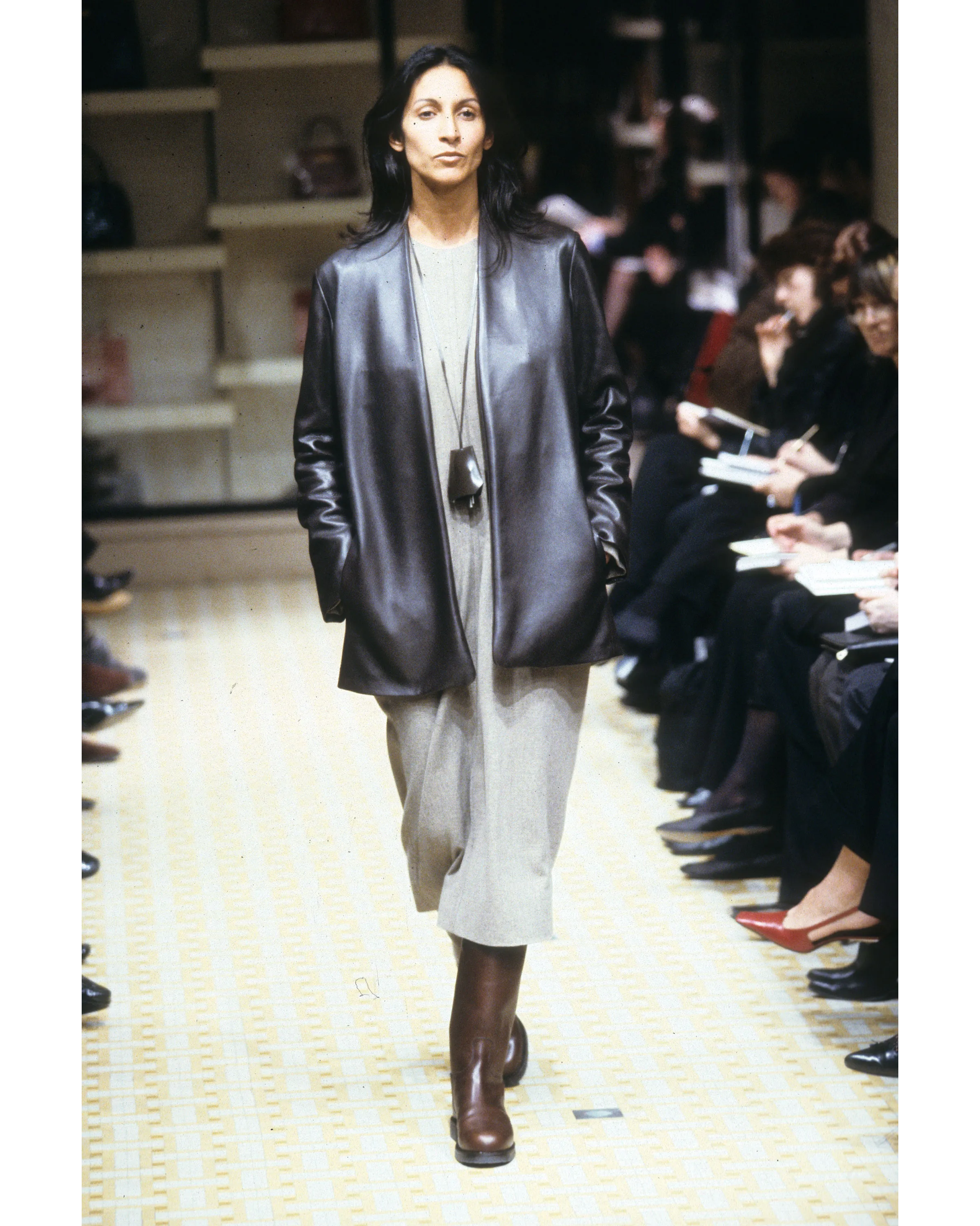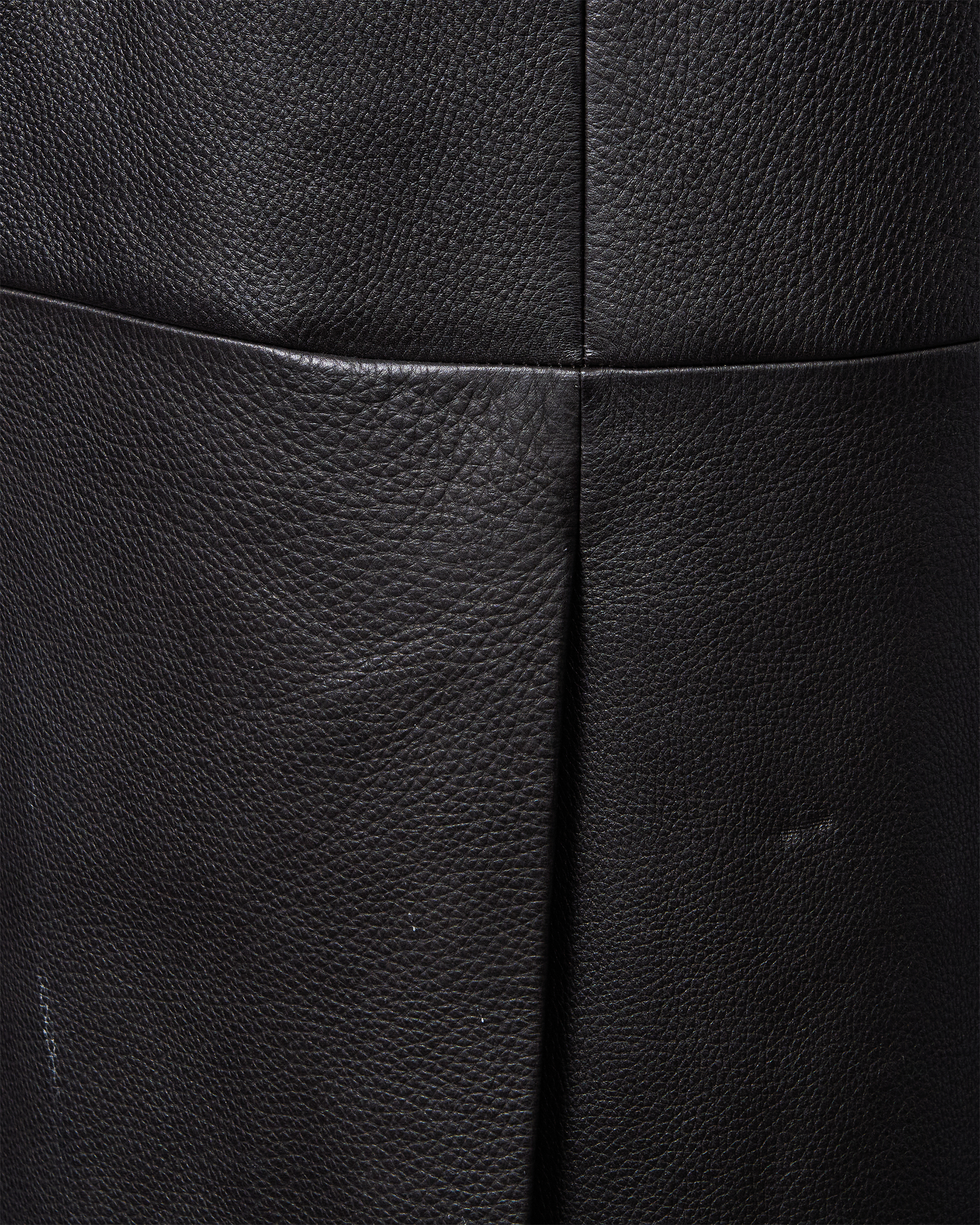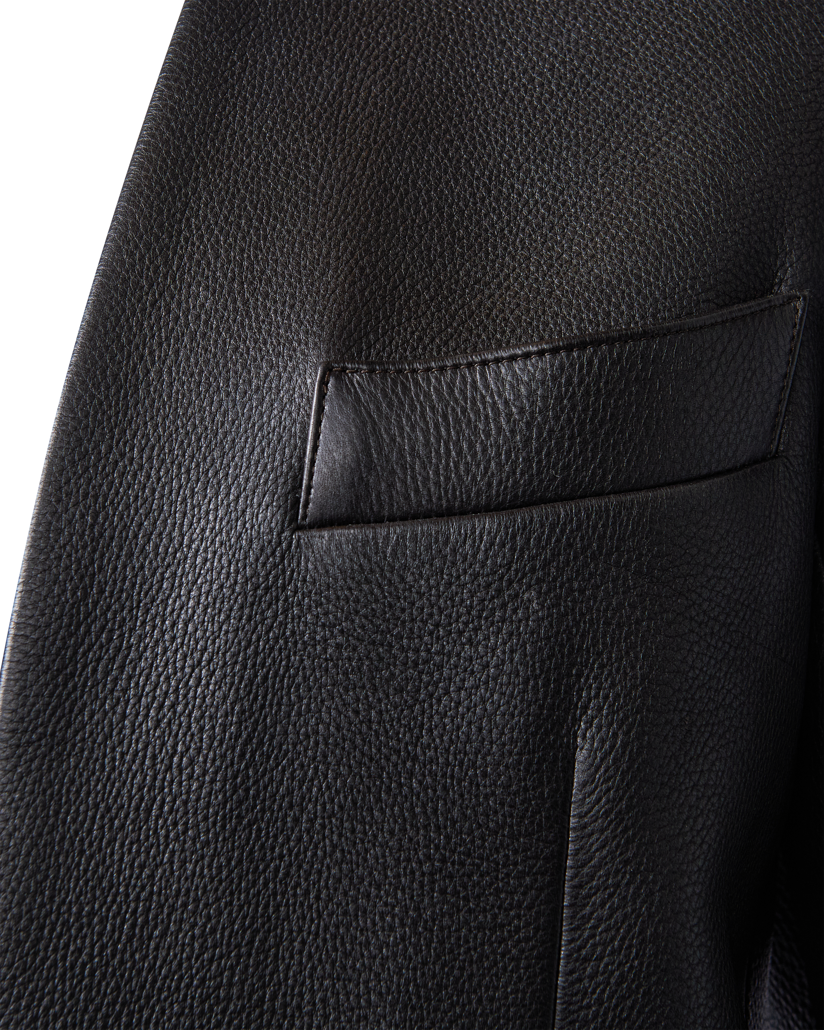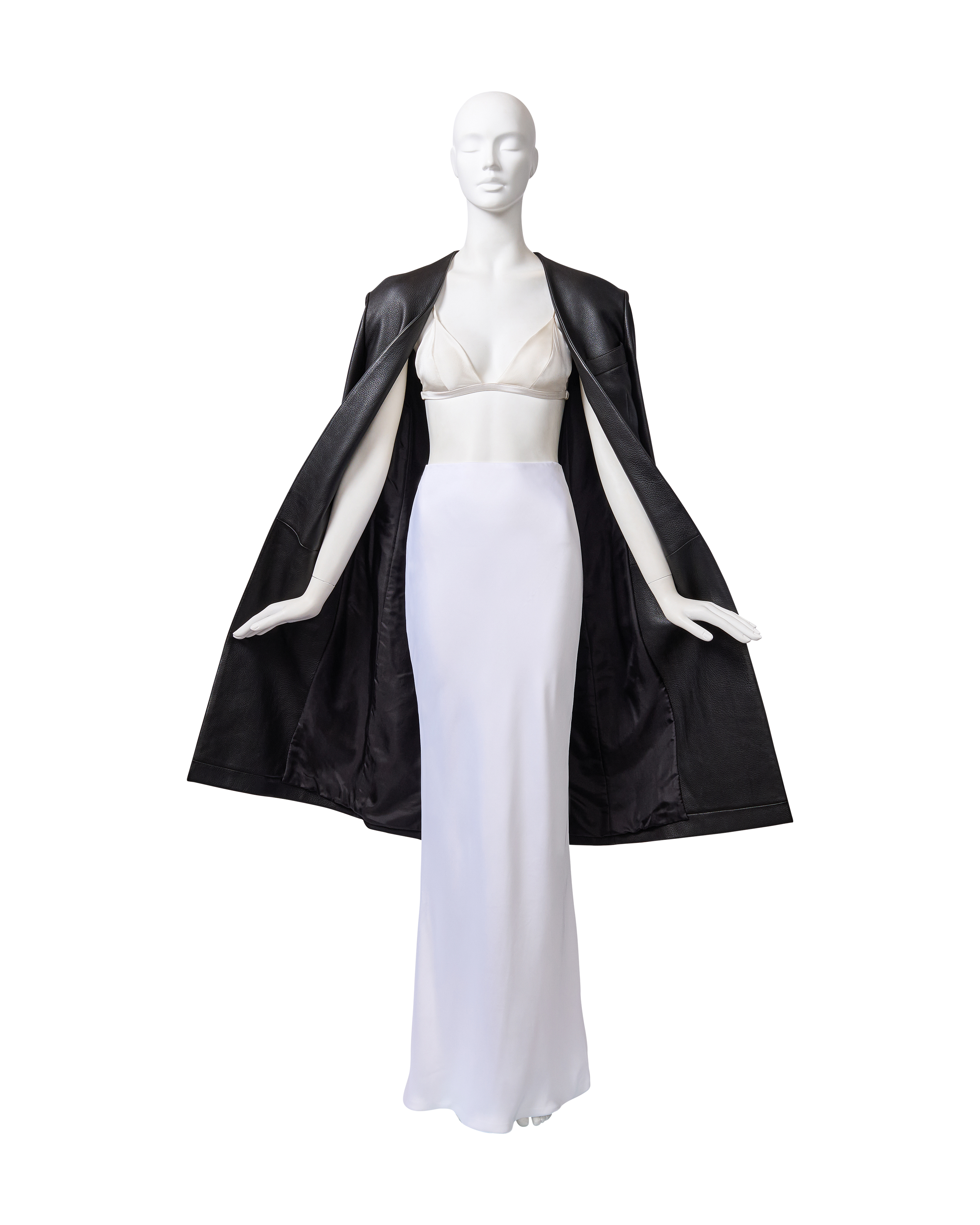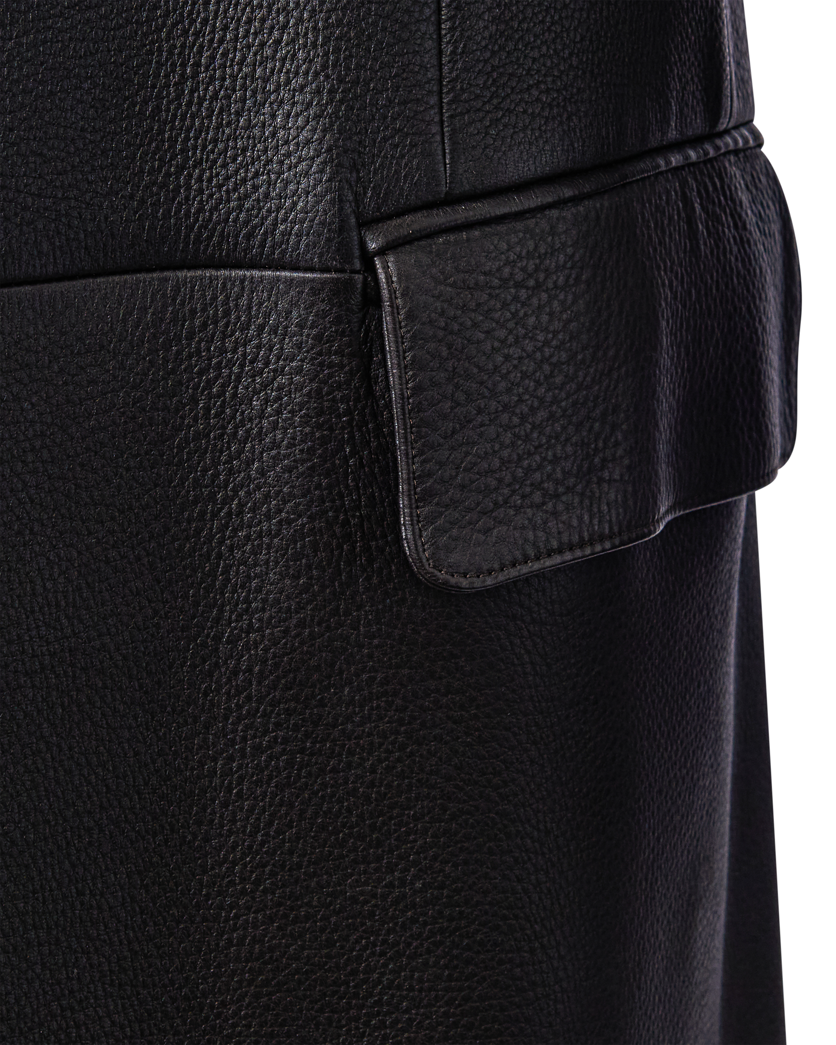 A/W 1998 Hermès by Martin Margiela black leather collarless jacket. Sleek, long sleeve collarless jacket with no closures. Slit pocket detail at left side bust and functional flap pockets at waist. Three button closures at wrist. Fabric Contents: 100% Deer leather with 100% Silk lining (pebbled leather texture). As seen on the runway as the opening look of the collection (Look #1) and in Look #31. In very good vintage condition with light wear at front of jacket (unnoticeable when worn); comes with original garment bag. Note that white skirt and bra top are utilized for e-commerce purposes only and is not included with purchase.