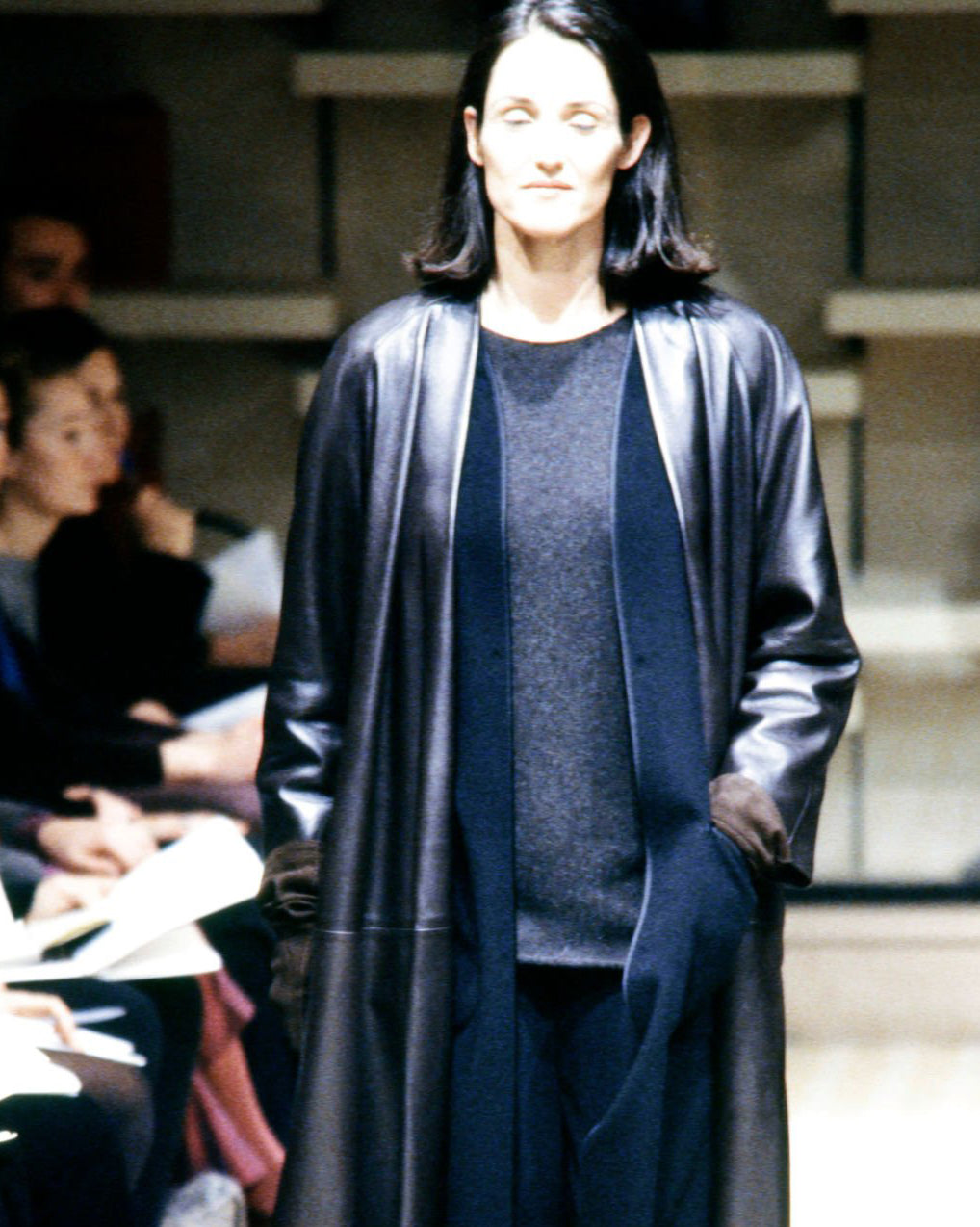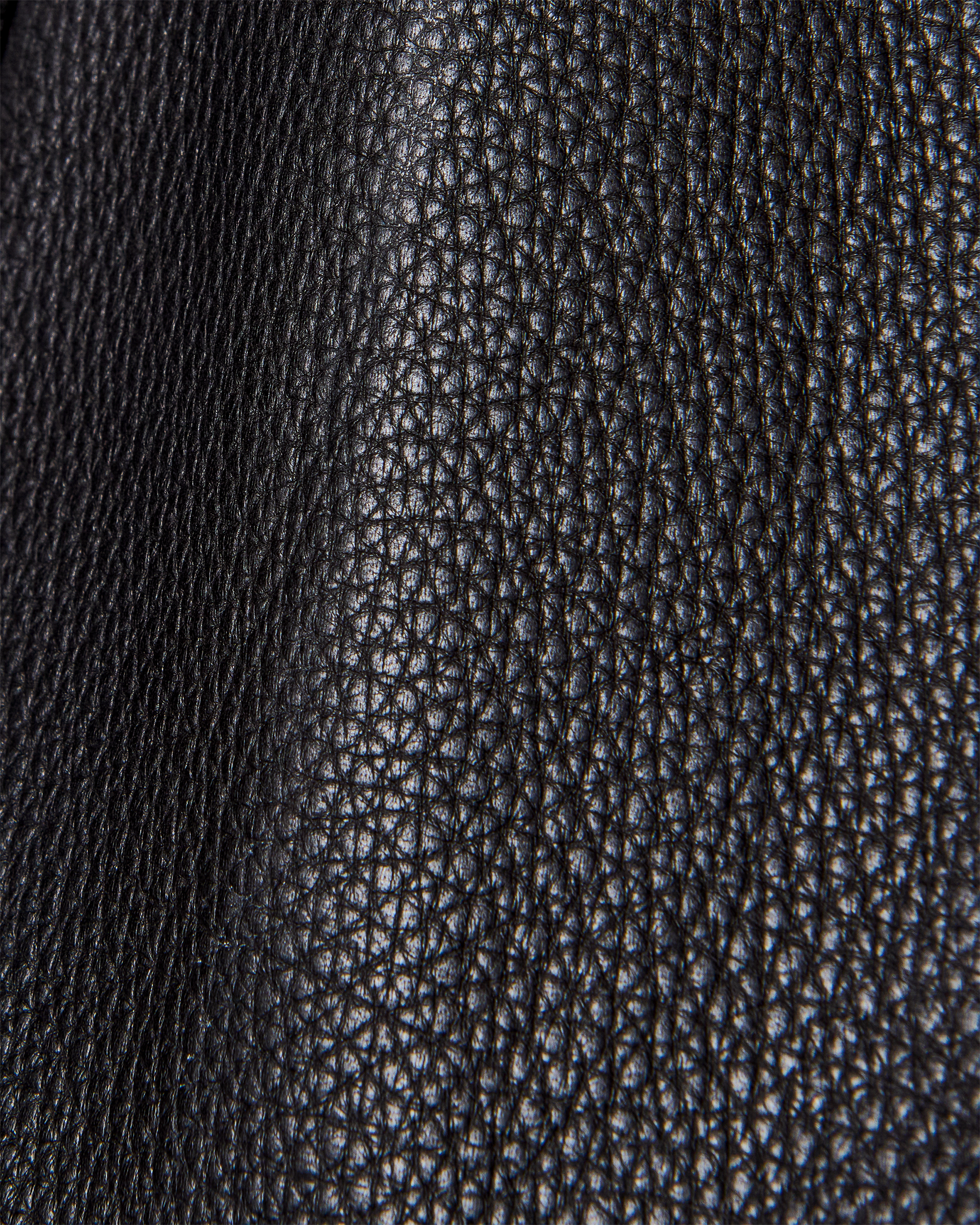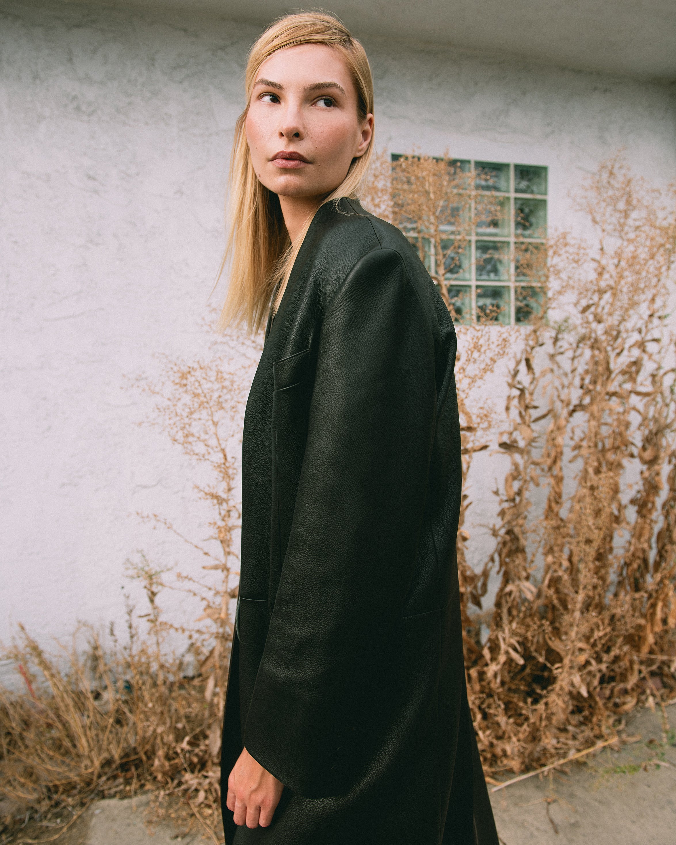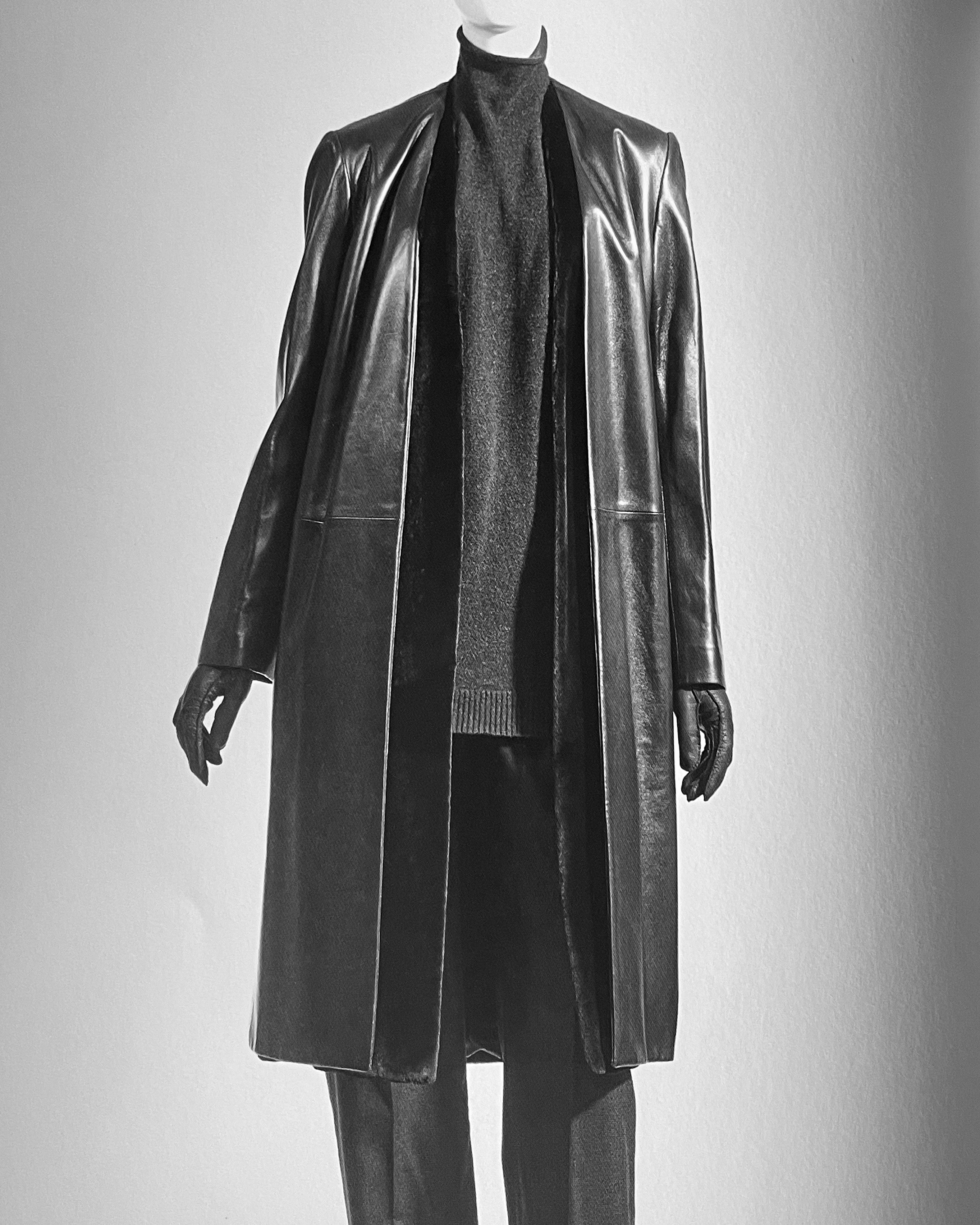 A/W 1998 Hermès by Martin Margiela black leather collarless jacket. Sleek, long sleeve collarless jacket with no closures. Slit pocket detail at left side bust and functional flap pockets at waist. Three button closures at wrist. Fabric Contents: 100% Deer leather with 100% Silk lining (pebbled leather texture). As seen on the runway as the opening look of the collection (Look #1) and in Look #31. In very good vintage condition with light wear at front of jacket (unnoticeable when worn); comes with original garment bag. Note that white skirt and bra top are utilized for e-commerce purposes only and is not included with purchase.
