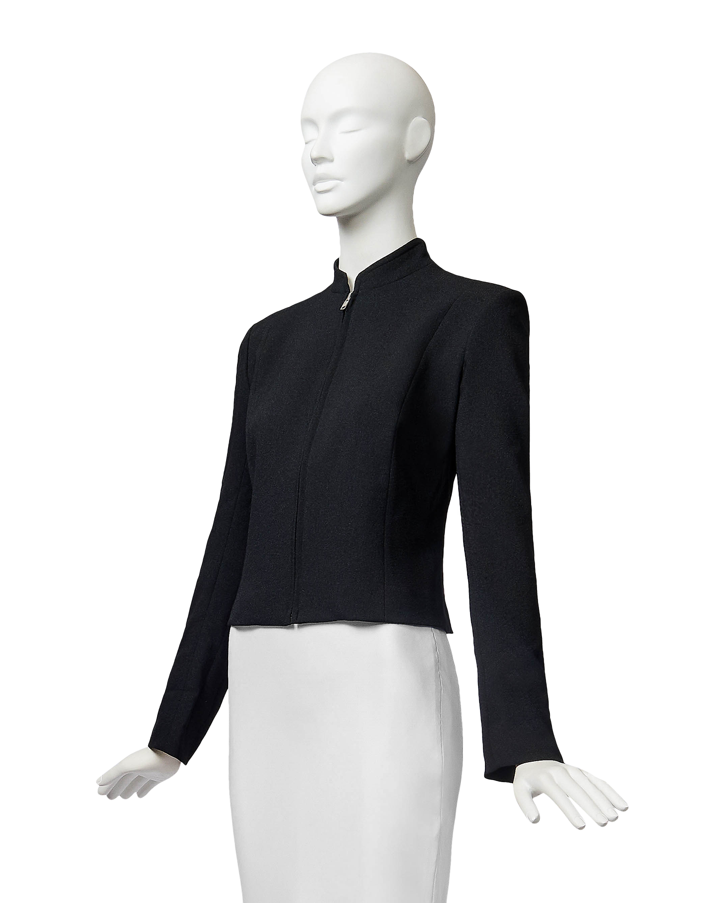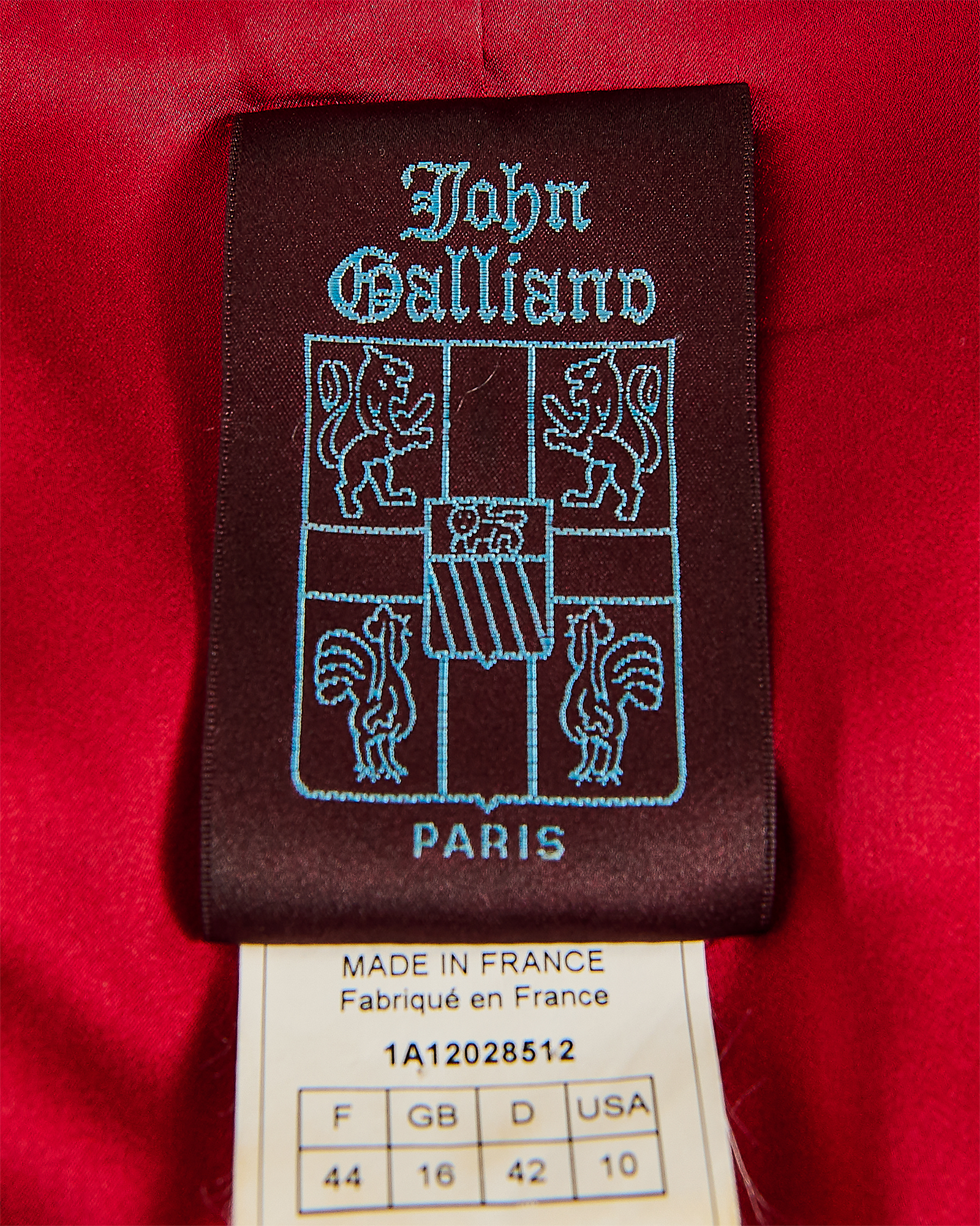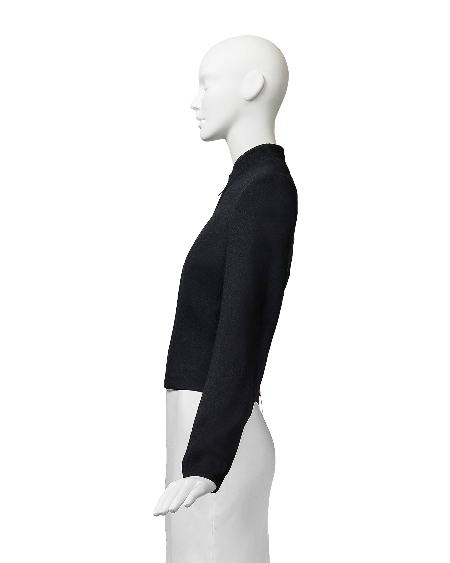 A/W 2001 John Galliano black zip-up jacket with red lace-up back detailing. Long sleeve standing collar jacket featuring silver-tone front zip closure and red ribbon cutout tied lace-up design at center back. Fabric Contents: 100% Polyester with 100% Silk lining. Very minimal padding at shoulders and slightly cropped length. In excellent vintage condition with no flaws to note. White skirt utilized for e-commerce purposes only; not included with purchase.