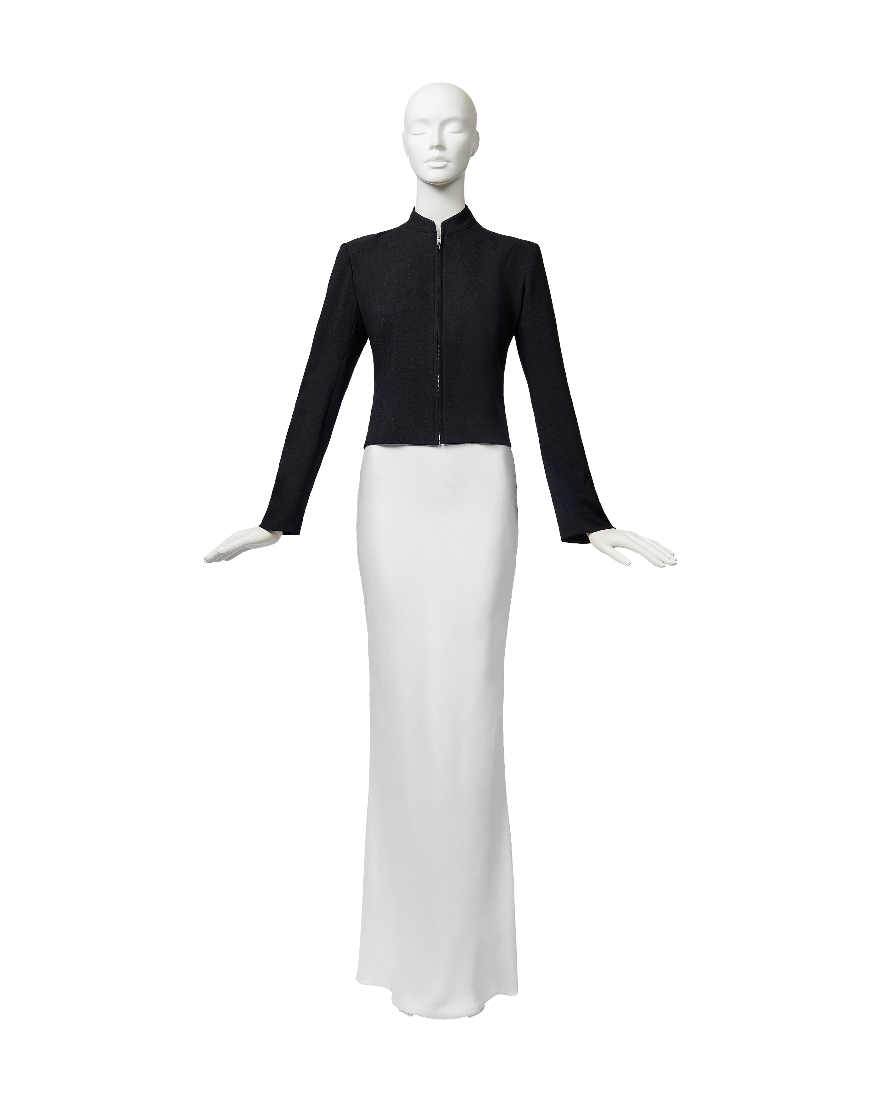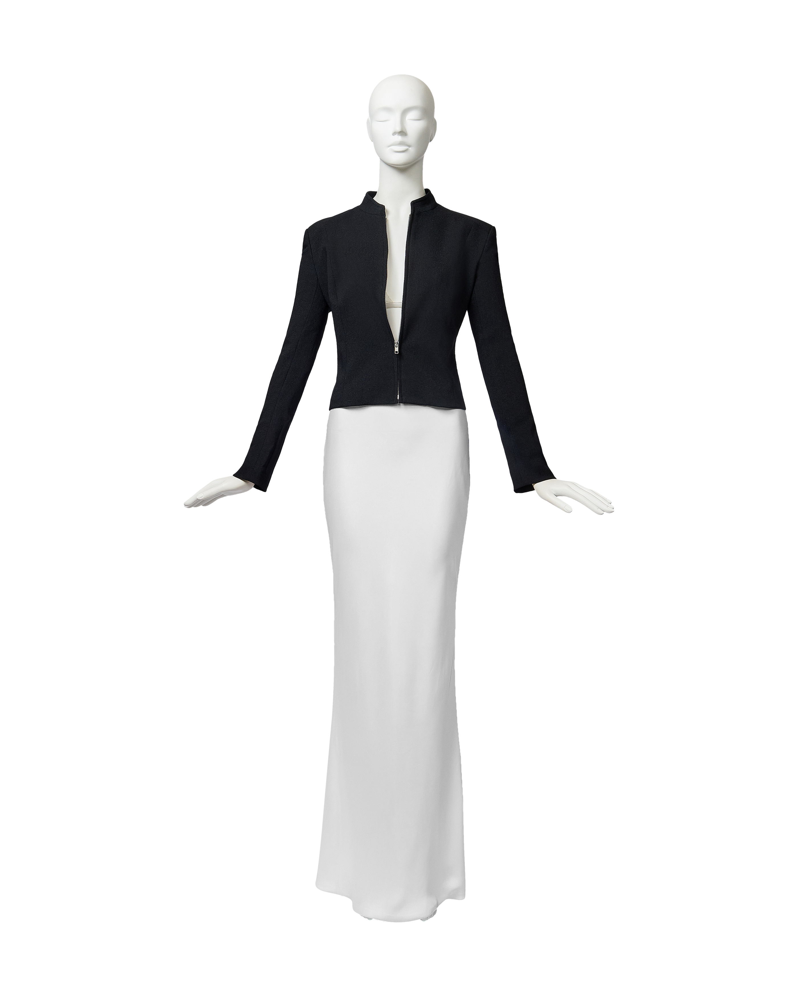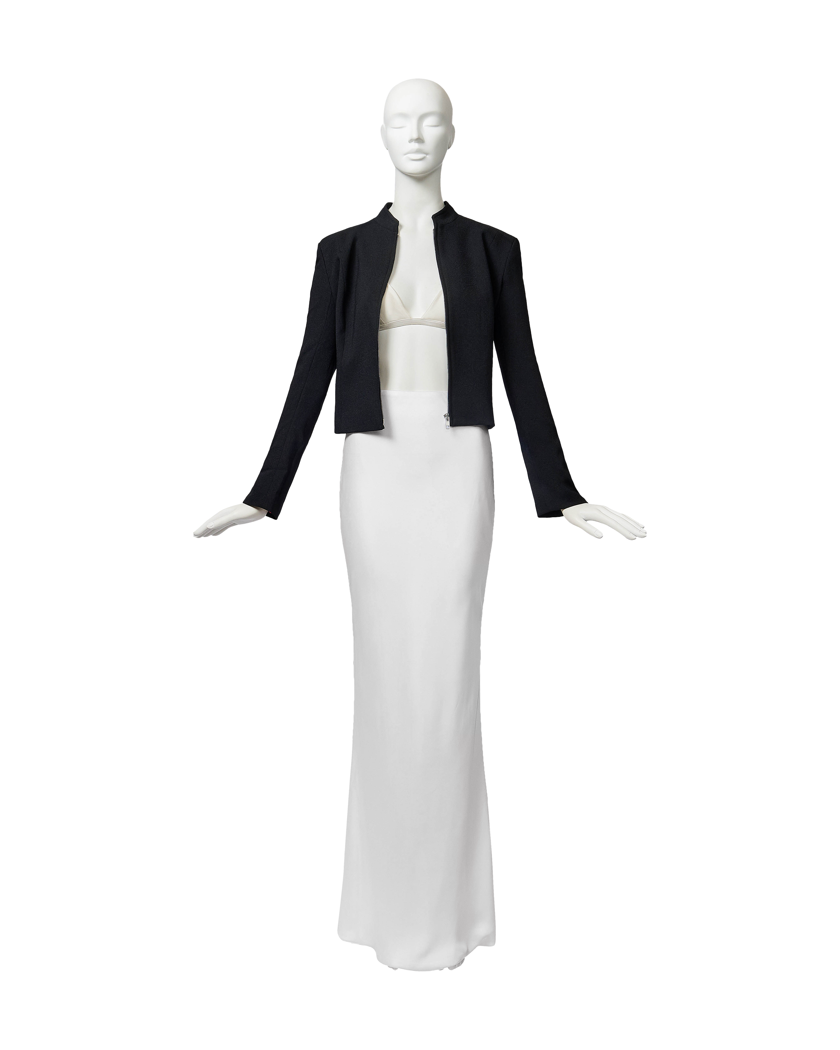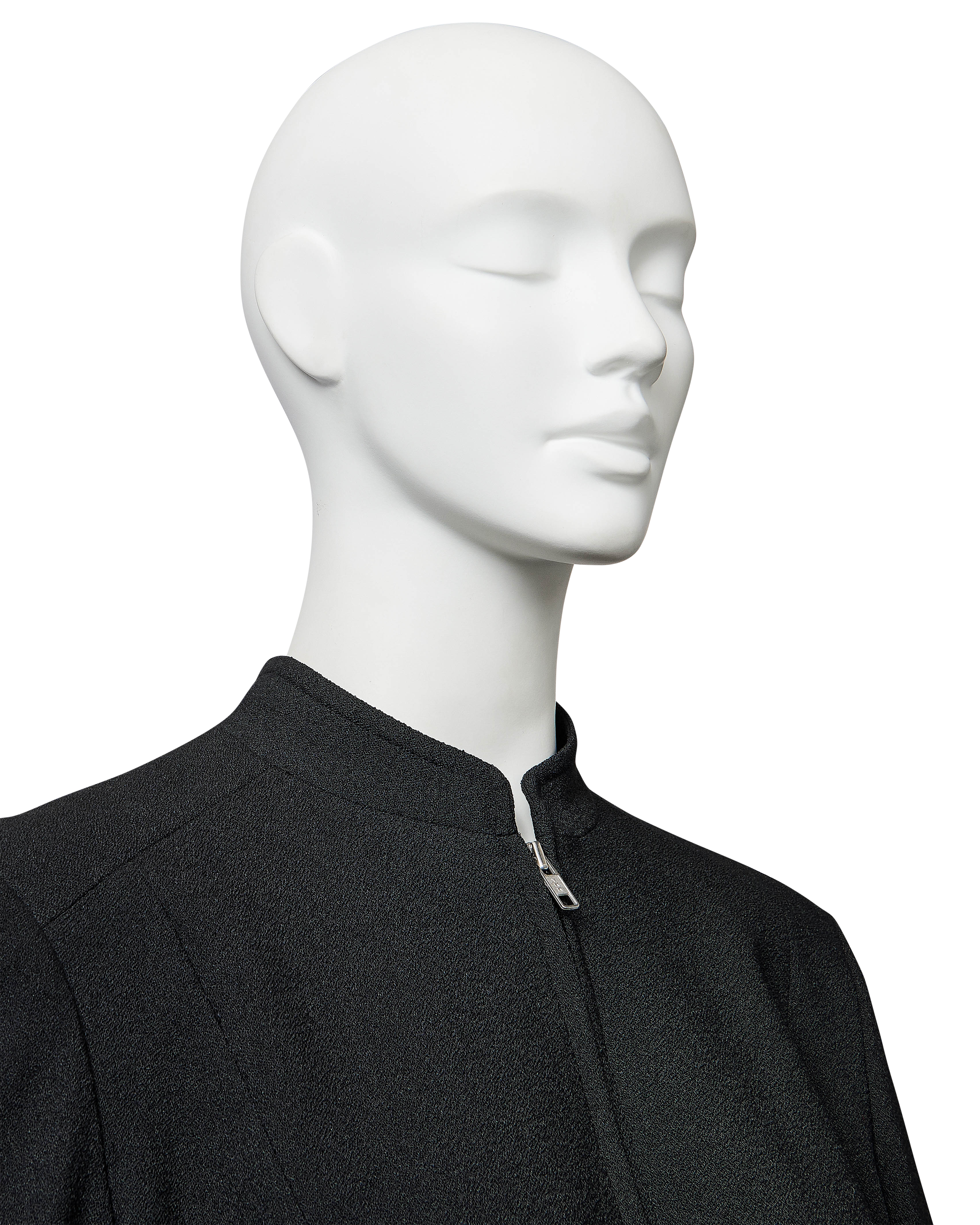 A/W 2001 John Galliano black zip-up jacket with red lace-up back detailing. Long sleeve standing collar jacket featuring silver-tone front zip closure and red ribbon cutout tied lace-up design at center back. Fabric Contents: 100% Polyester with 100% Silk lining. Very minimal padding at shoulders and slightly cropped length. In excellent vintage condition with no flaws to note. White skirt utilized for e-commerce purposes only; not included with purchase.