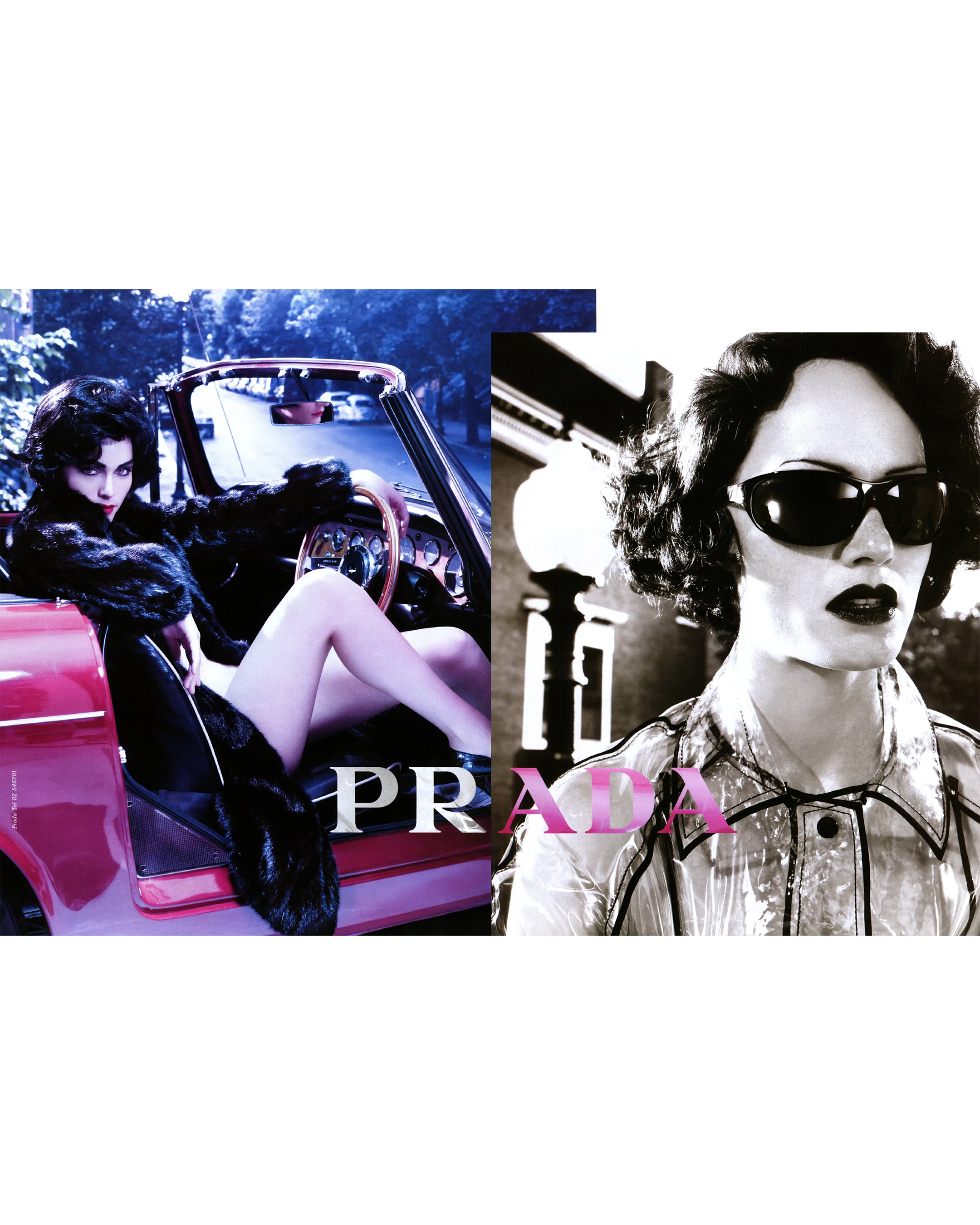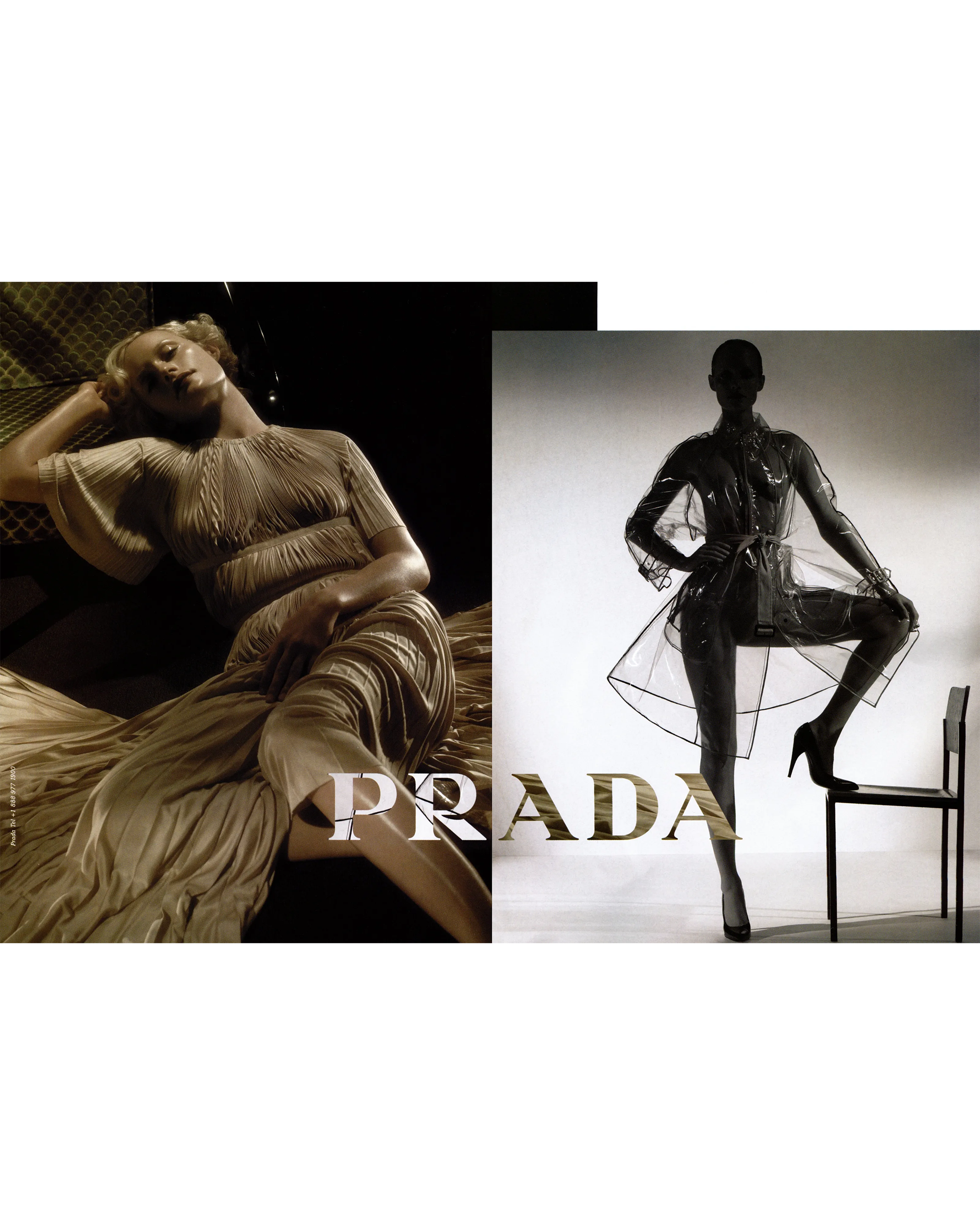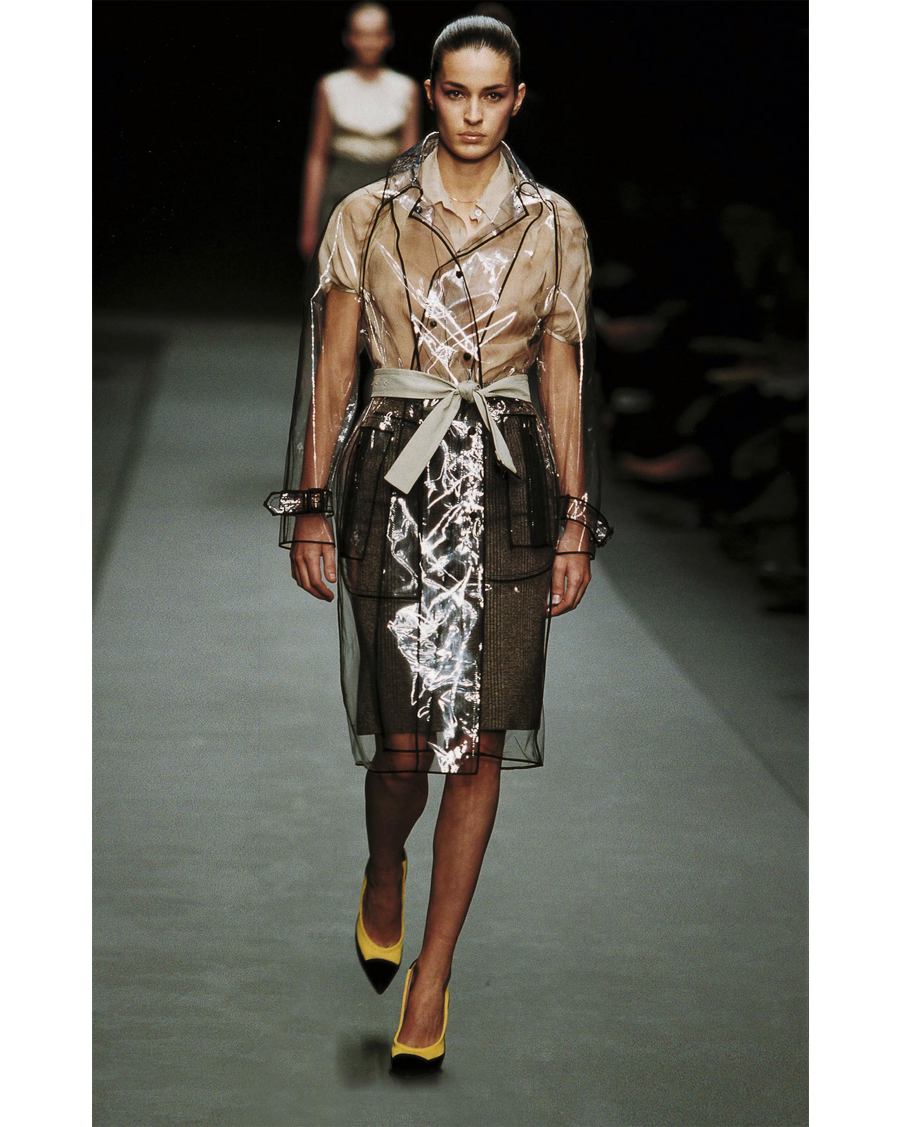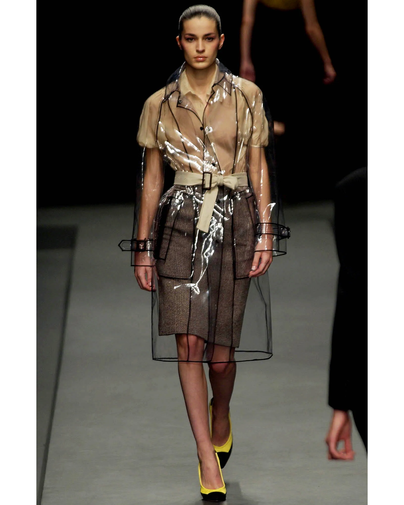 A/W 2002 Prada by Miuccia Prada PVC vinyl and black contrast trim trench coat. Transparent PVC vinyl jacket with contrasting black seams and zip pockets, with removable belt at waist. Pointed collar and front snap closures (backed with olive green on interior as unique Prada detail) with buckle details at cuff. Fabric Contents: 100% Polychloride. As seen on the runway (Look 8) and featured in the ad campaign on Amber Valleta. In very good vintage condition with light wear, faint spots and creasing throughout; slight split at belt; and small re-stitched area at back (professionally repaired by tailor and unnoticeable when worn).