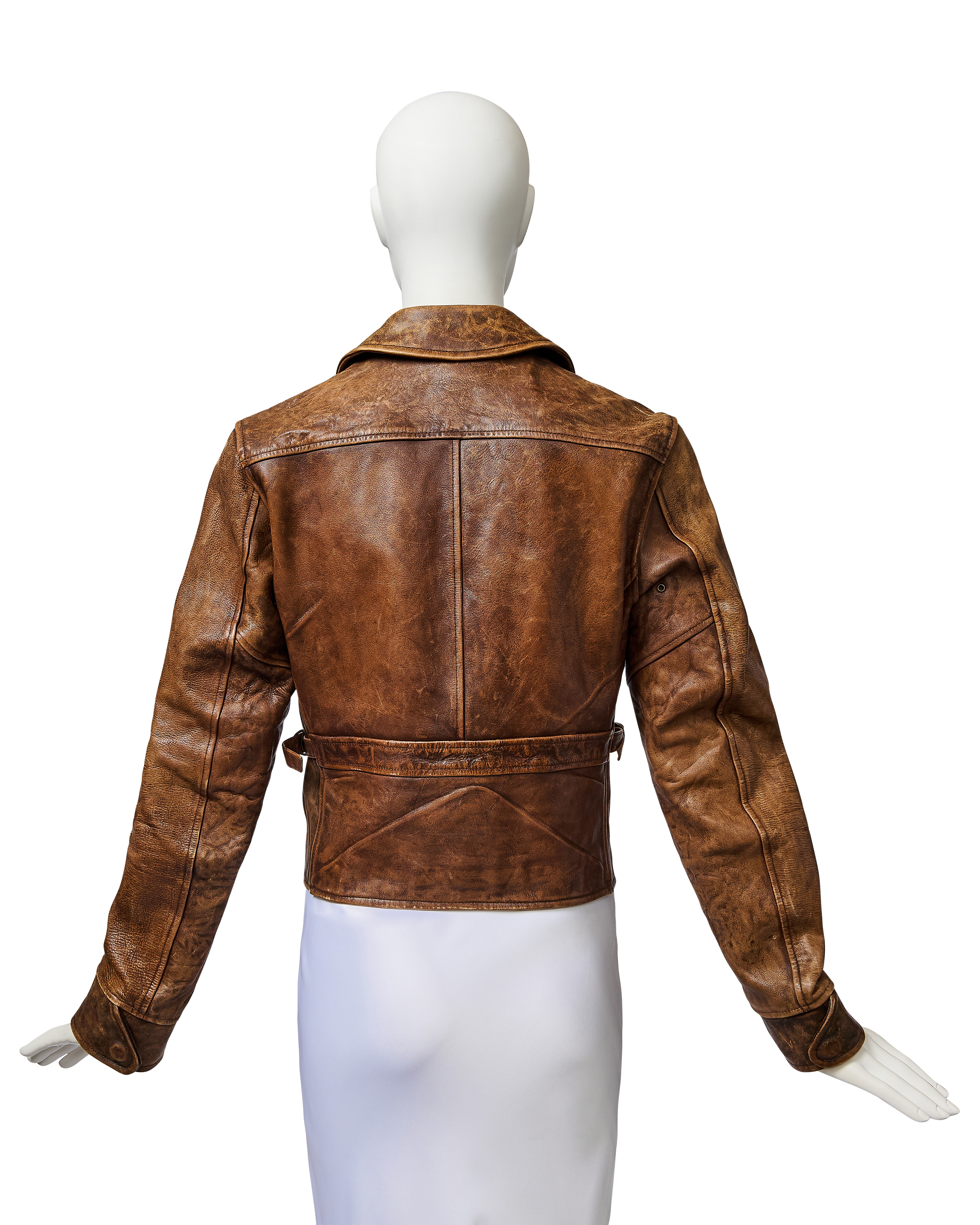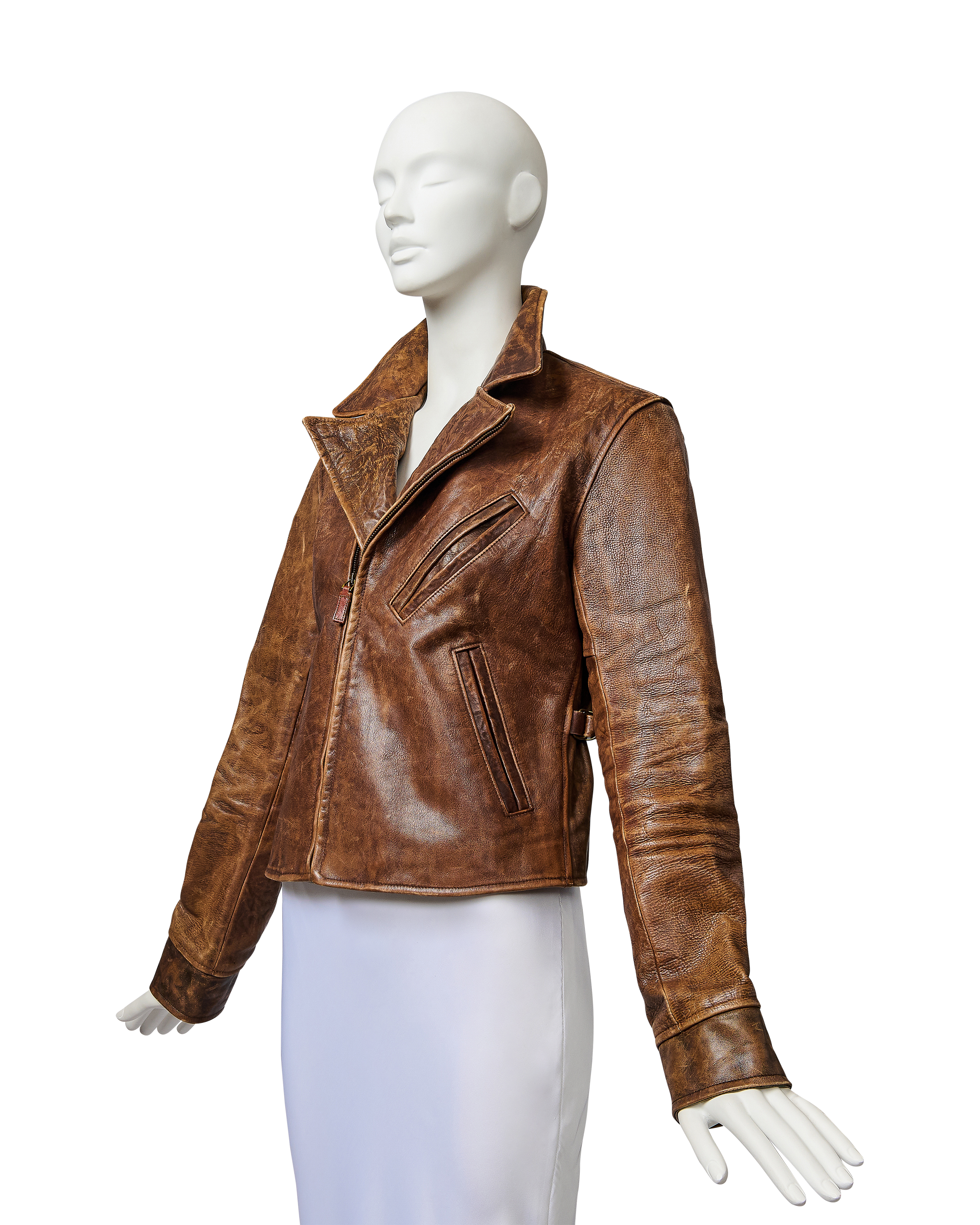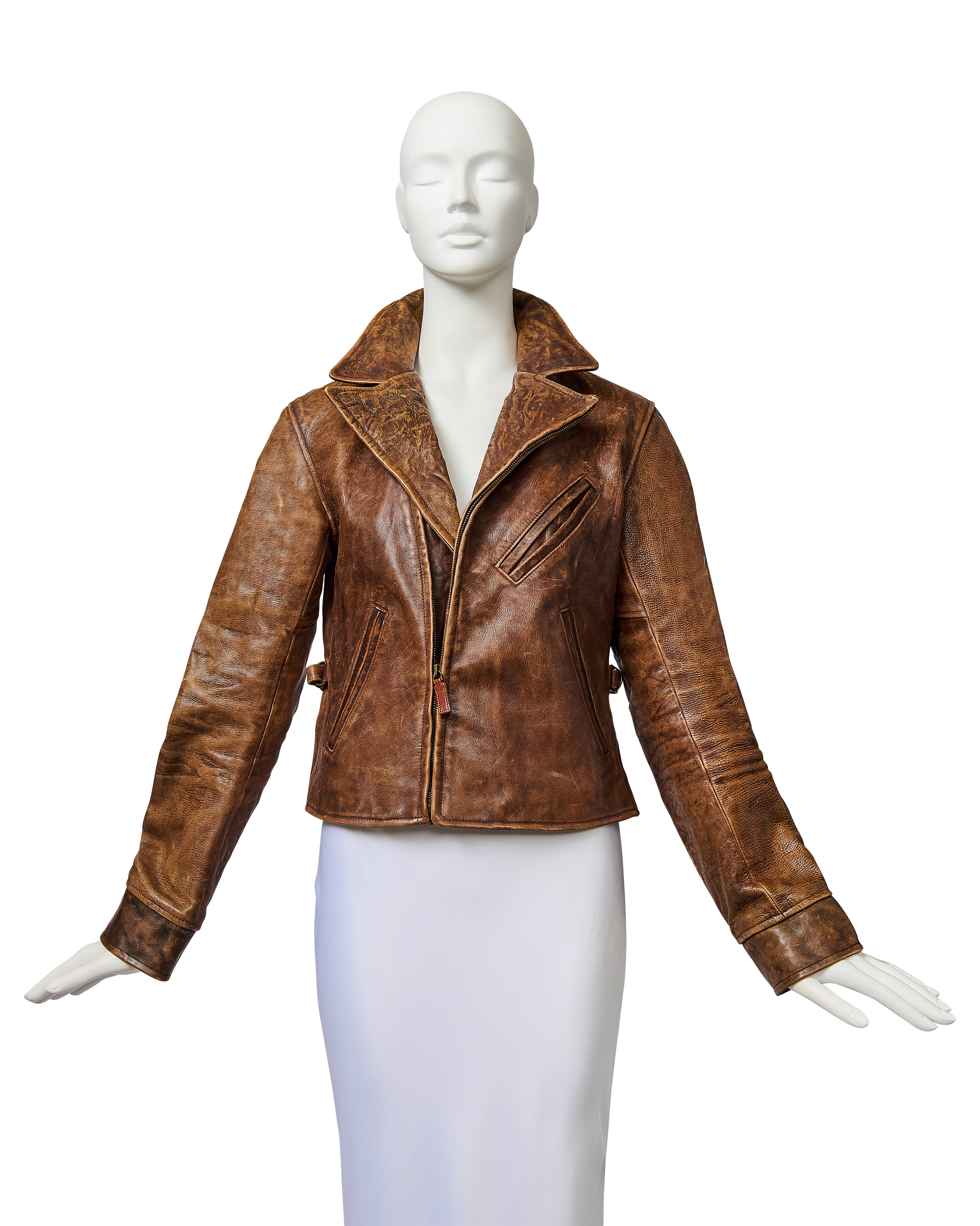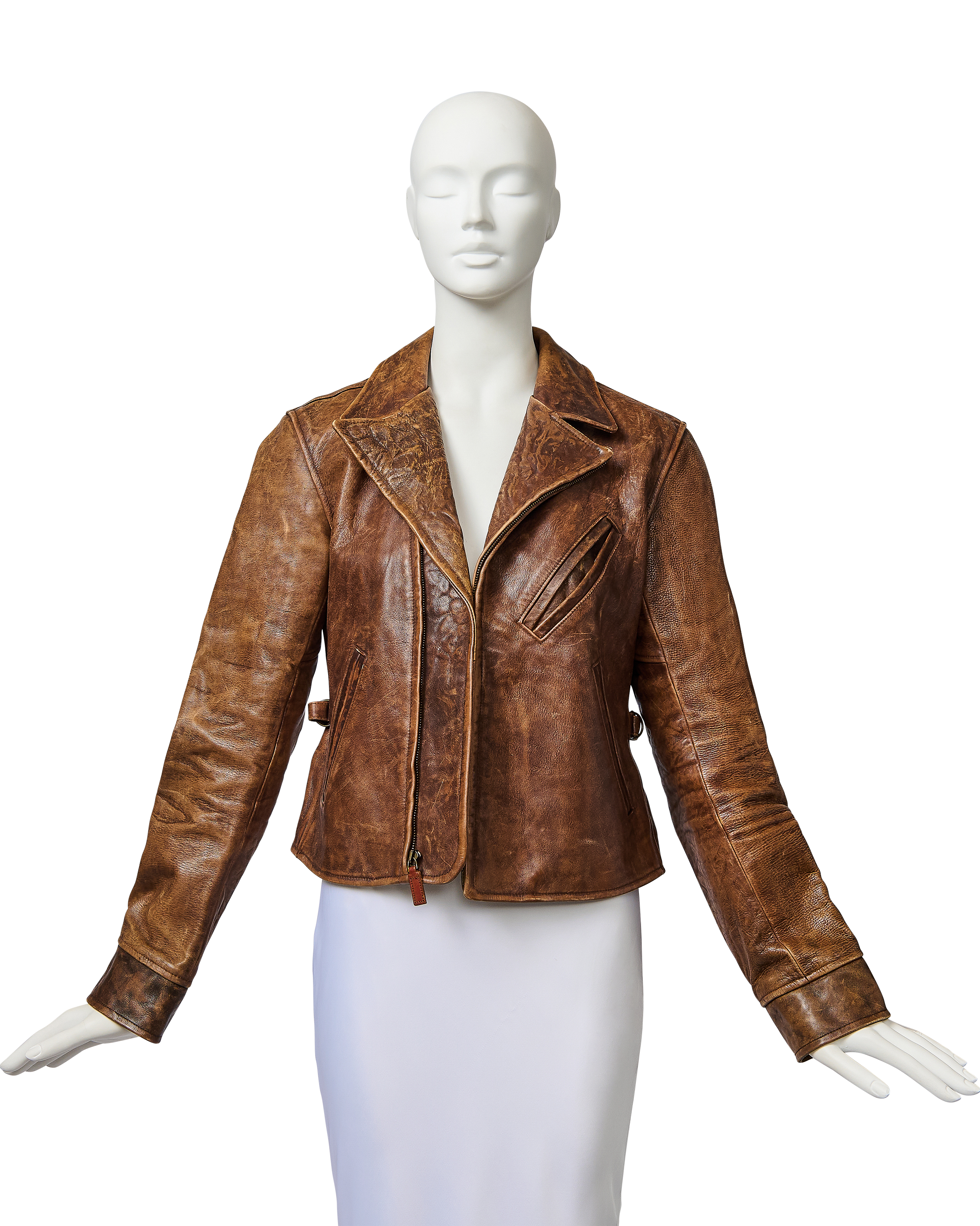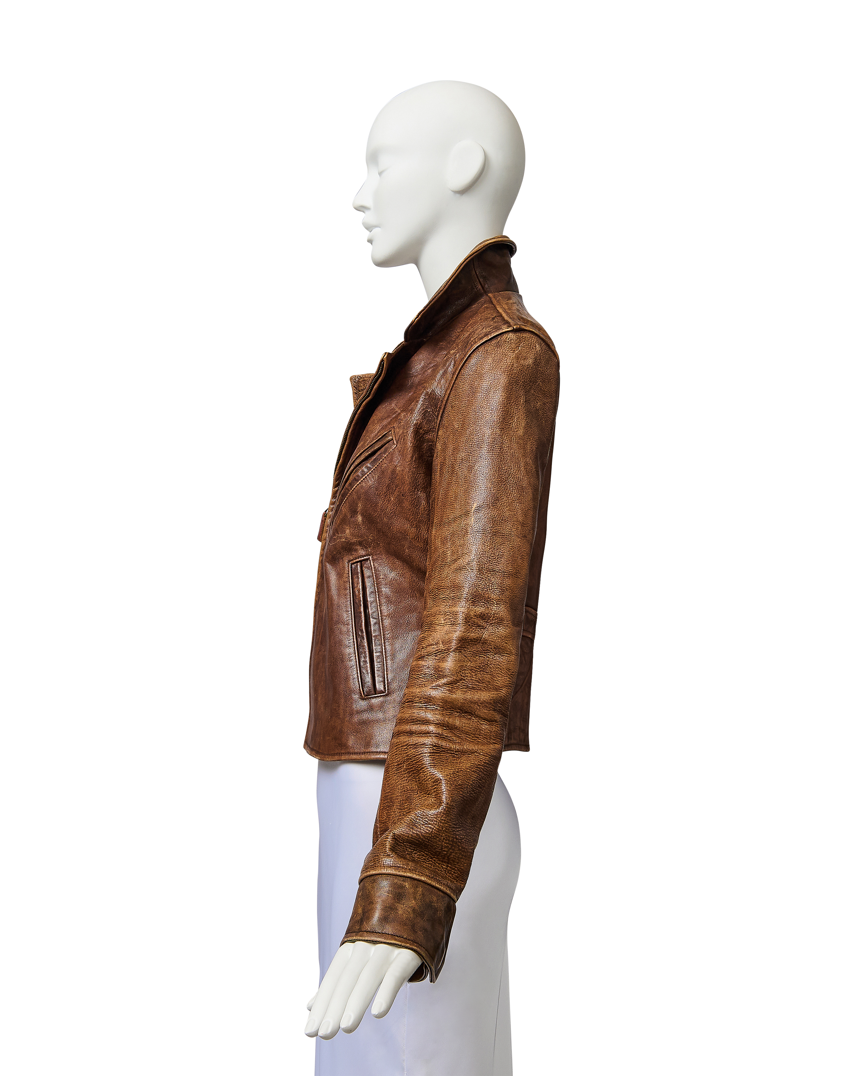 A/W 2003 Ralph Lauren Collection Purple Label brown collared leather jacket. Long sleeve leather collared jacket with slight crop length and slit pocket detailing at waist and bust. Zip-up jacket with intentional distress throughout. Fabric Contents: 100% Leather. As seen on the runway (Look #26). In excellent vintage condition with no flaws to note (intentional stylistic distress throughout).