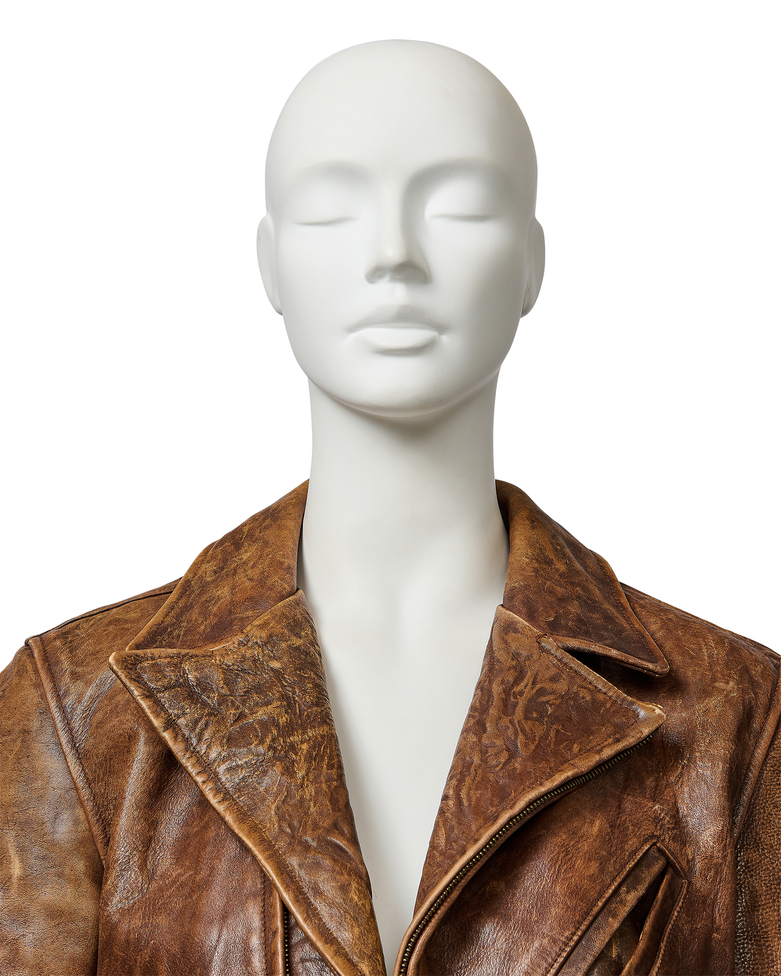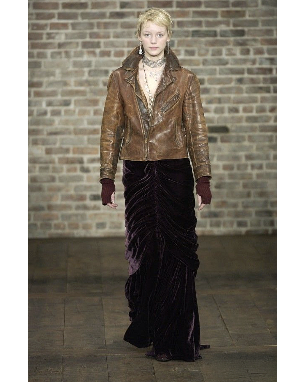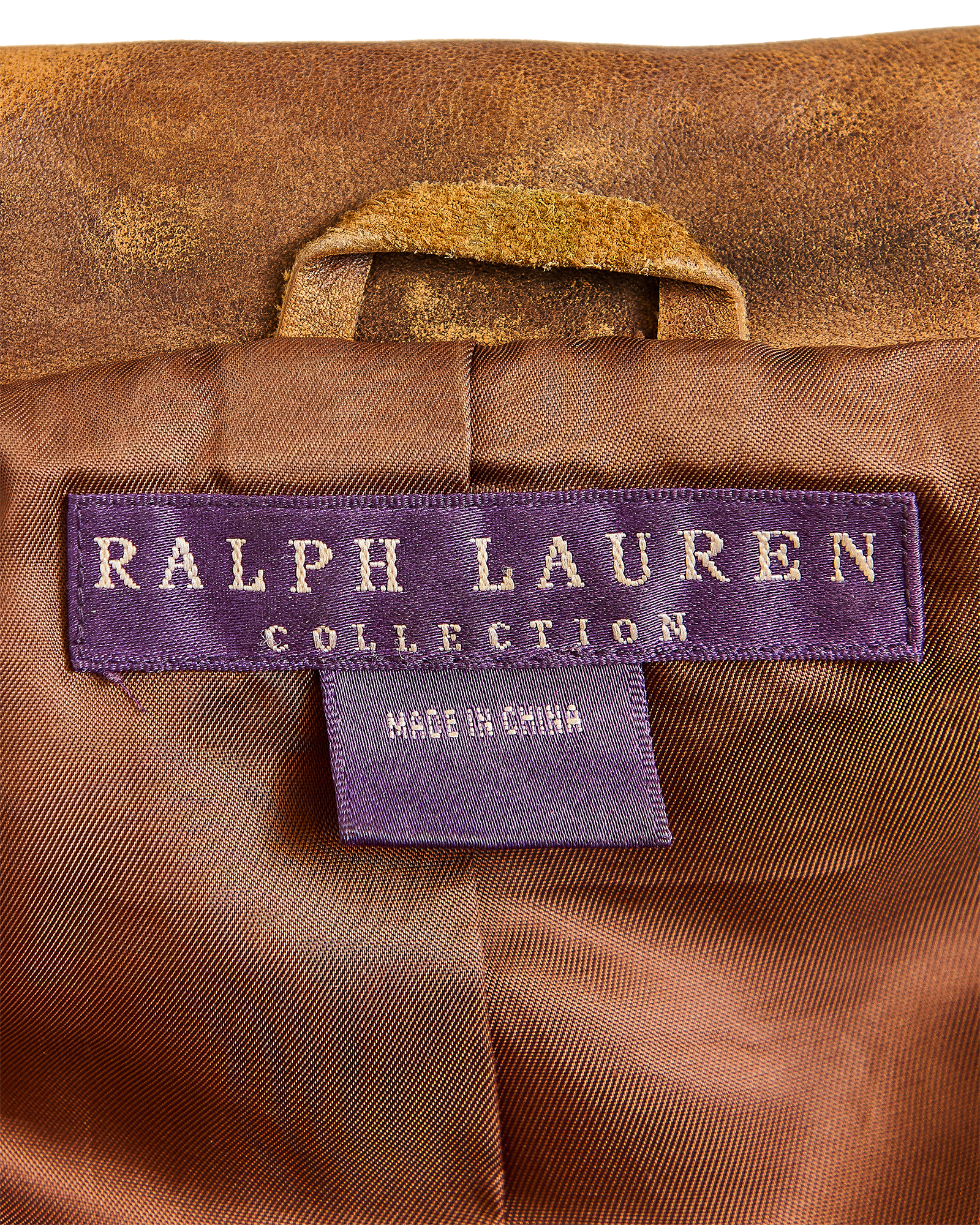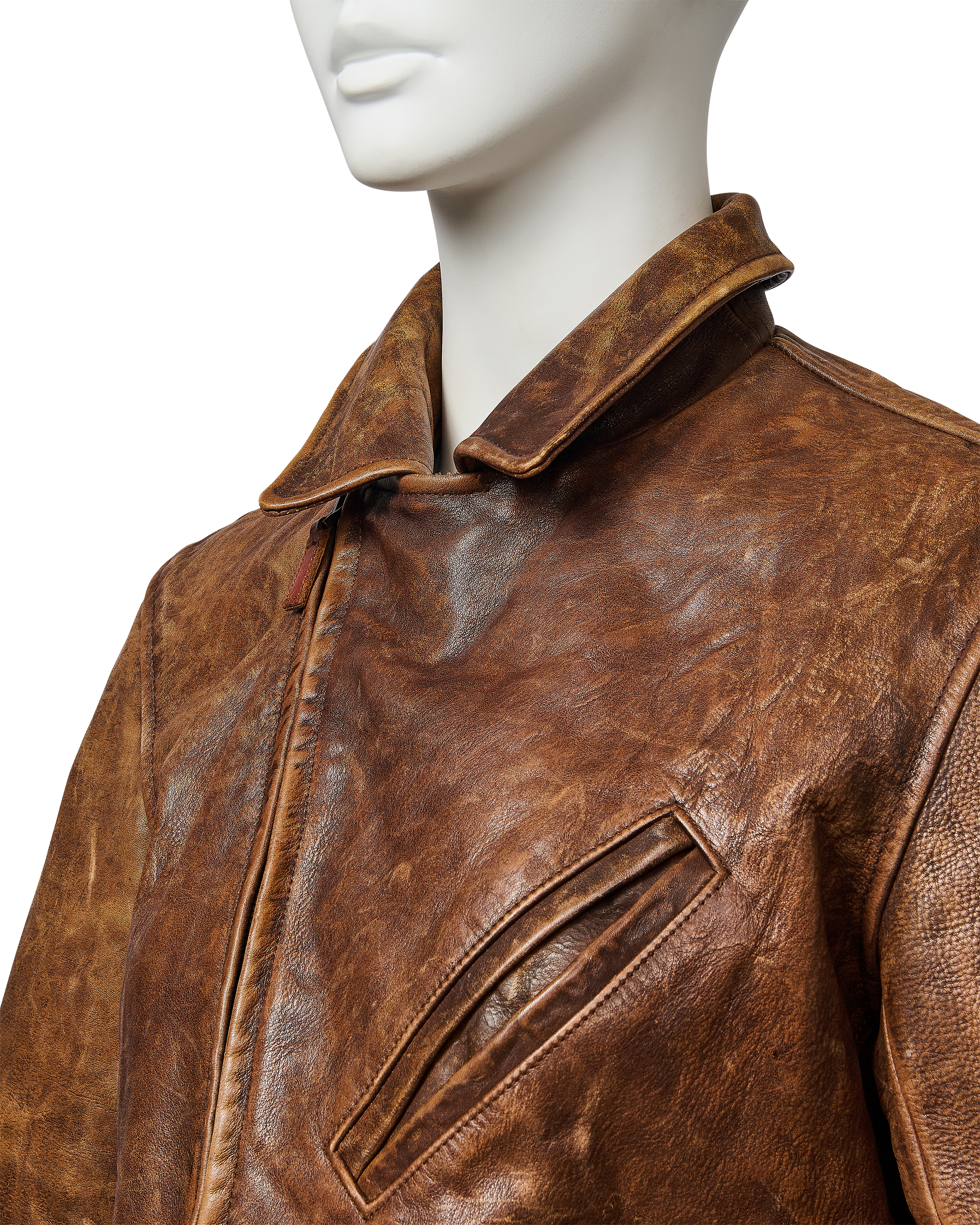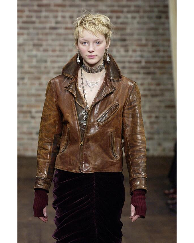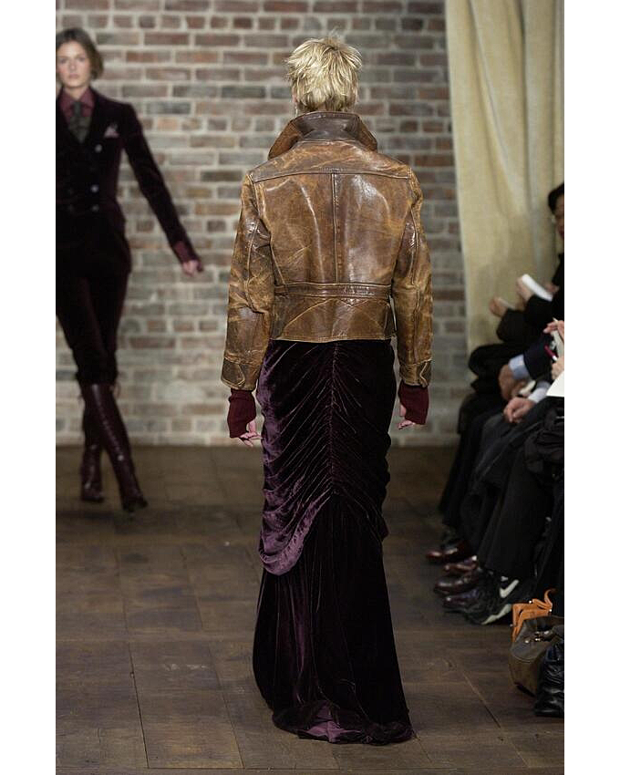 A/W 2003 Ralph Lauren Collection Purple Label brown collared leather jacket. Long sleeve leather collared jacket with slight crop length and slit pocket detailing at waist and bust. Zip-up jacket with intentional distress throughout. Fabric Contents: 100% Leather. As seen on the runway (Look #26). In excellent vintage condition with no flaws to note (intentional stylistic distress throughout).