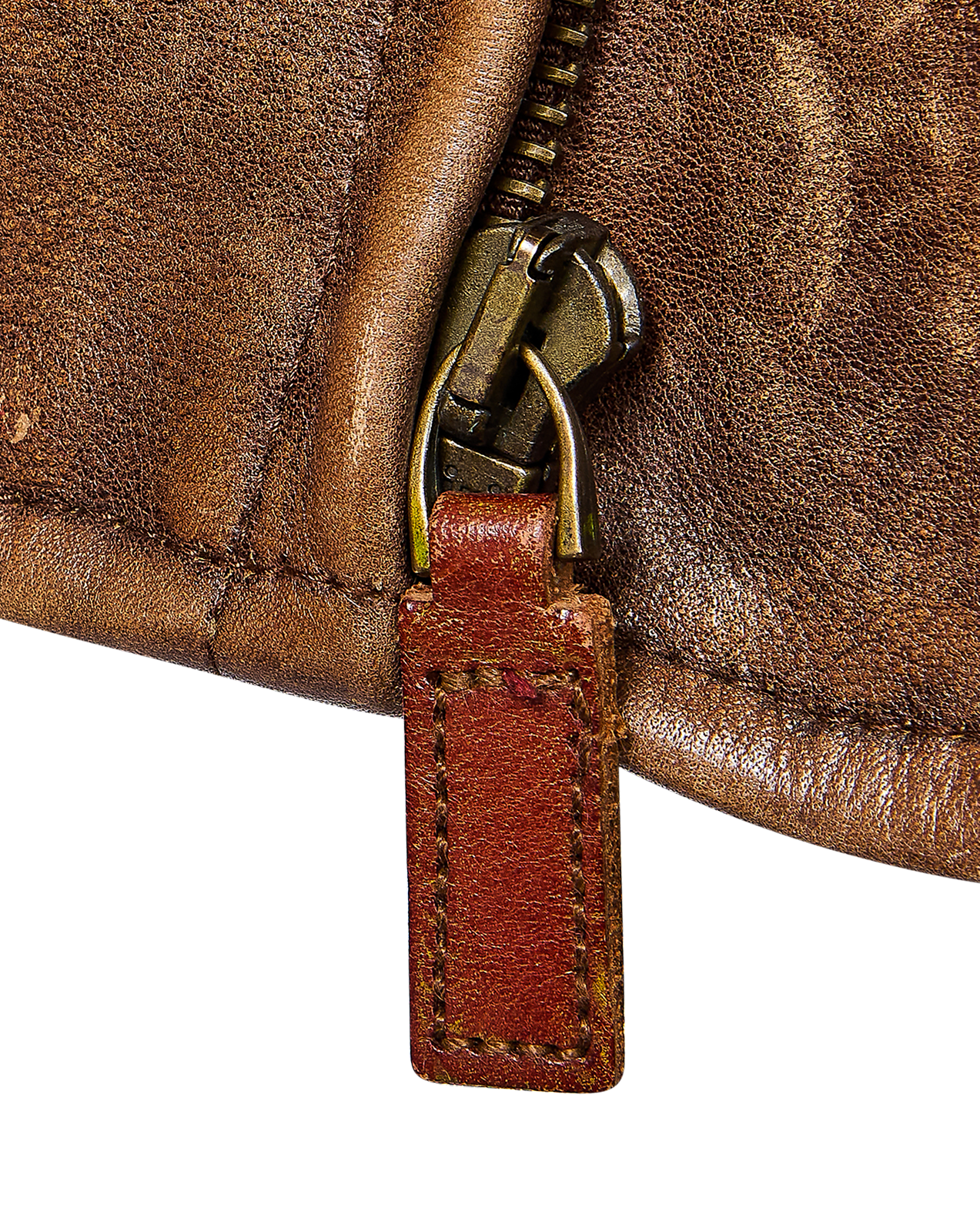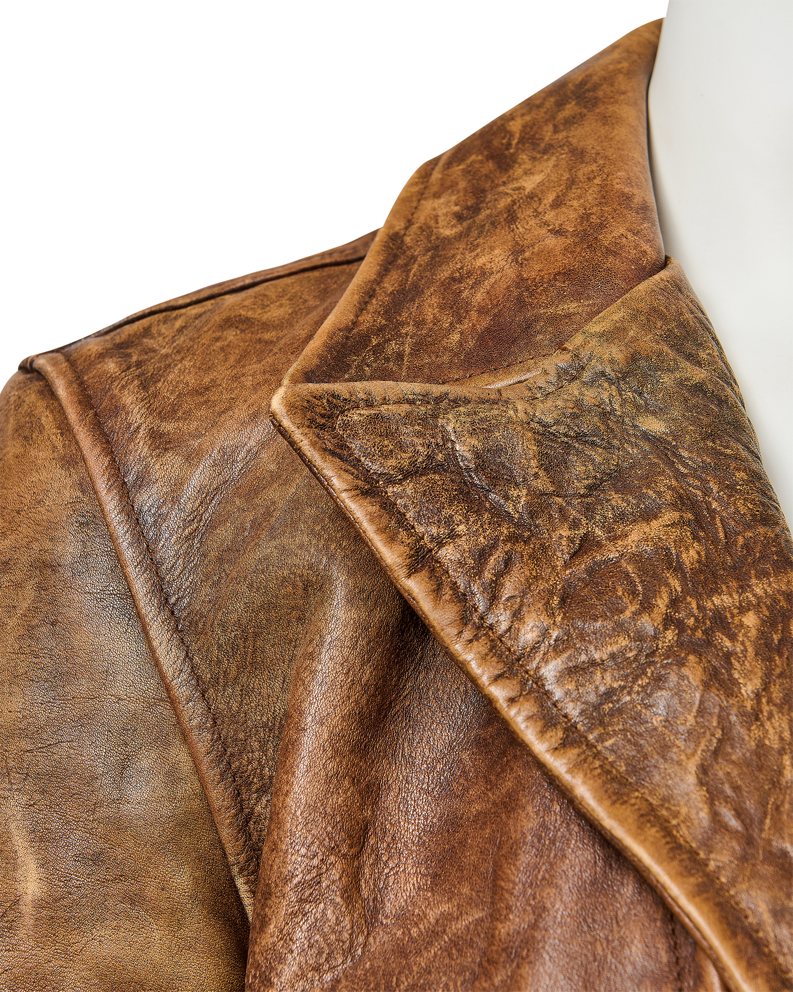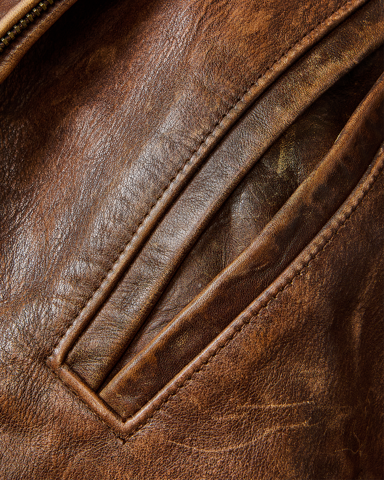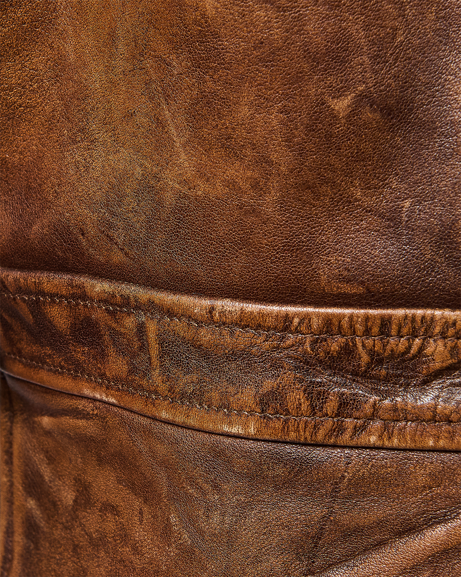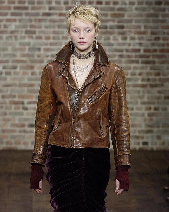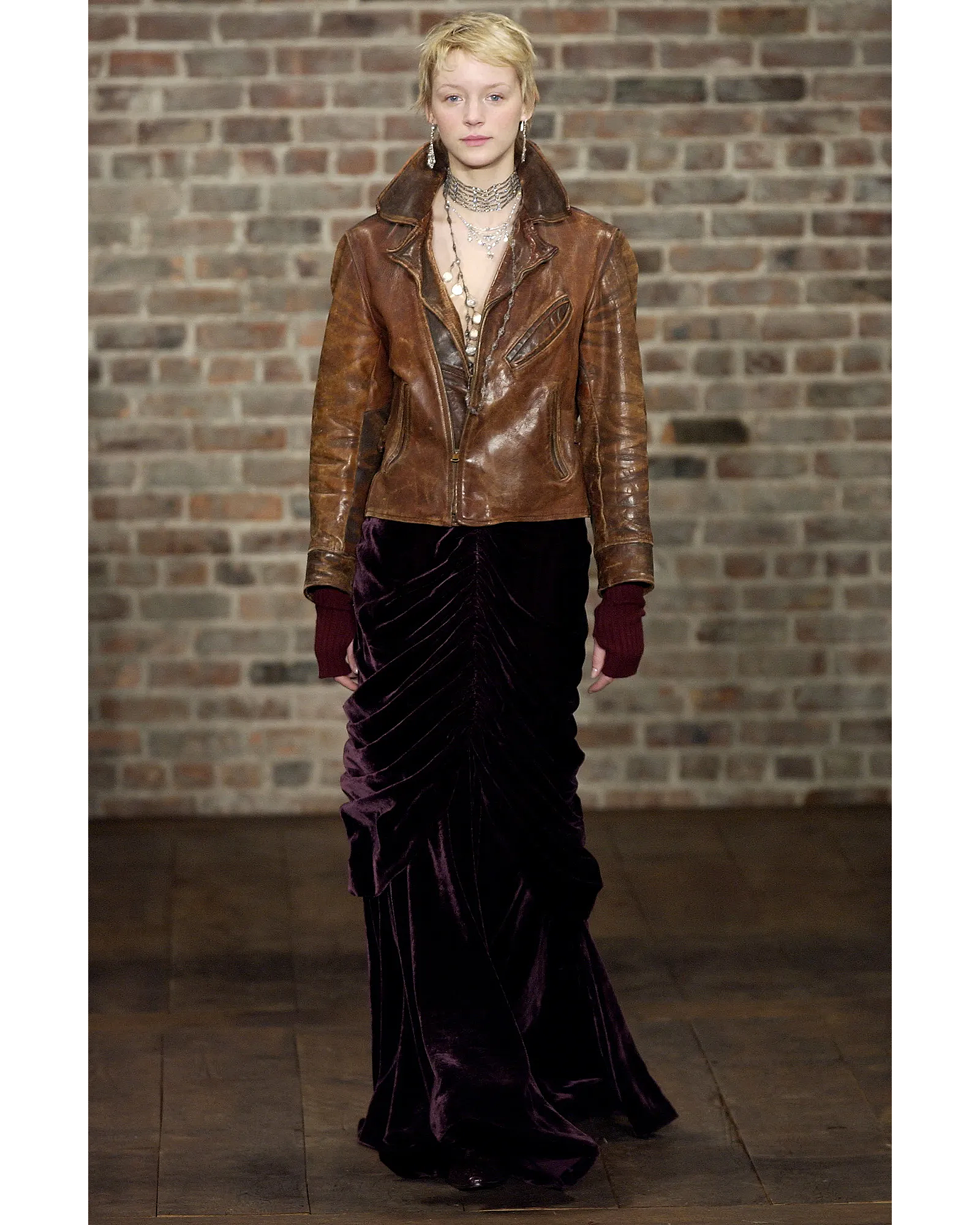 A/W 2003 Ralph Lauren Collection Purple Label brown collared leather jacket. Long sleeve leather collared jacket with slight crop length and slit pocket detailing at waist and bust. Zip-up jacket with intentional distress throughout. Fabric Contents: 100% Leather. As seen on the runway (Look #26). In excellent vintage condition with no flaws to note (intentional stylistic distress throughout).