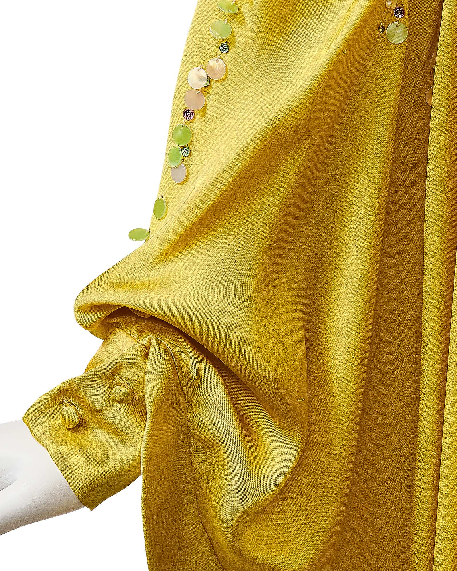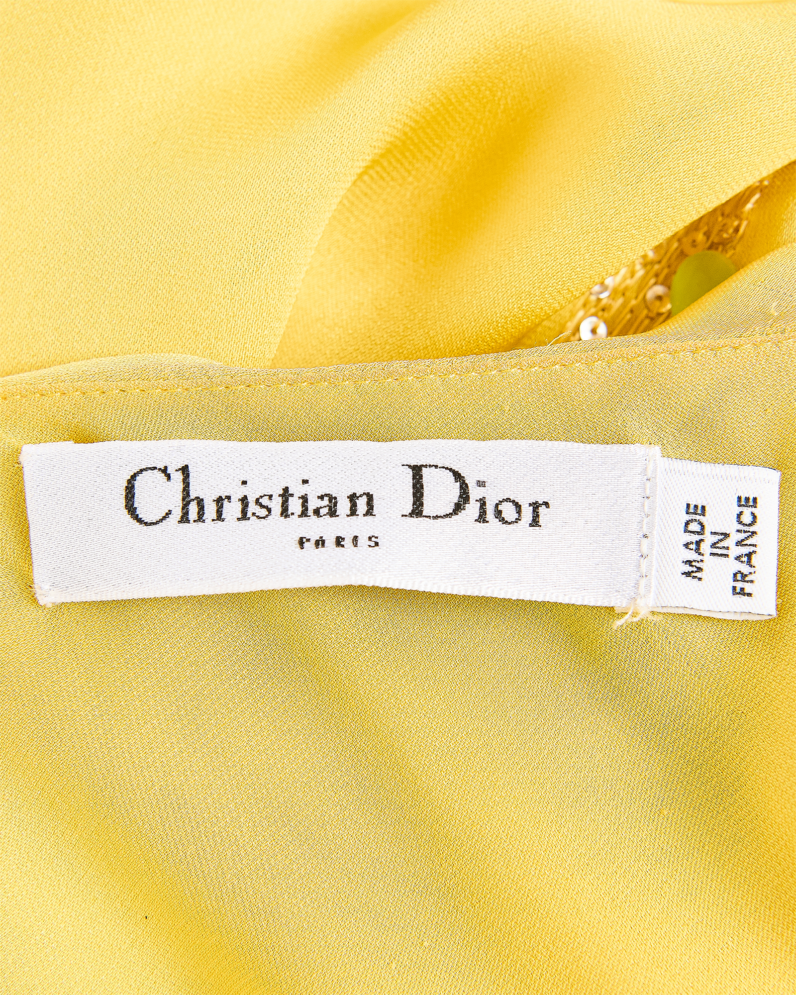 Resort 2008 Christian Dior by John Galliano one-shoulder drape gown with paillette embellishments at shoulder / sleeve. Single long sleeve with drape silhouette at shoulder. Fabric Contents: 100% Silk with 100% Silk lining and Glass and Rayon embroidery. Concealed side zip closure, with two small button closures at wrist of sleeve. Moderate side slit that reveals interior slip and creates stunning movement when worn. In very good vintage condition with light pink spotting throughout, particularly at upper back of dress and at sleeve (very faintly noticeable when worn); very slight runs that are unnoticeable unless upon close inspection. As seen on the runway. Necklace from runway in alternate colorway available for purchase separately via link here (NOT included with purchase of dress).