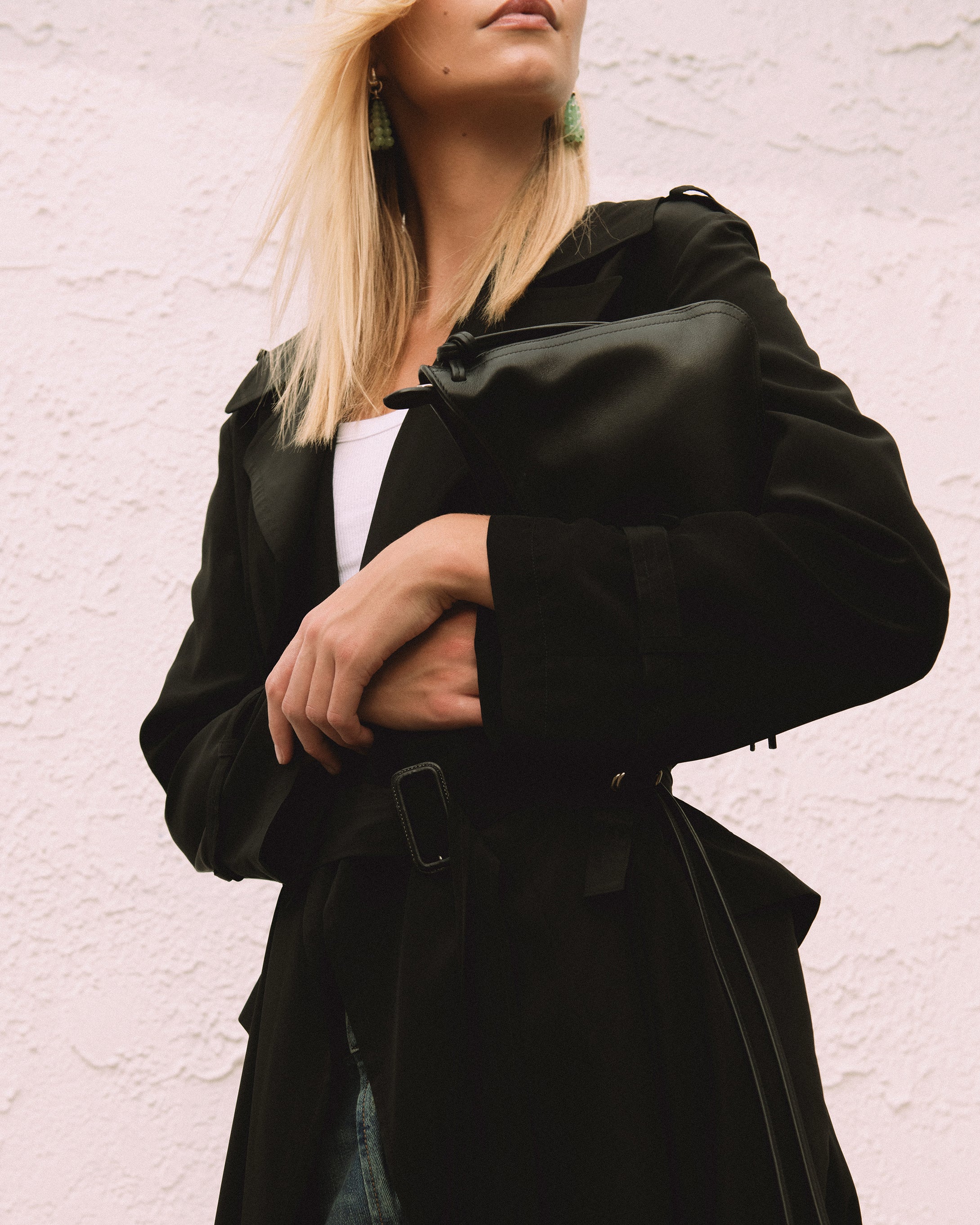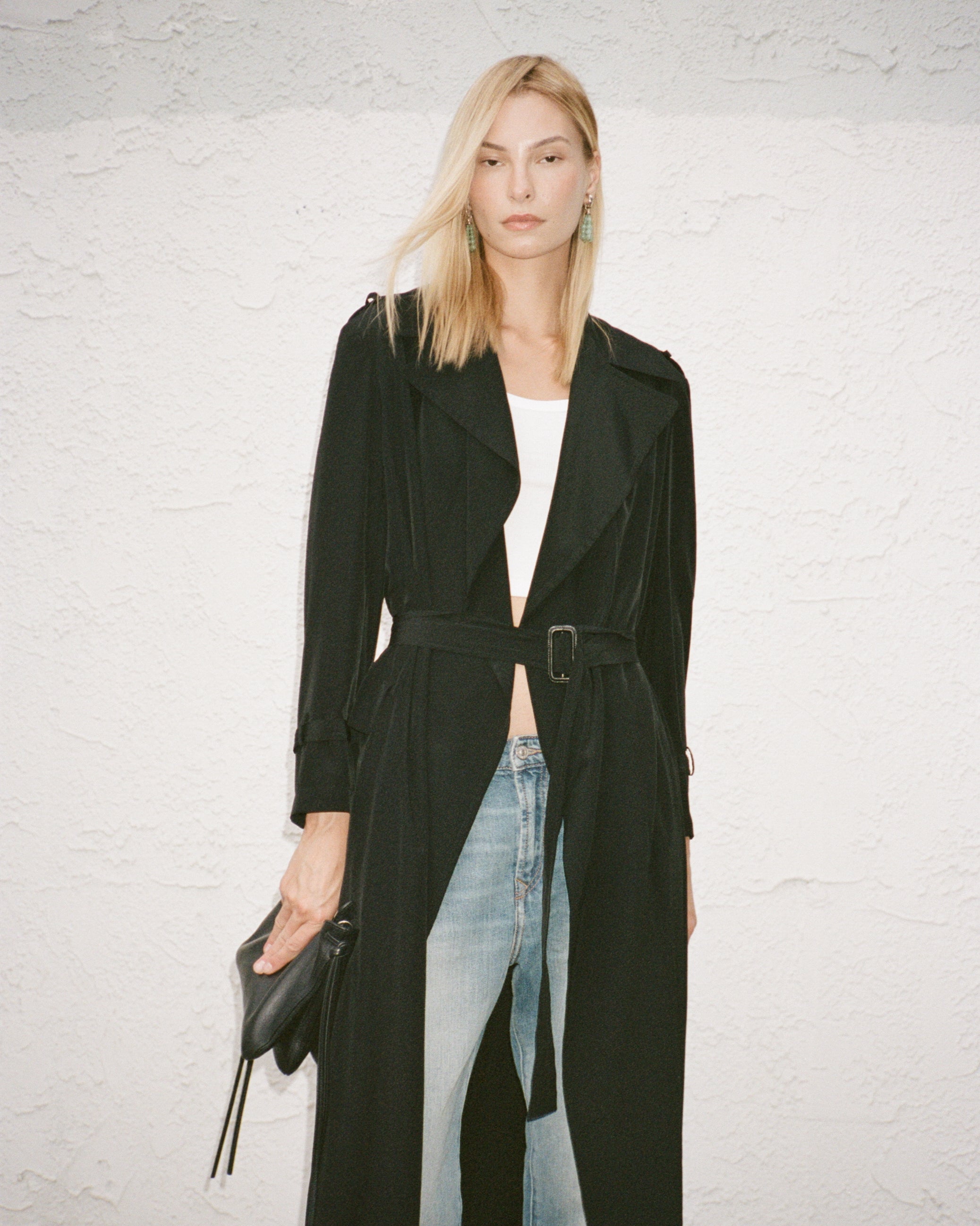 S/S 1996 Yohji Yamamoto black belted trench coat. Midi length oversized trench coat with removable belt, featuring curved center belt buckle that fits adjustable length sizing; adjustable silver-tone loops at wrist allow for adjustments in silhouette when worn. Functional side flap pockets. Fabric Contents: 100% Polyester (feels like Silk). As seen on the runway on Amber Valletta. In excellent vintage condition with no flaws to note.