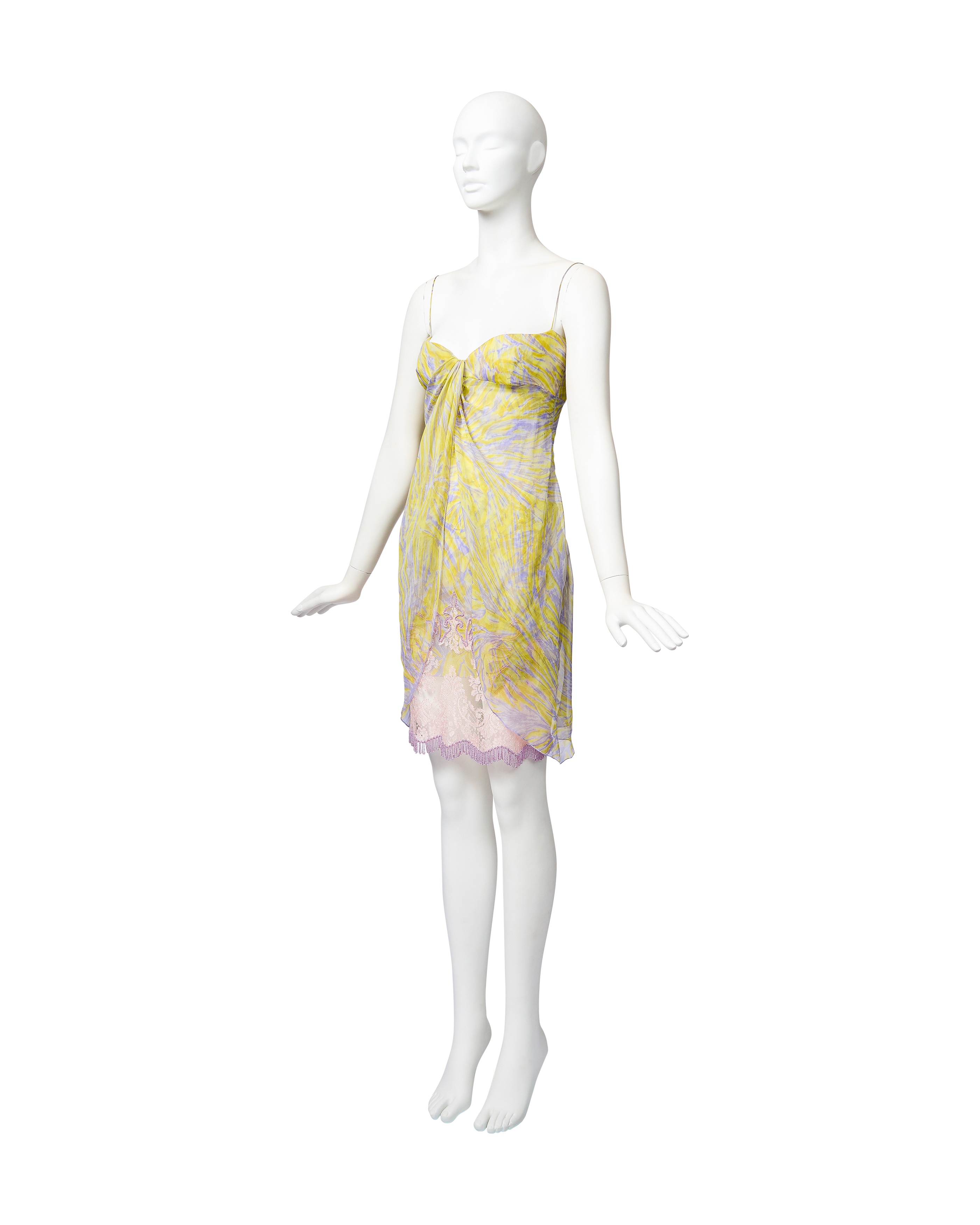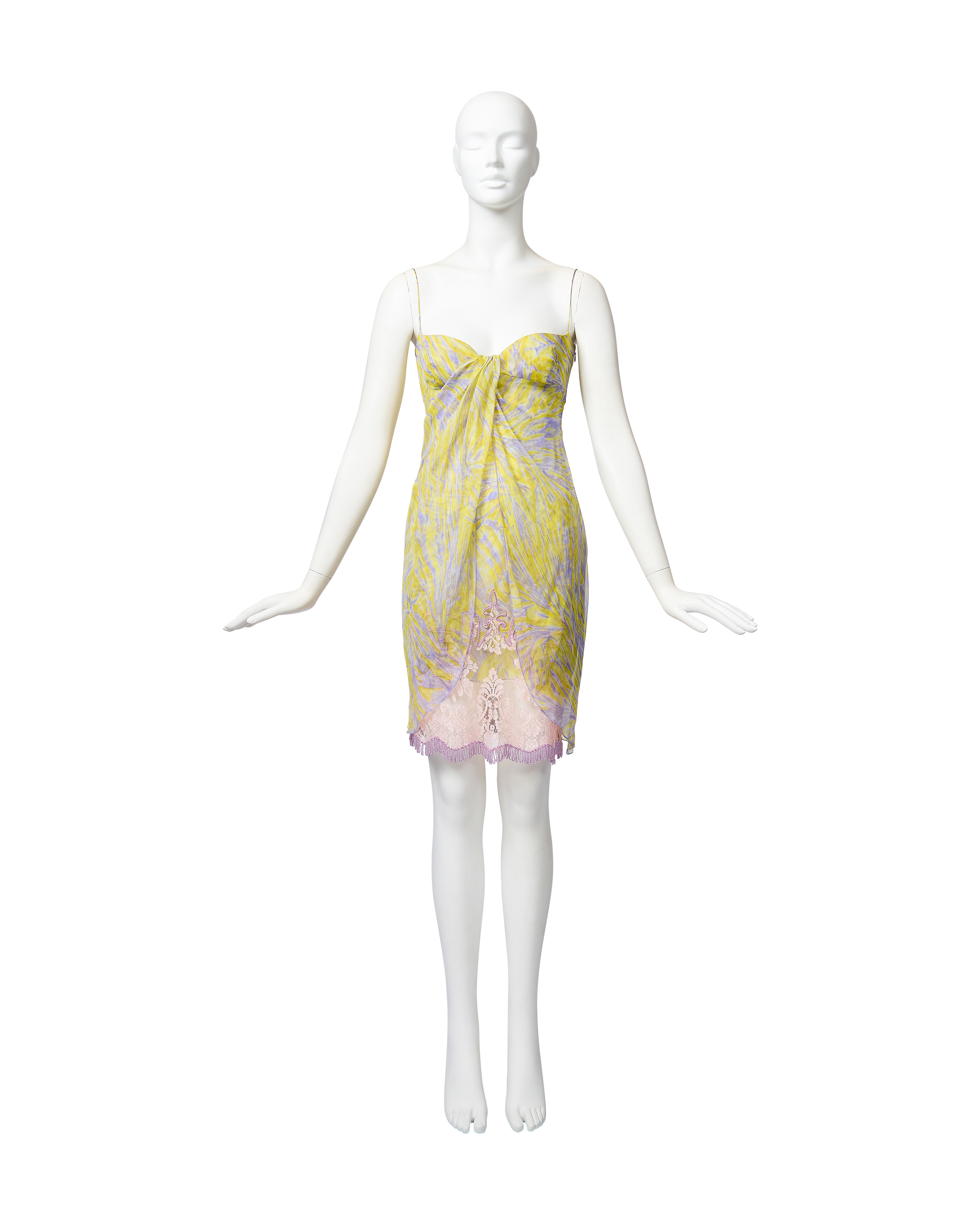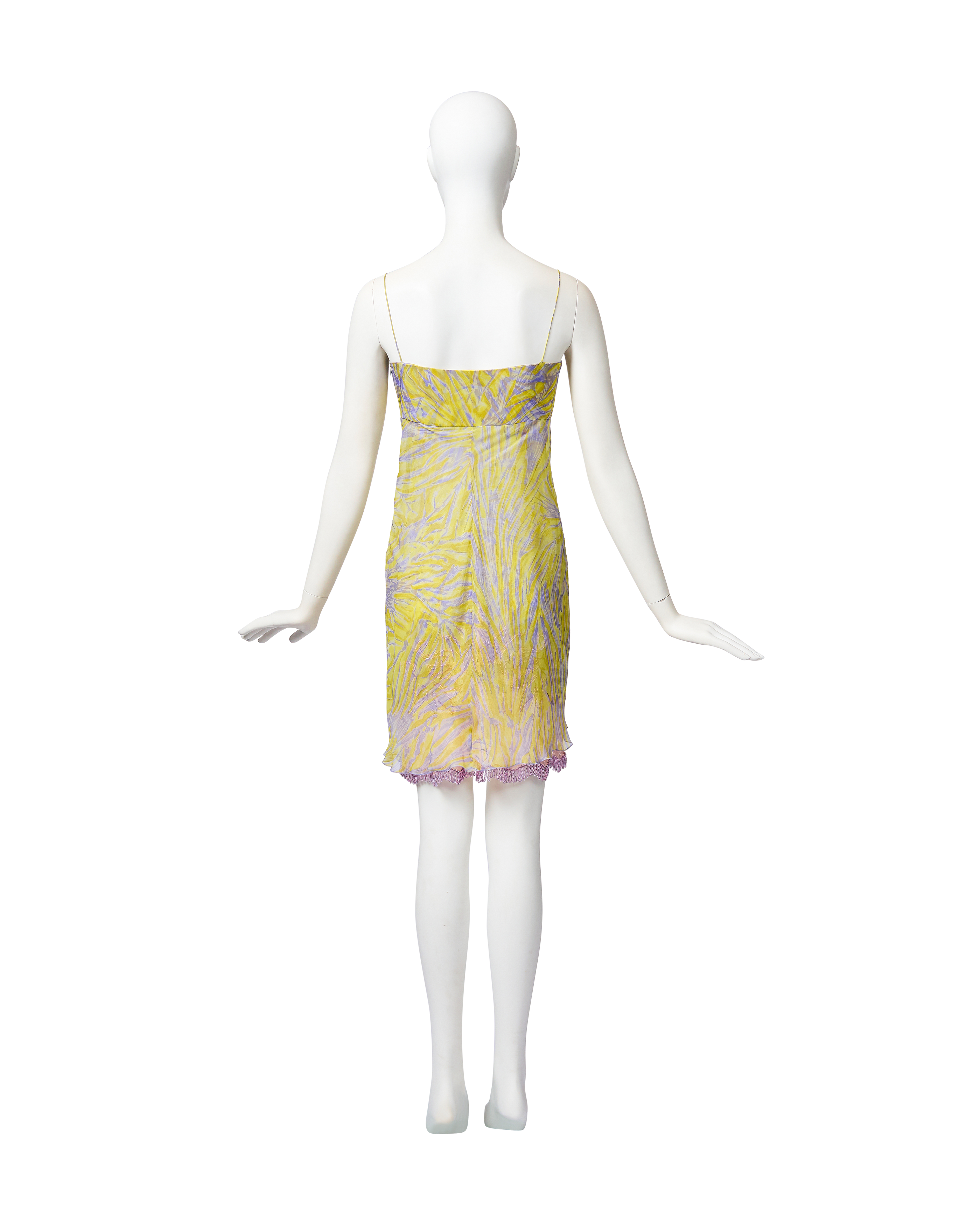 S/S 1998 Valentino sleeveless patterned above-knee dress with purple beaded fringe and lace details. Sleeveless sweetheart bustier dress with yellow and purple abstract pattern throughout, featuring light pink lace and purple beaded loop fringe detailing at hemline. Lightweight, semi-sheer silk chiffon construction with three layers: interior lining, embellished layer, and third layer that drapes open from front. Side zip closure. As seen on the runway. In good vintage condition with small holes at left side seam (slightly noticeable when worn upon close inspection).