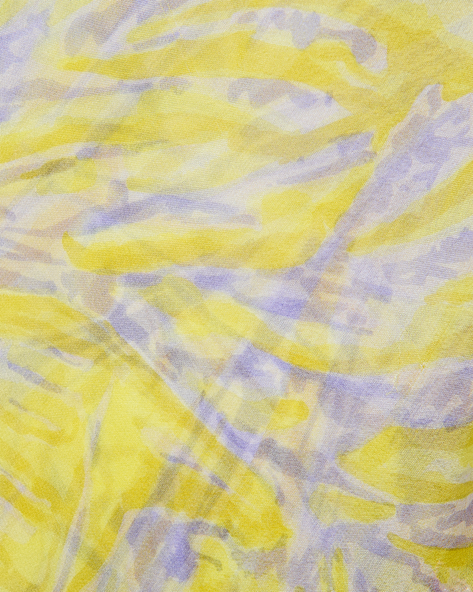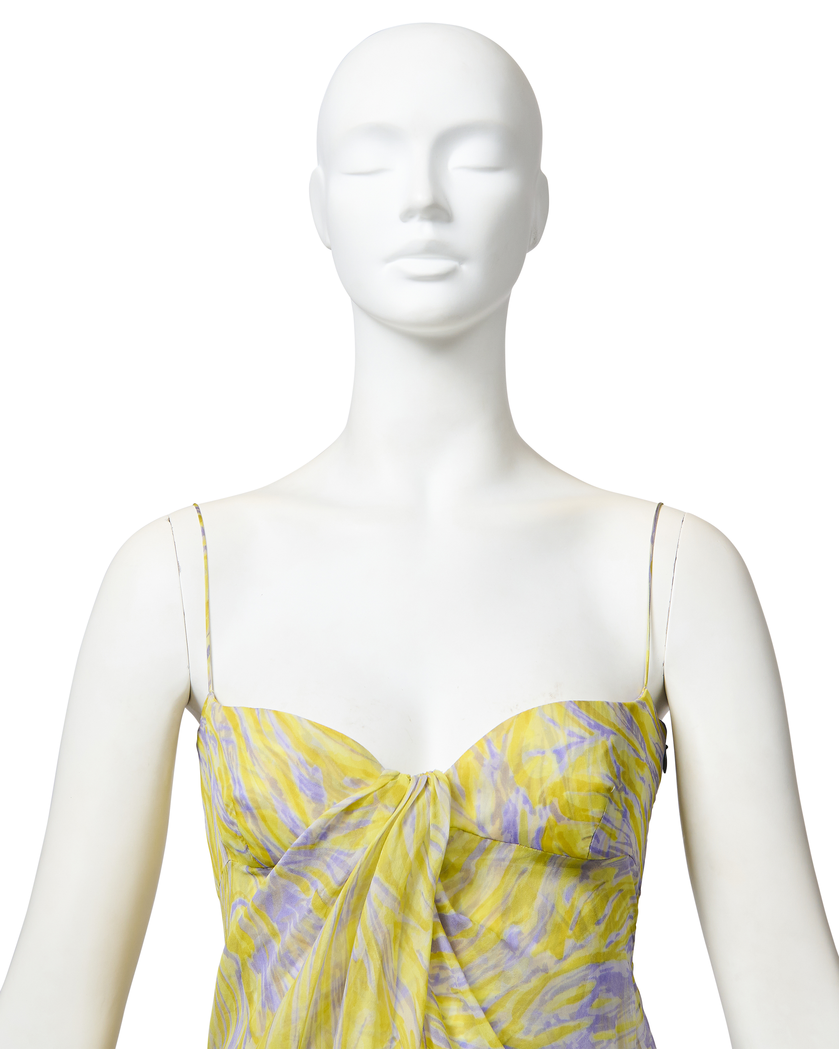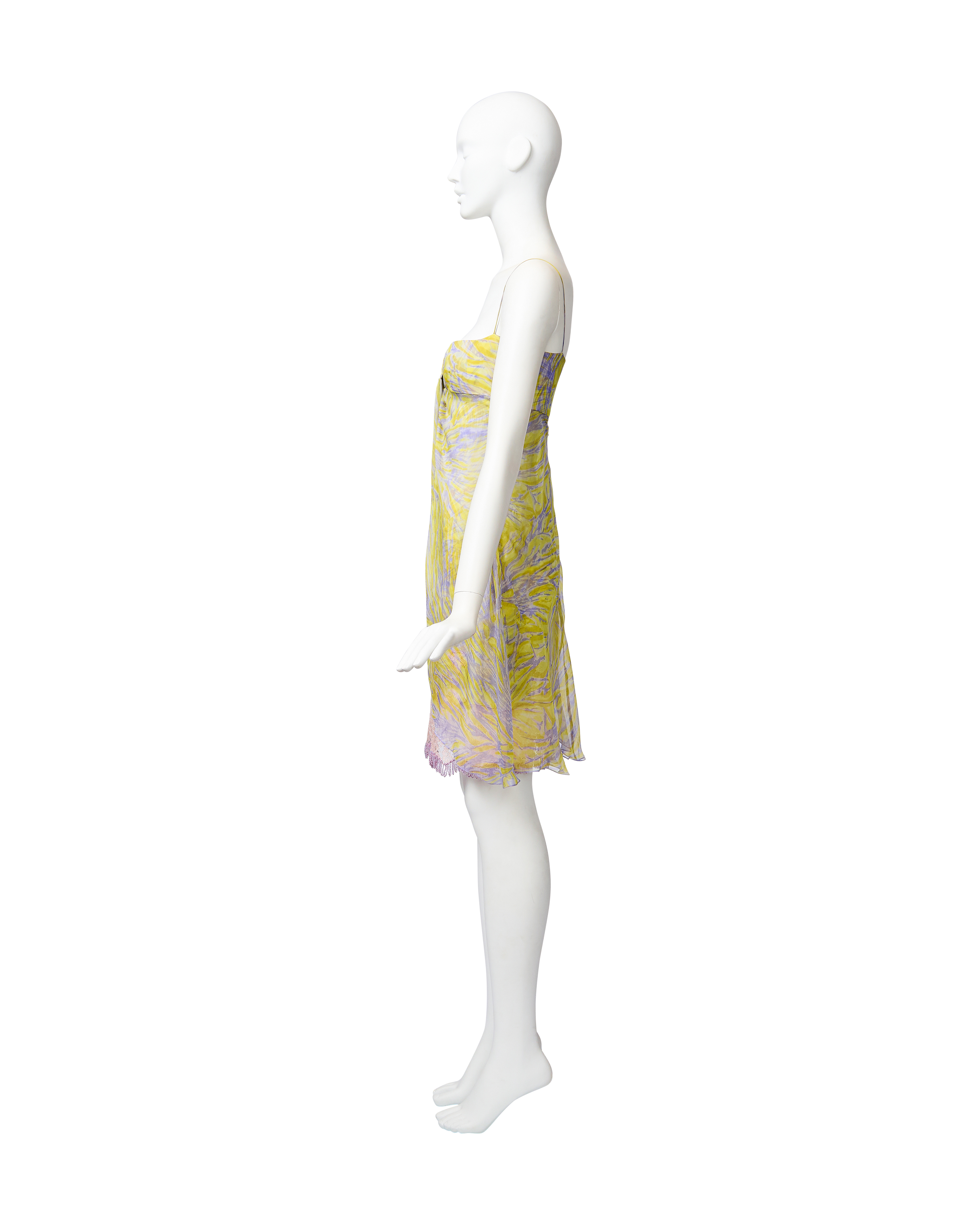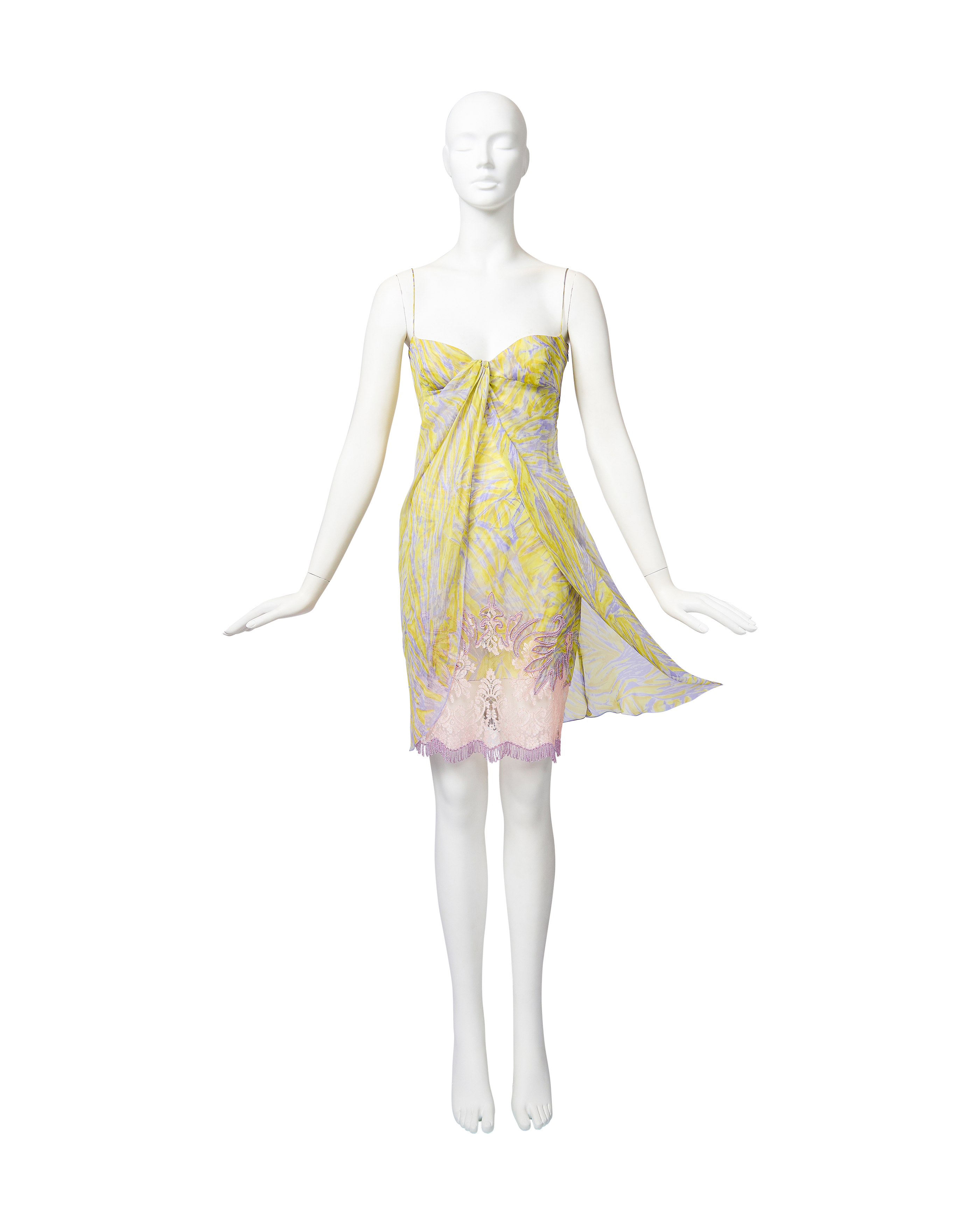 S/S 1998 Valentino sleeveless patterned above-knee dress with purple beaded fringe and lace details. Sleeveless sweetheart bustier dress with yellow and purple abstract pattern throughout, featuring light pink lace and purple beaded loop fringe detailing at hemline. Lightweight, semi-sheer silk chiffon construction with three layers: interior lining, embellished layer, and third layer that drapes open from front. Side zip closure. As seen on the runway. In good vintage condition with small holes at left side seam (slightly noticeable when worn upon close inspection).