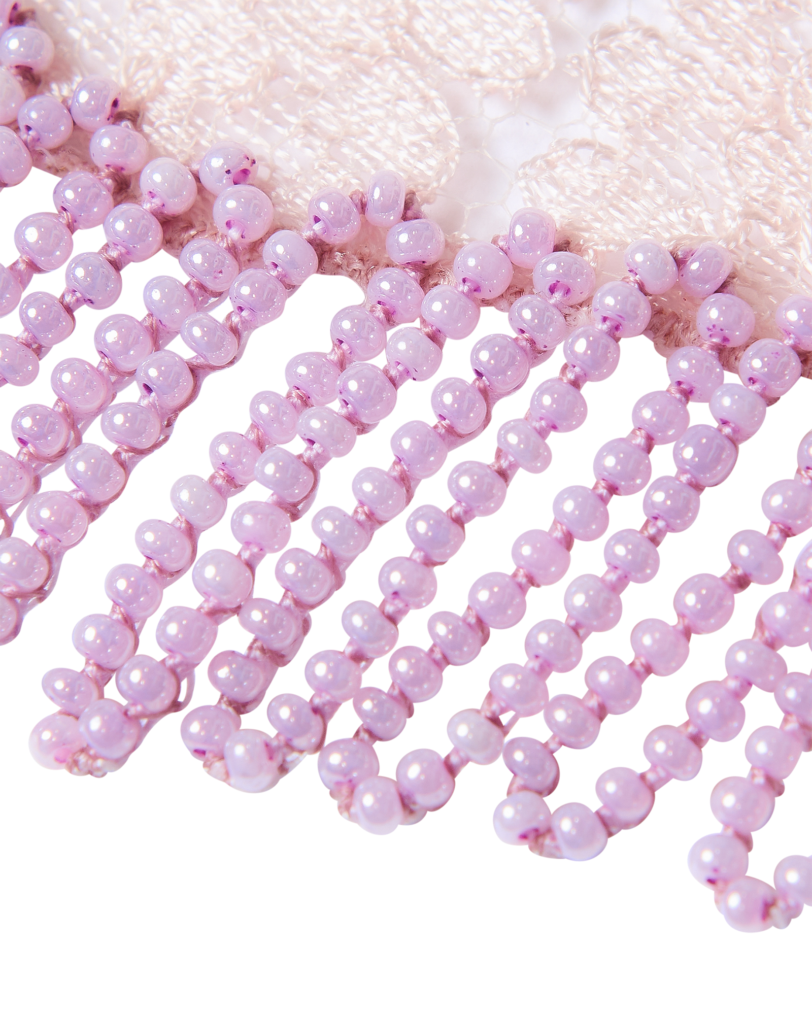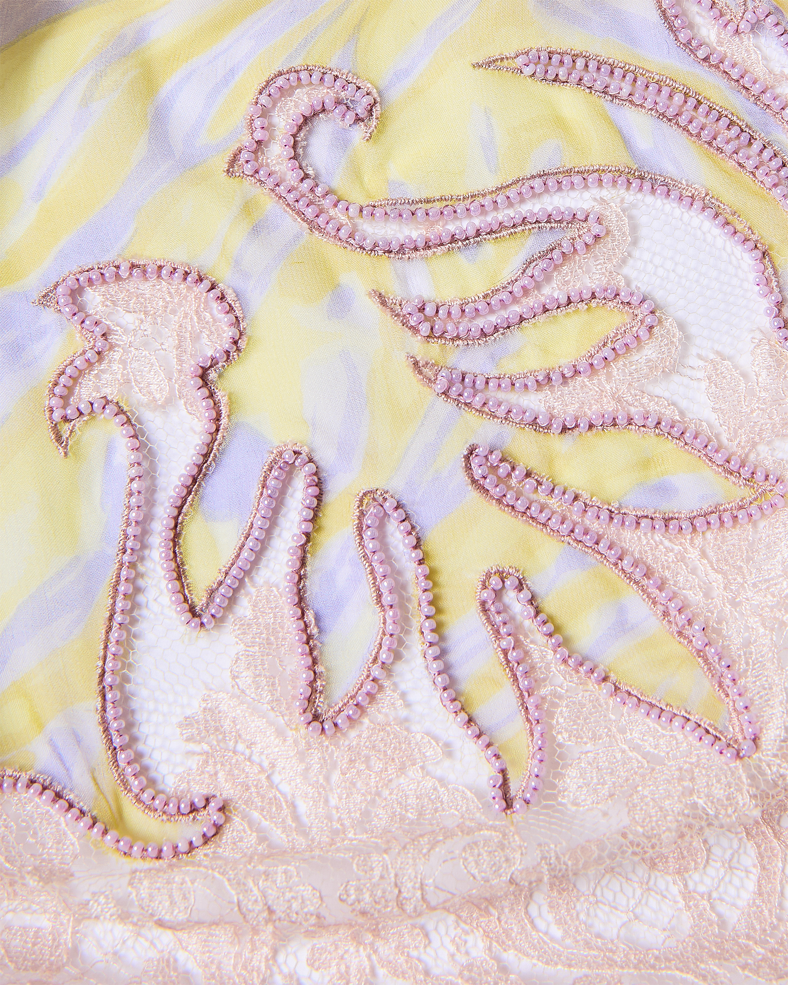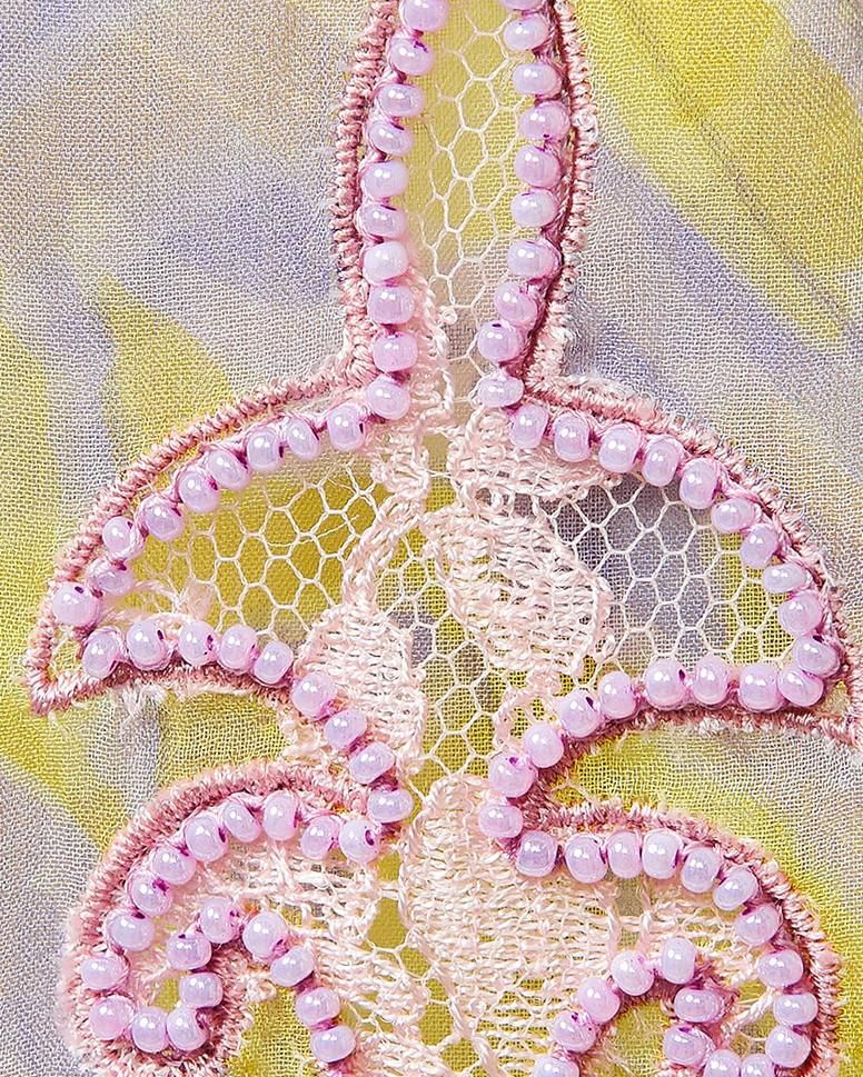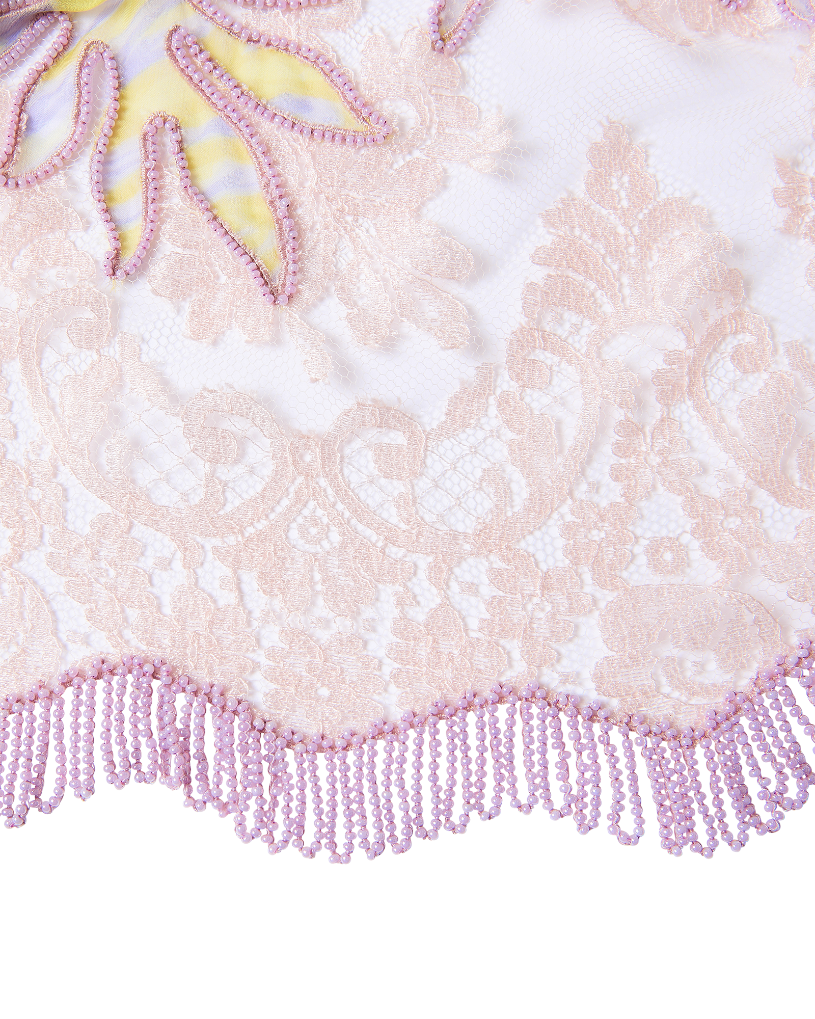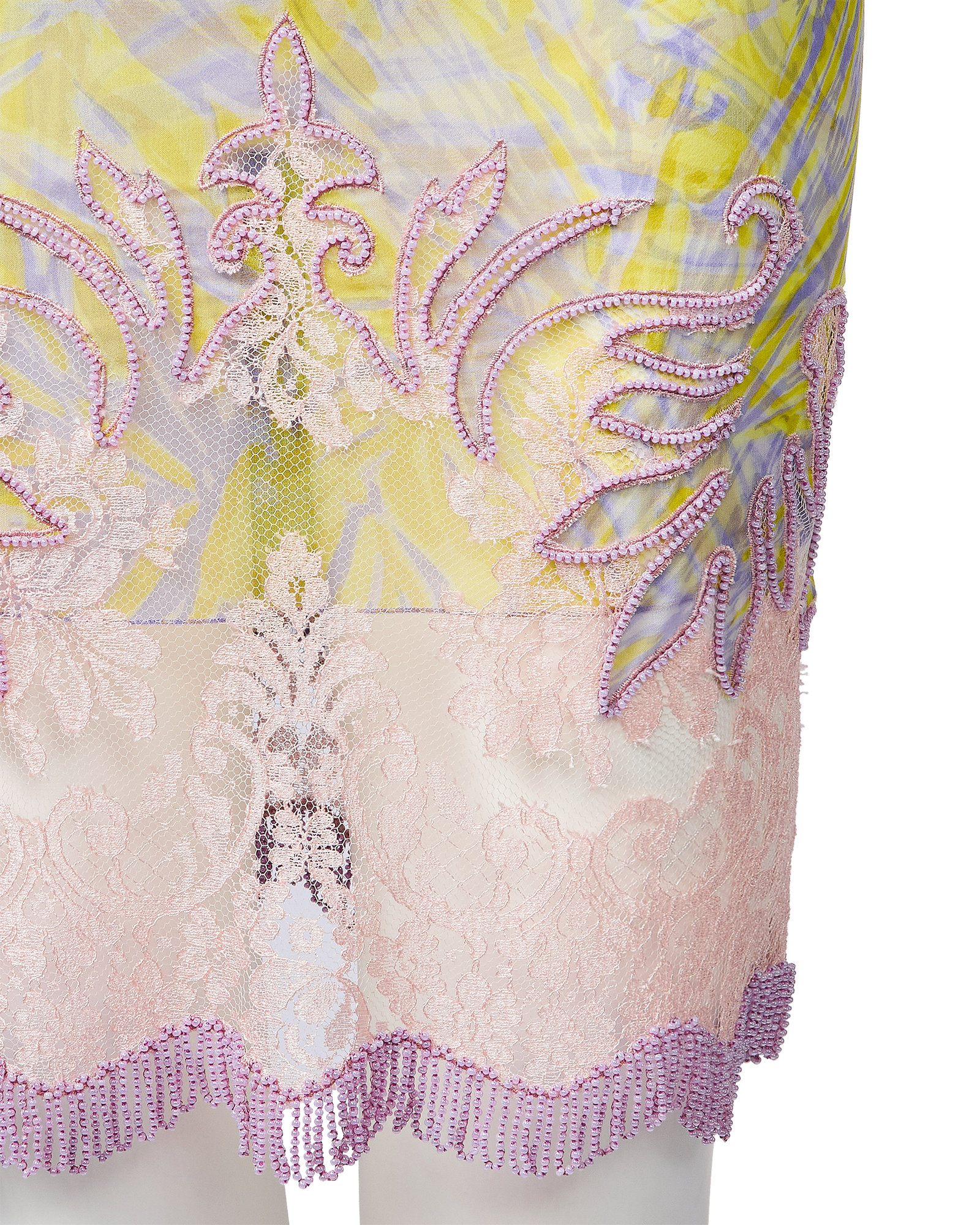 S/S 1998 Sleeveless Patterned Dress with Purple Beaded Fringe and Lace Details