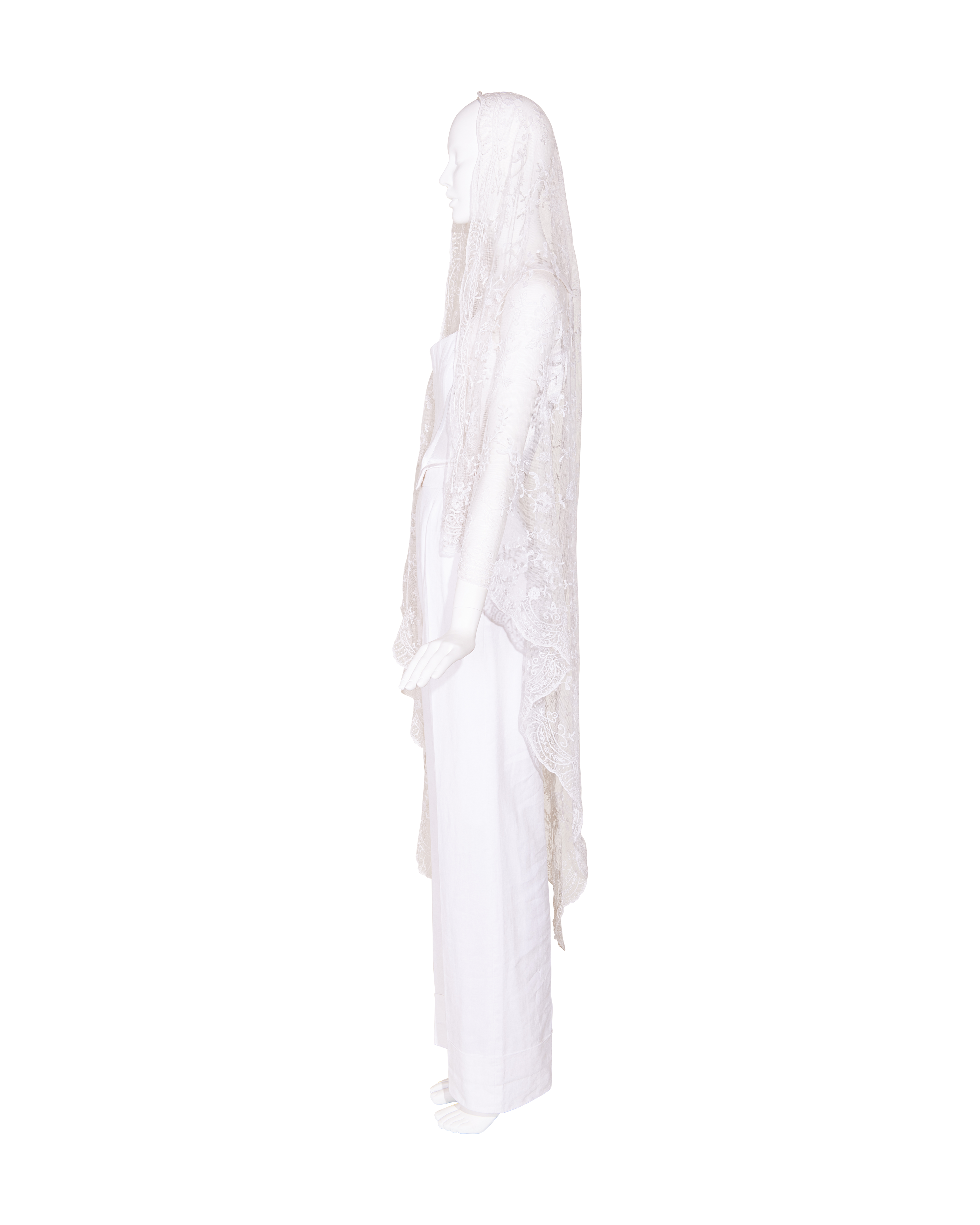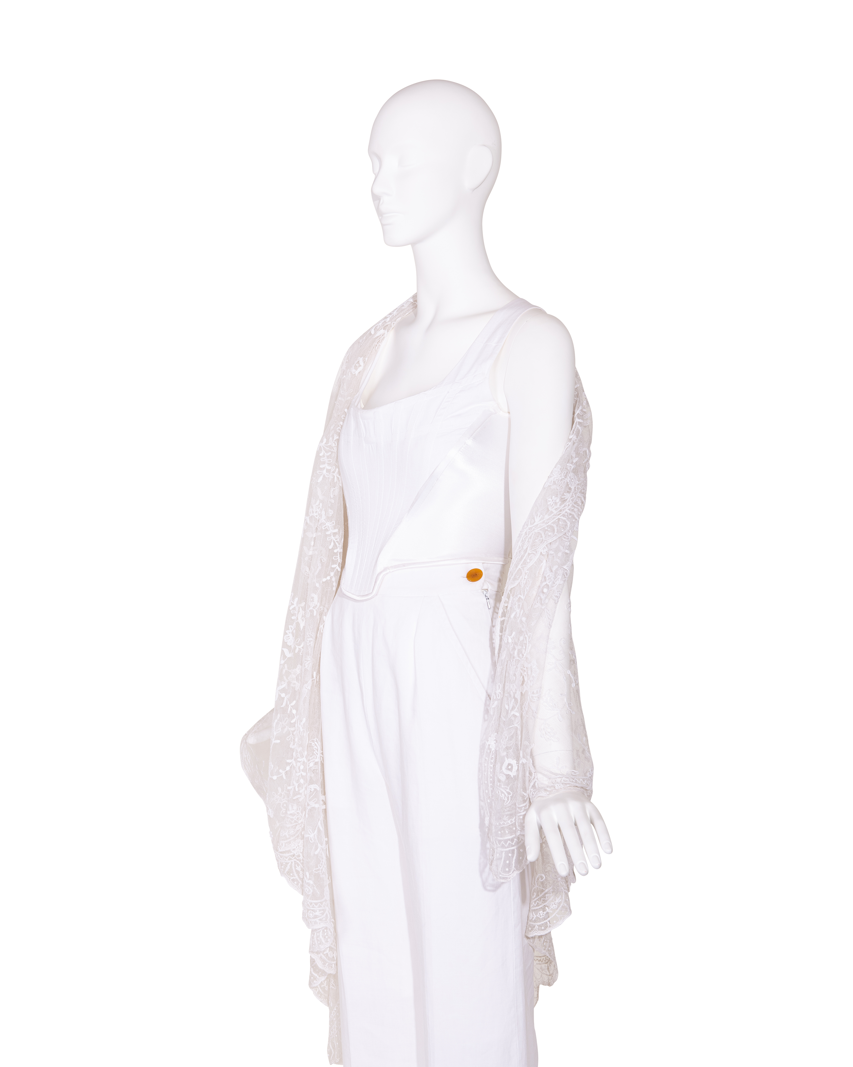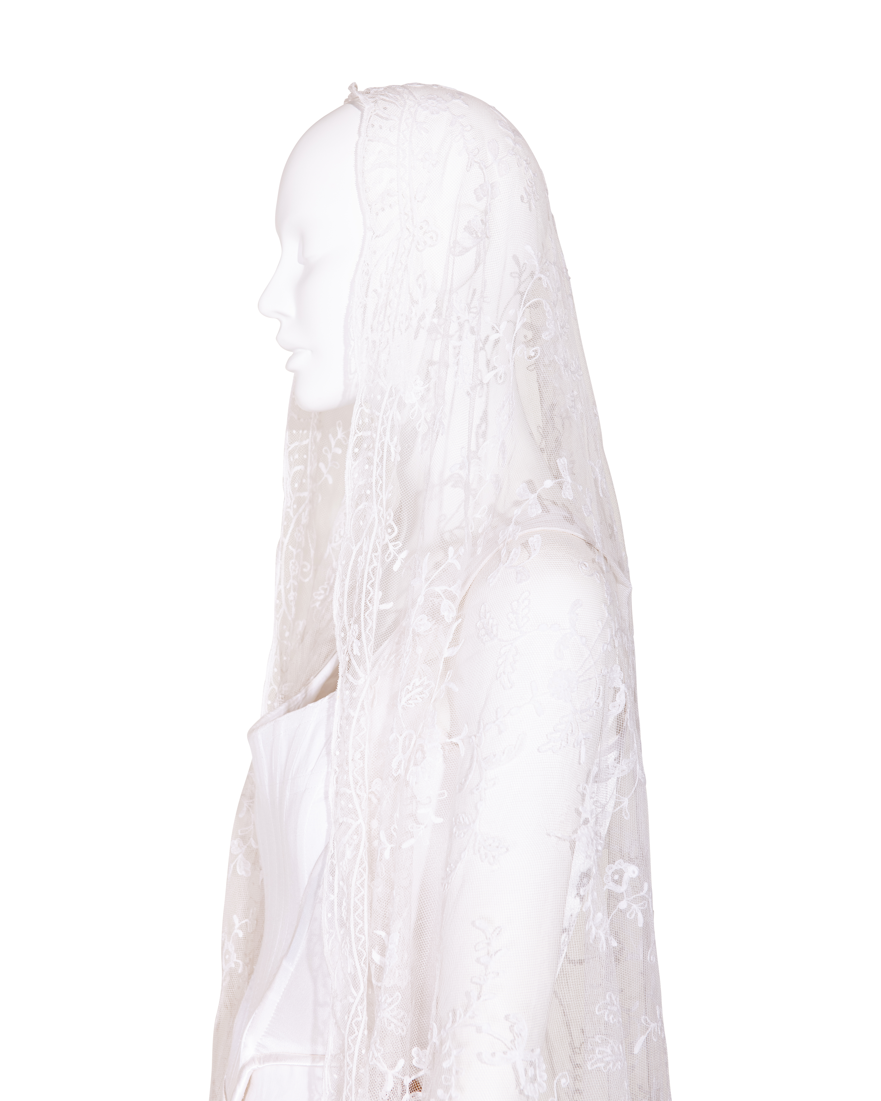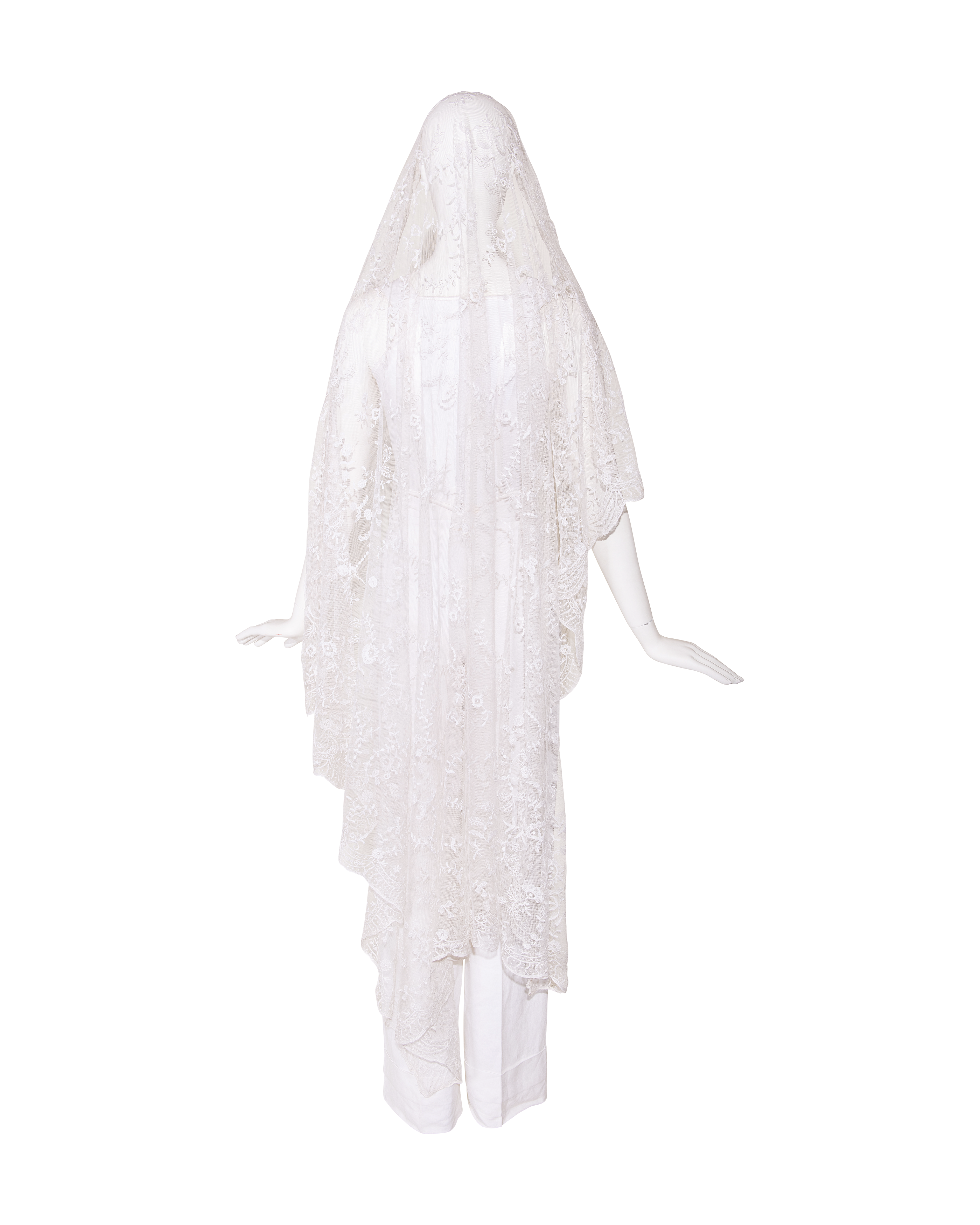 1910's Special Vintage long ivory tambour embroidered lace veil. Very rare early 1900's lace with intricate floral detailing and scallop lace hem. Can be styled as veil, wrap or stole as desired. In very good vintage condition with light wear throughout consistent with age, including very faint holes throughout; has been taken to couture cleaner and arrives ready to wear, restored to original white color. Styled with white Vivienne Westwood set for e-commerce purposes only; set not included with purchase.