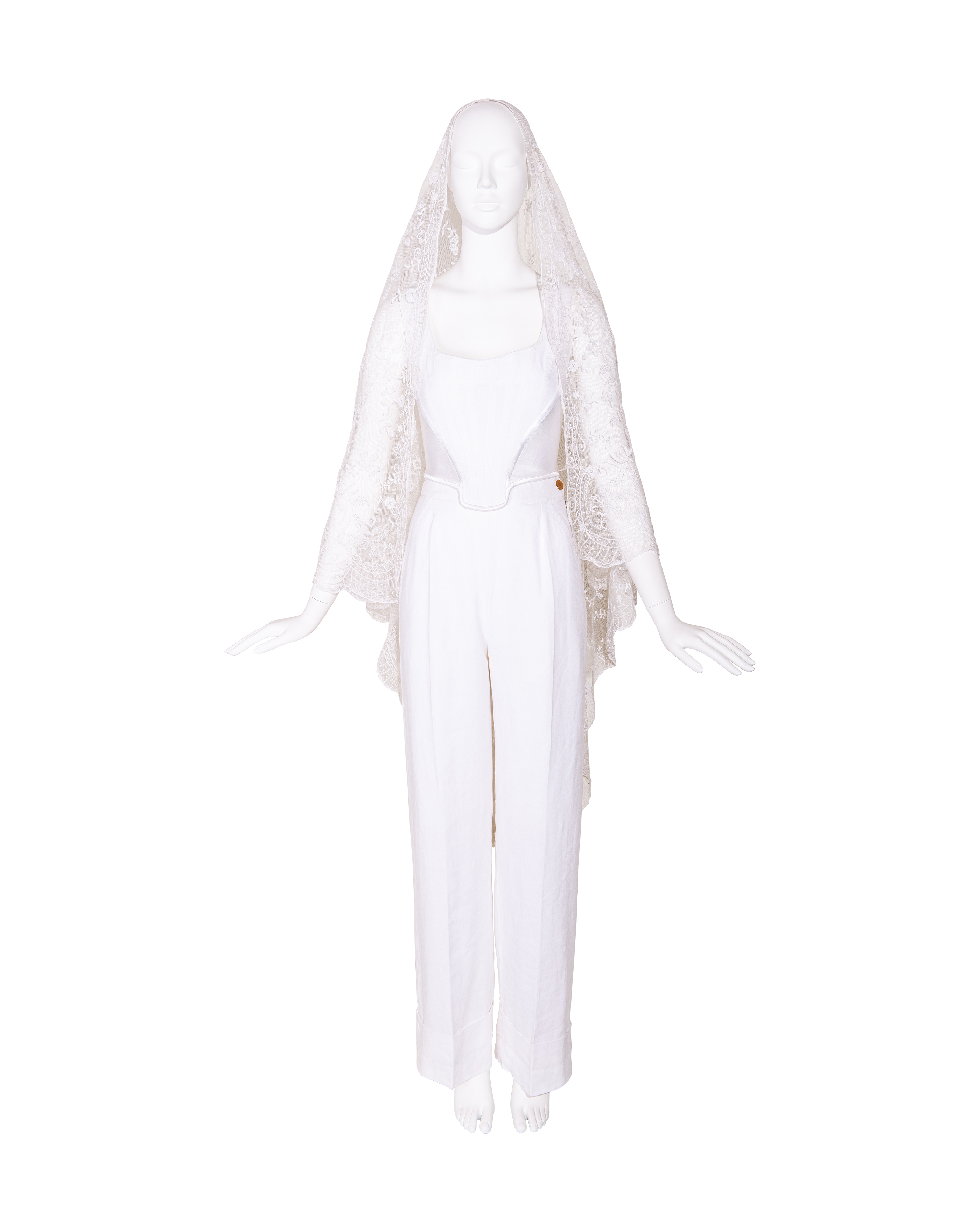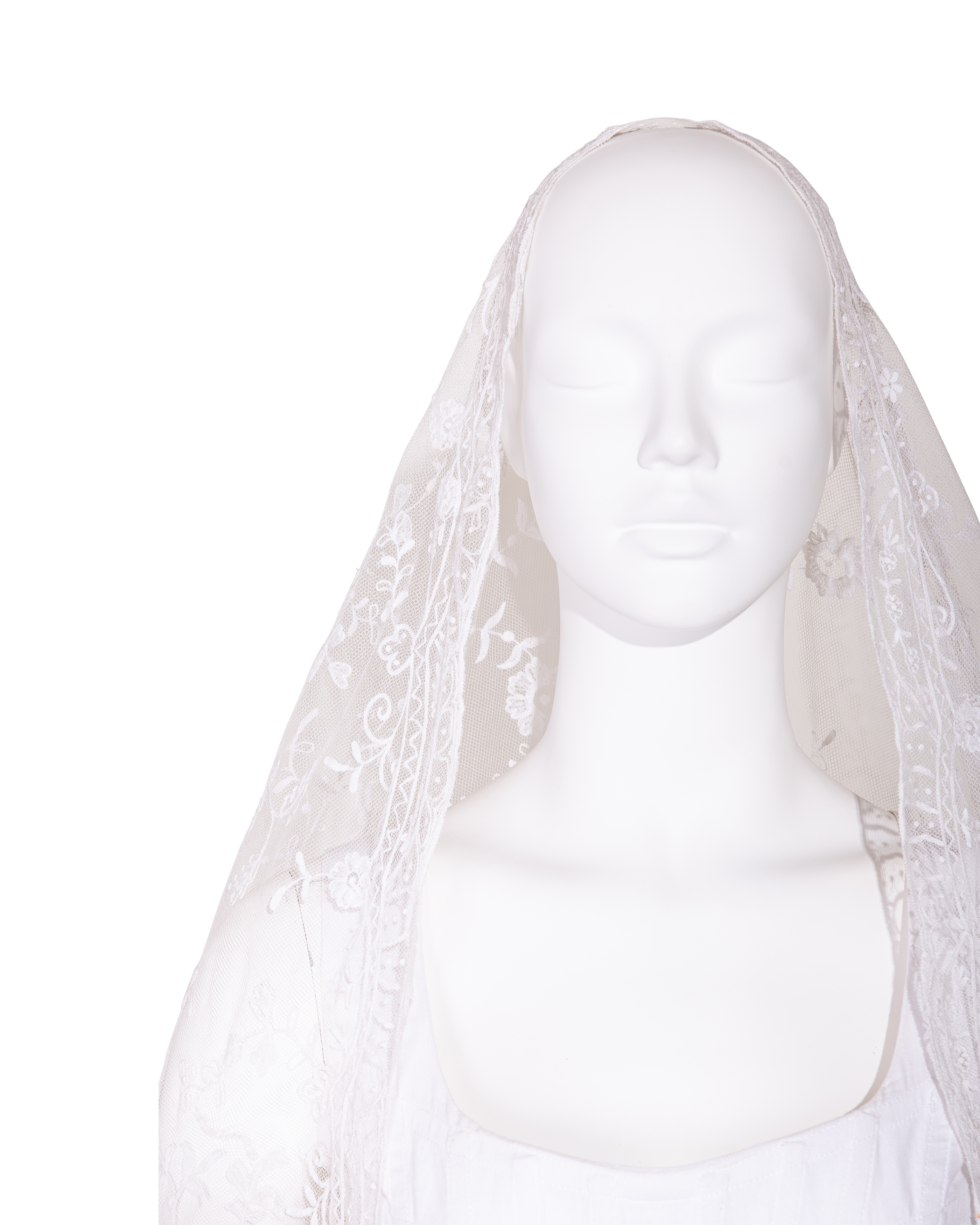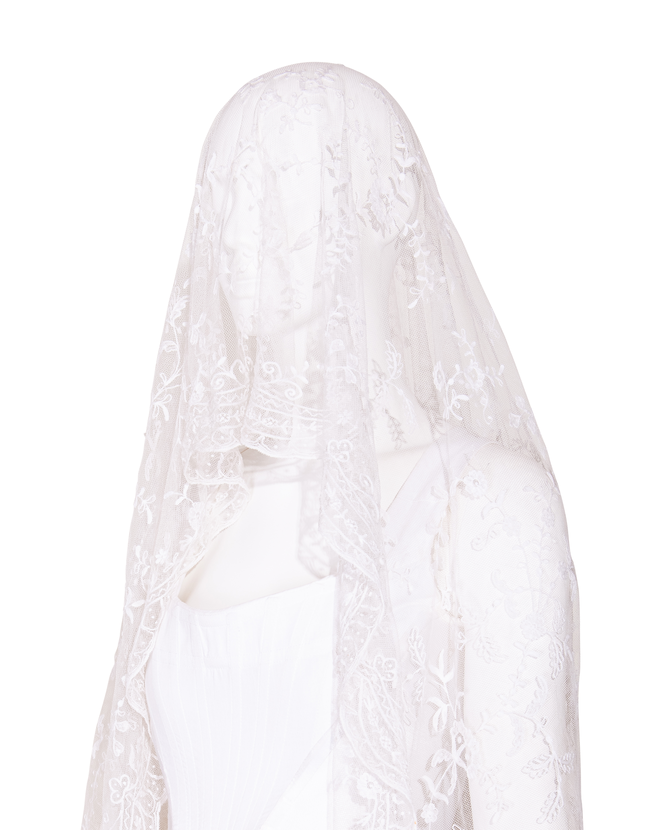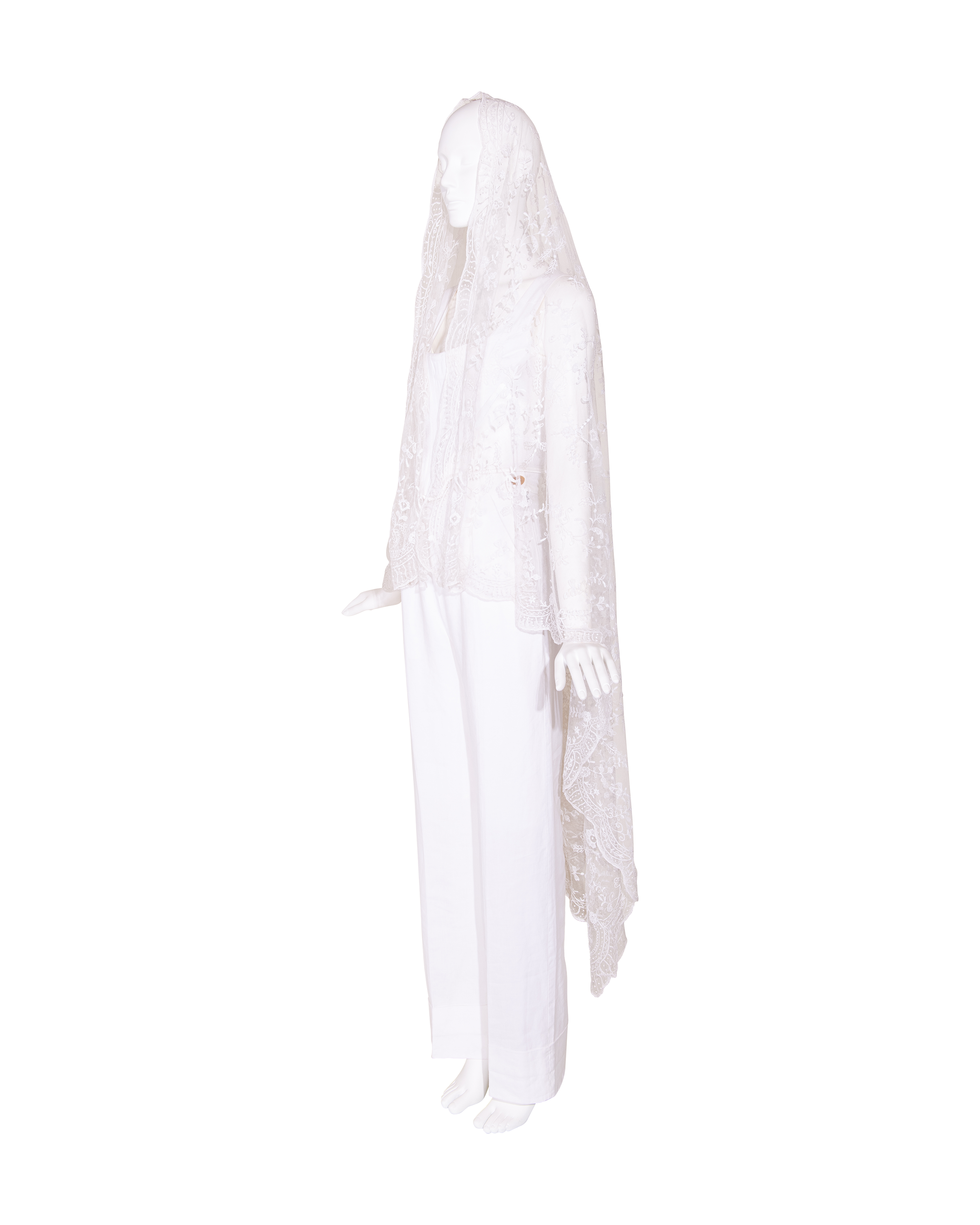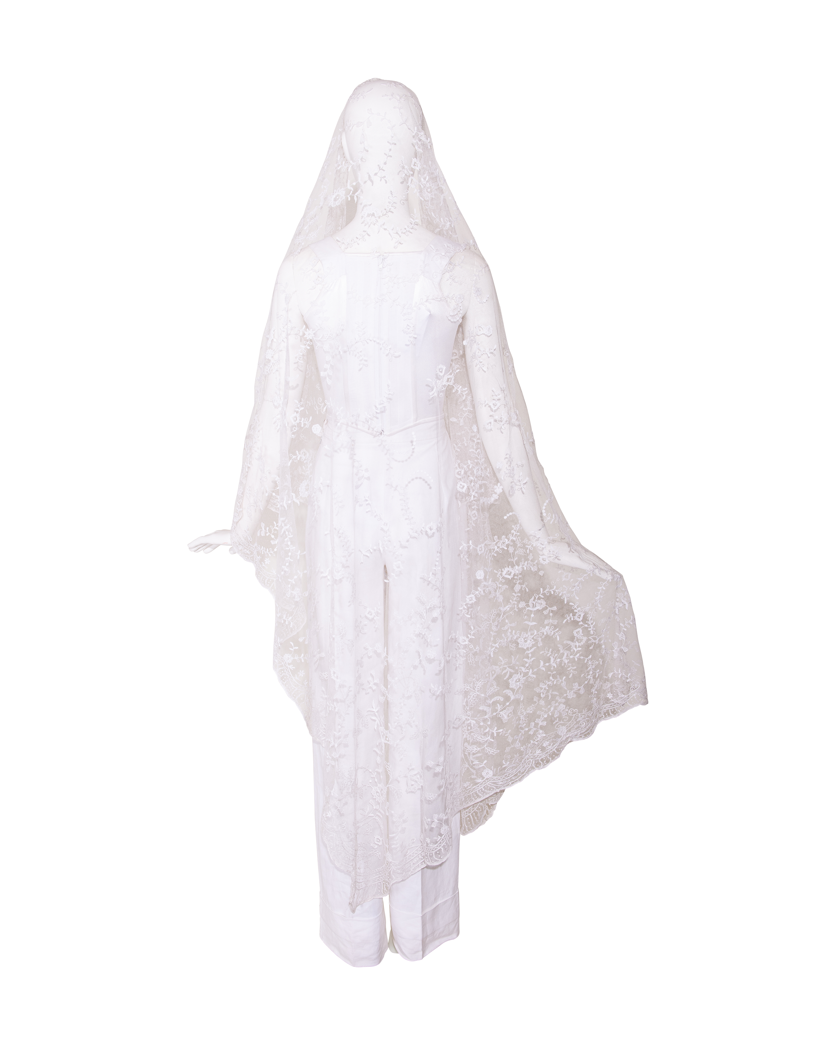 1910's Special Vintage long ivory tambour embroidered lace veil. Very rare early 1900's lace with intricate floral detailing and scallop lace hem. Can be styled as veil, wrap or stole as desired. In very good vintage condition with light wear throughout consistent with age, including very faint holes throughout; has been taken to couture cleaner and arrives ready to wear, restored to original white color. Styled with white Vivienne Westwood set for e-commerce purposes only; set not included with purchase.