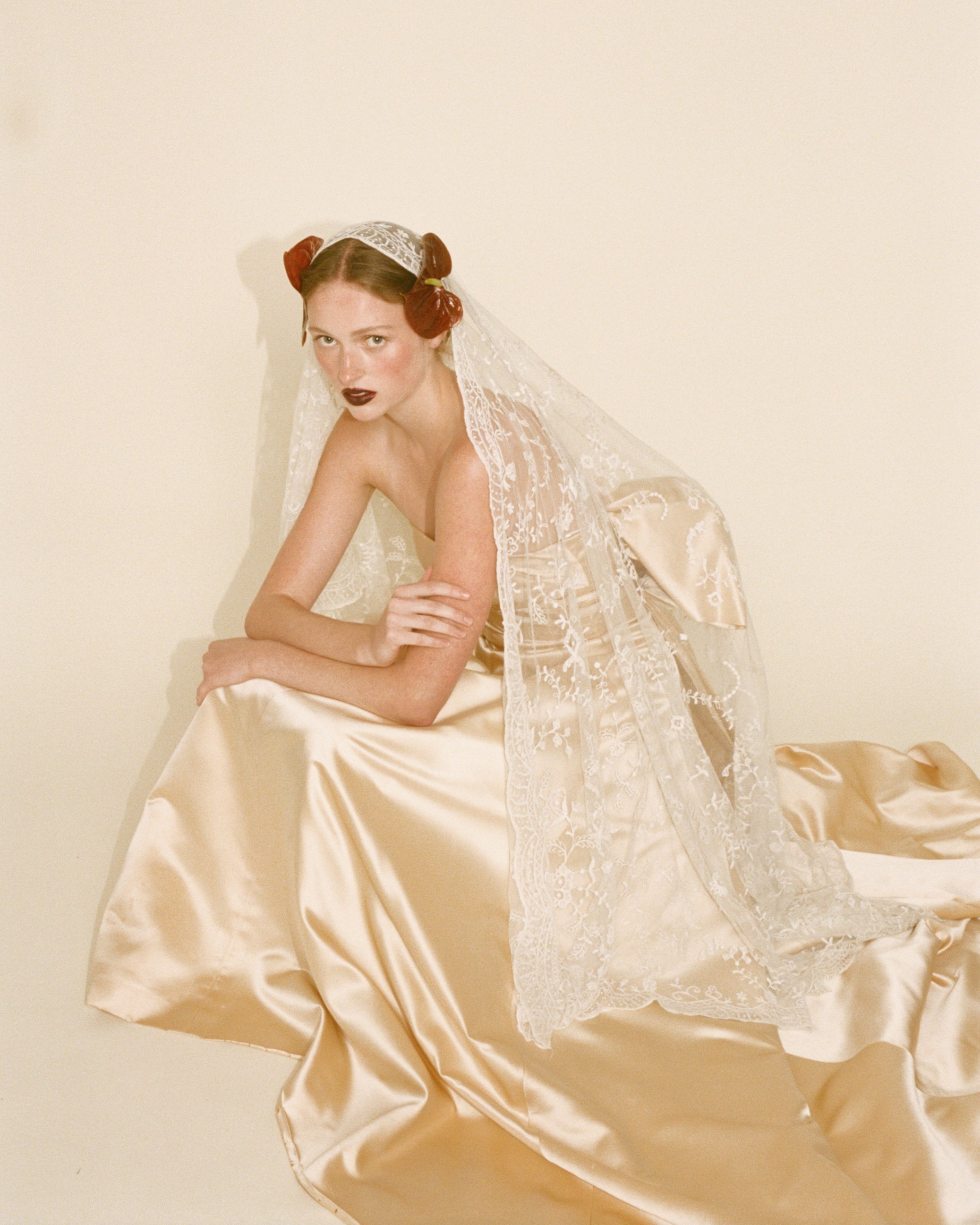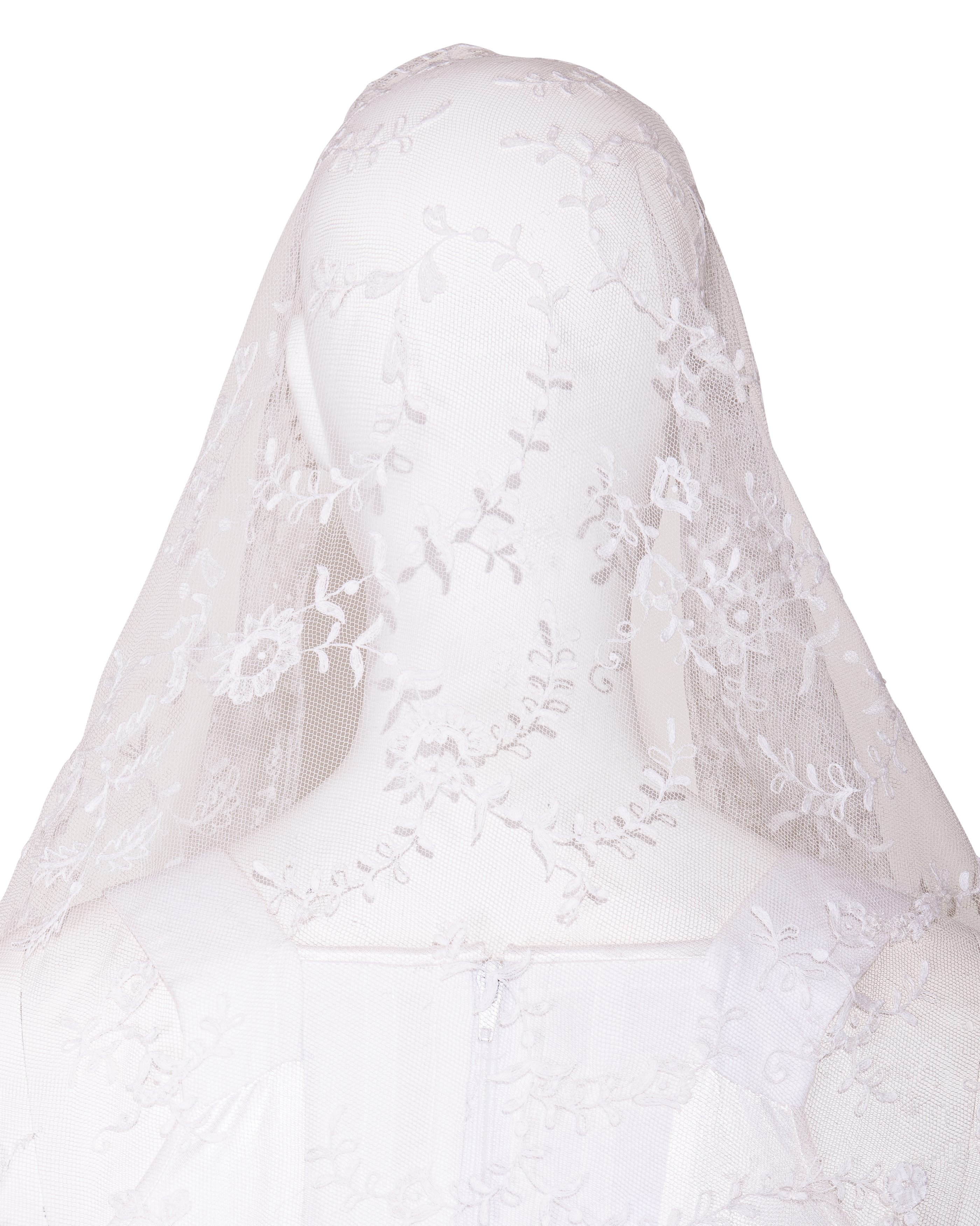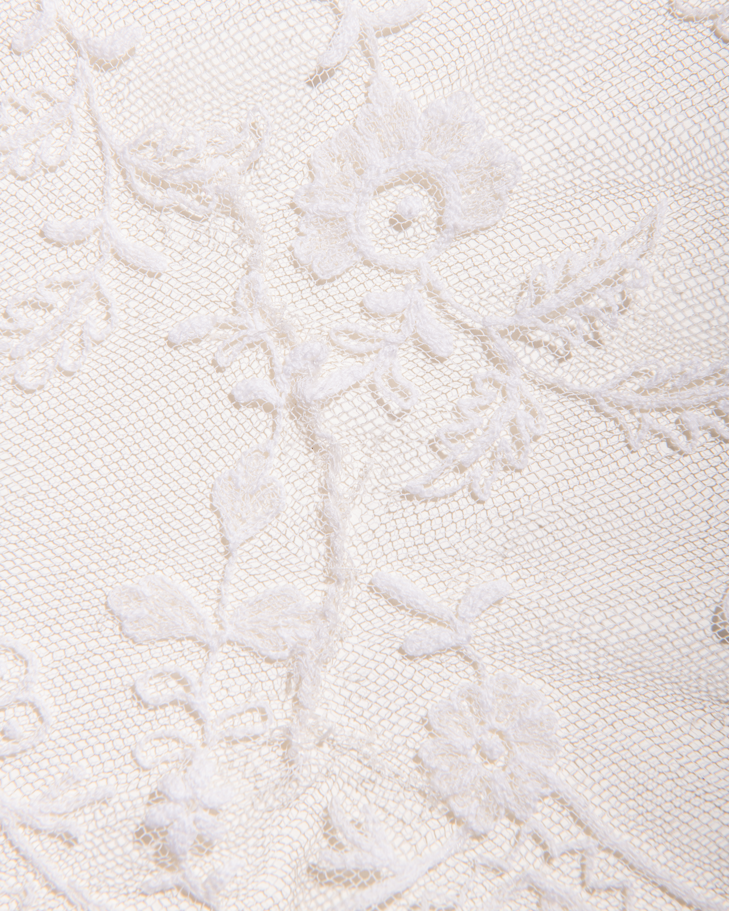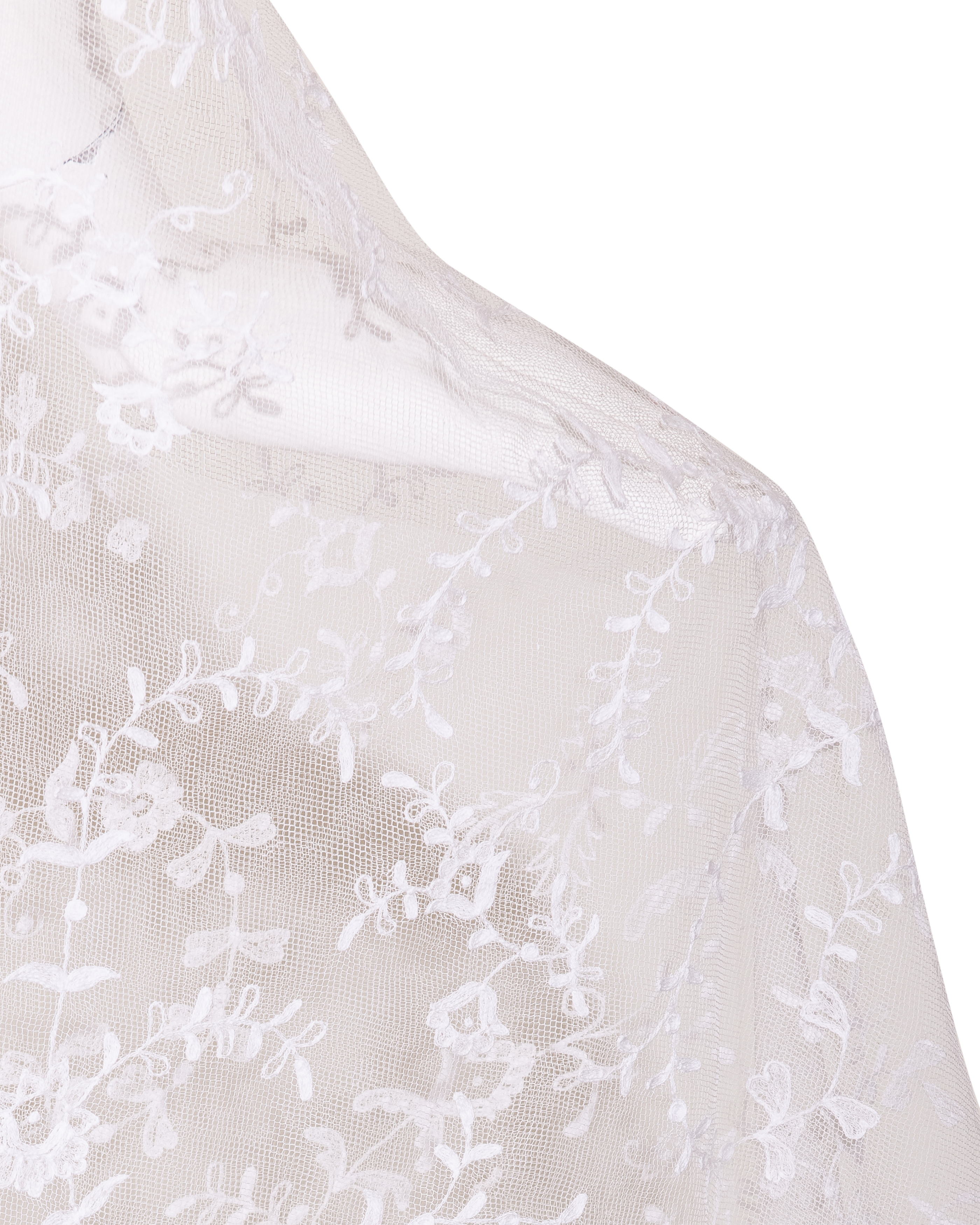 1910's Special Vintage long ivory tambour embroidered lace veil. Very rare early 1900's lace with intricate floral detailing and scallop lace hem. Can be styled as veil, wrap or stole as desired. In very good vintage condition with light wear throughout consistent with age, including very faint holes throughout; has been taken to couture cleaner and arrives ready to wear, restored to original white color. Styled with white Vivienne Westwood set for e-commerce purposes only; set not included with purchase.
