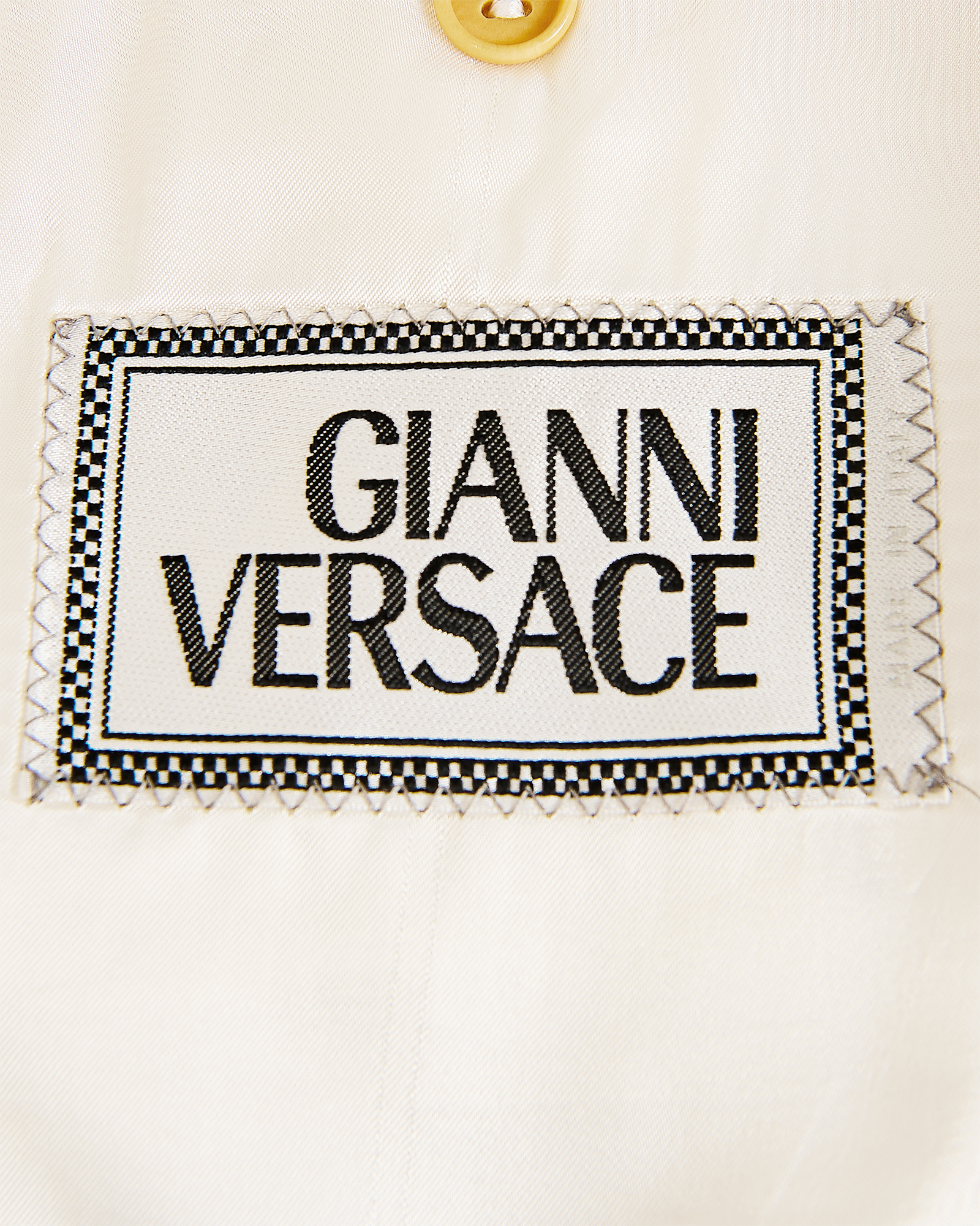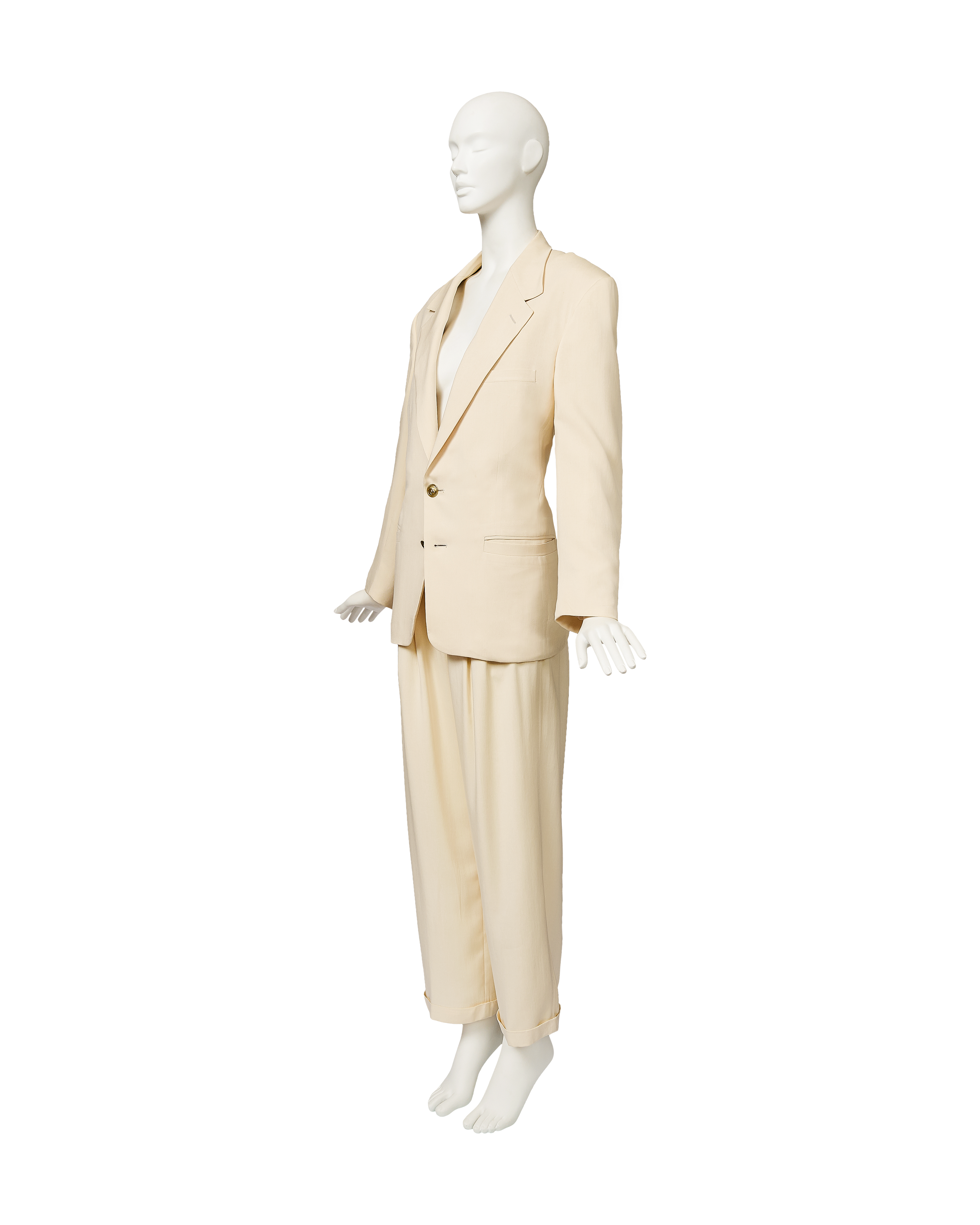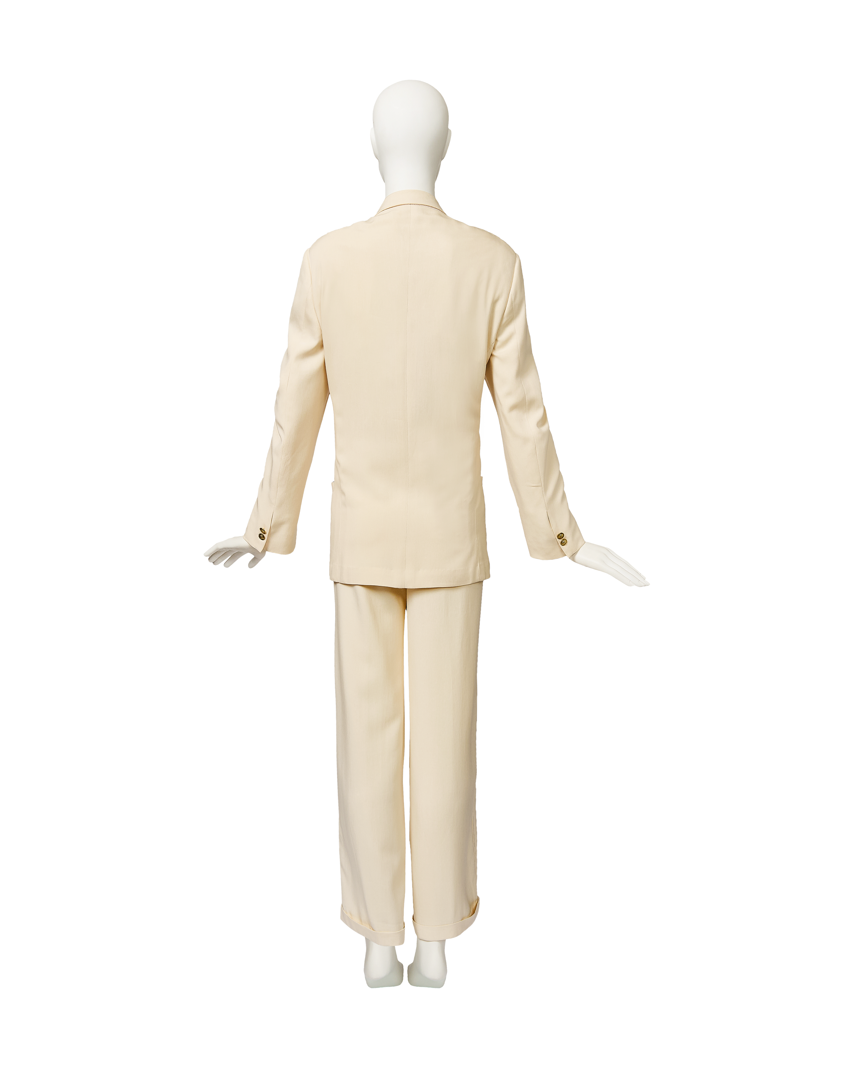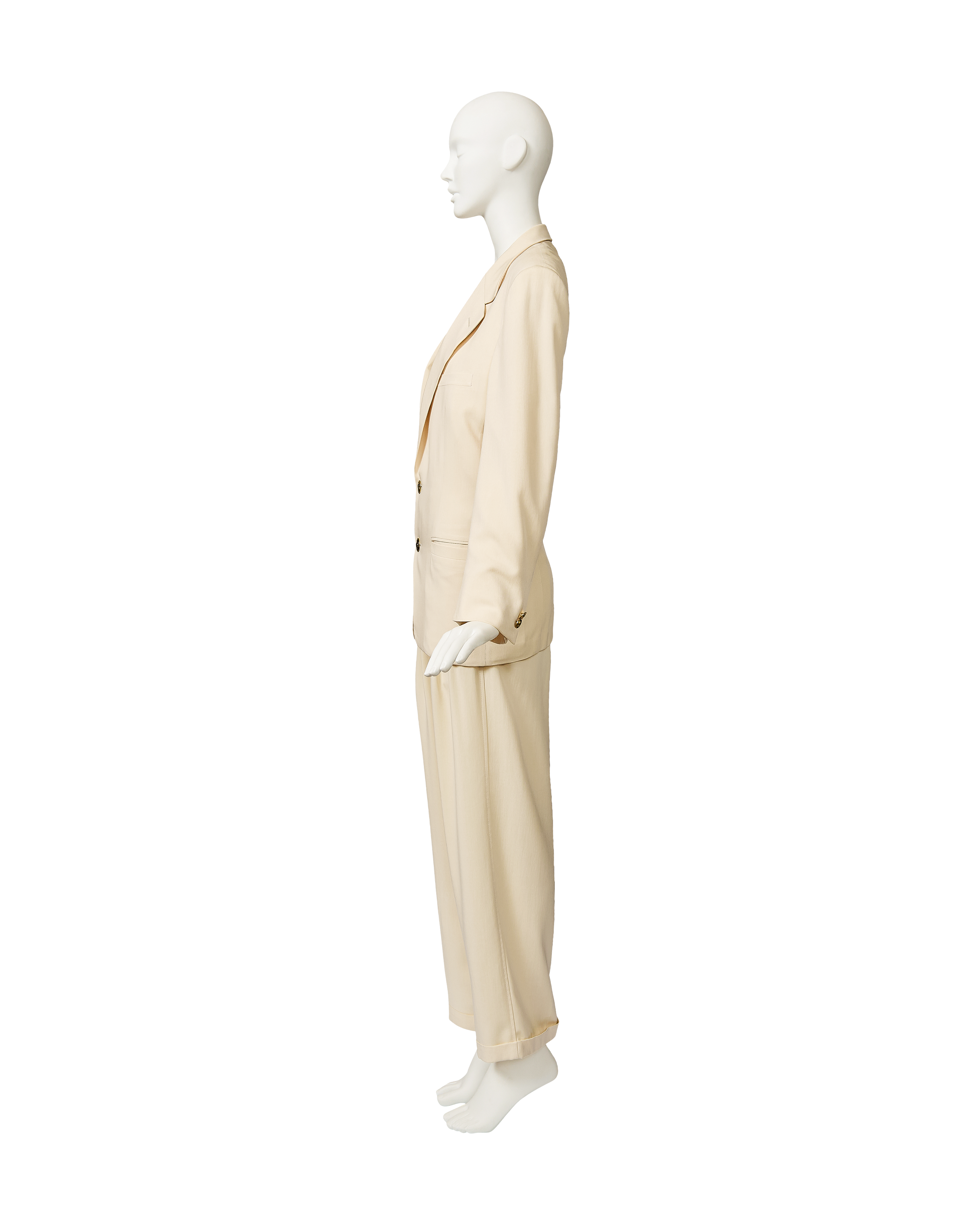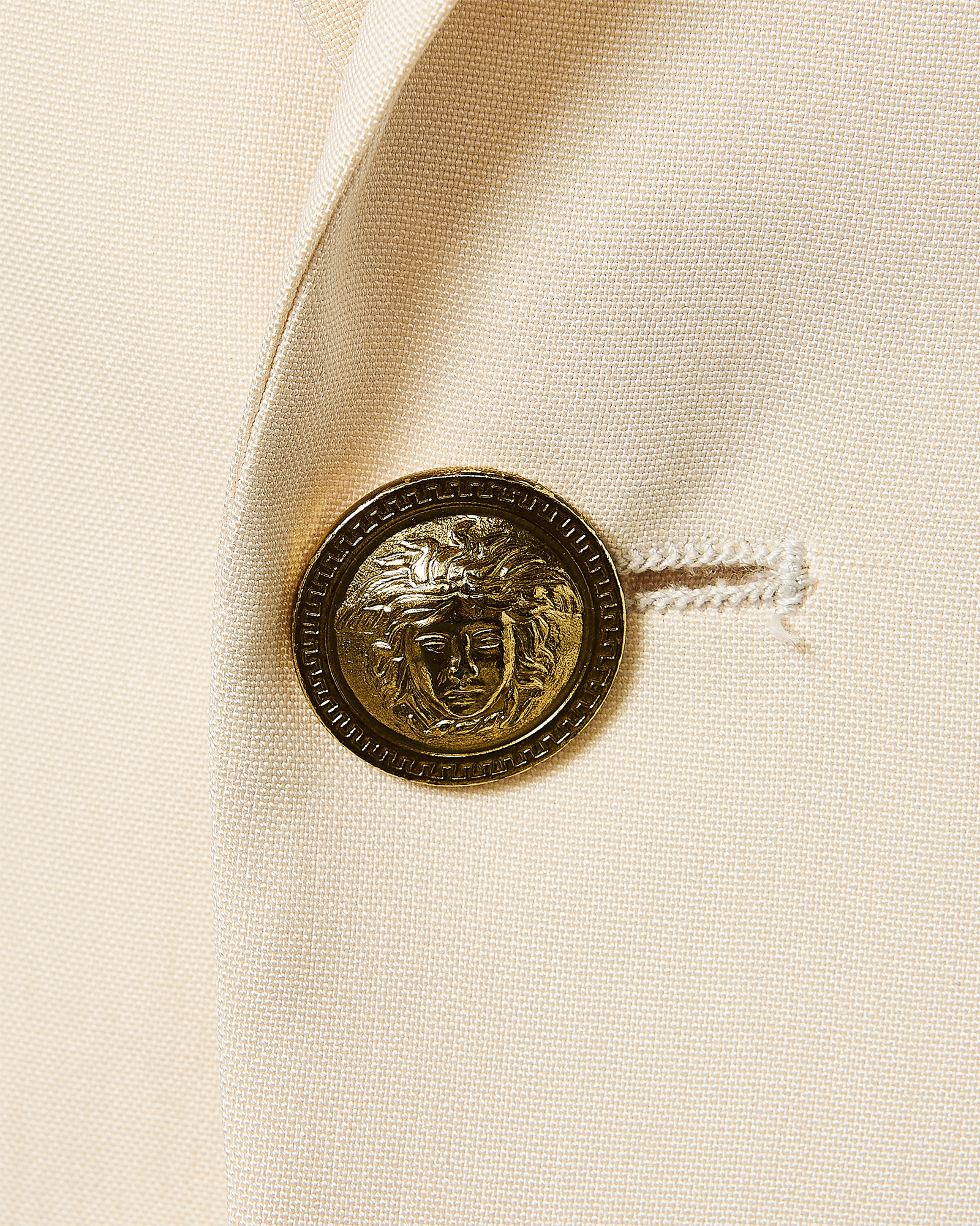1990's Gianni Versace ecru pant suit set. Oversized blazer and high-rise trouser set. Collared blazer jacket features two gold-tone Medusa head front button closures and moderate shoulder pads, with two smaller buttons at wrist. Pairs with high-rise off-white trouser with front zip and single tan button closure; features unique light gray geometric stitching at belt loops and pleating at waist, with single functional back flap pocket and functional side slit pockets. Fabric contents unmarked; feels like lightweight wool blend with silk lining (jacket is partially lined at upper portion, sides and arms). In very good vintage condition with light wear throughout, including faint spotting at interior lining of jacket (unnoticeable when worn); has been taken to couture cleaner and arrives ready to wear.
