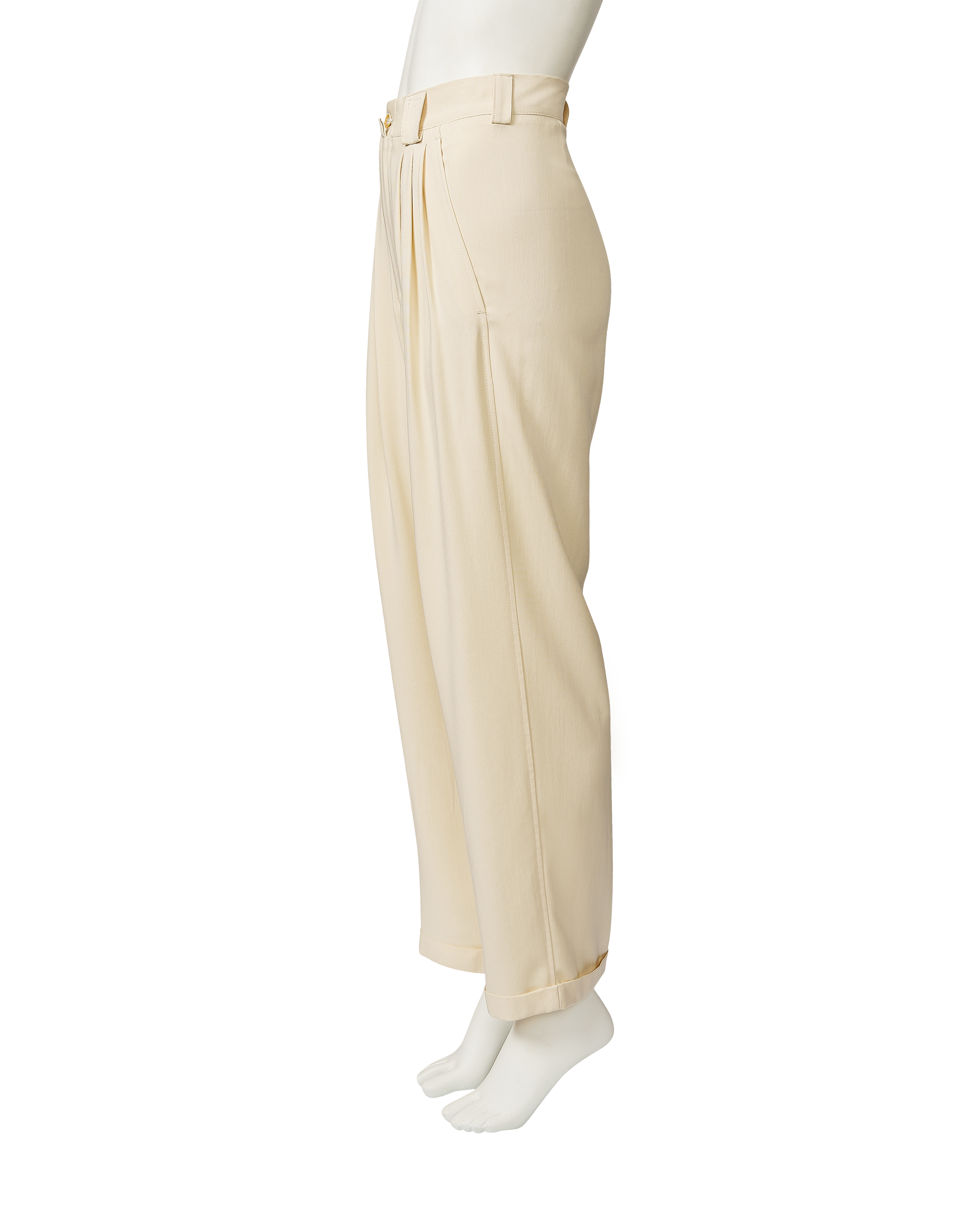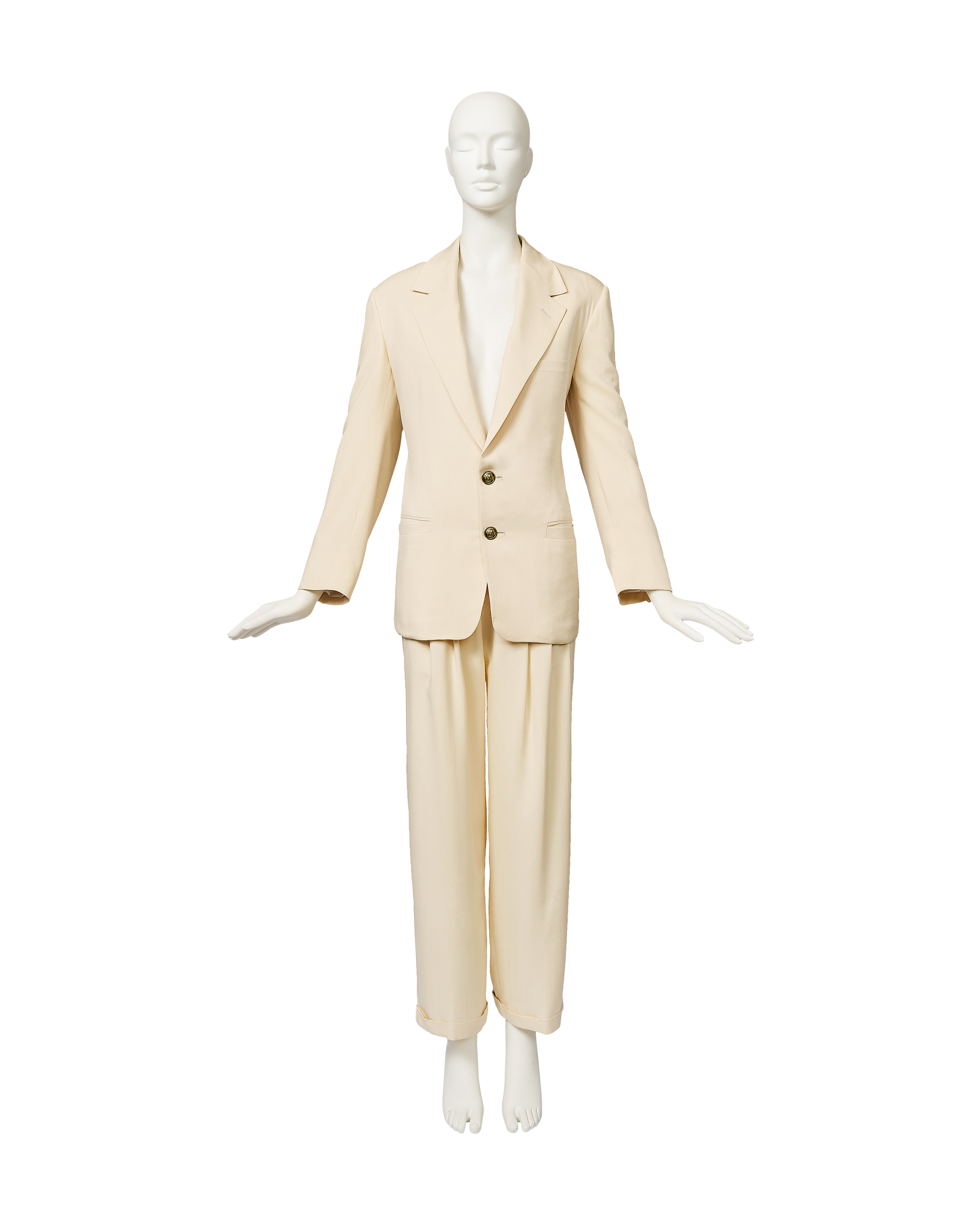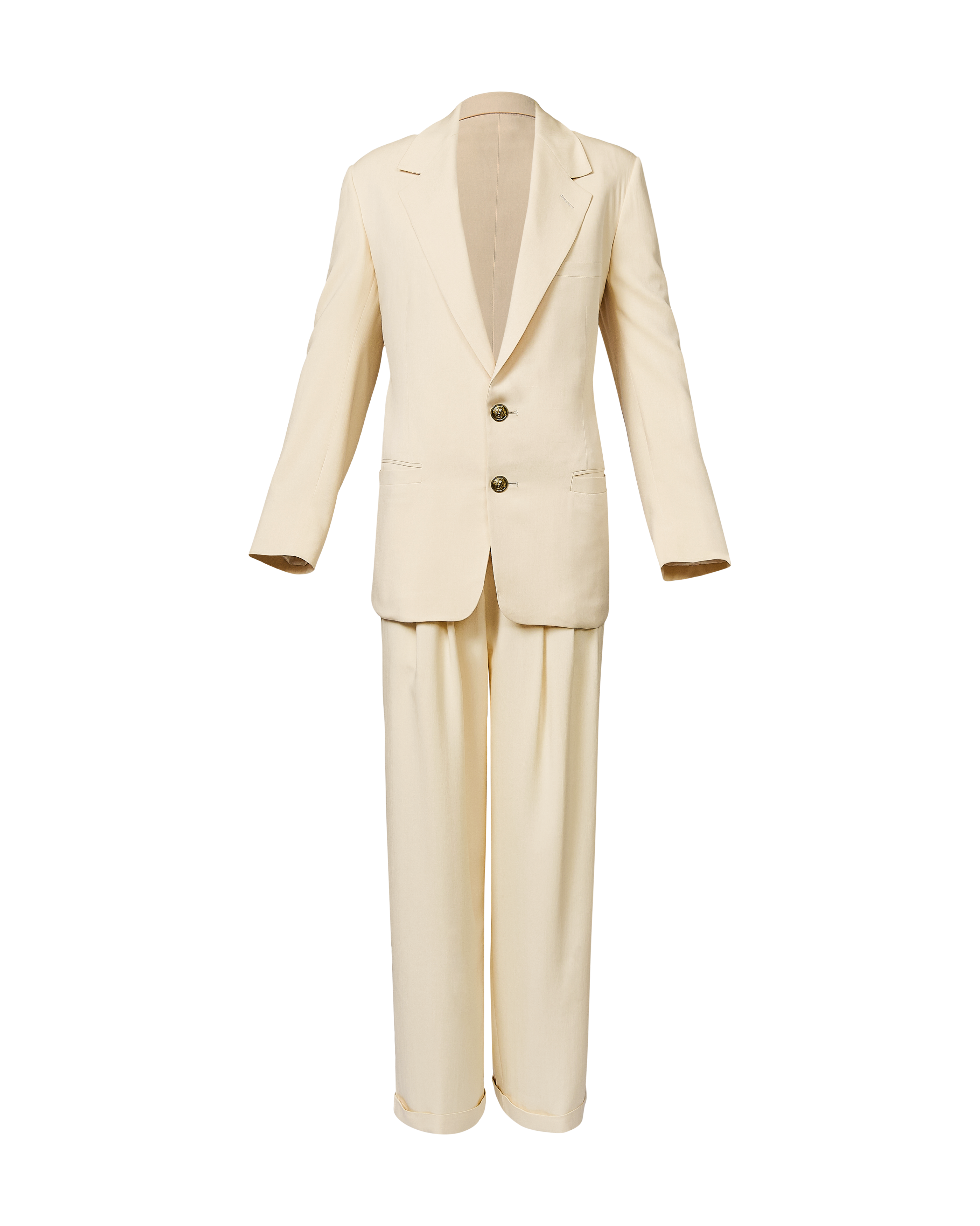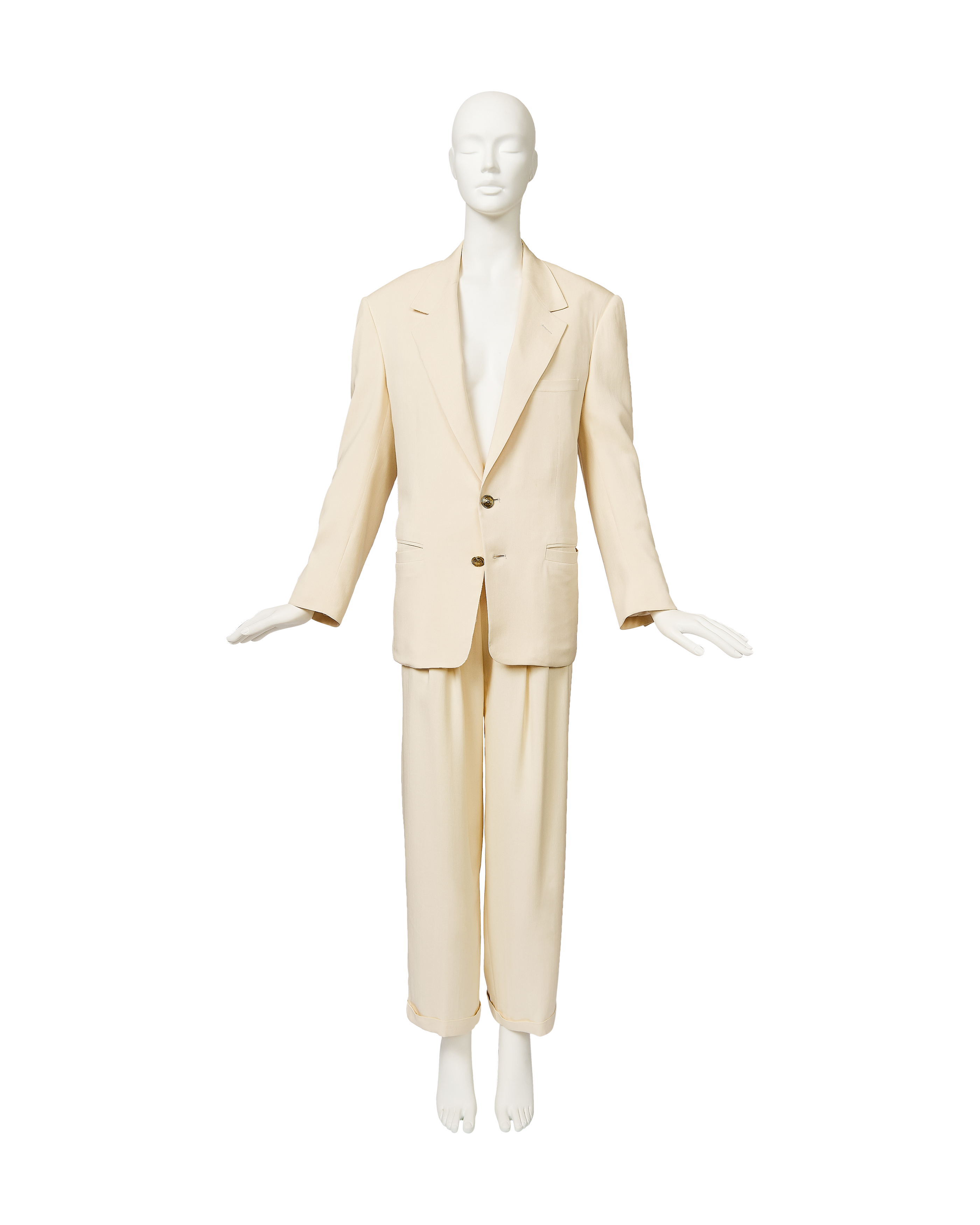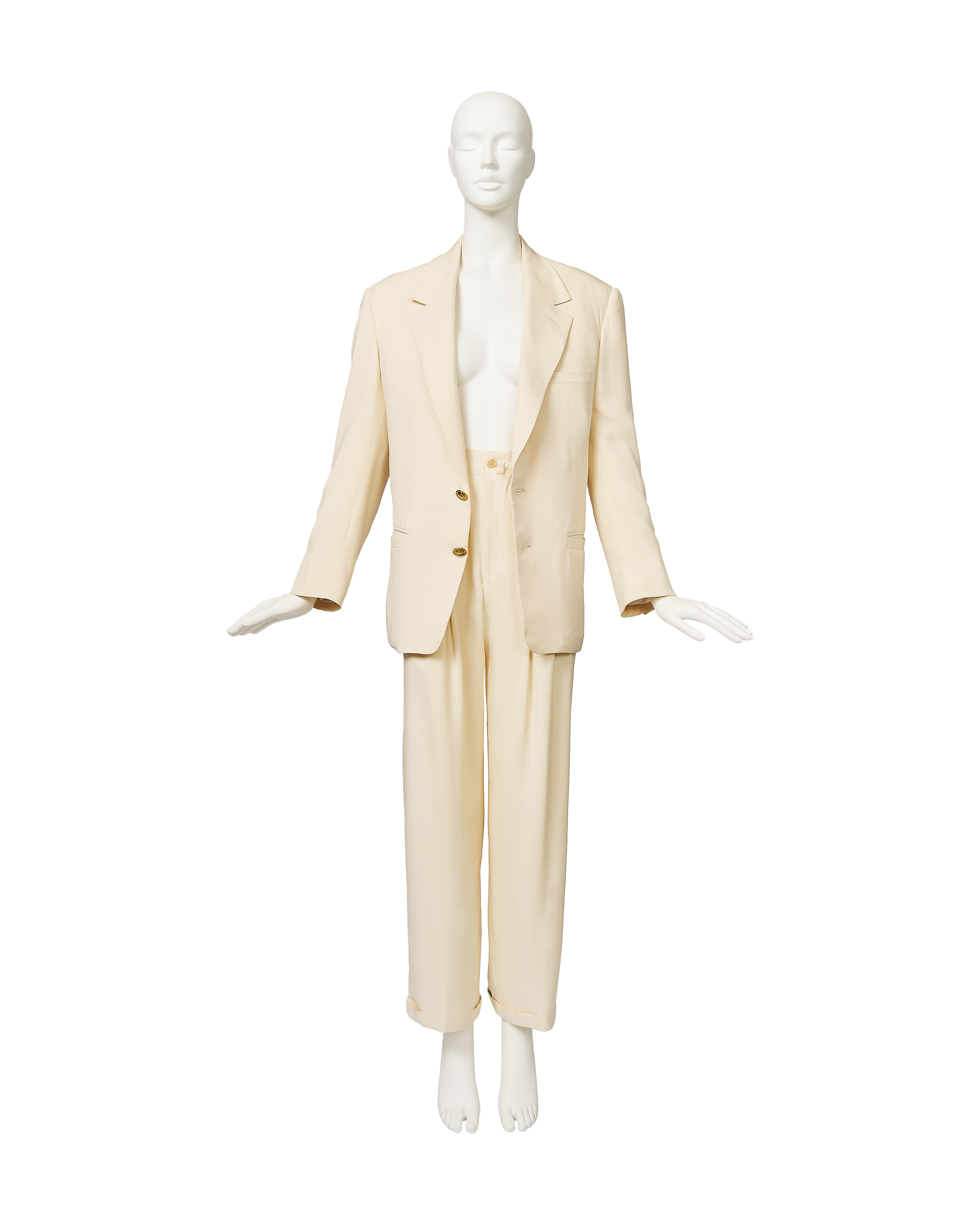 1990's Gianni Versace ecru pant suit set. Oversized blazer and high-rise trouser set. Collared blazer jacket features two gold-tone Medusa head front button closures and moderate shoulder pads, with two smaller buttons at wrist. Pairs with high-rise off-white trouser with front zip and single tan button closure; features unique light gray geometric stitching at belt loops and pleating at waist, with single functional back flap pocket and functional side slit pockets. Fabric contents unmarked; feels like lightweight wool blend with silk lining (jacket is partially lined at upper portion, sides and arms). In very good vintage condition with light wear throughout, including faint spotting at interior lining of jacket (unnoticeable when worn); has been taken to couture cleaner and arrives ready to wear.