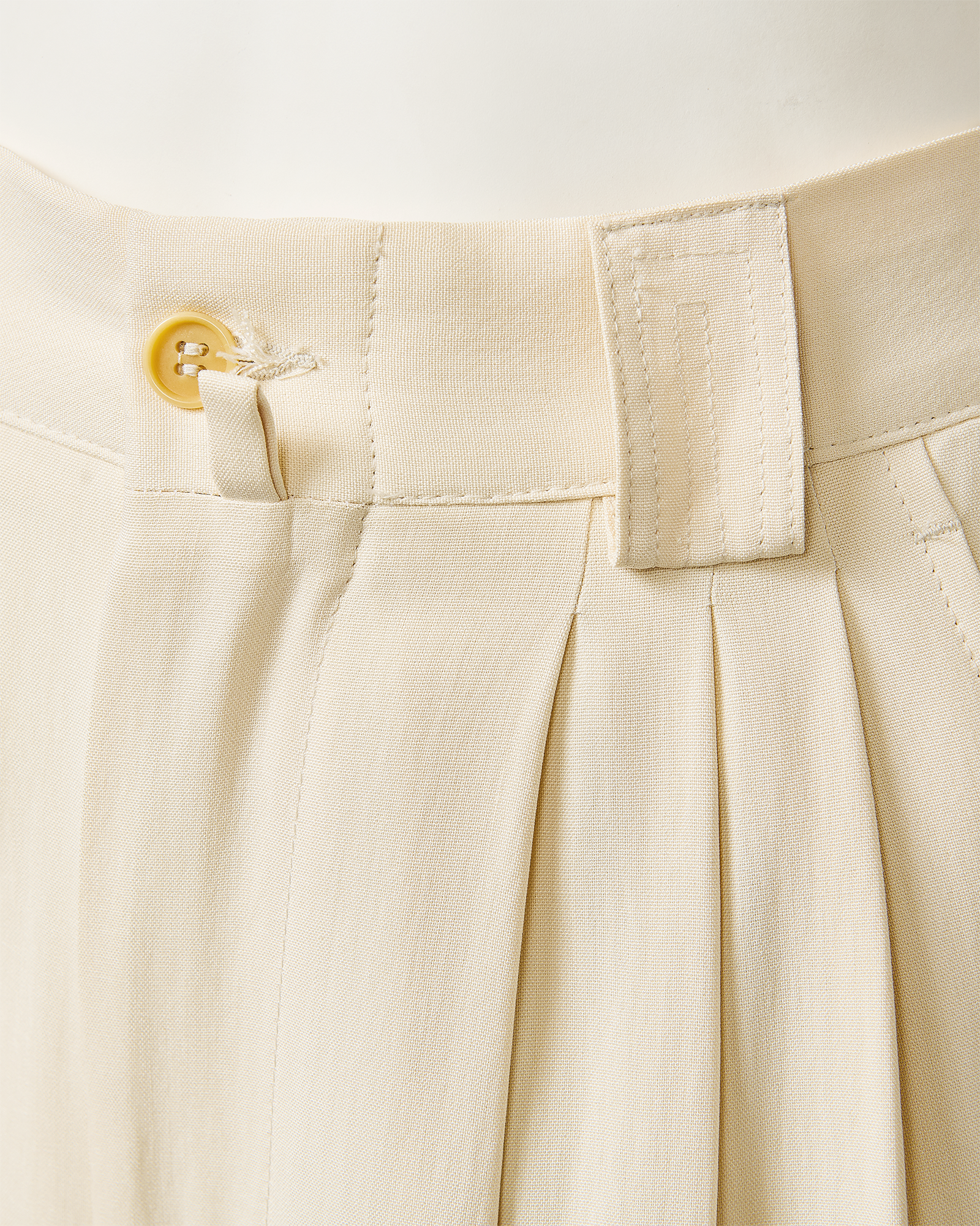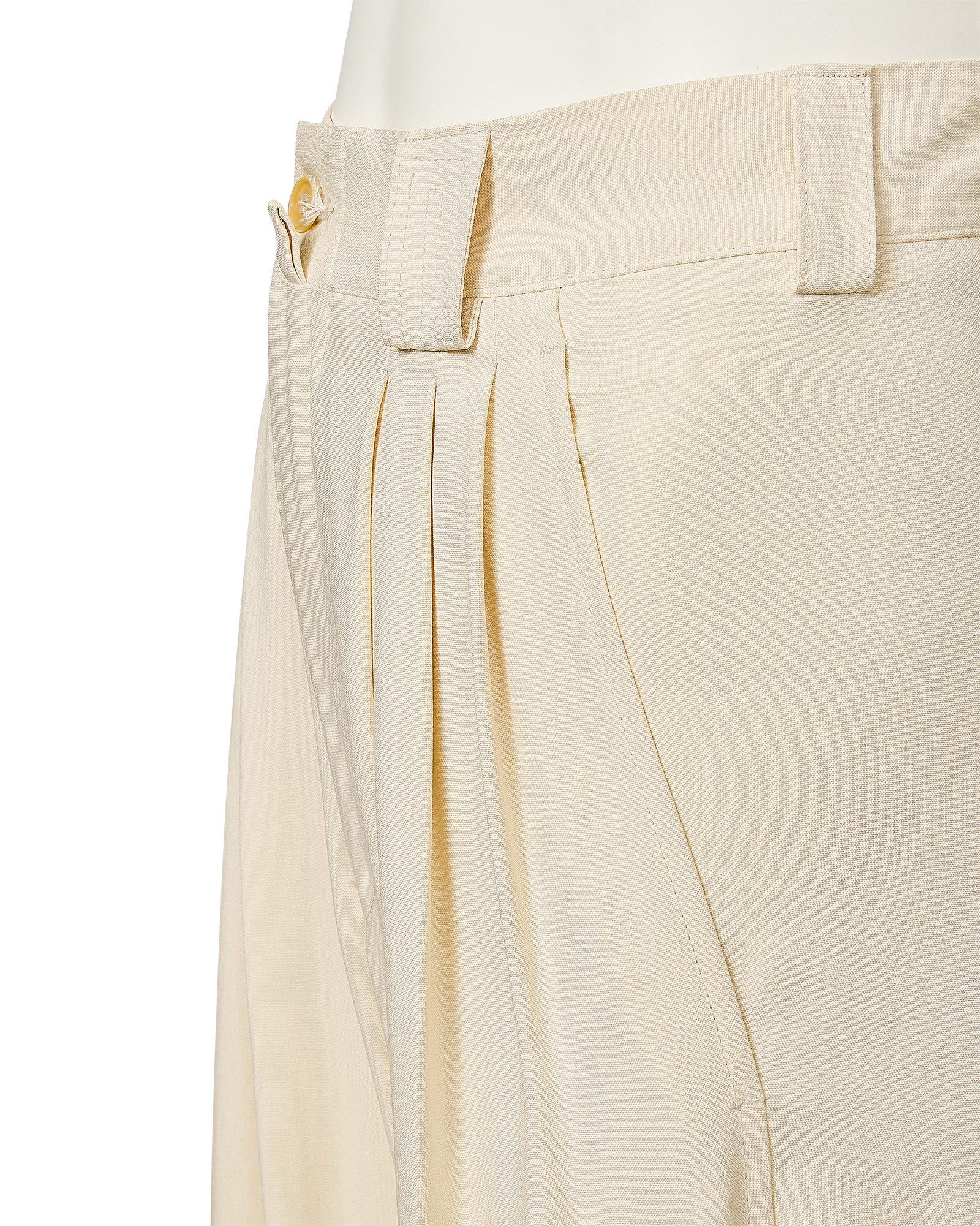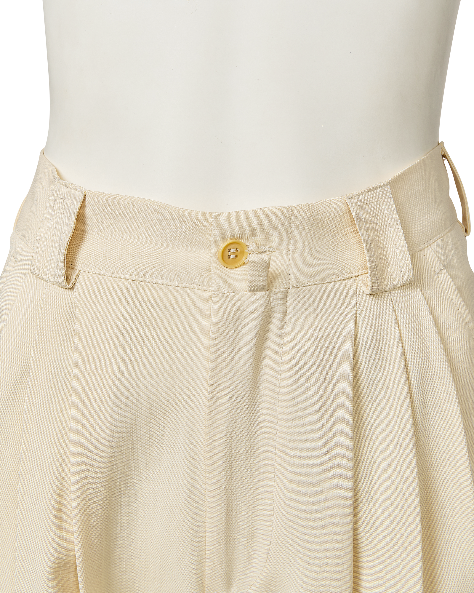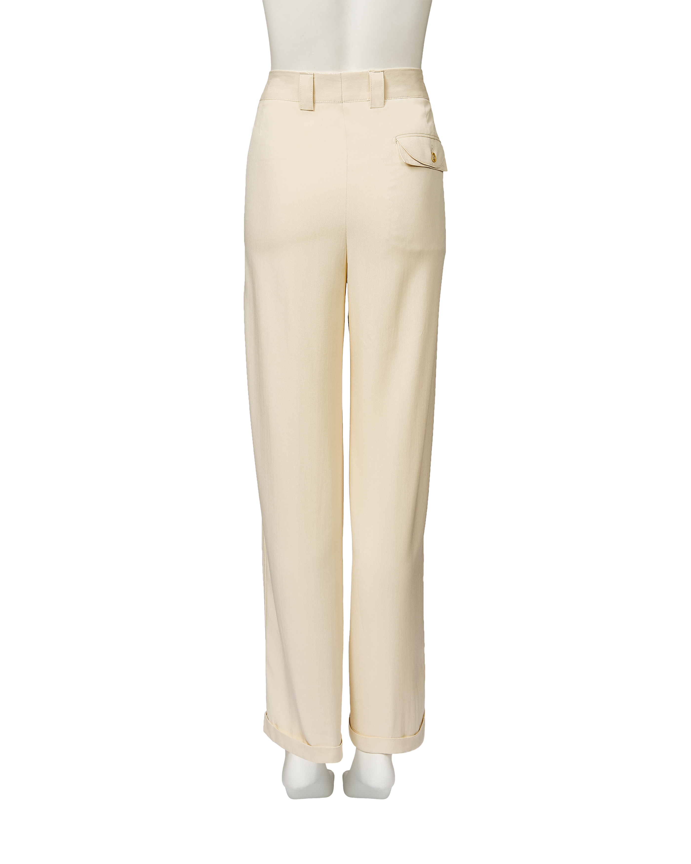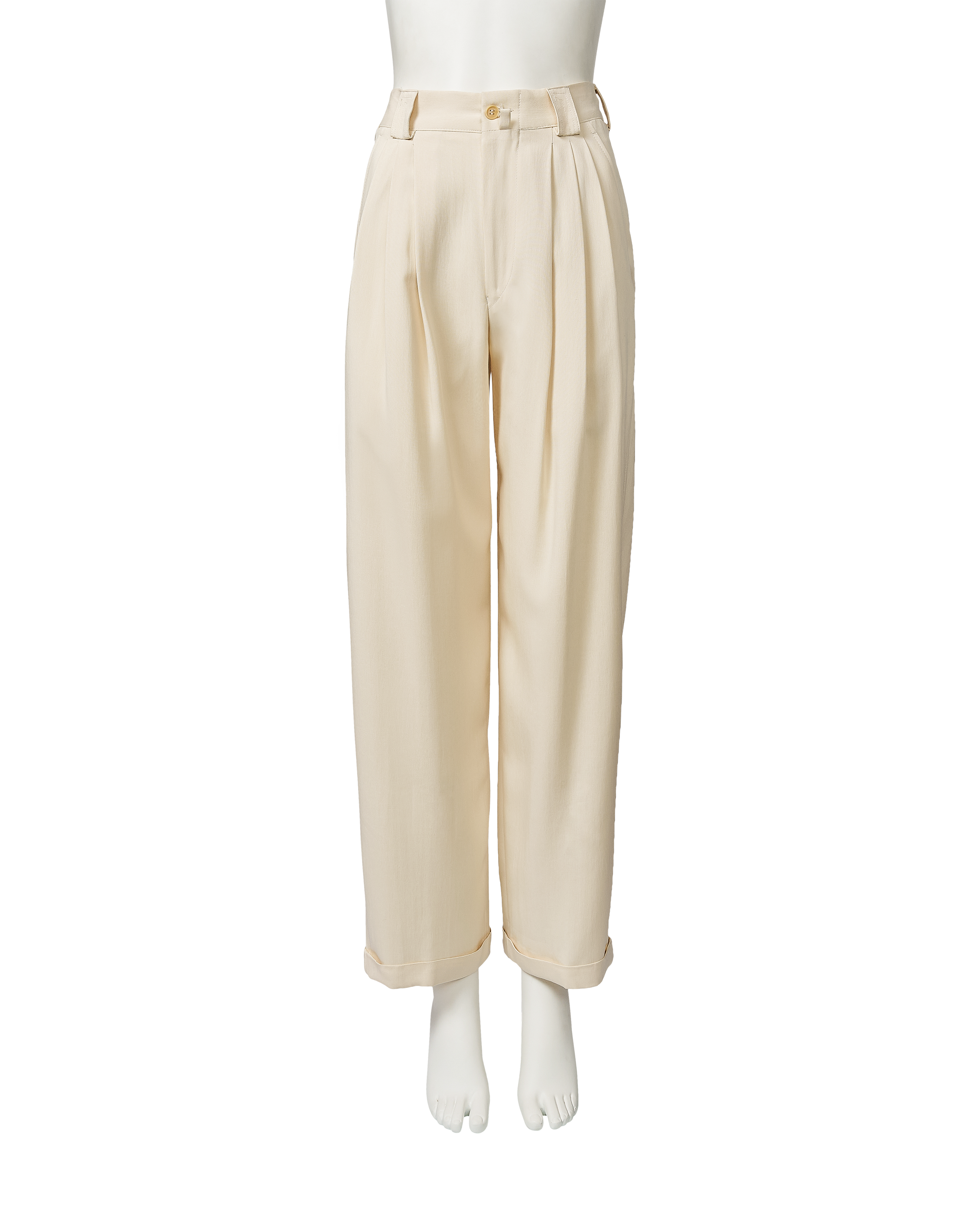 1990's Gianni Versace ecru pant suit set. Oversized blazer and high-rise trouser set. Collared blazer jacket features two gold-tone Medusa head front button closures and moderate shoulder pads, with two smaller buttons at wrist. Pairs with high-rise off-white trouser with front zip and single tan button closure; features unique light gray geometric stitching at belt loops and pleating at waist, with single functional back flap pocket and functional side slit pockets. Fabric contents unmarked; feels like lightweight wool blend with silk lining (jacket is partially lined at upper portion, sides and arms). In very good vintage condition with light wear throughout, including faint spotting at interior lining of jacket (unnoticeable when worn); has been taken to couture cleaner and arrives ready to wear.