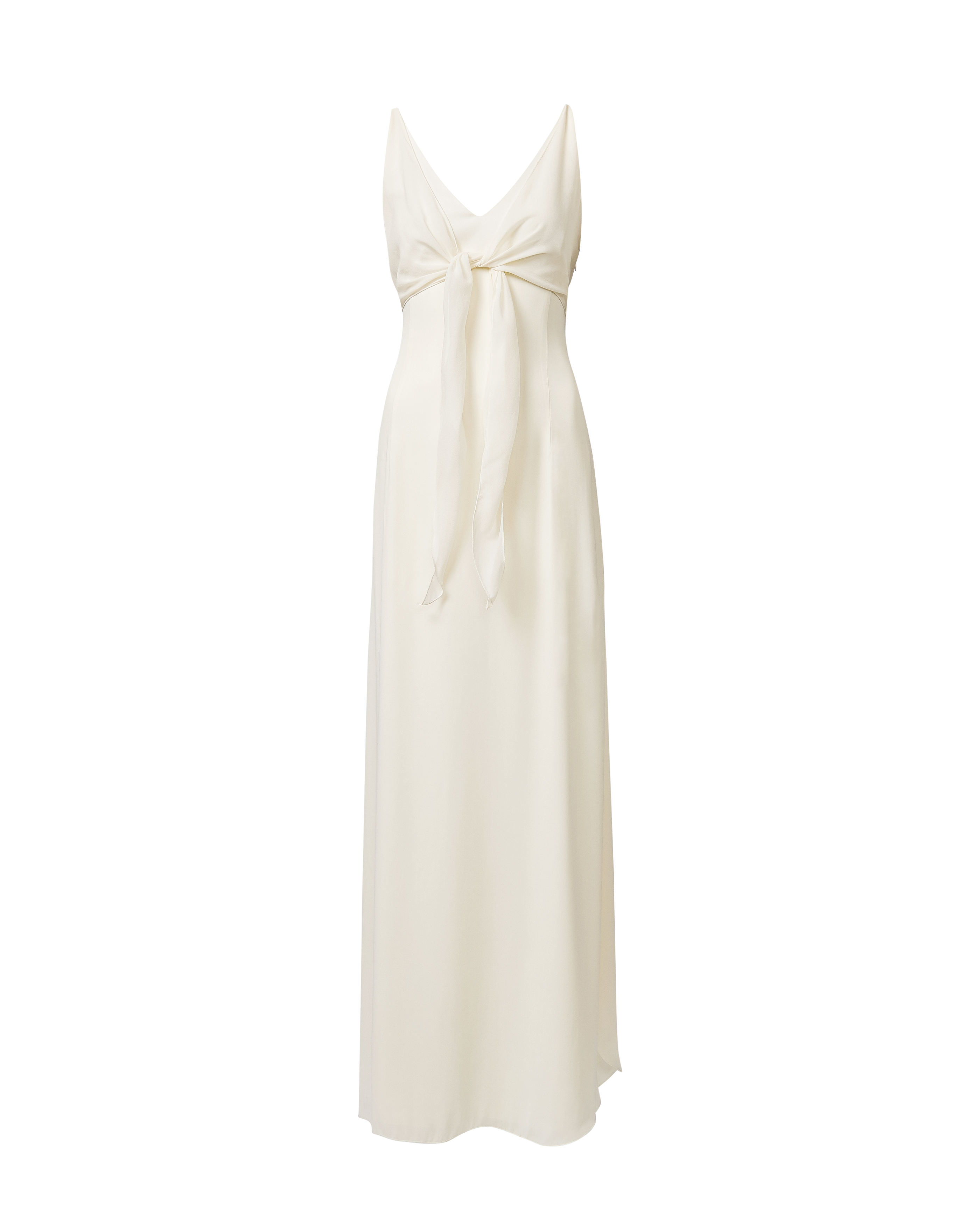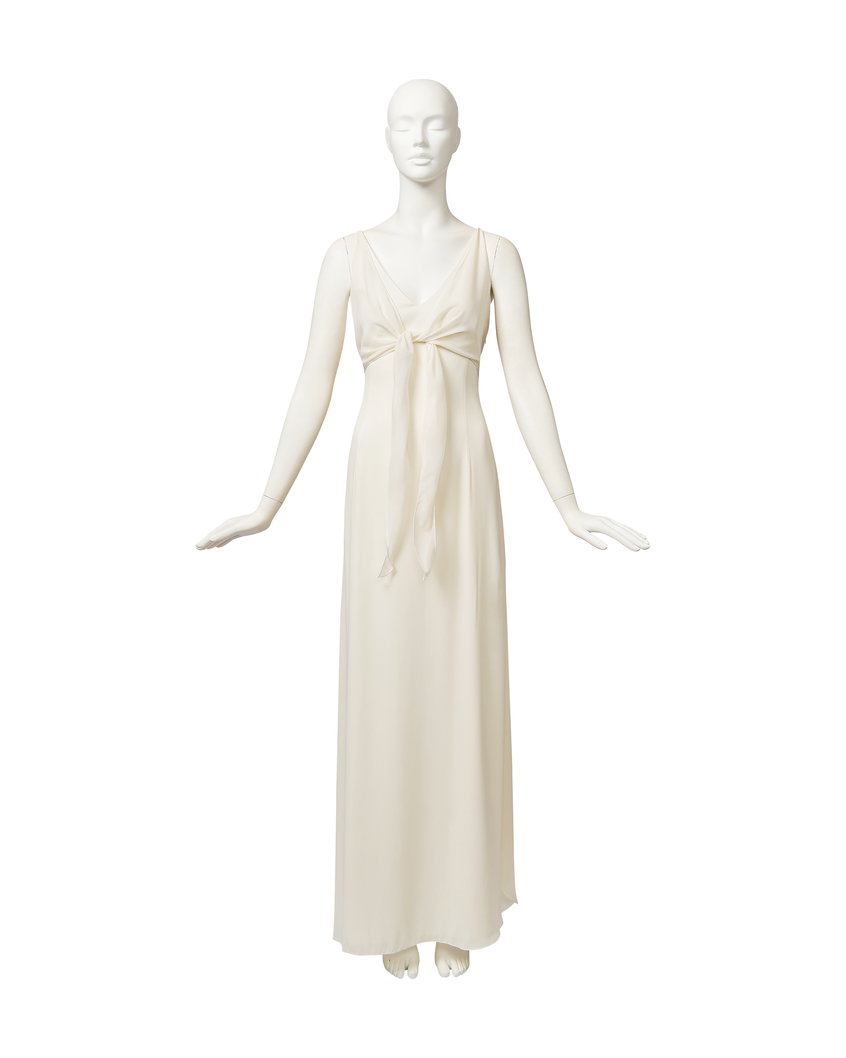 2000's Valentino white sleeveless gown with tie front detailing and cross-back straps. Silk chiffon sleeveless gown with semi-sheer tie front bow / sash detail and semi-open cross-back straps. Ivory colorway / slightly off-white. Concealed side zip closure and slight side slit. Fabric Contents: 52% Acetate, 28% Nylon, and 20% Silk blend with 100% Silk tie and 100% Polyester lining. In excellent vintage condition with no flaws to note; new with original Valentino brand tag.