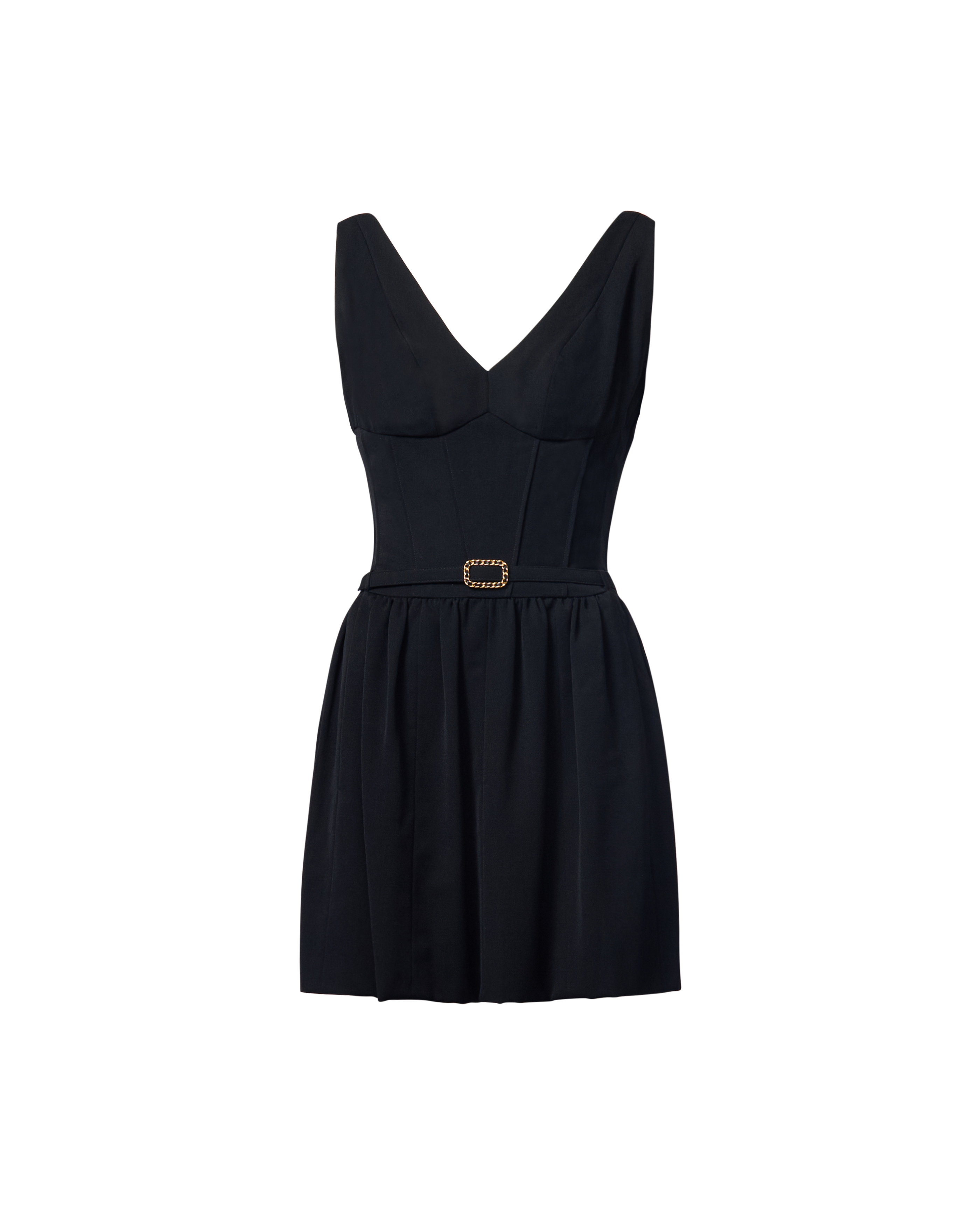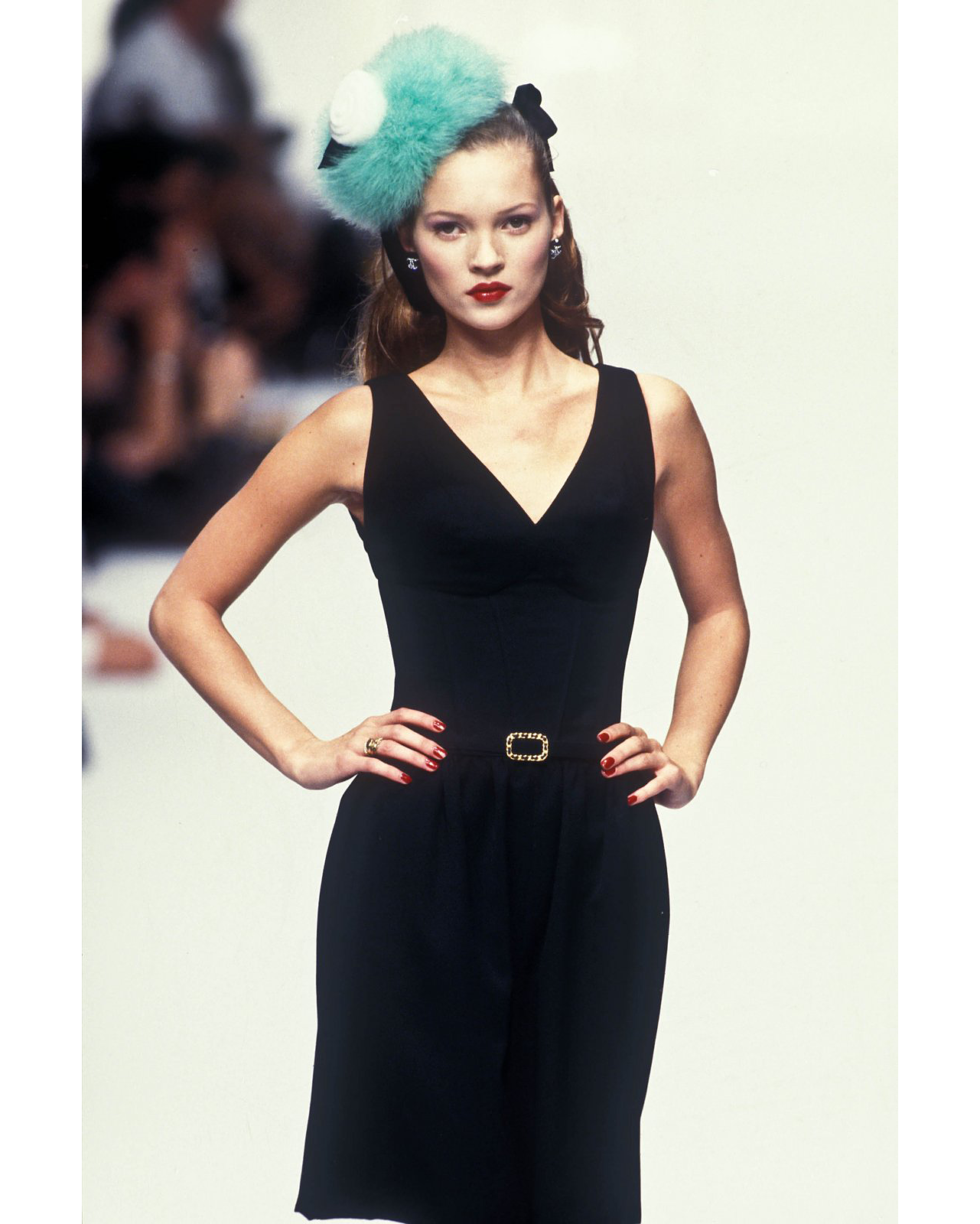 A/W 1994 Chanel by Karl Lagerfeld Haute Couture black v-neck mini dress. Rare above-knee sleeveless v-neck dress with black and gold-tone belt, as seen on the runway on Kate Moss. Intricate built-in boning throughout bustier that creates nipped waist corset construction when worn. Removable black belt with gold-tone chain detail belt loop. Functional slit pockets at sides of hip. Fabric contents unmarked; feels like Wool with Silk lining. Concealed double back zip closures at interior corset and exterior of dress, with four snap closures at exterior. Likely the exact runway sample as seen on Kate Moss on the runway; one-of-one Haute Couture piece. In very good vintage condition with faint spotting at right side bust. Bra cups at interior have been removed; new bra cups could be added with tailor as desired. Belt has moderate wear at leather interior paneling (visible when worn reversibly with leather to exterior).