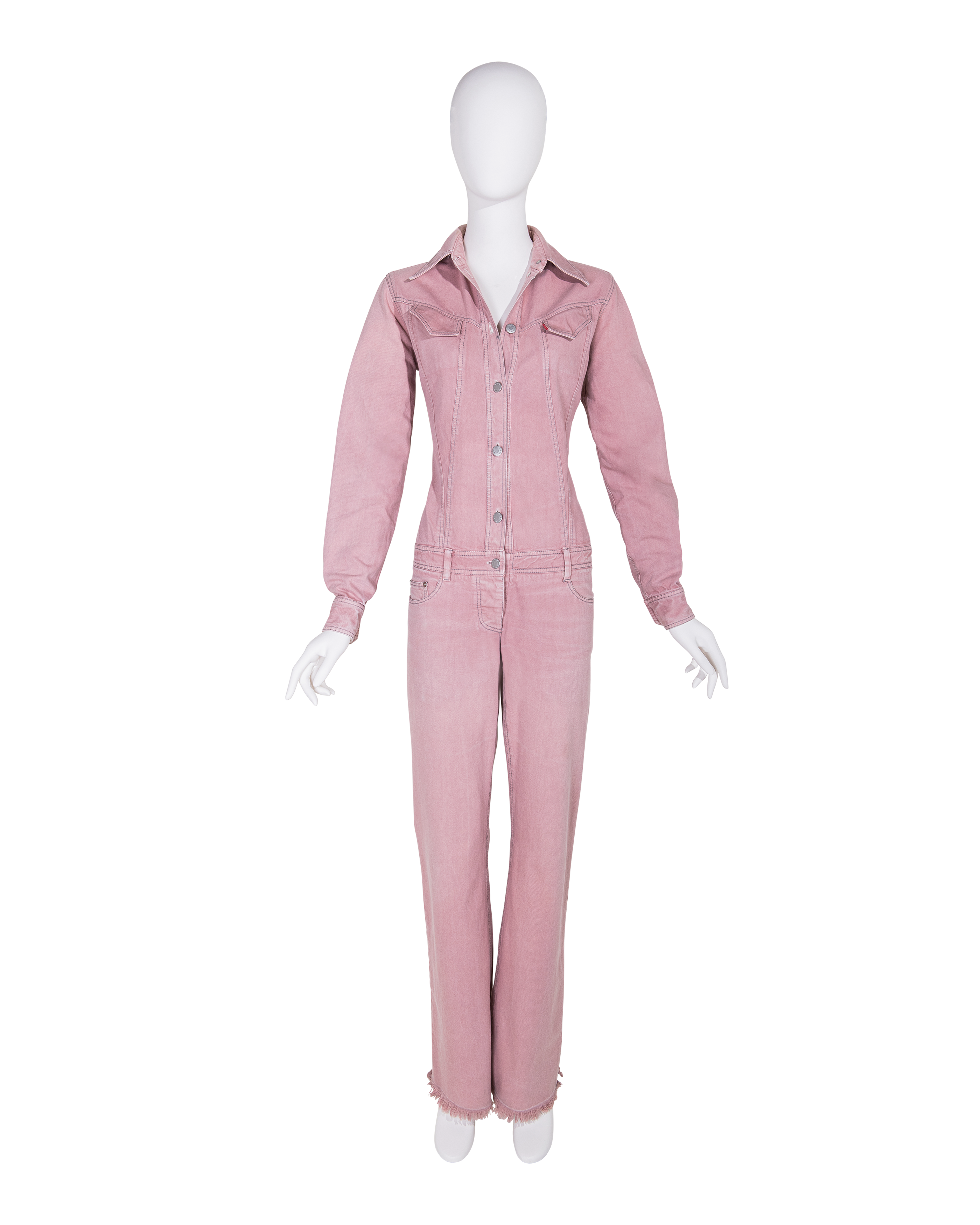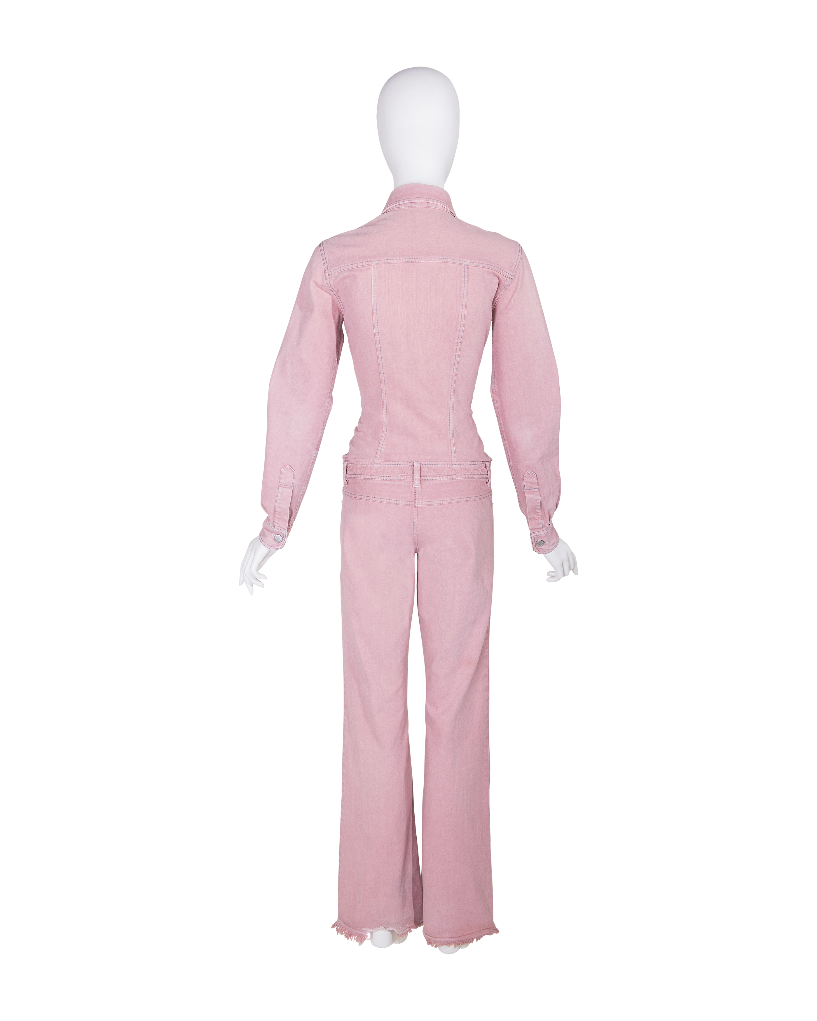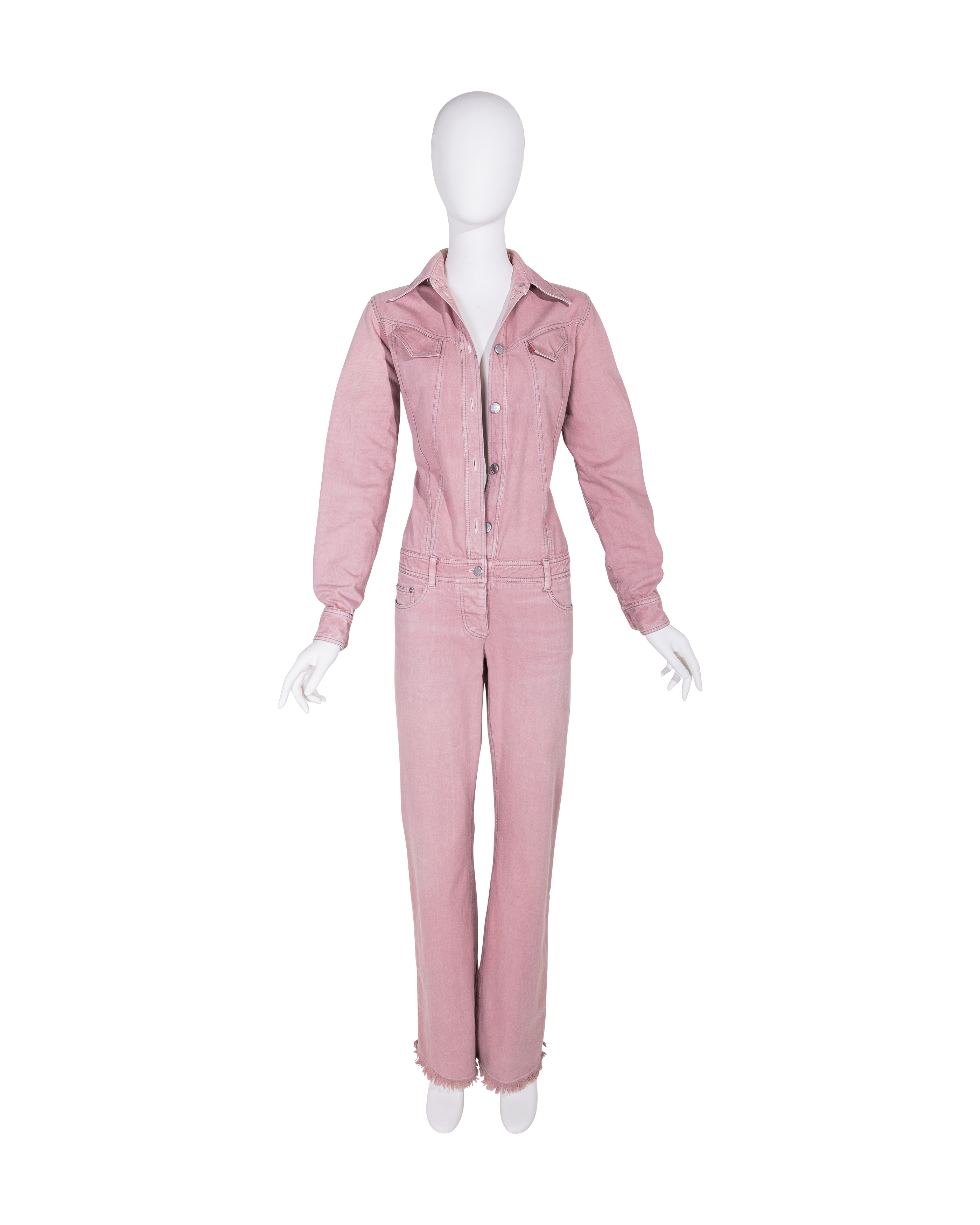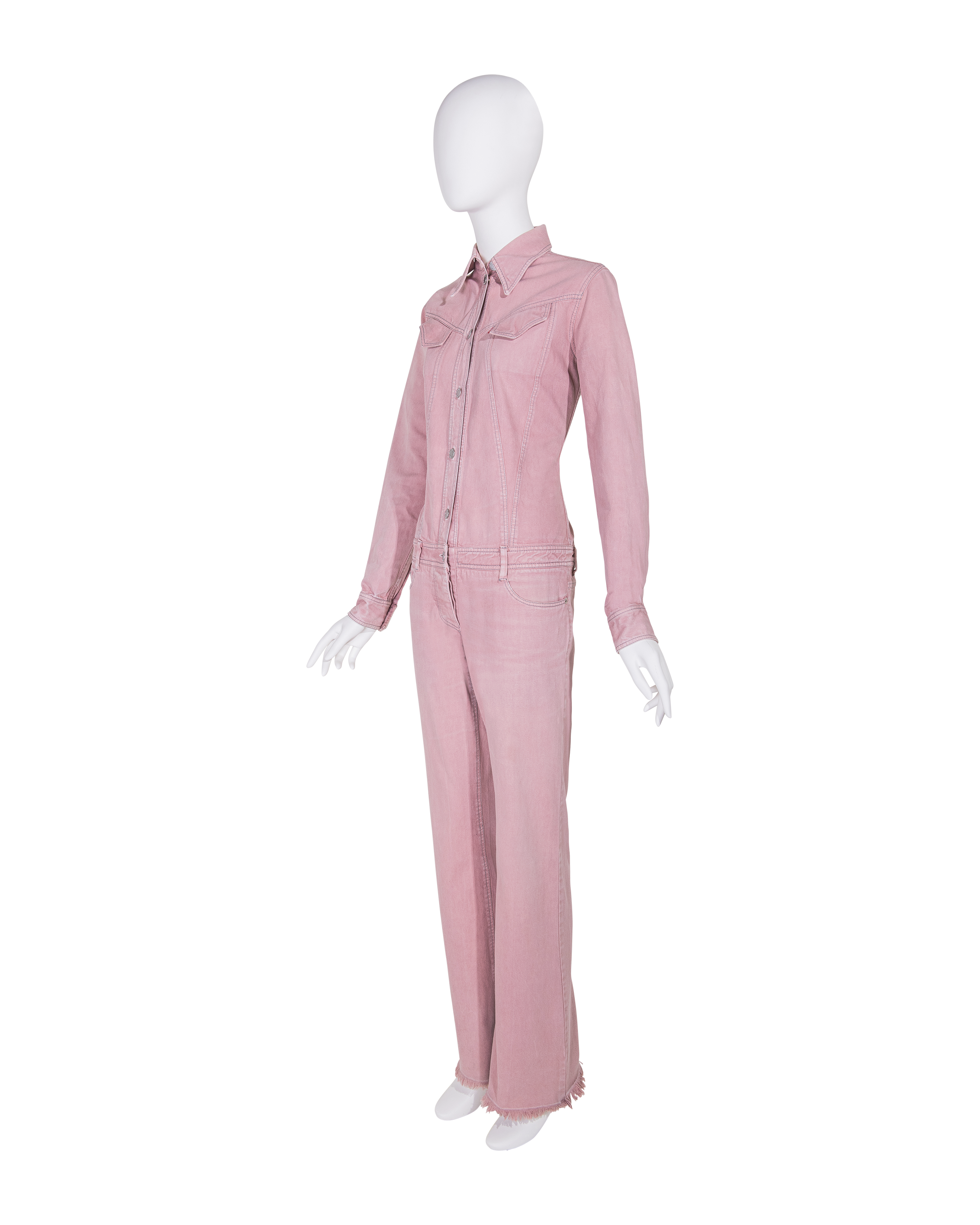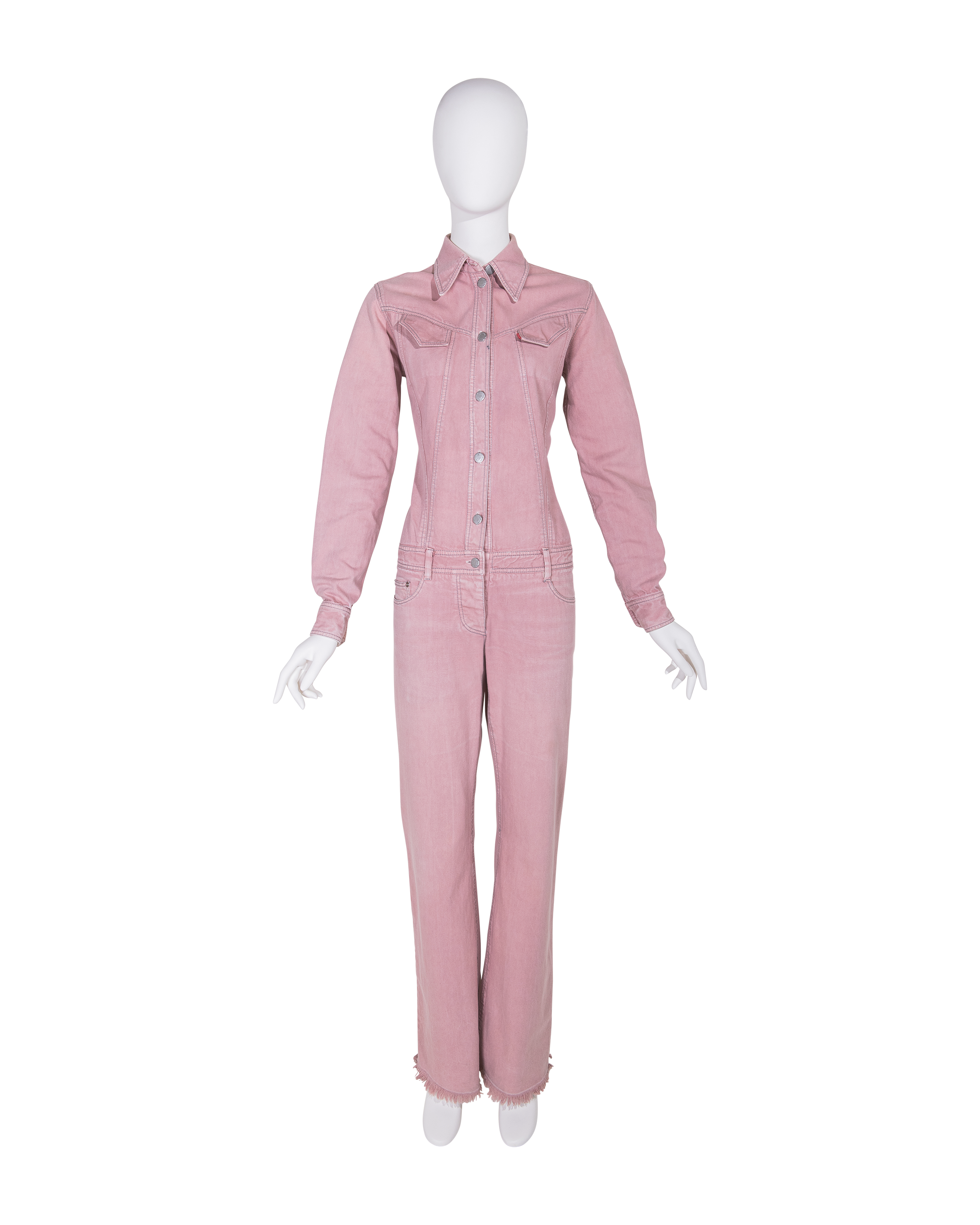 A/W 1999 Alexander McQueen by Lee Alexander McQueen "The Overlook" Collection RUNWAY SAMPLE pink denim jumpsuit. Long sleeve collared denim jumpsuit in pale baby pink, with intentionally frayed, unfinished hemline. Drop-waist design with silver-tone stamped 'McQueen' button closures. Contrasting light gray stitching throughout. As seen on the runway (Look 15). Has been taken to couture cleaner and arrives ready to wear. In good vintage condition with spotting throughout (likely intentional to design); small split at base of crotch; has been taken to couture cleaner and arrives ready to wear.